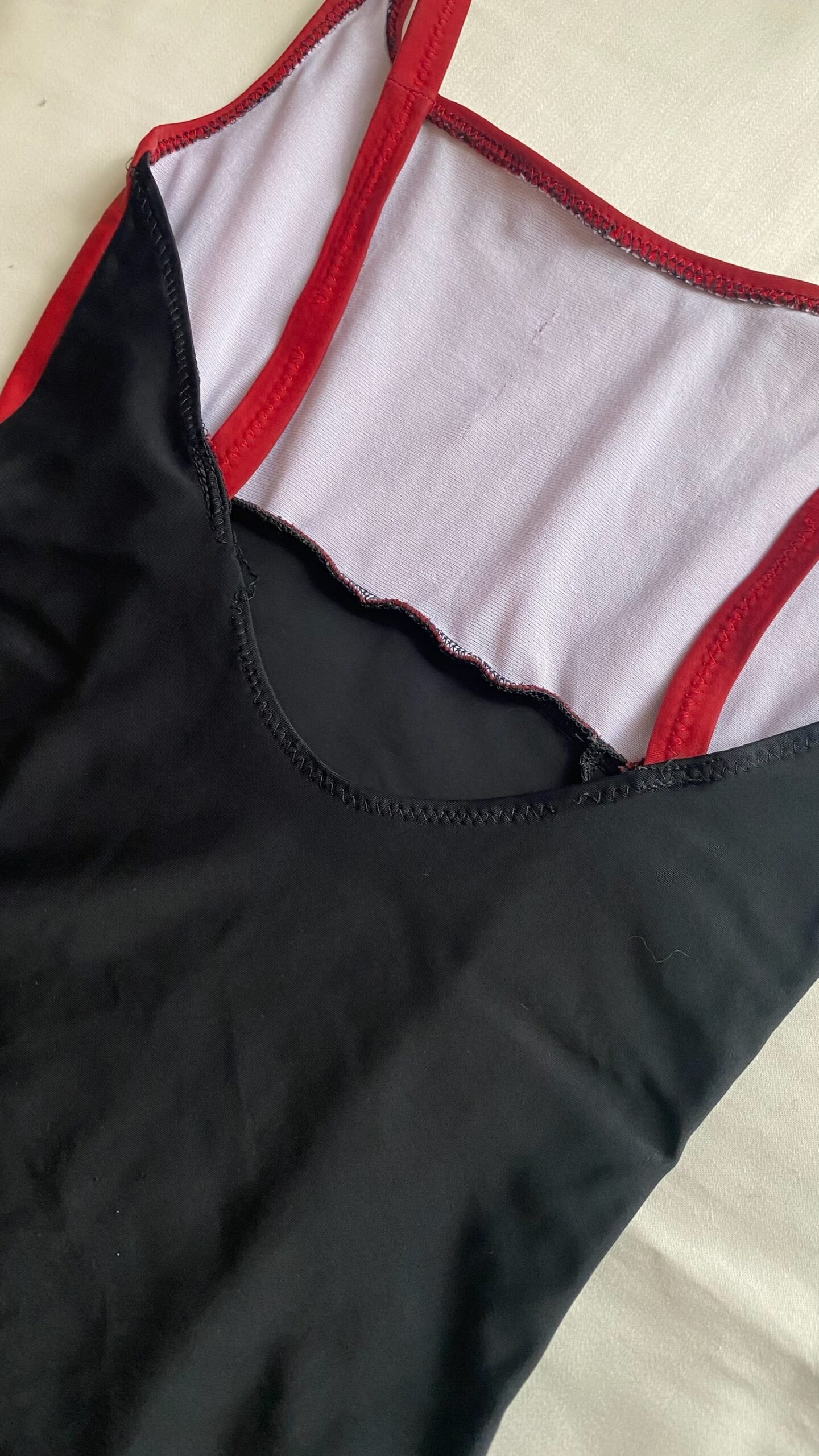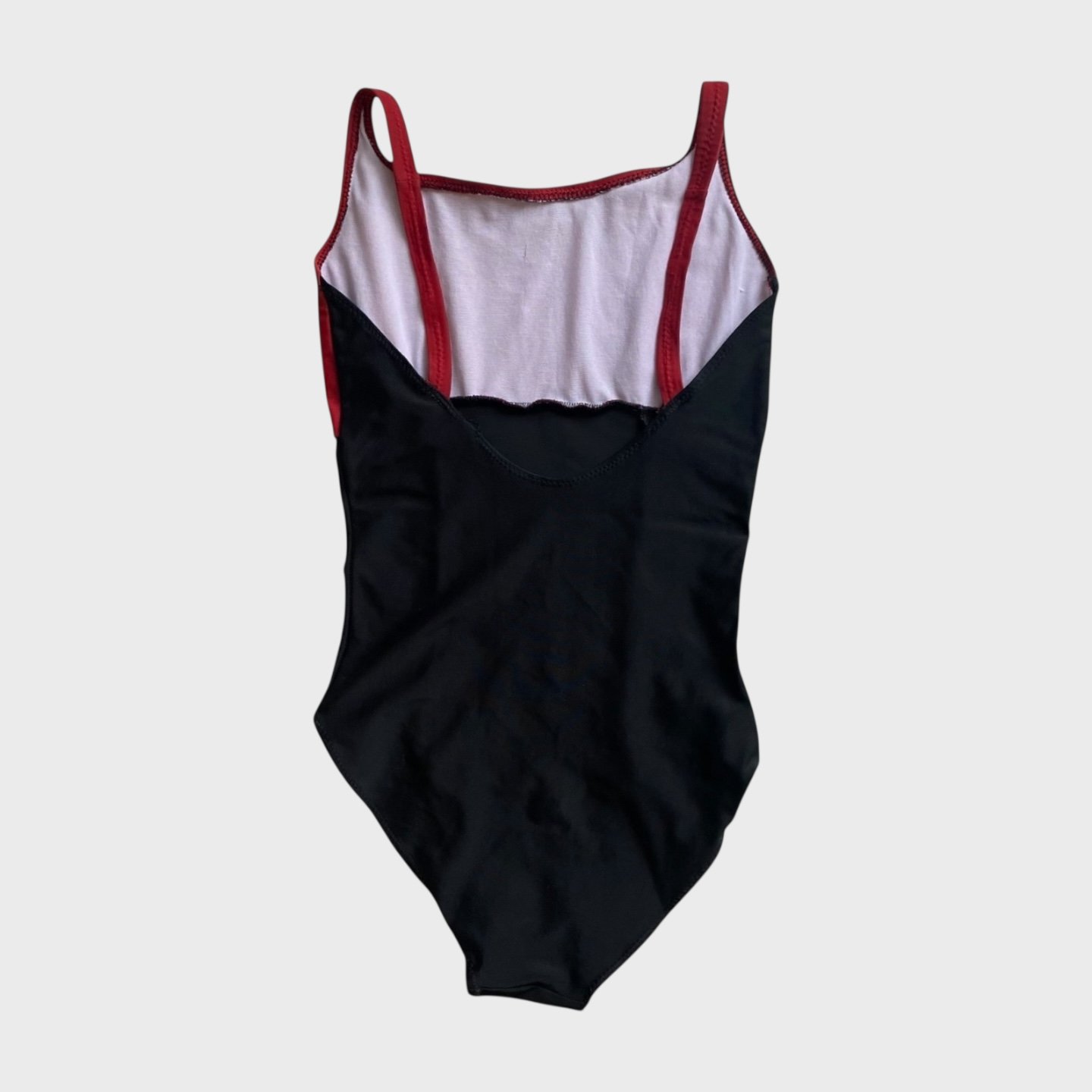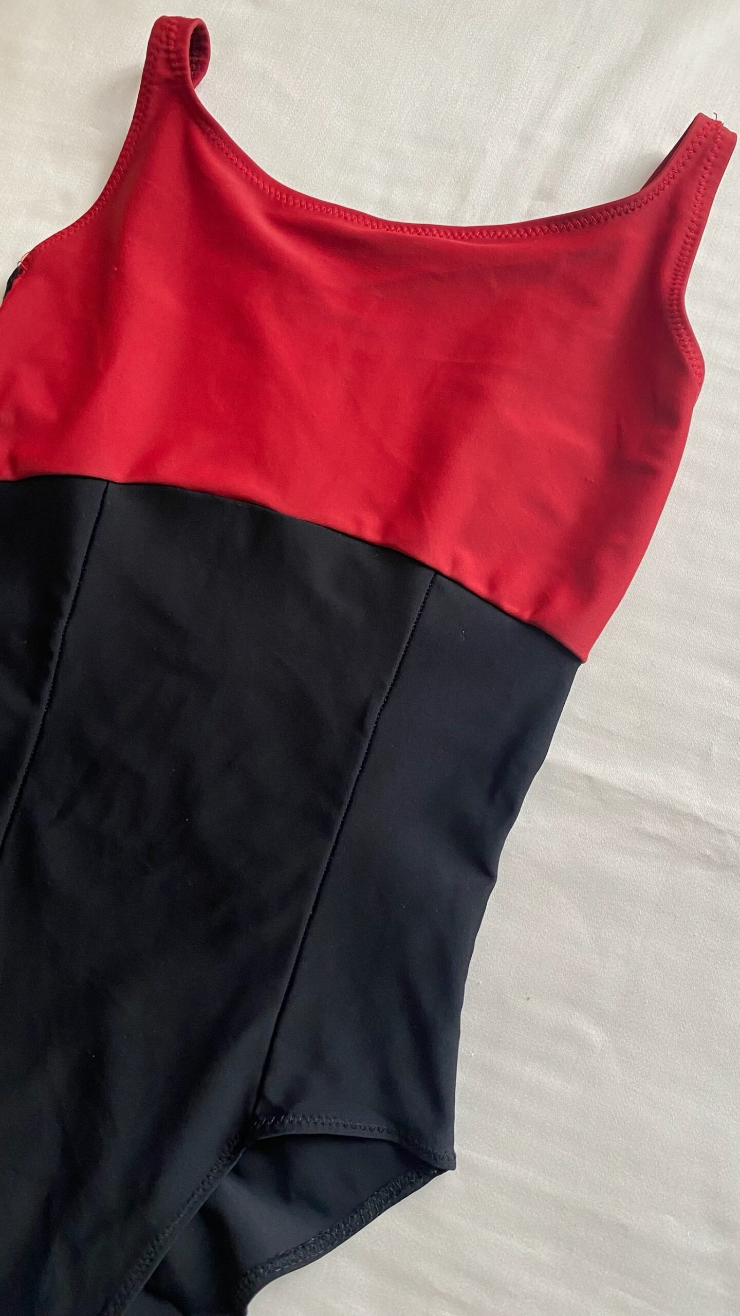 Black leotard with red top, brand unknown. Size S/M, fair condition.