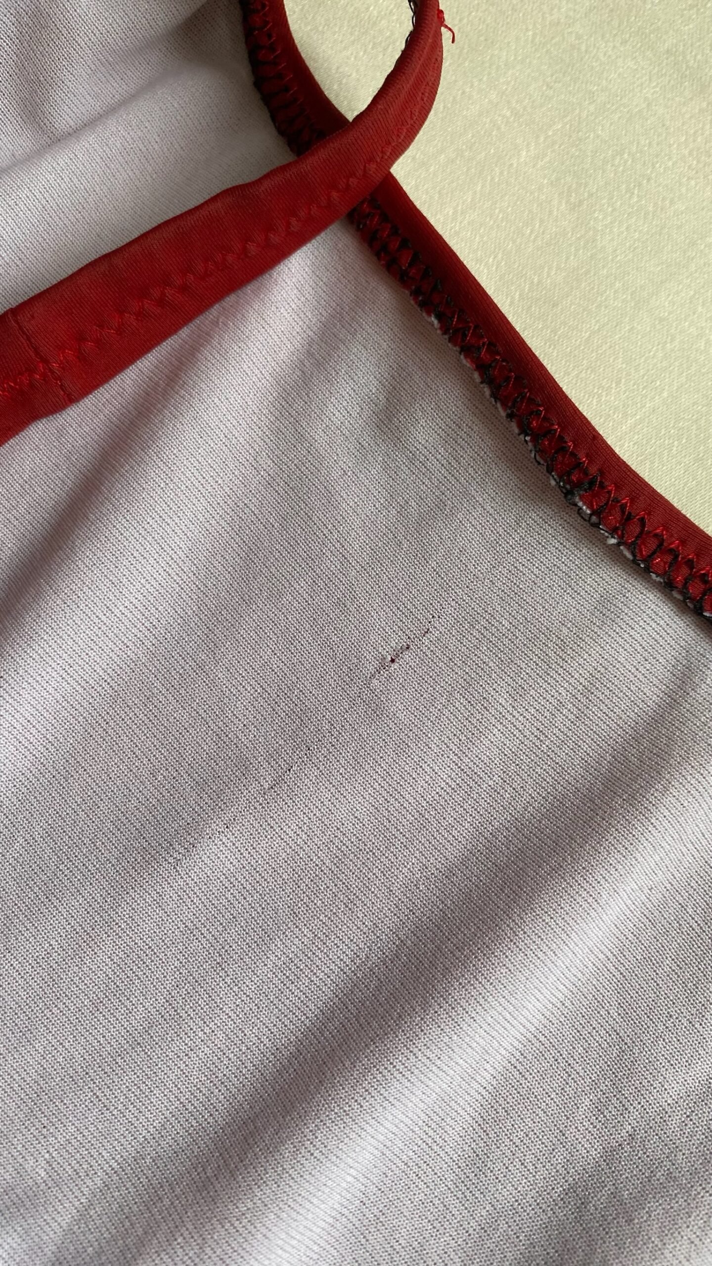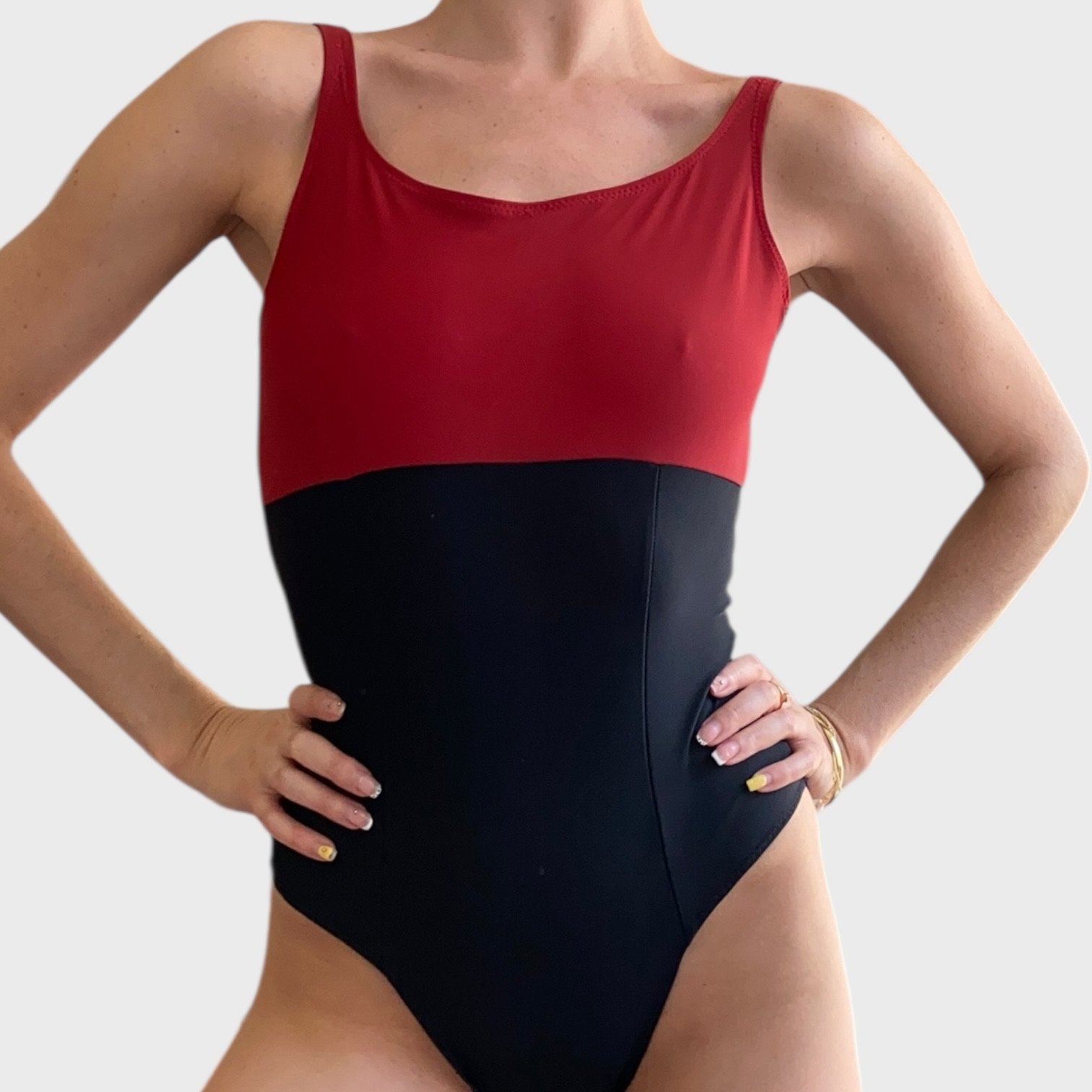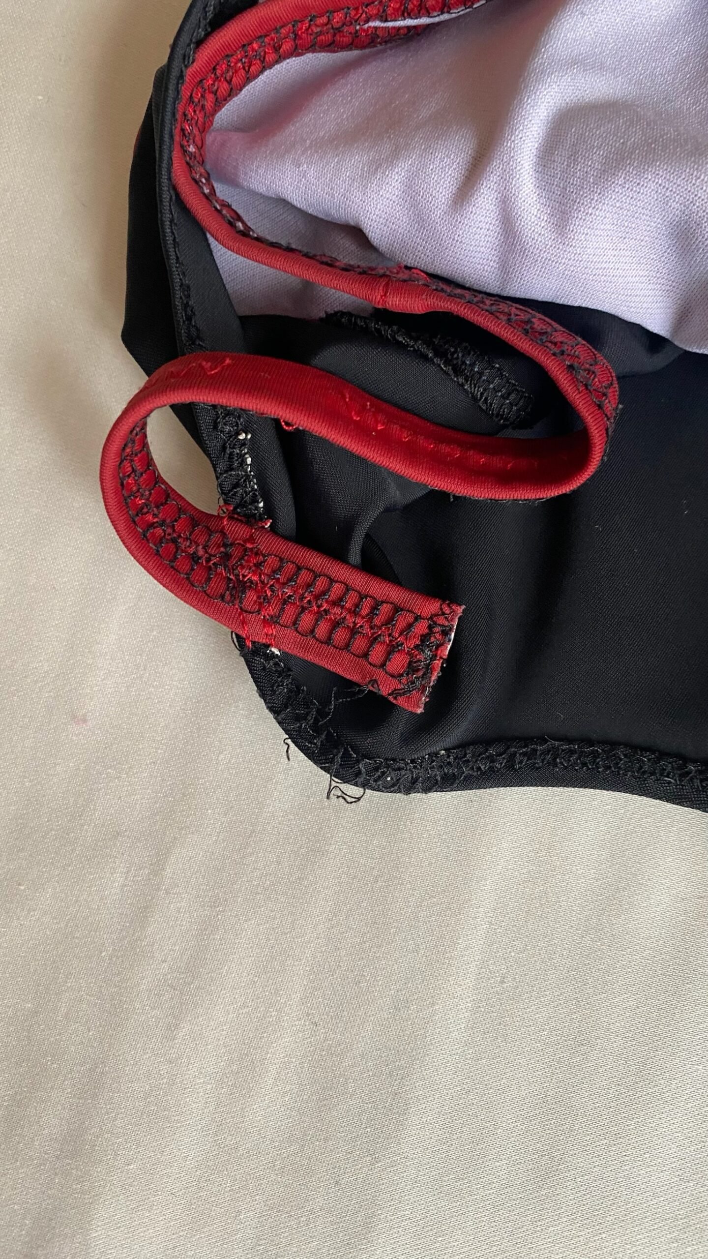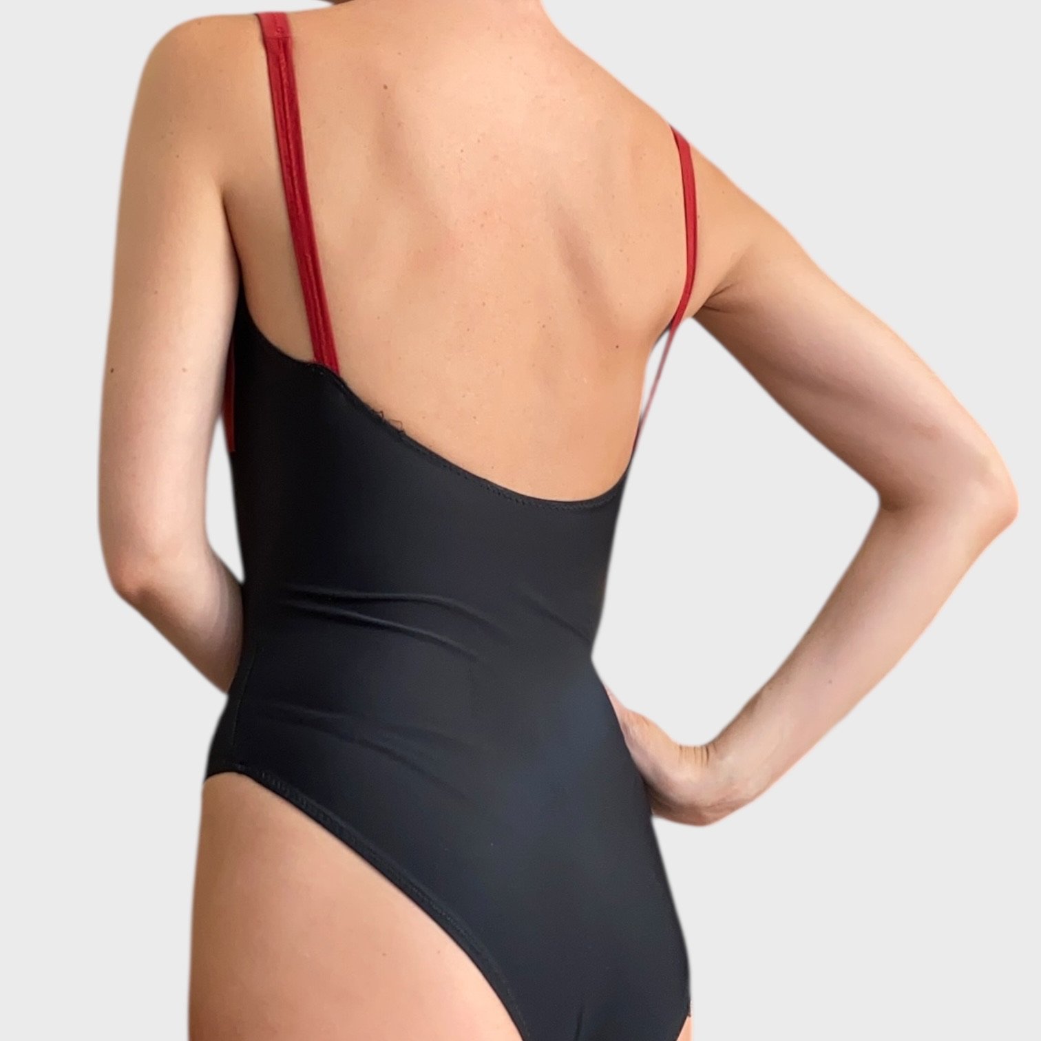 Black leotard with red top, brand unknown. Size S/M, fair condition.