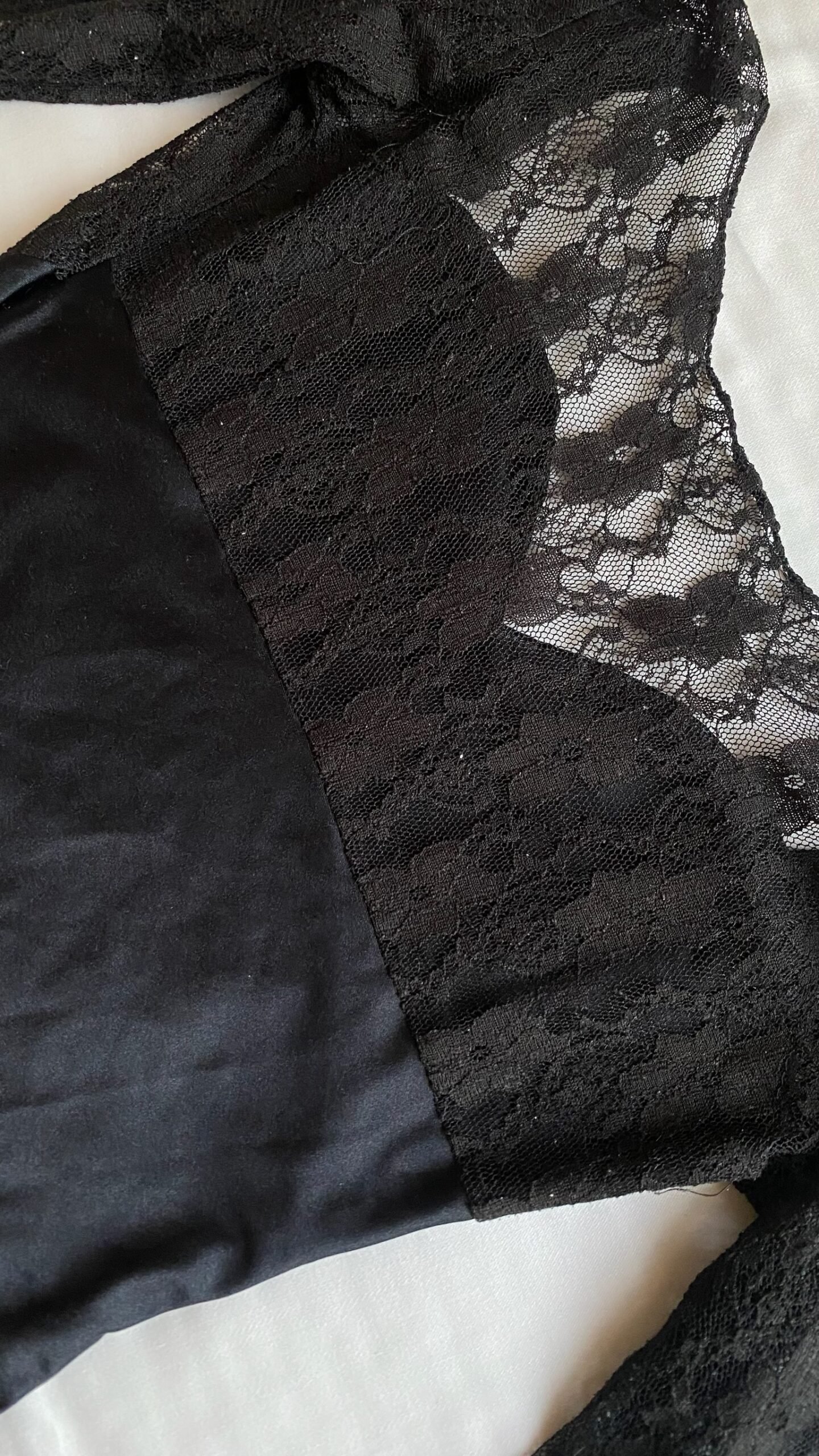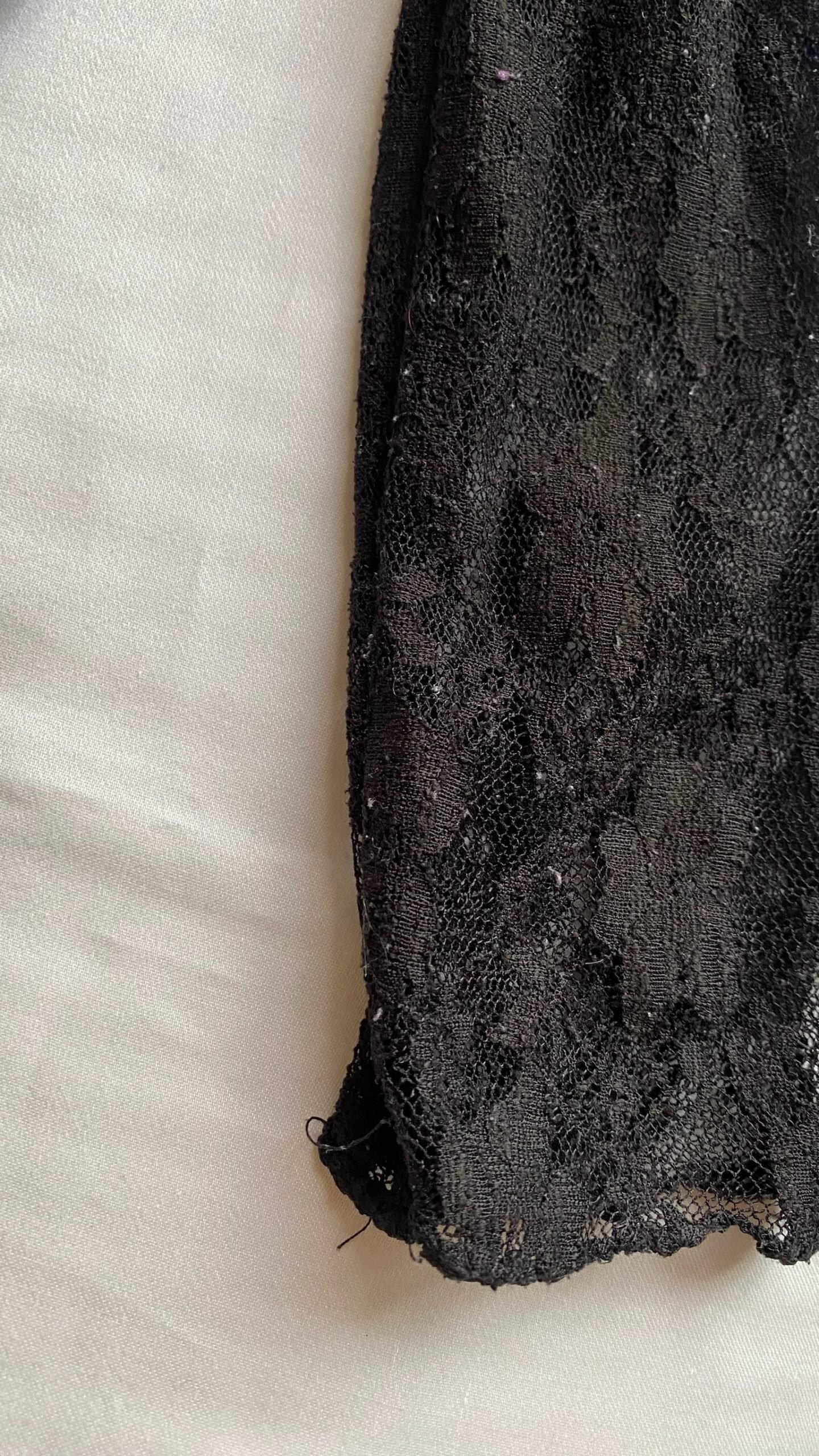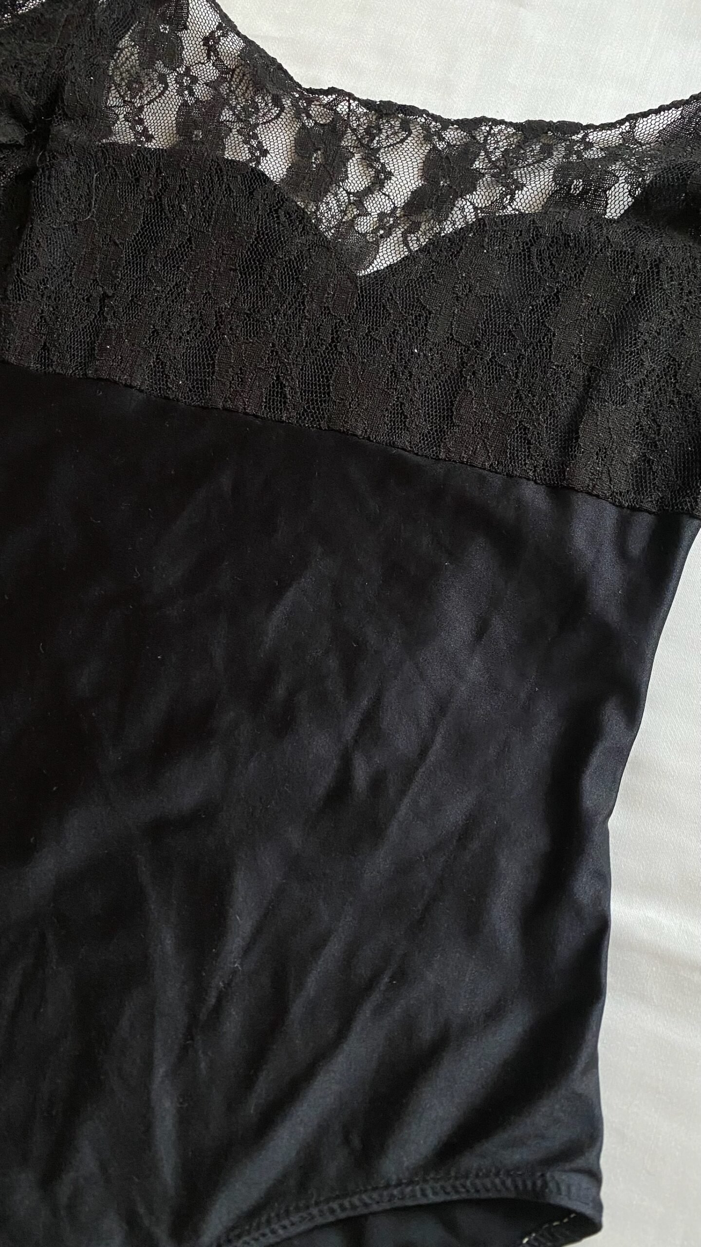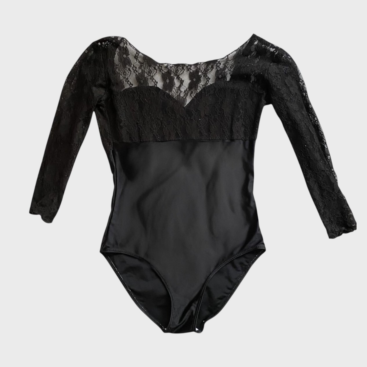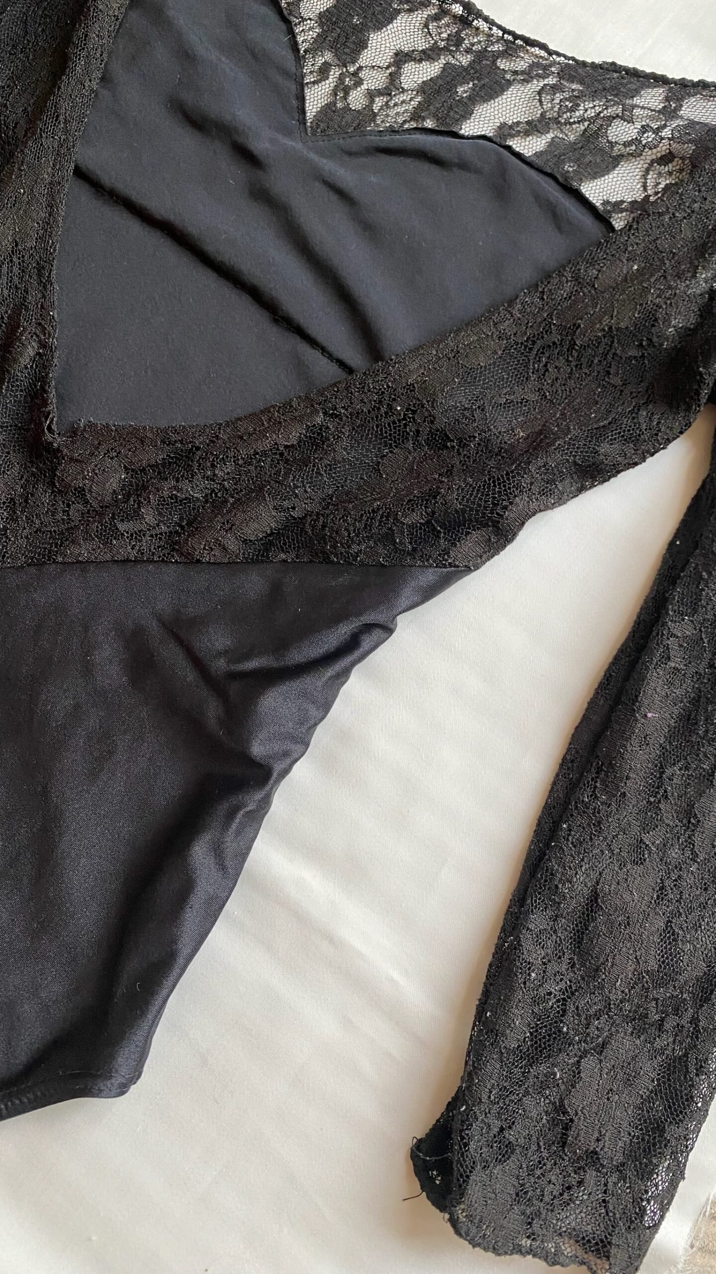 Black leotard with lace top and 3/4 sleeves, brand unknown. Size S, fair condition – visible pilling on the lace.