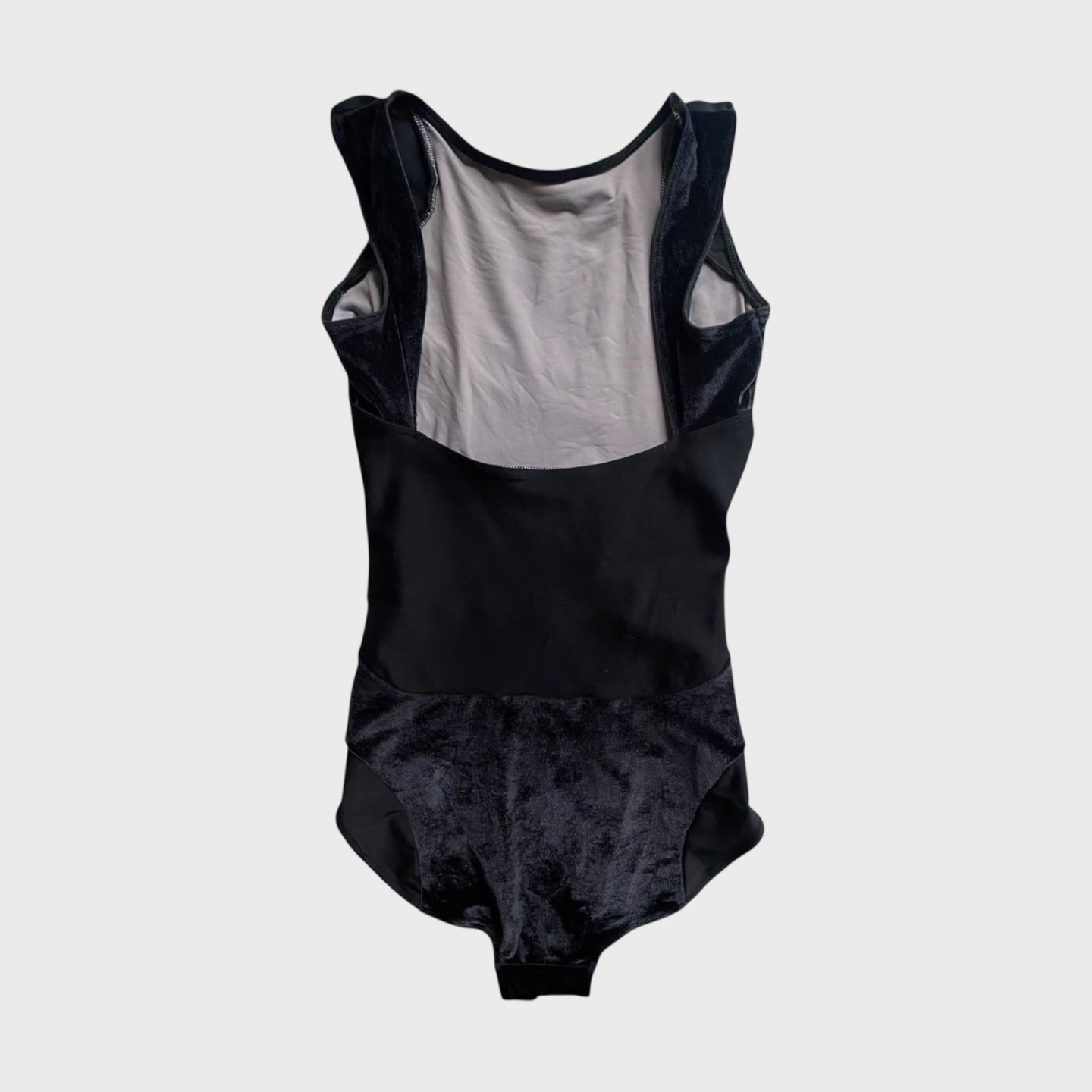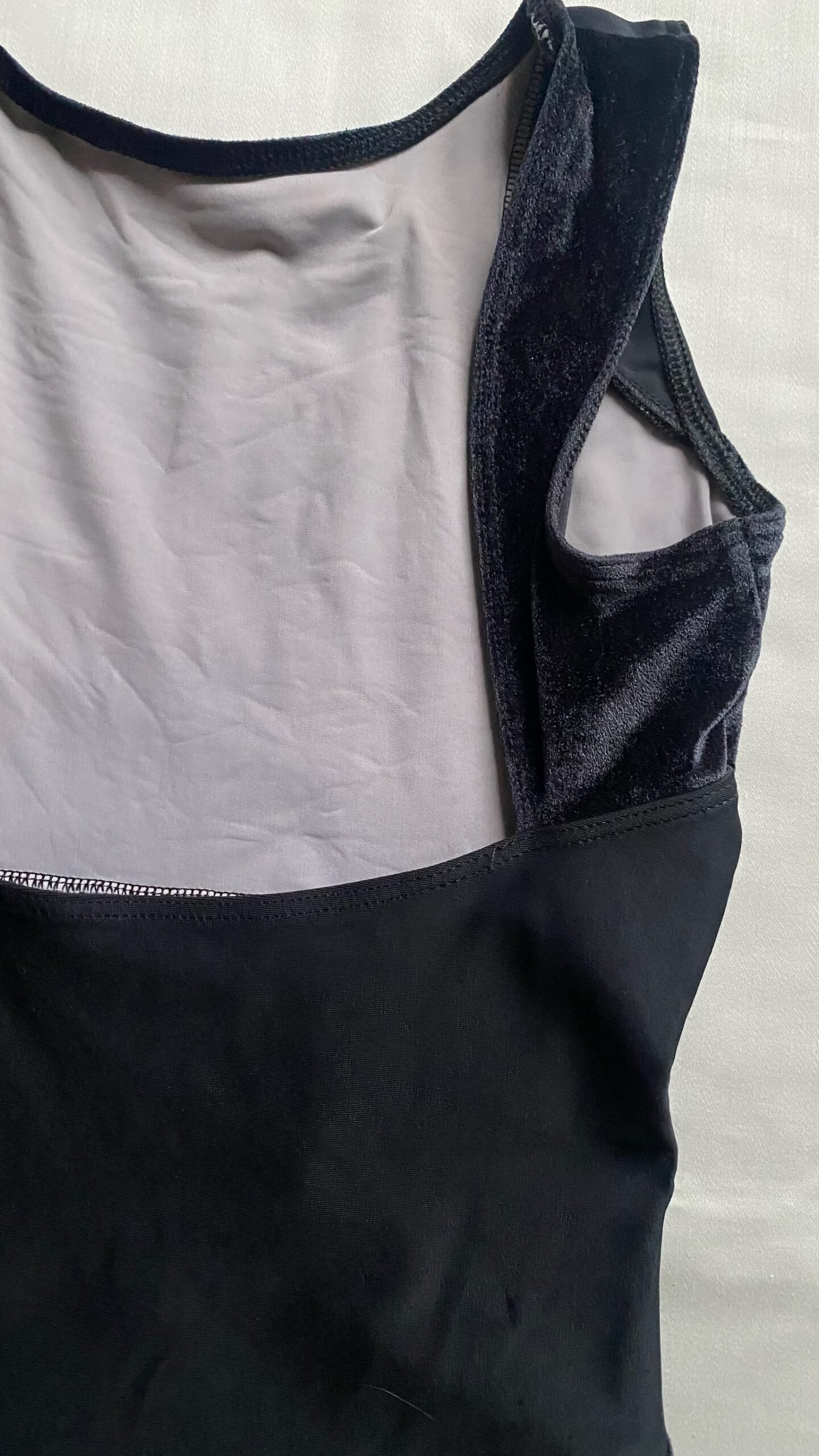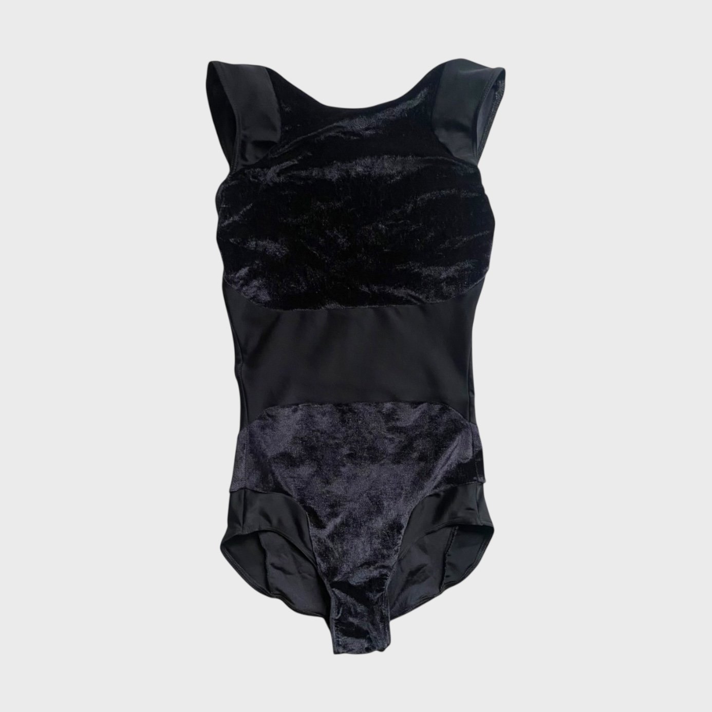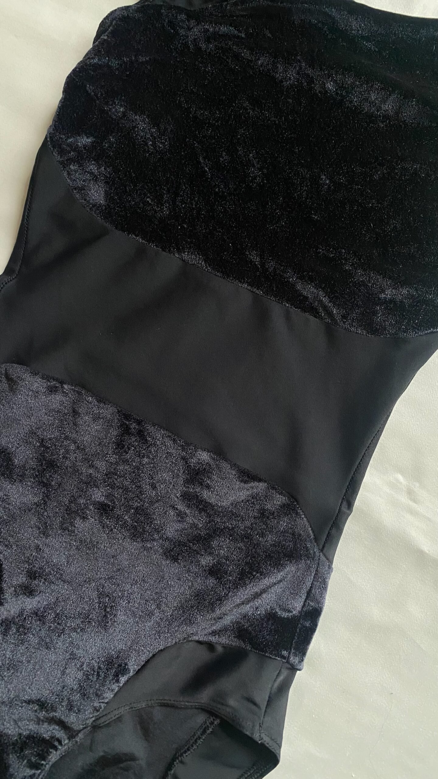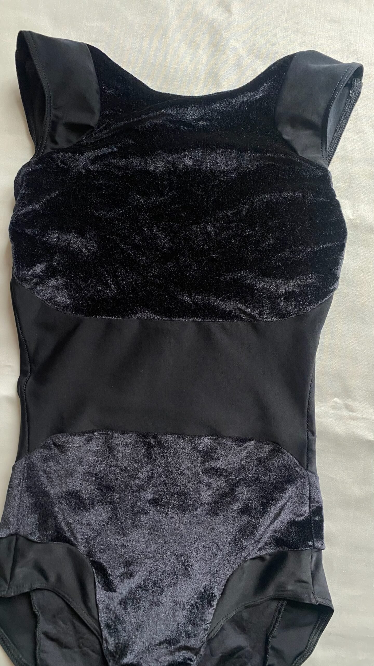 Black leotard with velvet inserts. Size M, fair condition – small defect on the seam at the back (see pictures).