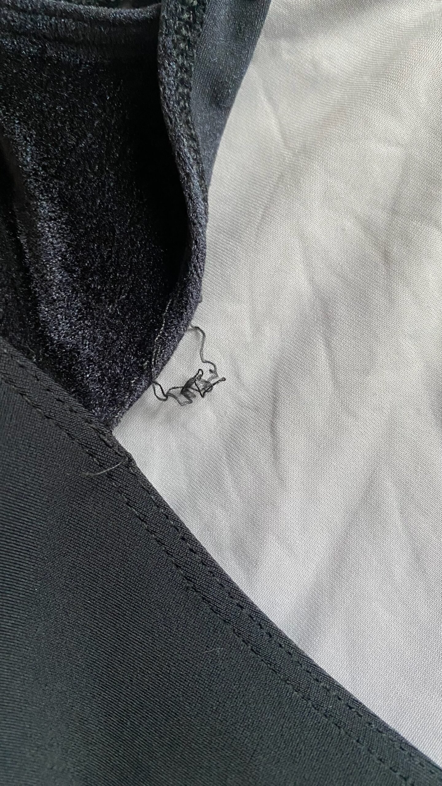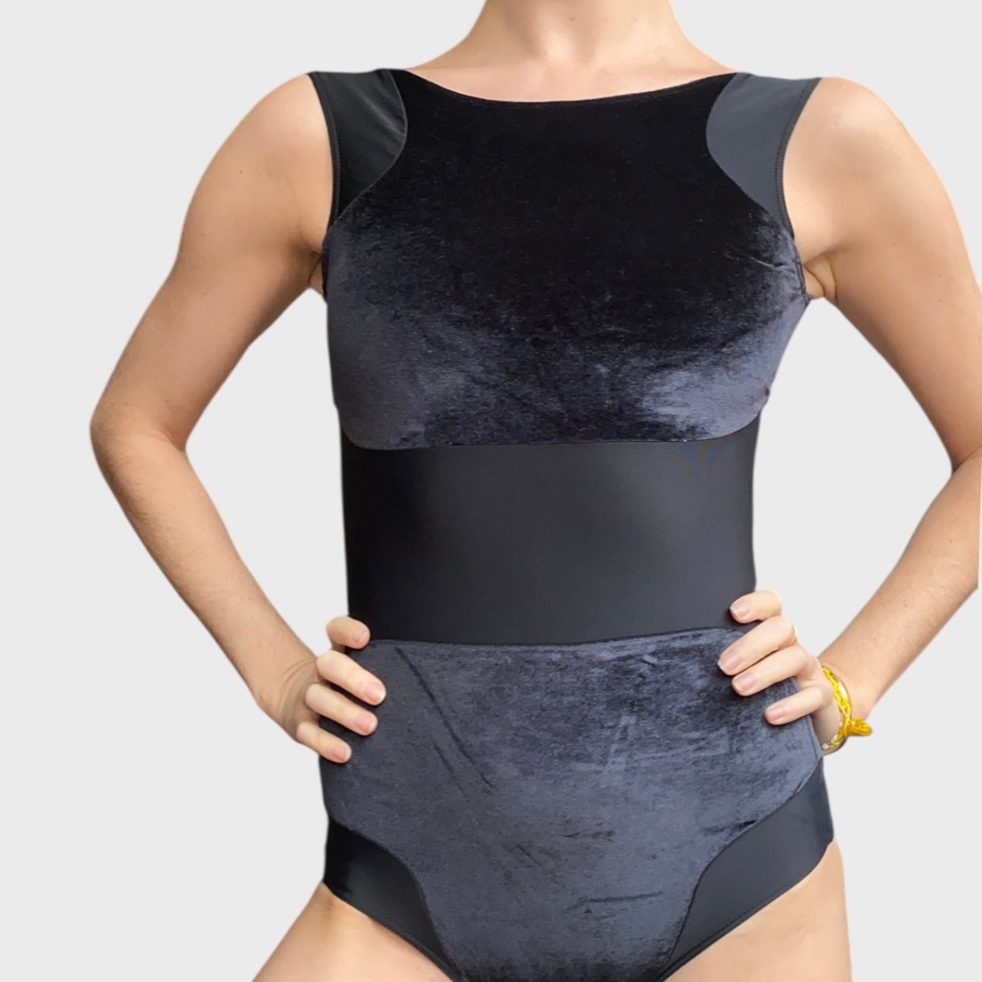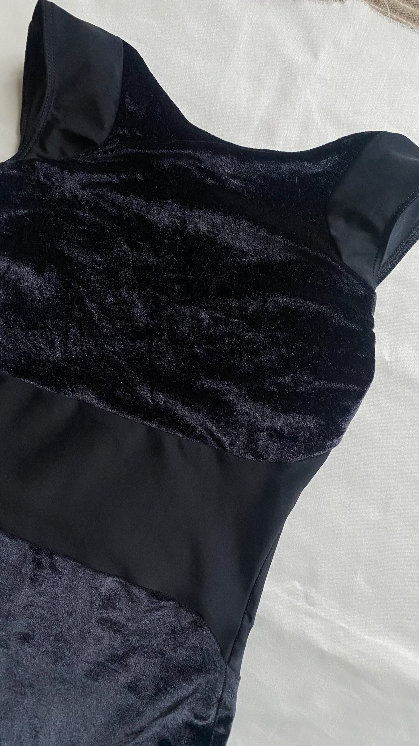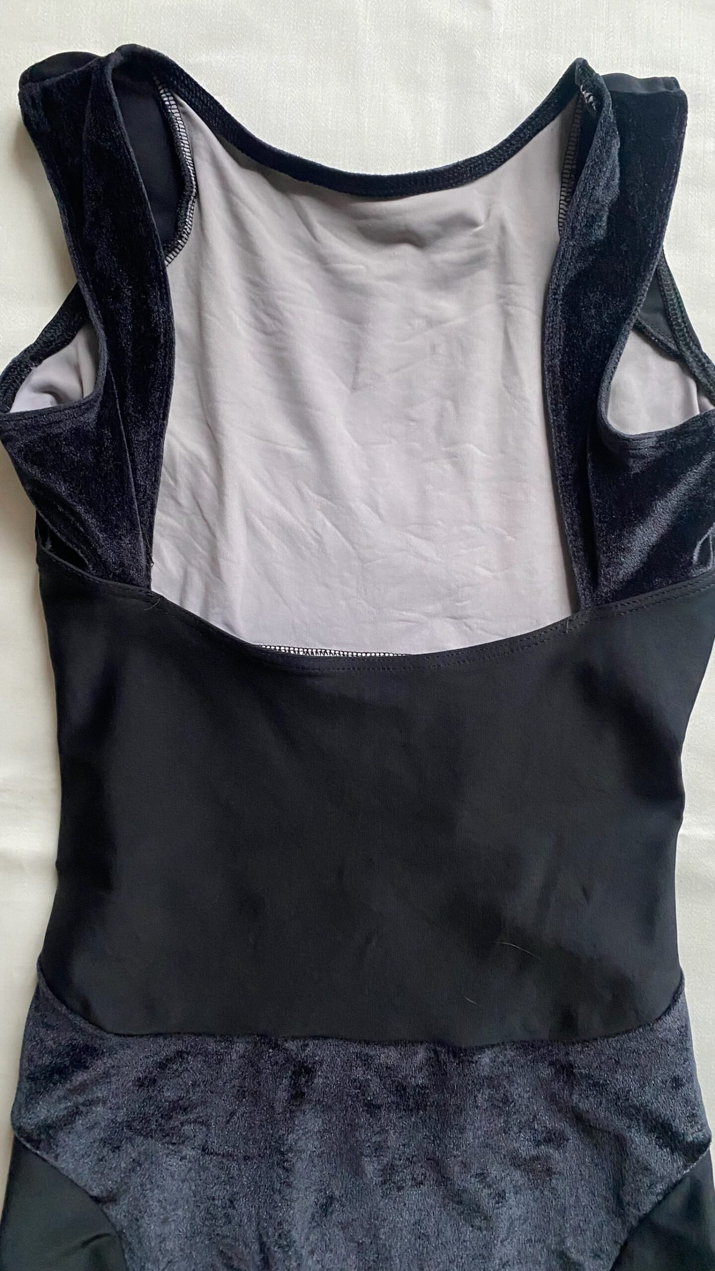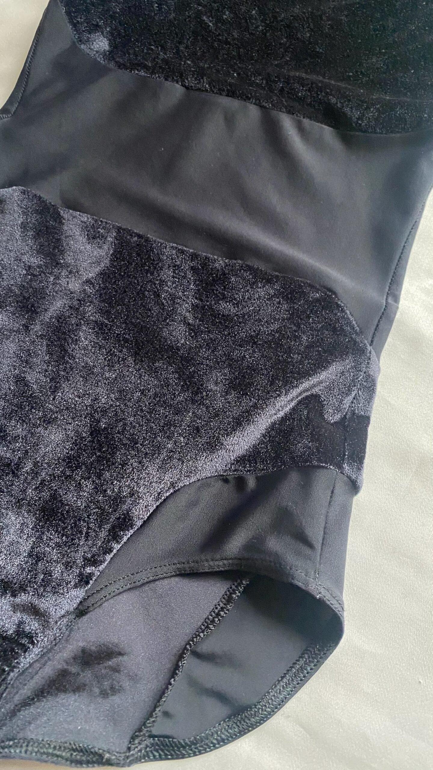 Black leotard with velvet inserts. Size M, fair condition – small defect on the seam at the back (see pictures).