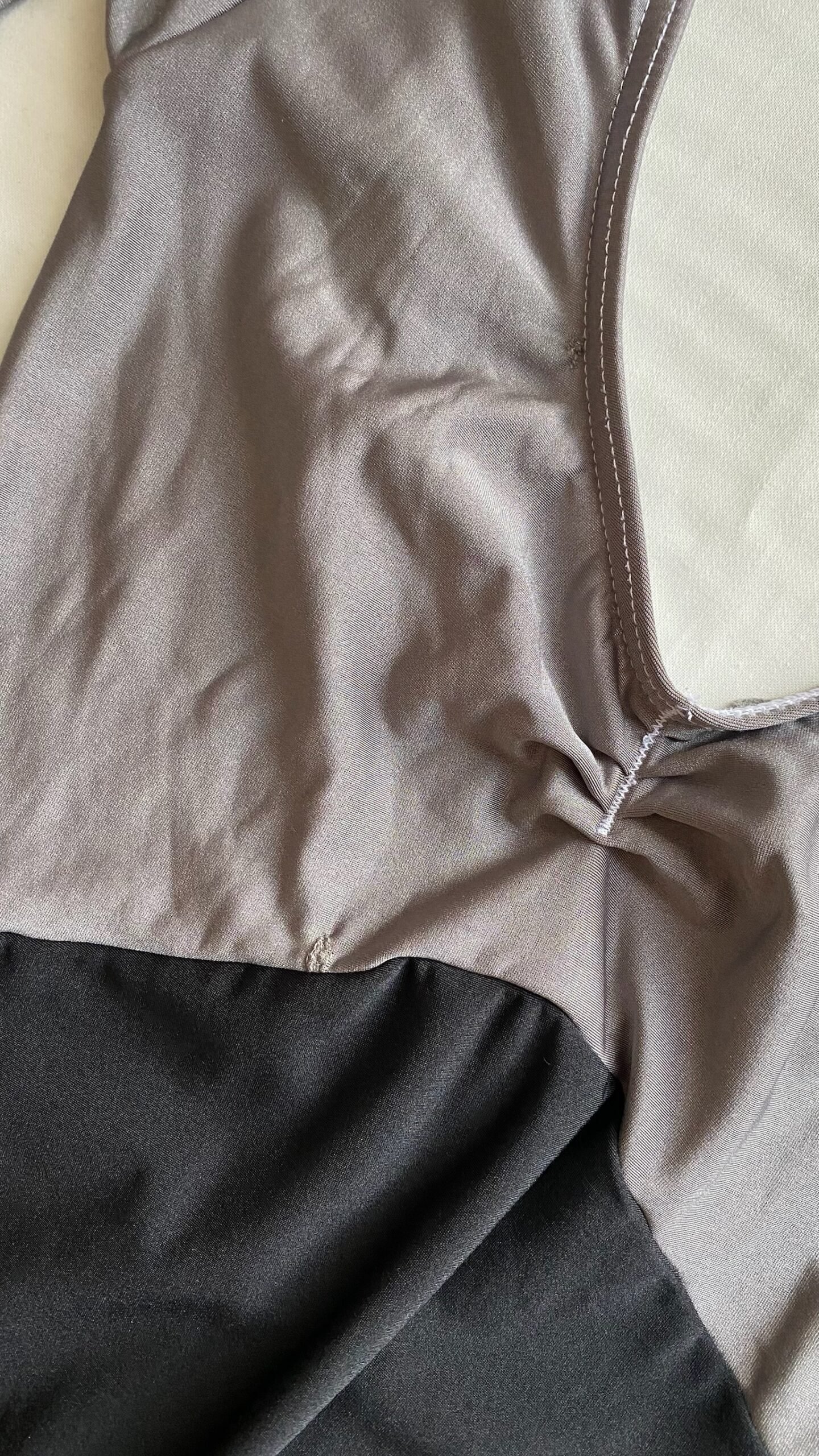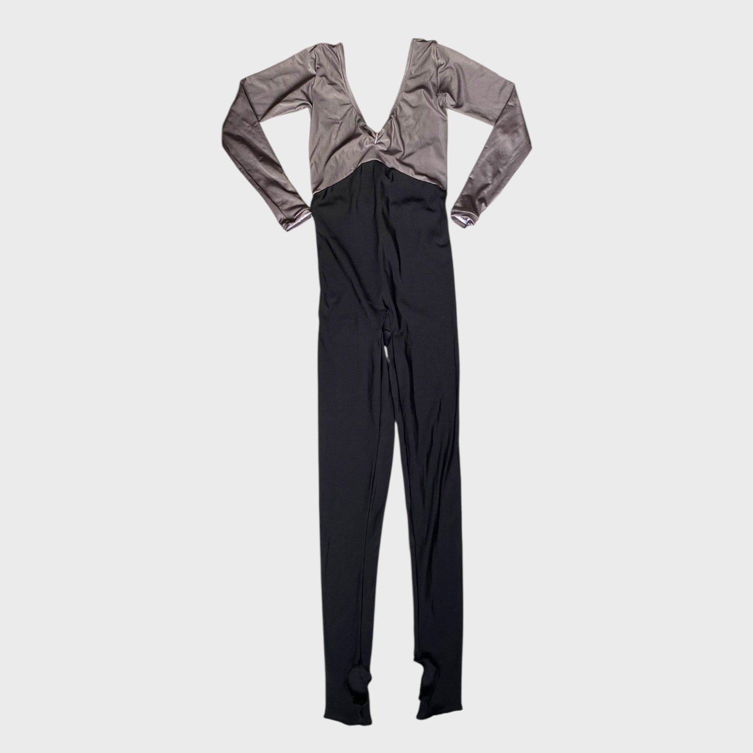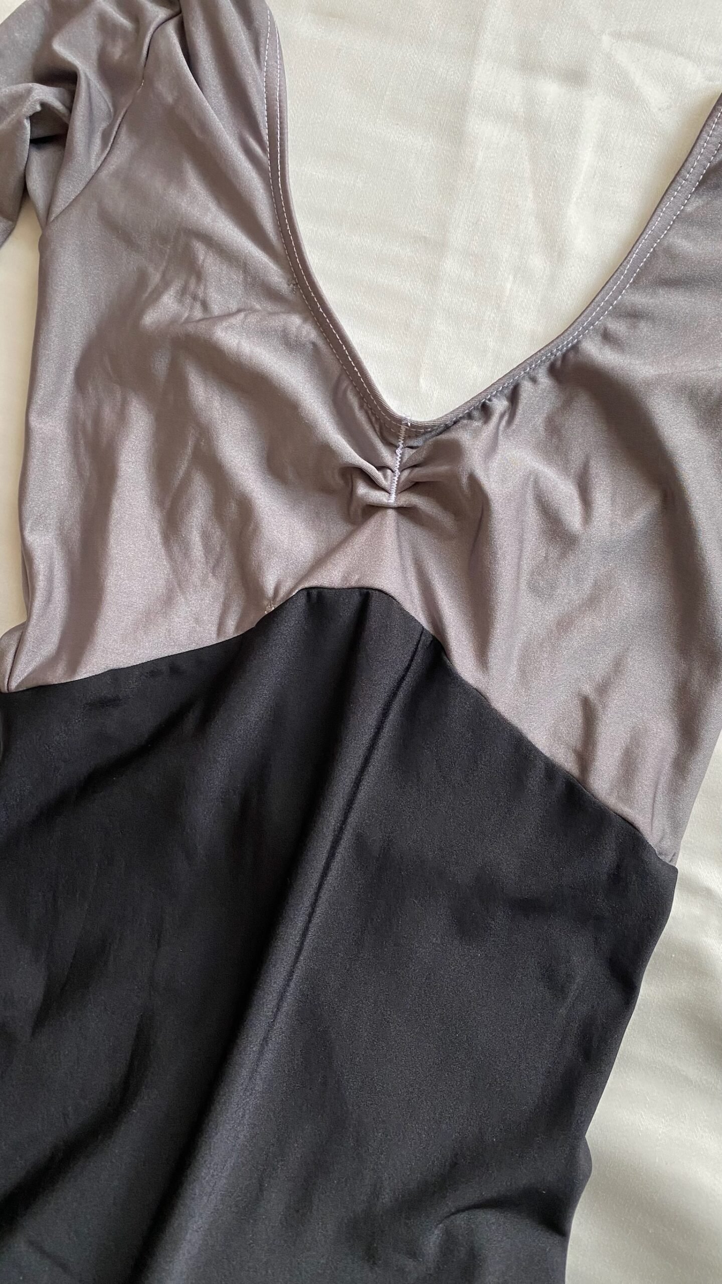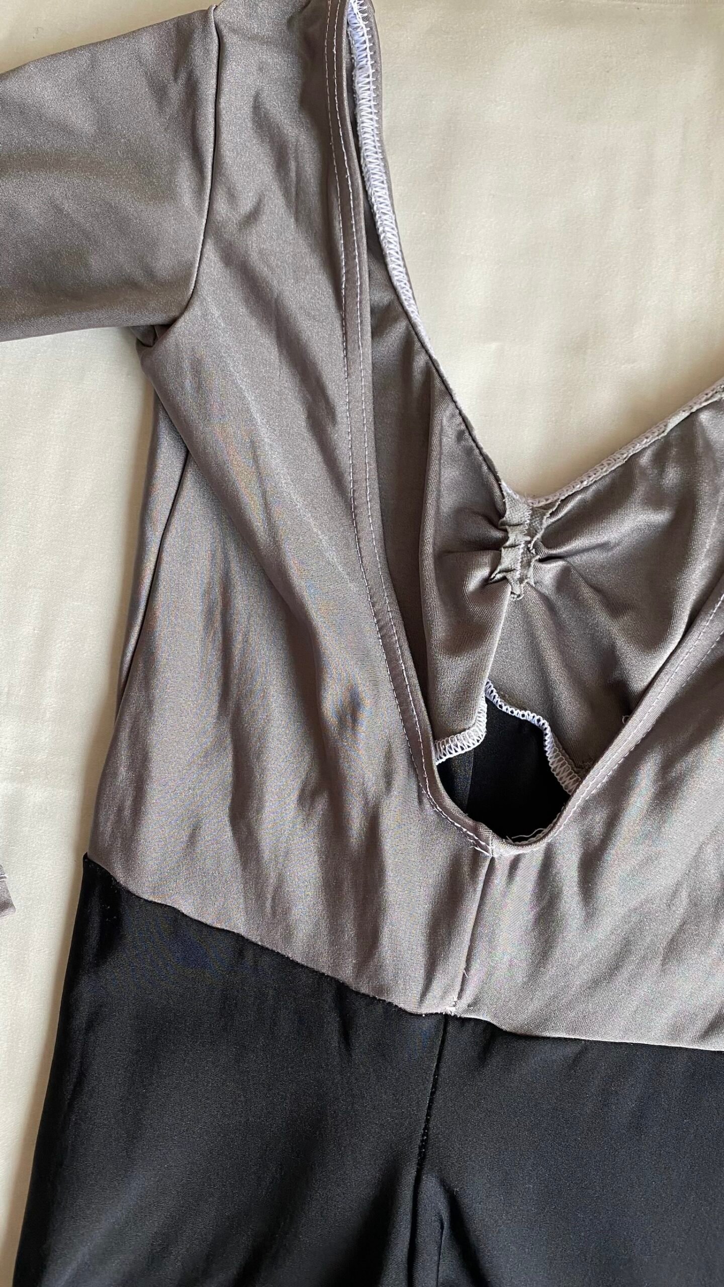 Black unitard with grey top and long sleeves. Size M, fair condition (see pictures).