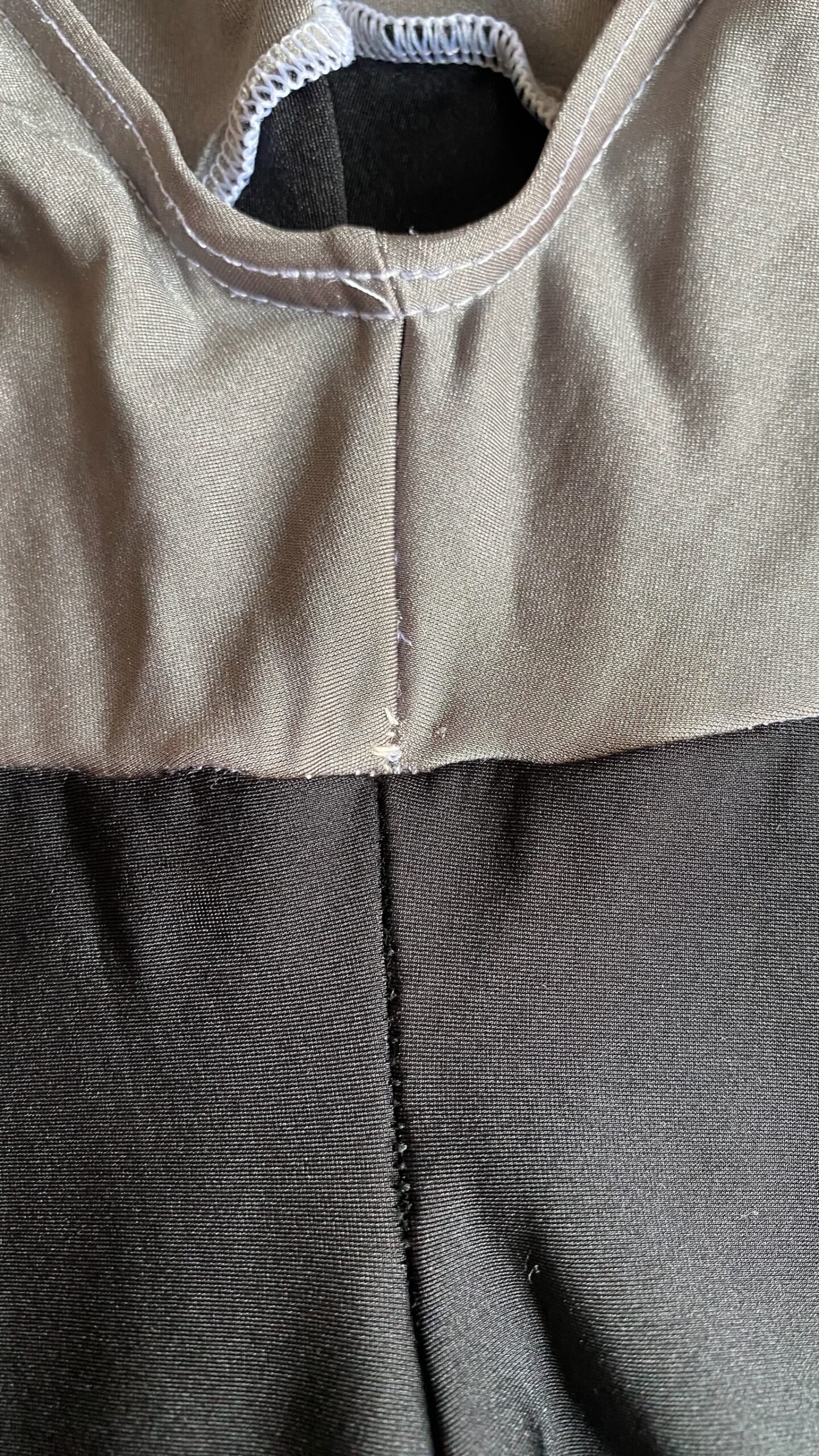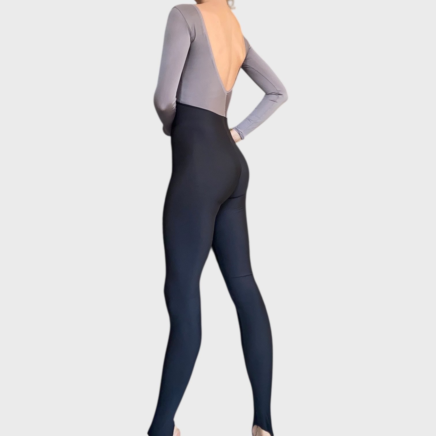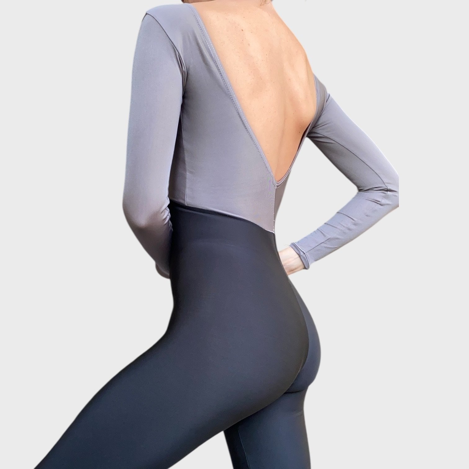 Black unitard with grey top and long sleeves. Size M, fair condition (see pictures).