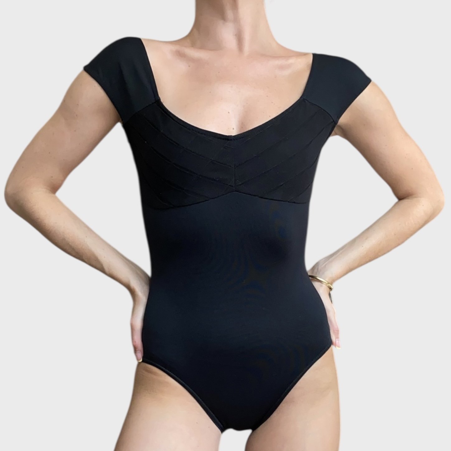 Bloch leotard in black with mesh top and cap sleeves. Size S, great condition.