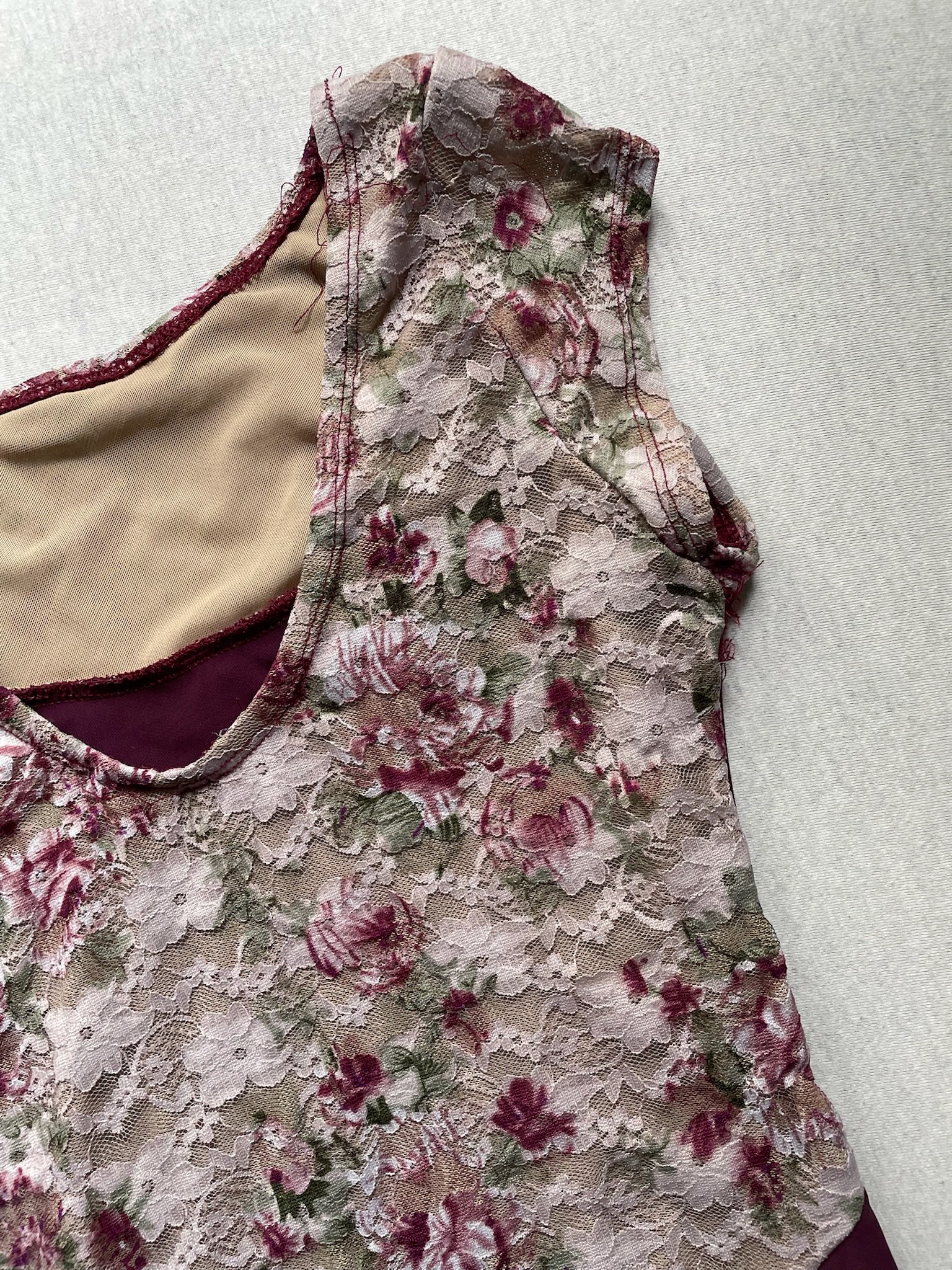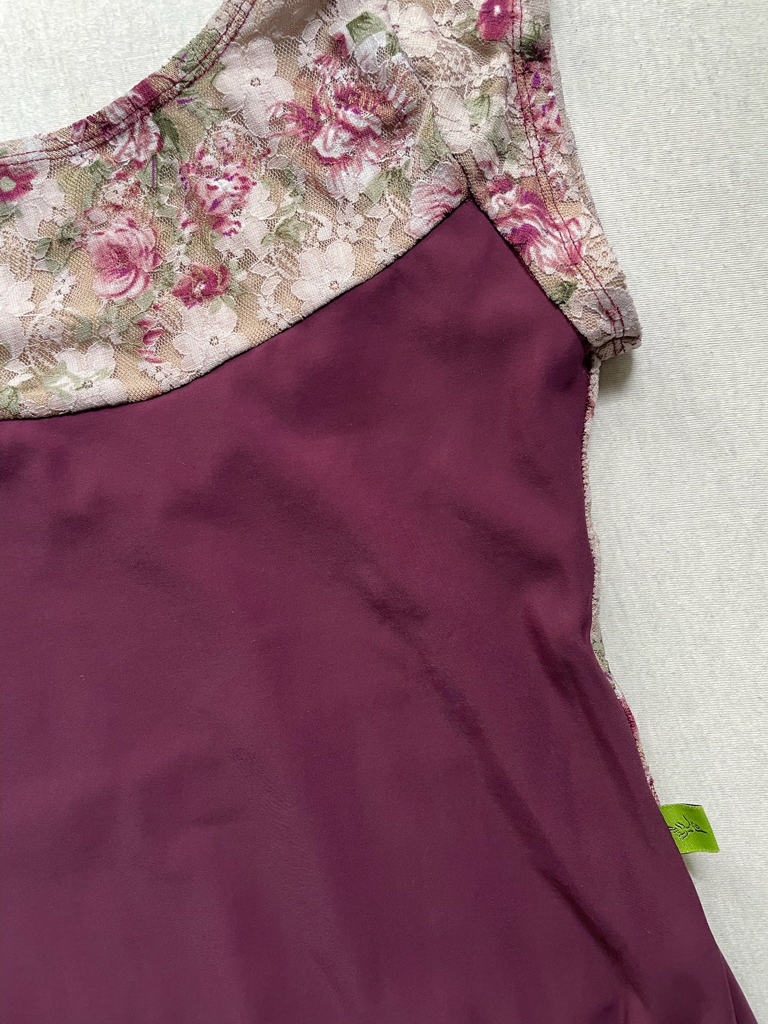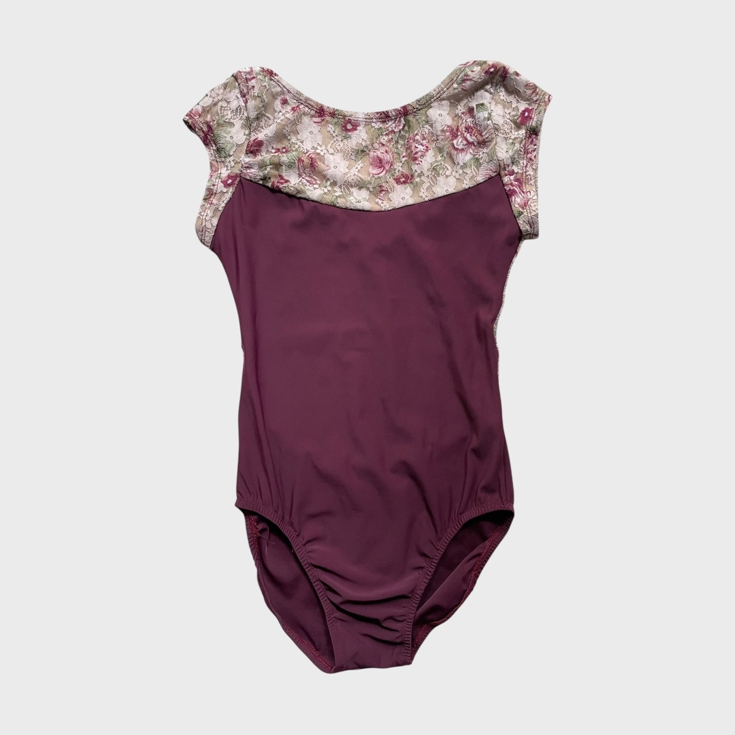 Burgundy leotard with lace back and cap sleeves. Size M, fair condition.