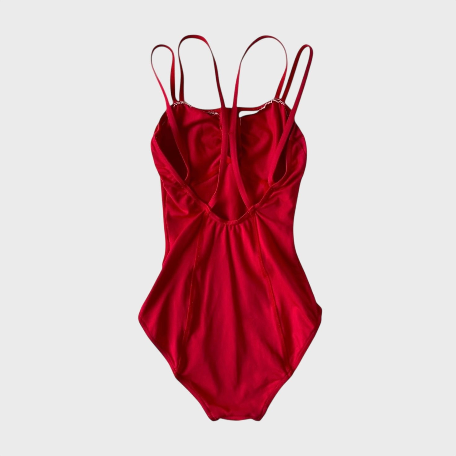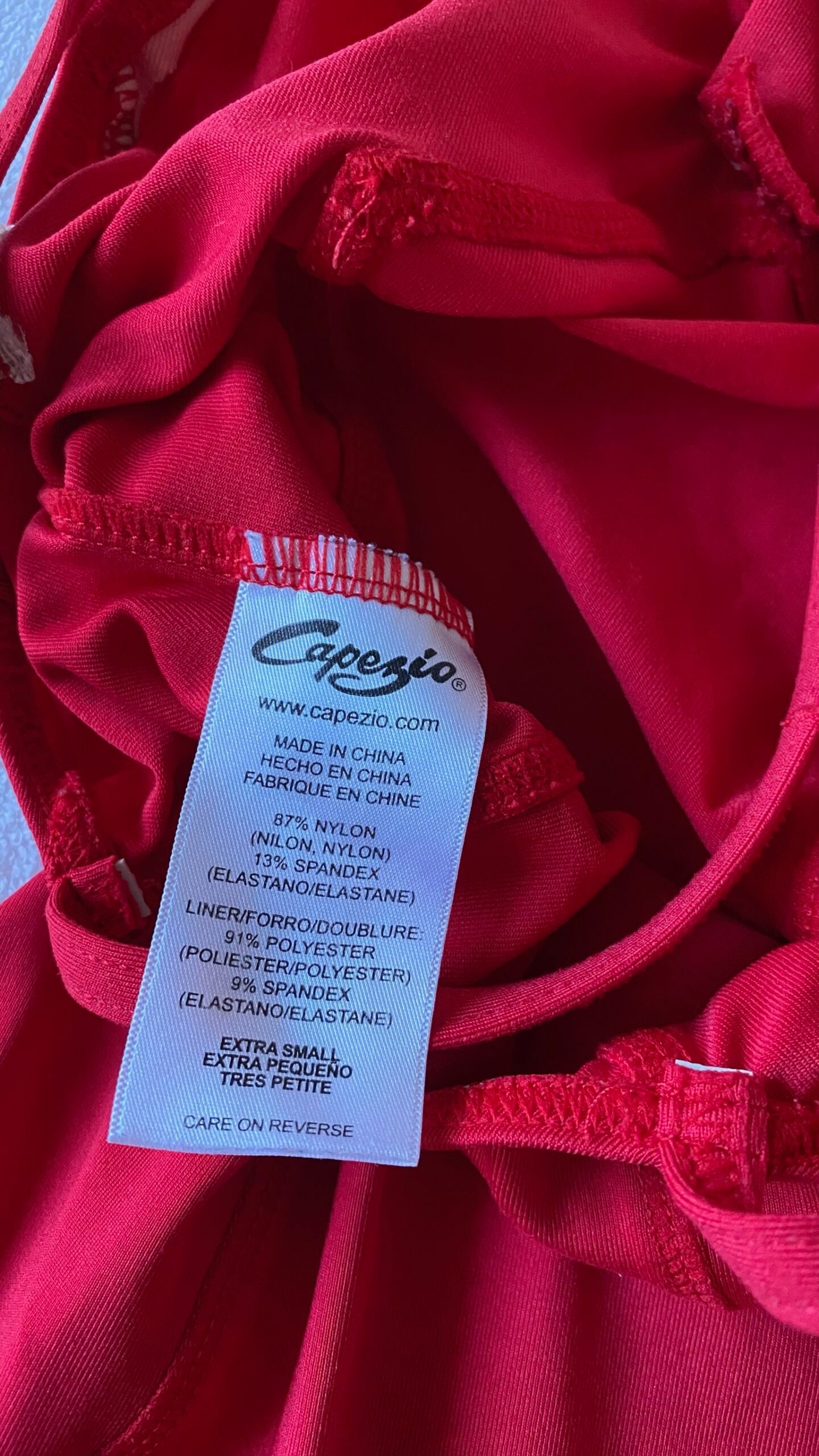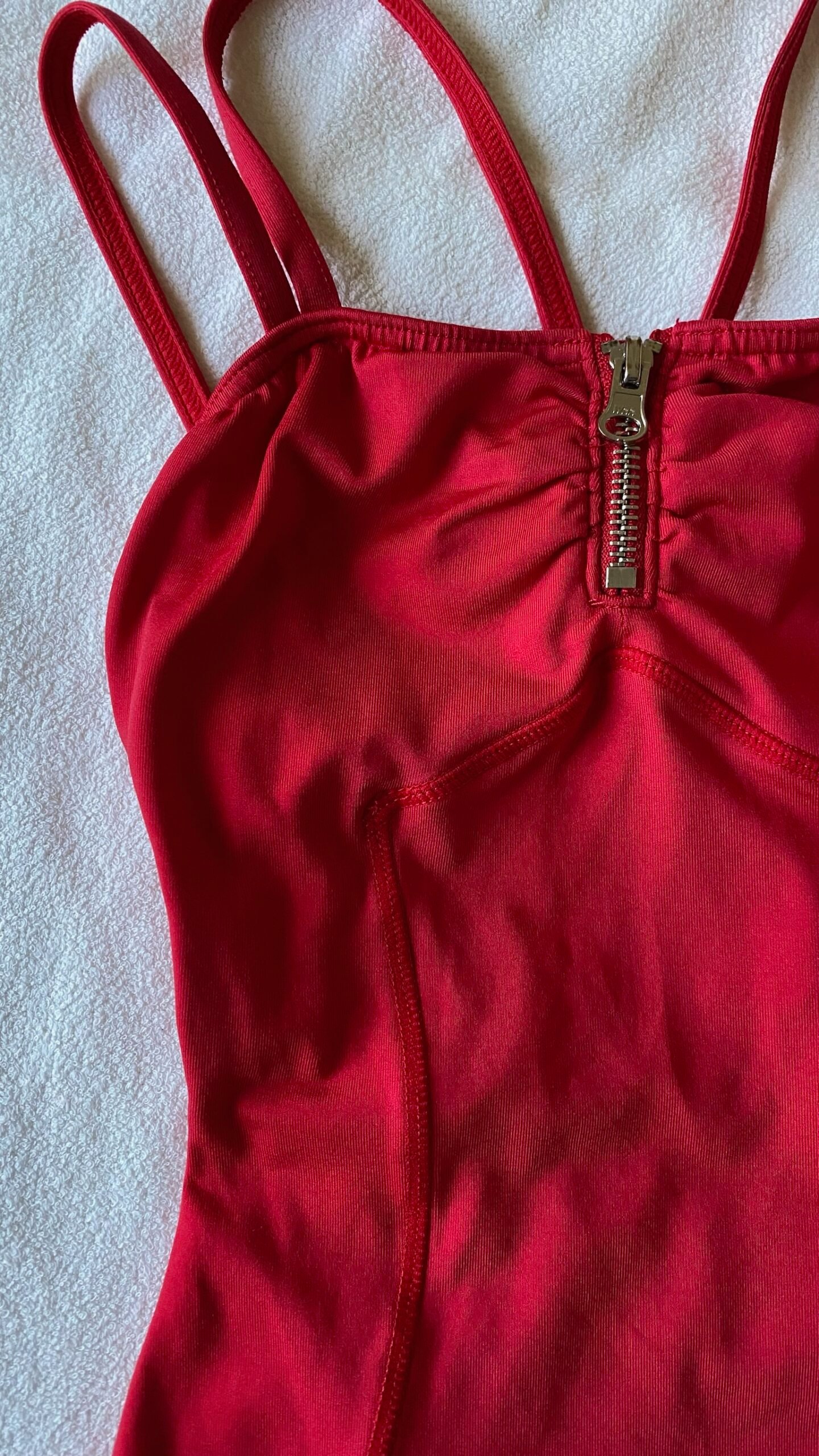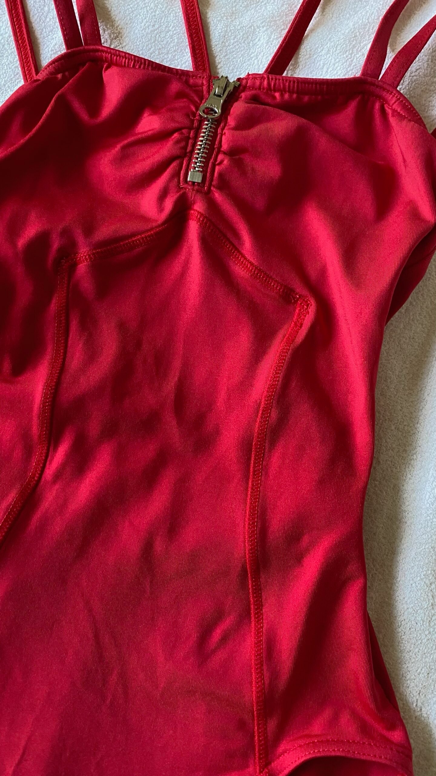 Capezio leotard in red with double straps and zipper. Size XS, fair condition.