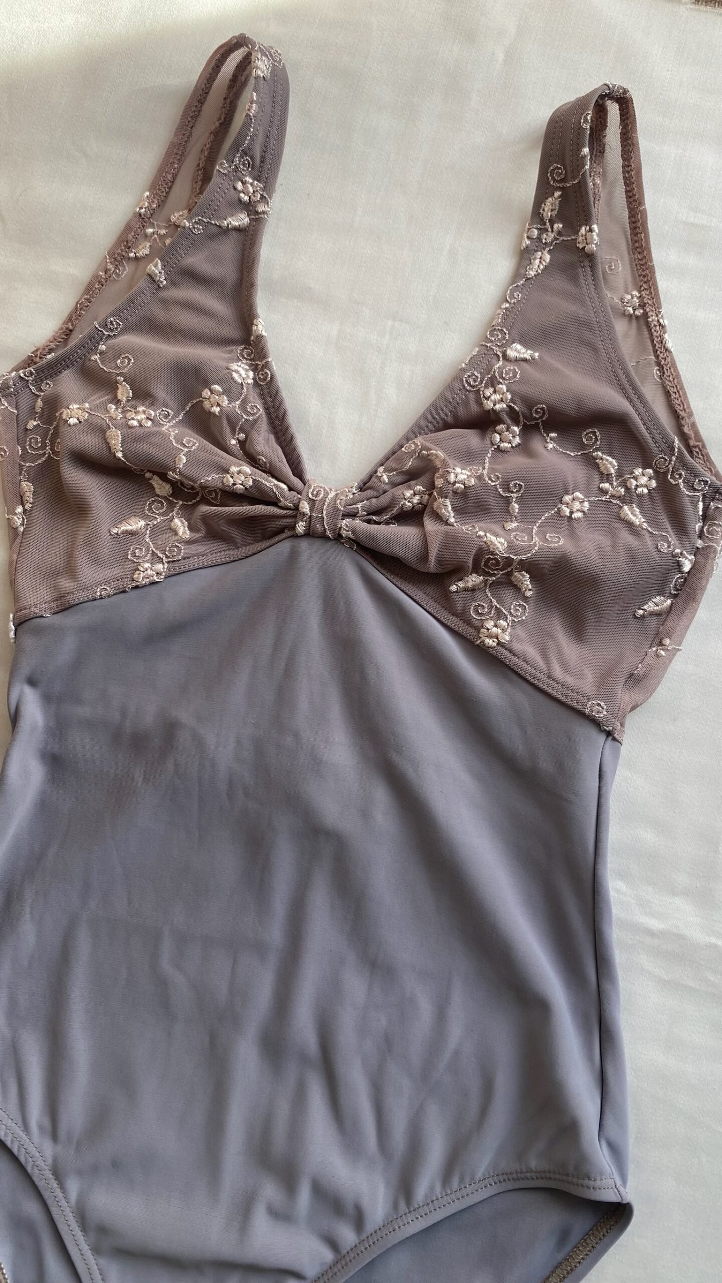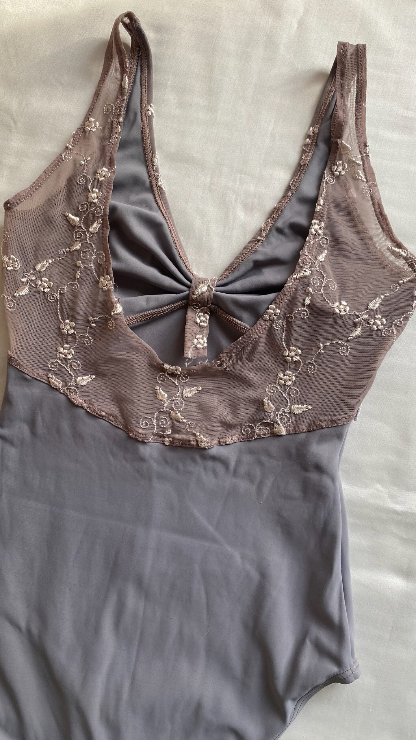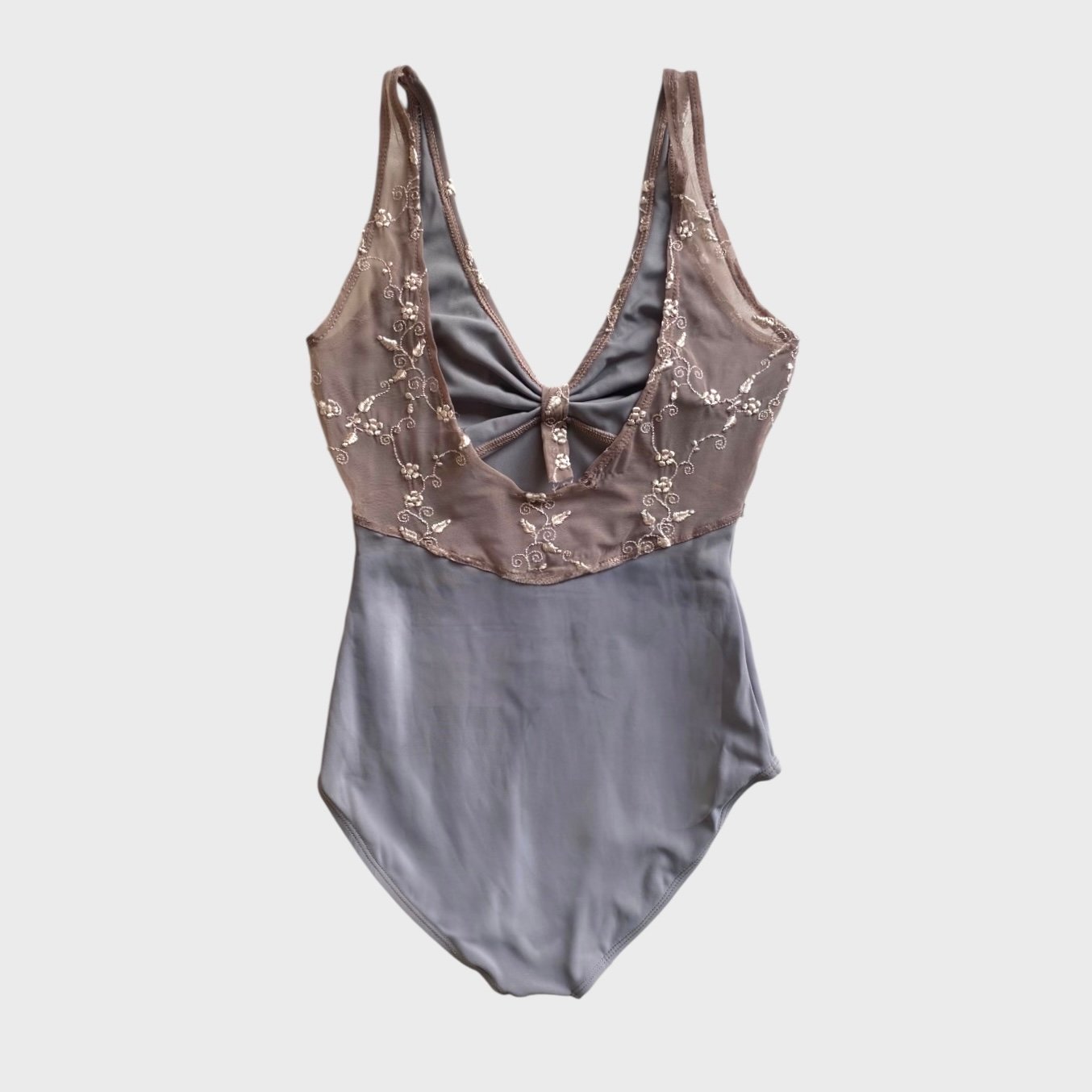 DellaLo’ Milano leotard in grey with embroidered mesh top. Size S, fair condition – the seam at the back is damaged (see pictures).