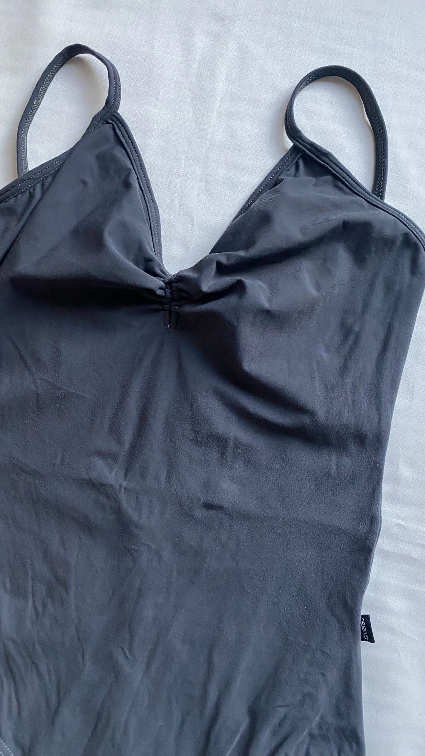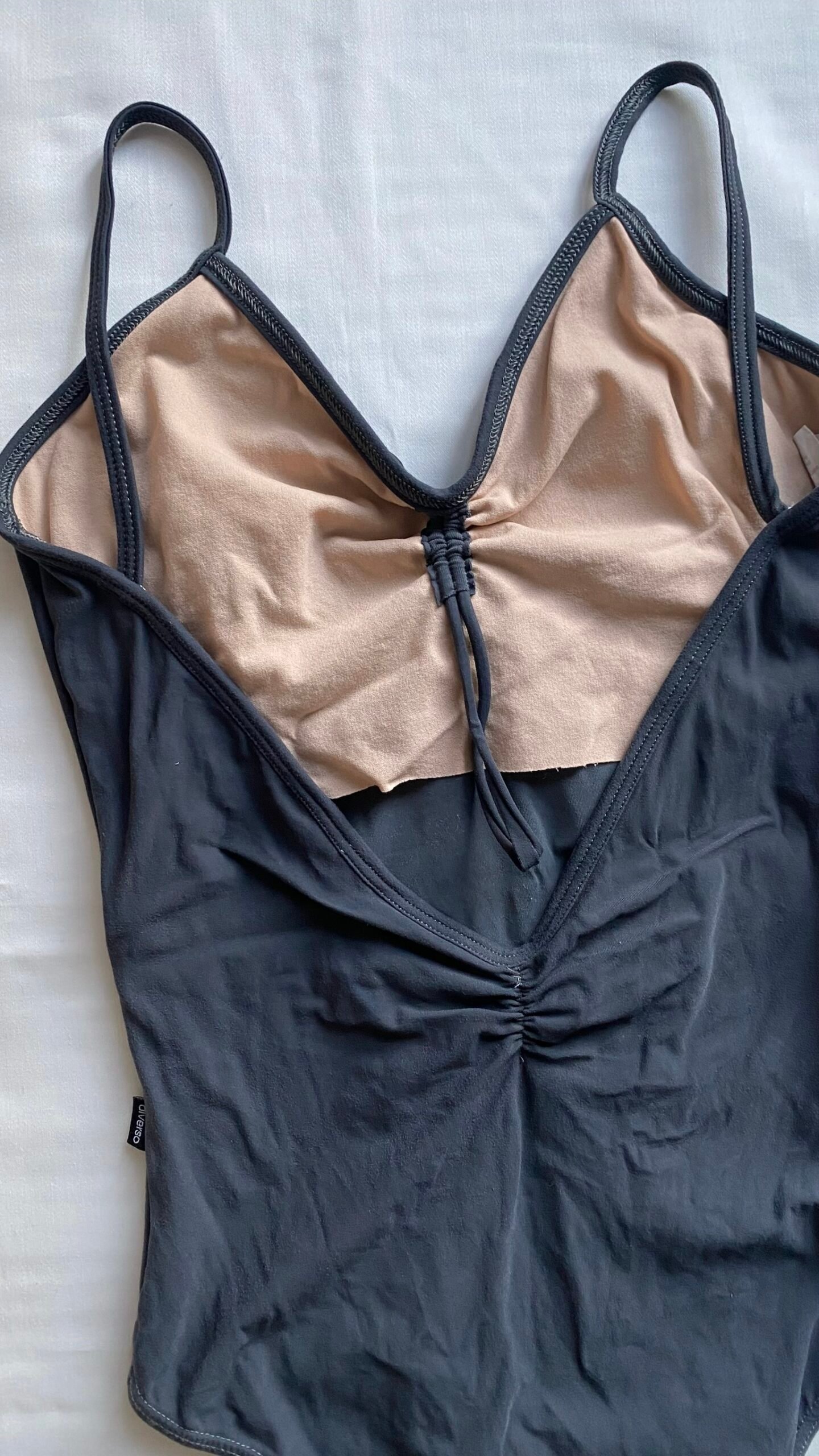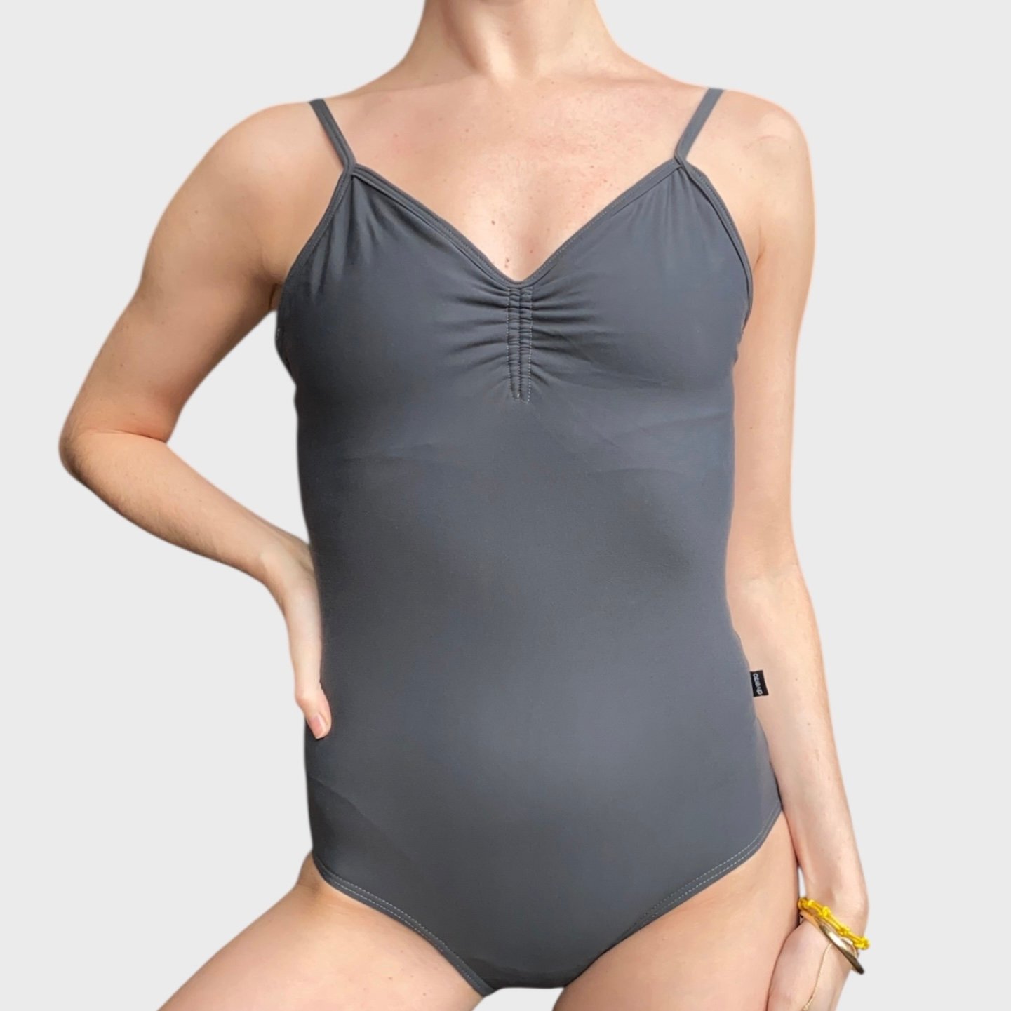 Diverso camisole leotard in grey with low back. Size M, fair condition – small defect on the seam in the leg area.