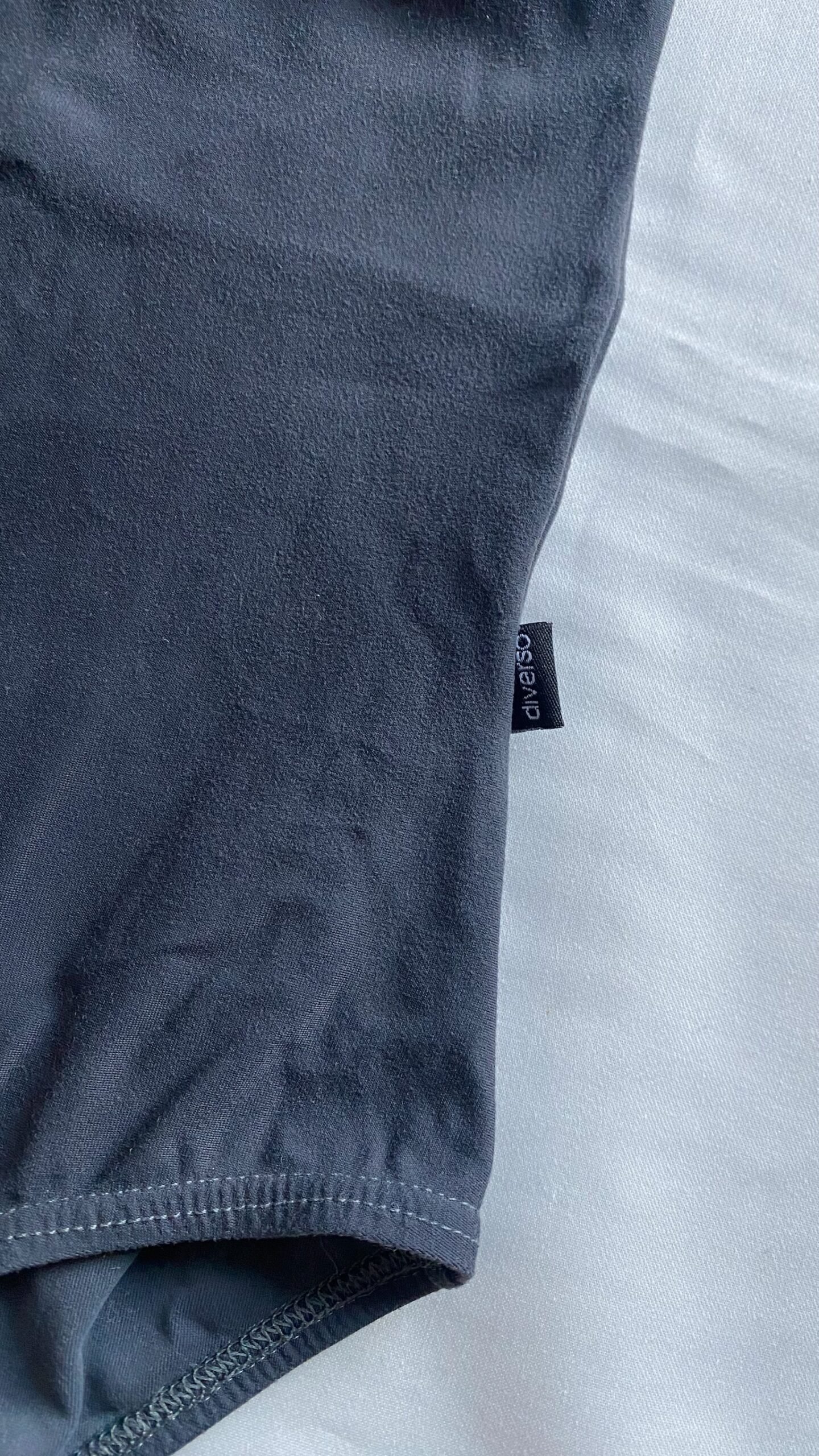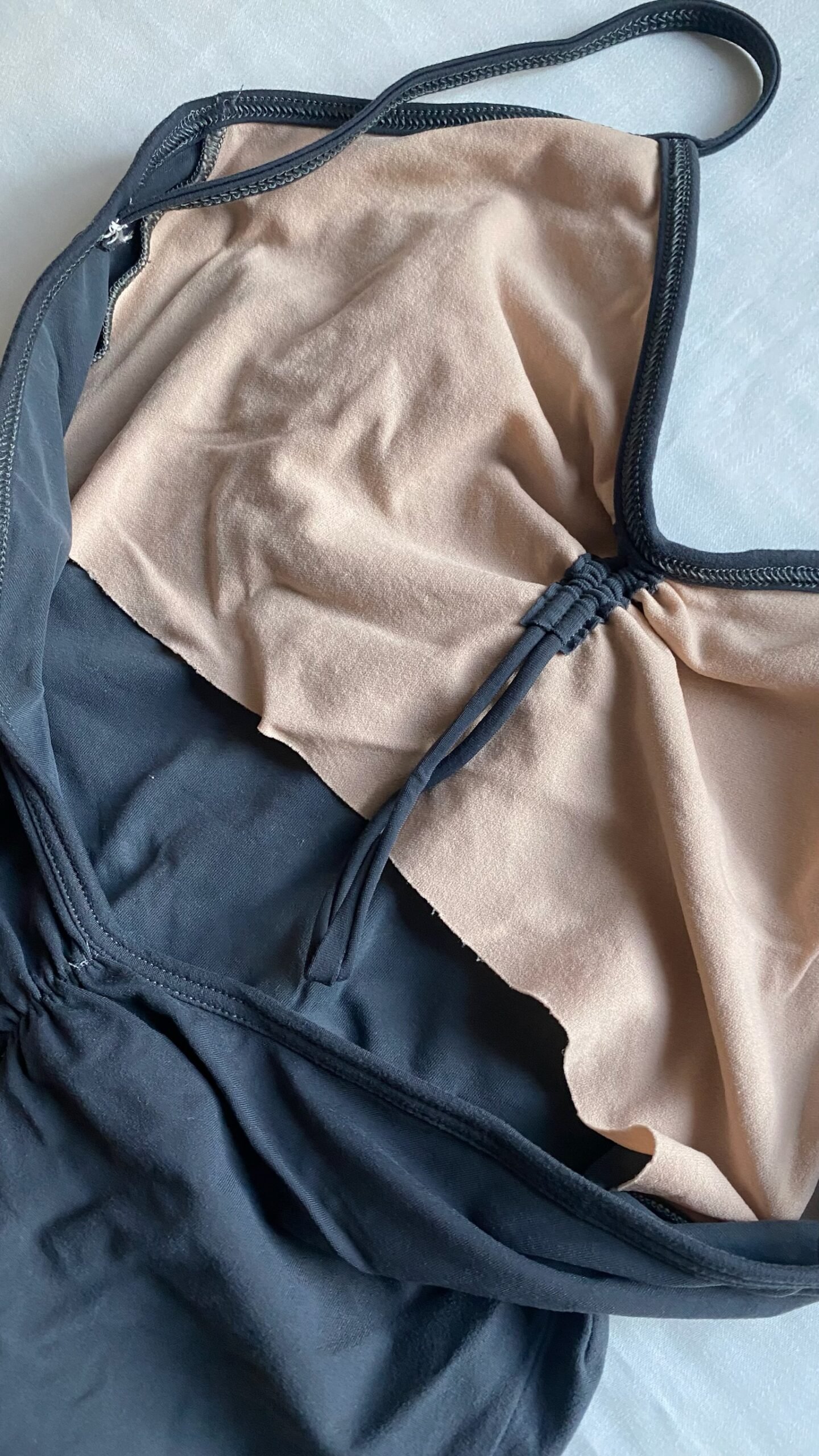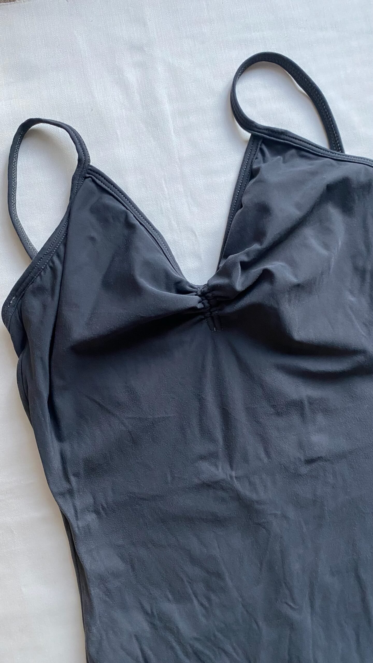 Diverso camisole leotard in grey with low back. Size M, fair condition – small defect on the seam in the leg area.