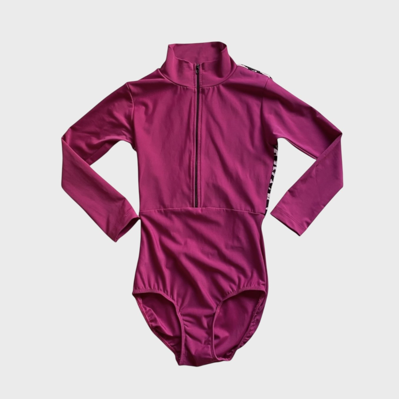 Eleve Dancewear leotard in dark pink with long sleeves and patterned mesh back. Size S, fair condition.