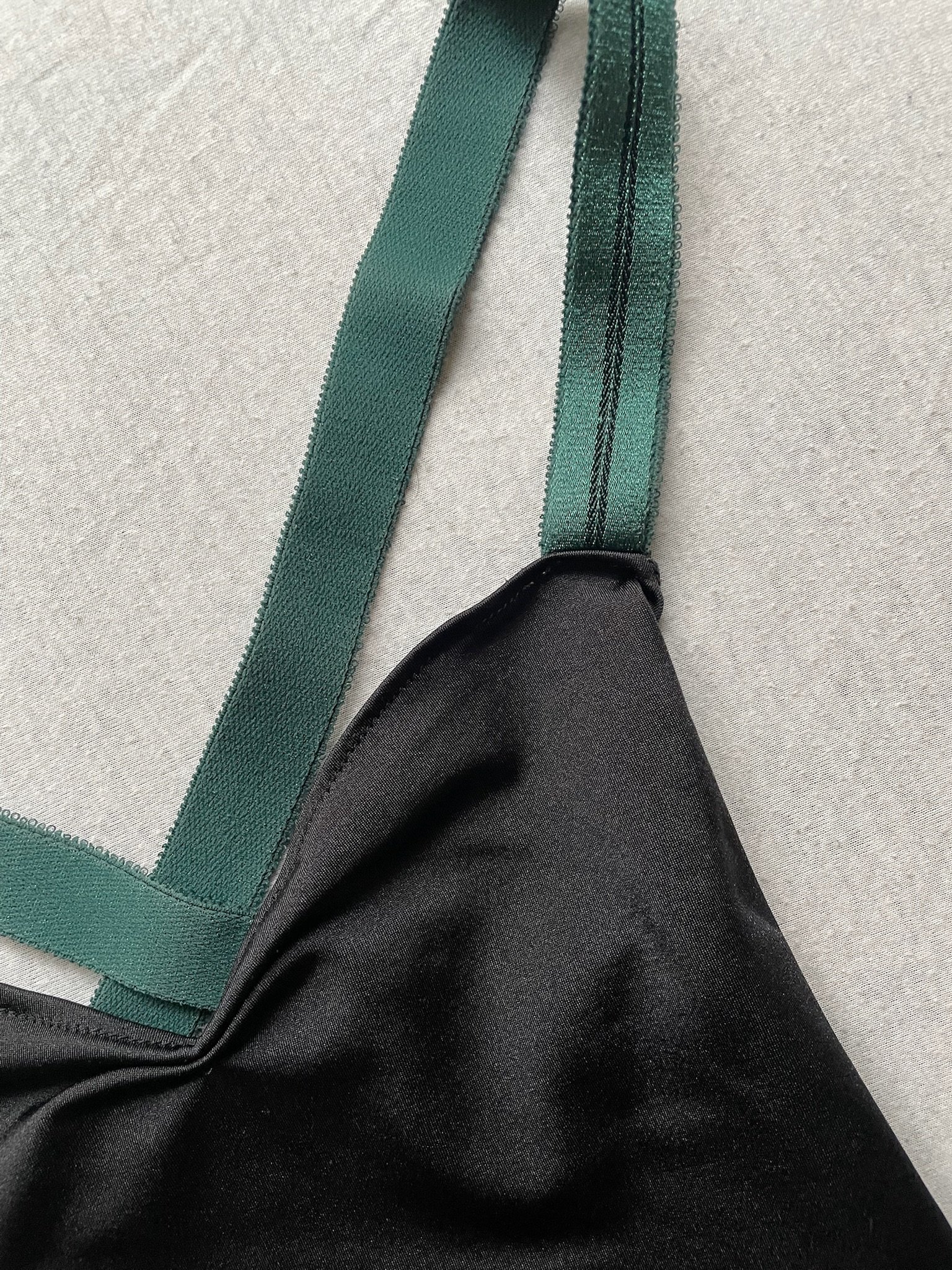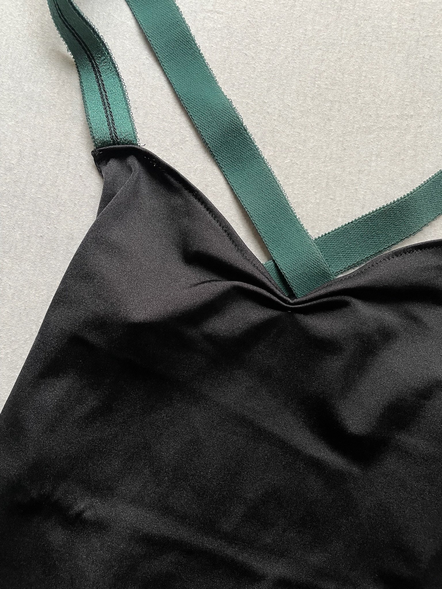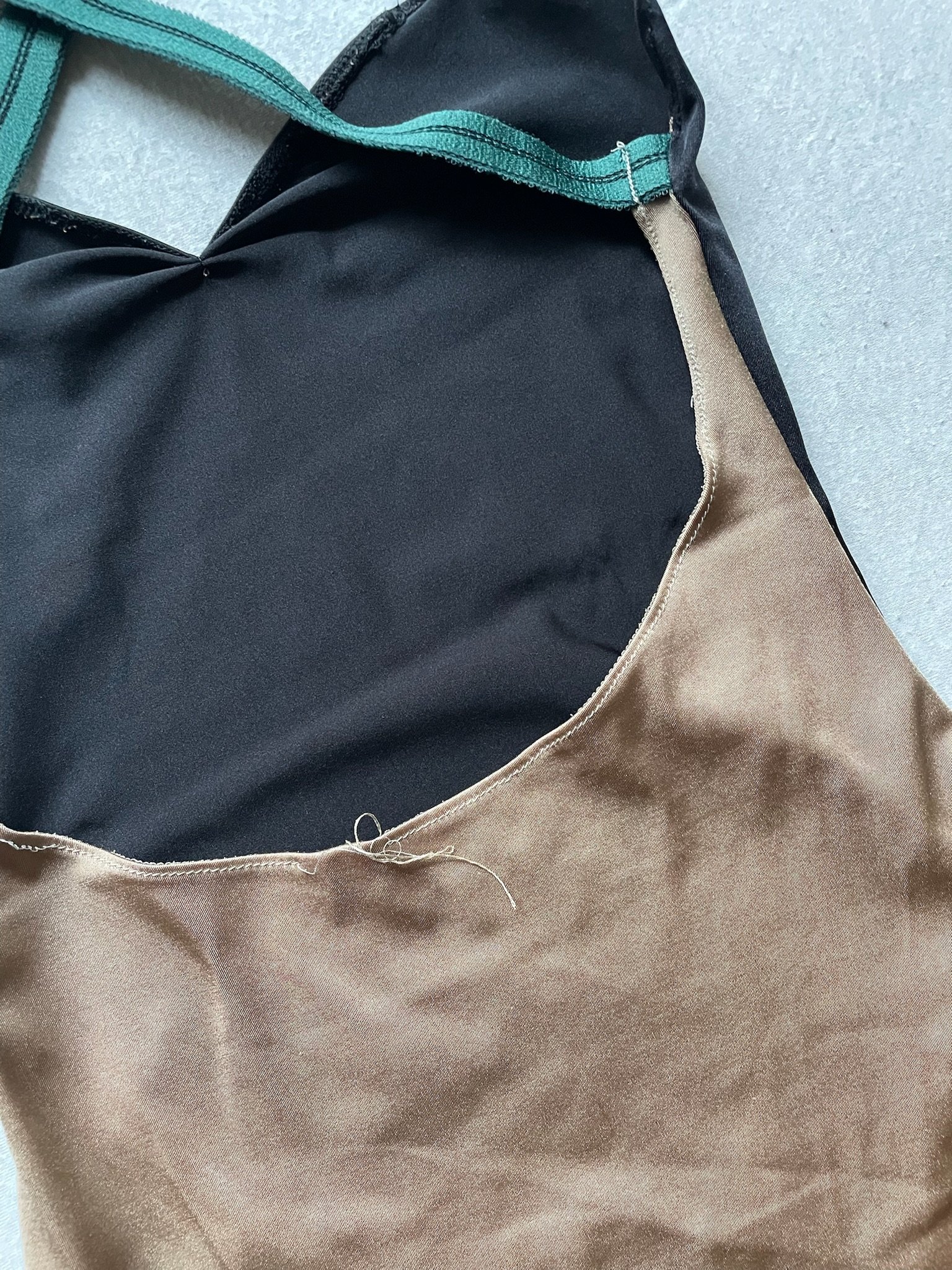 Fukubi leotard in black with nude back side and dark green elastic bands. Size M, fair condition – the seam at the back is damaged.