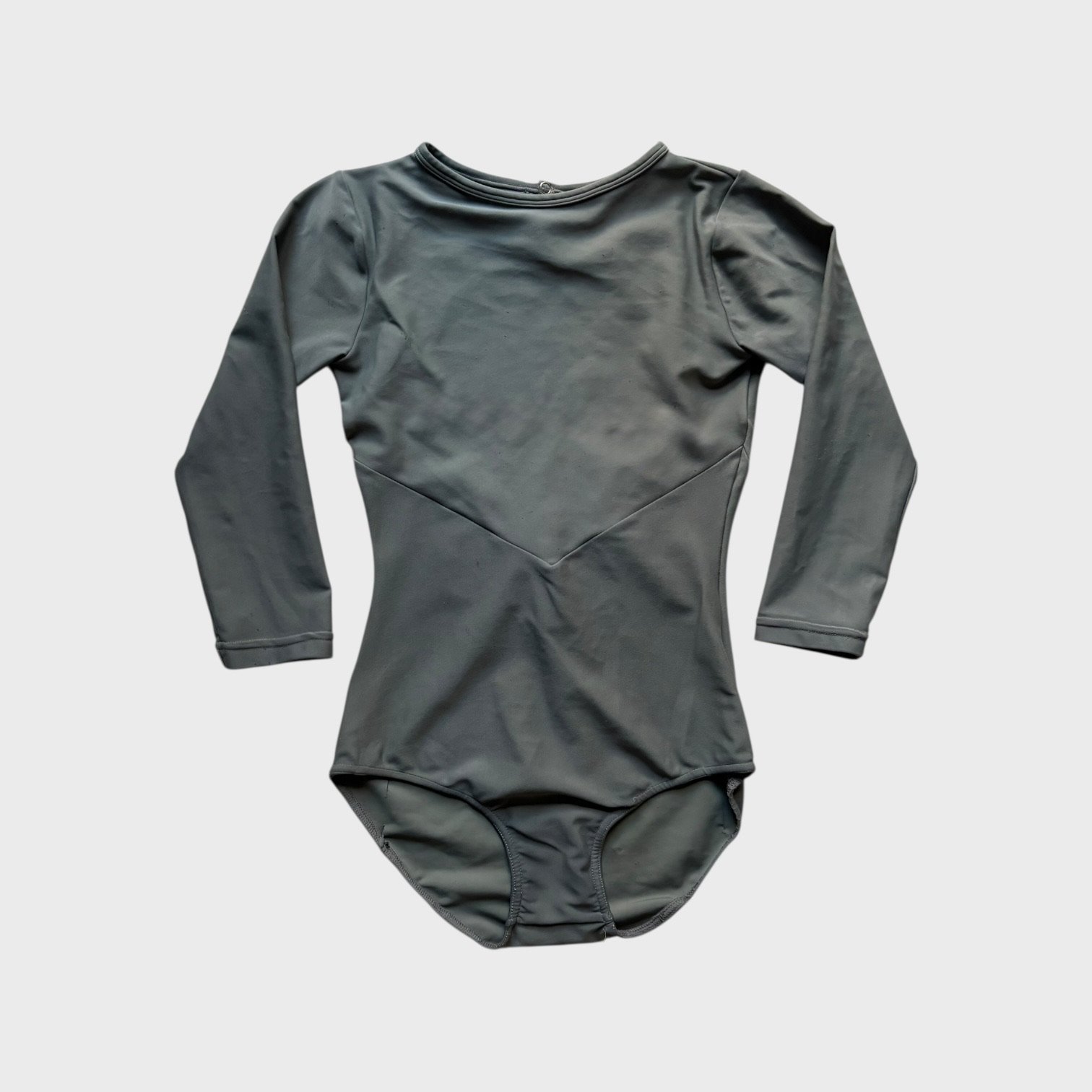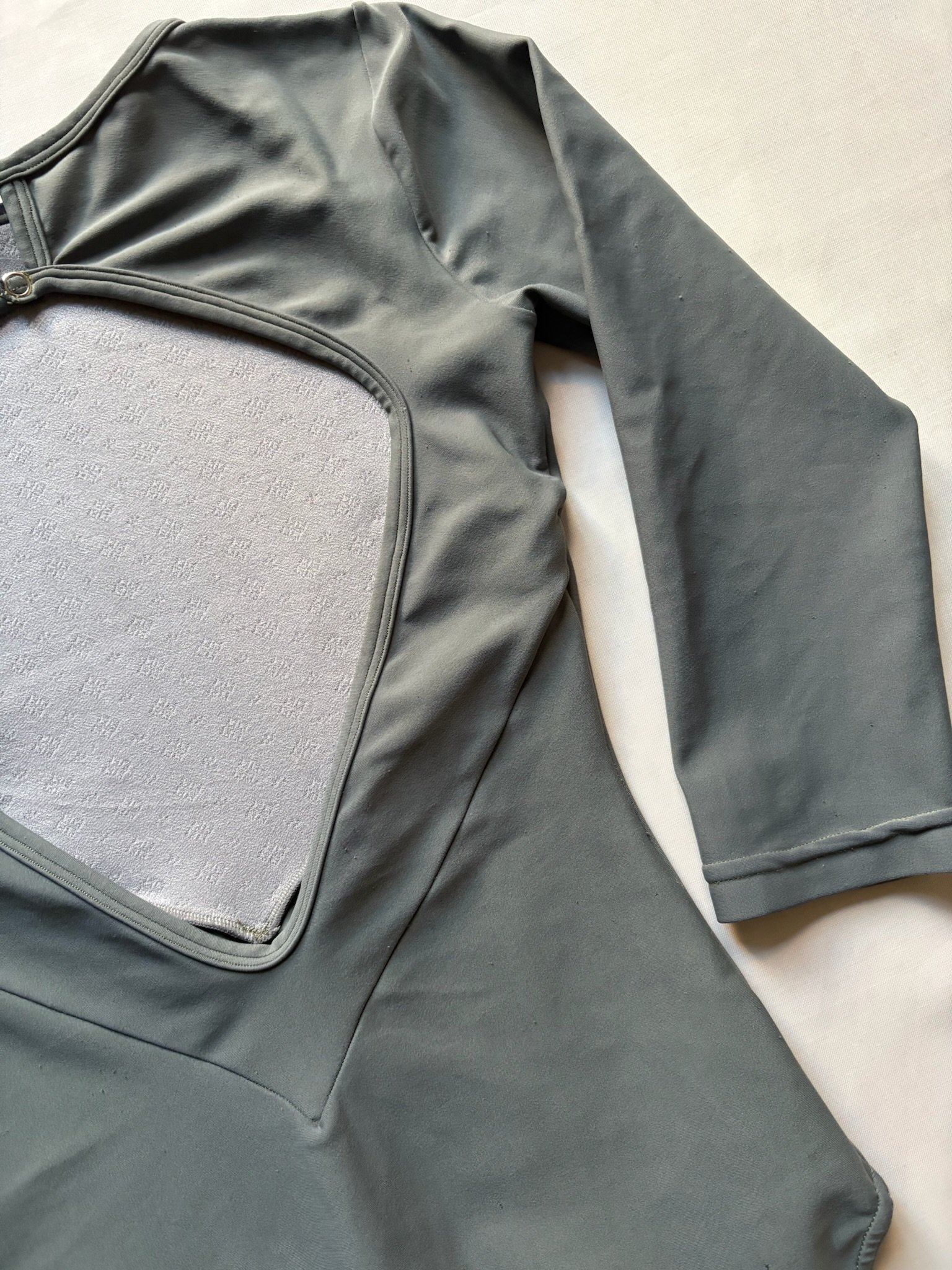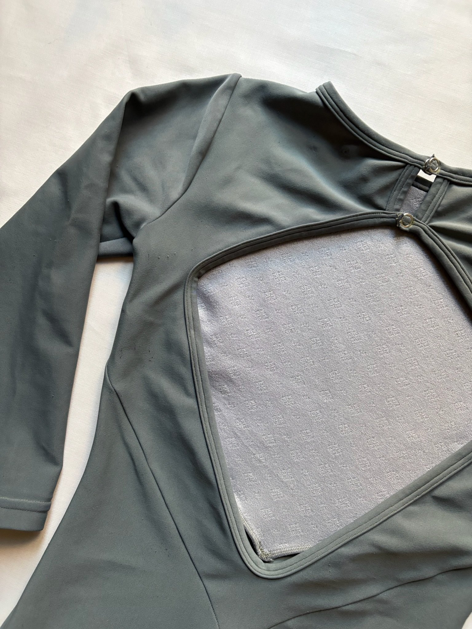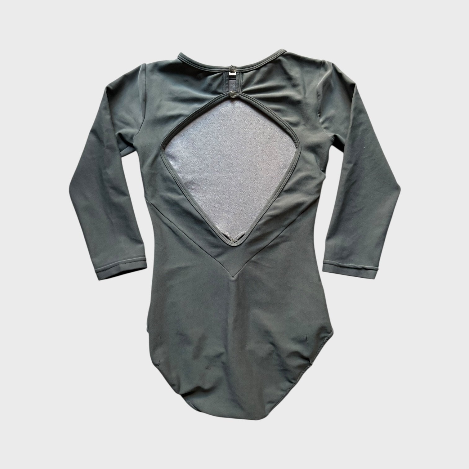 Grey leotard with 3/4 sleeves and open back. Size S/M, fair condition – visible pilling at places, cuts in the fabric around the bottom area (see pictures).