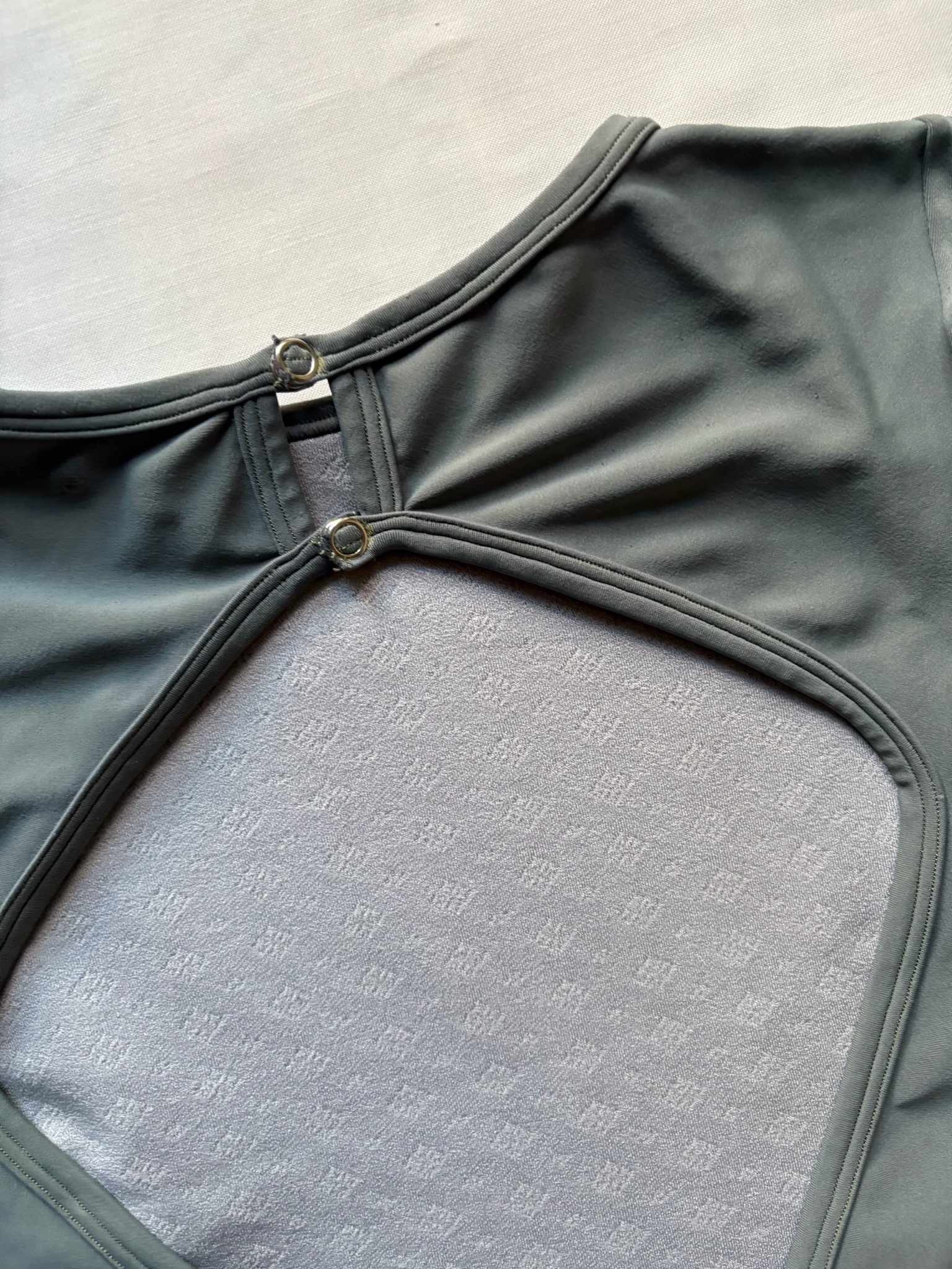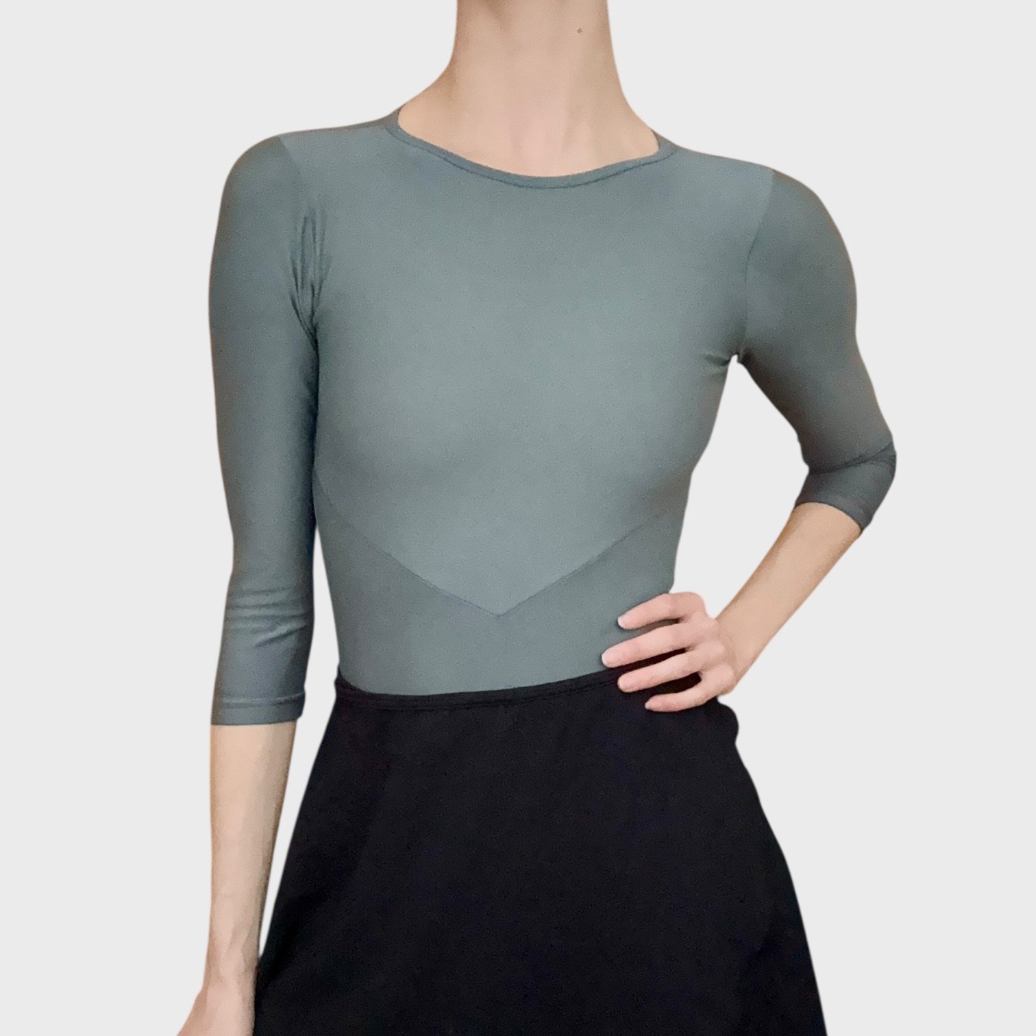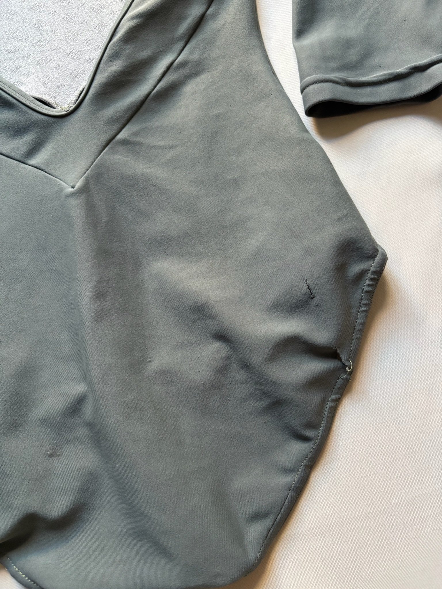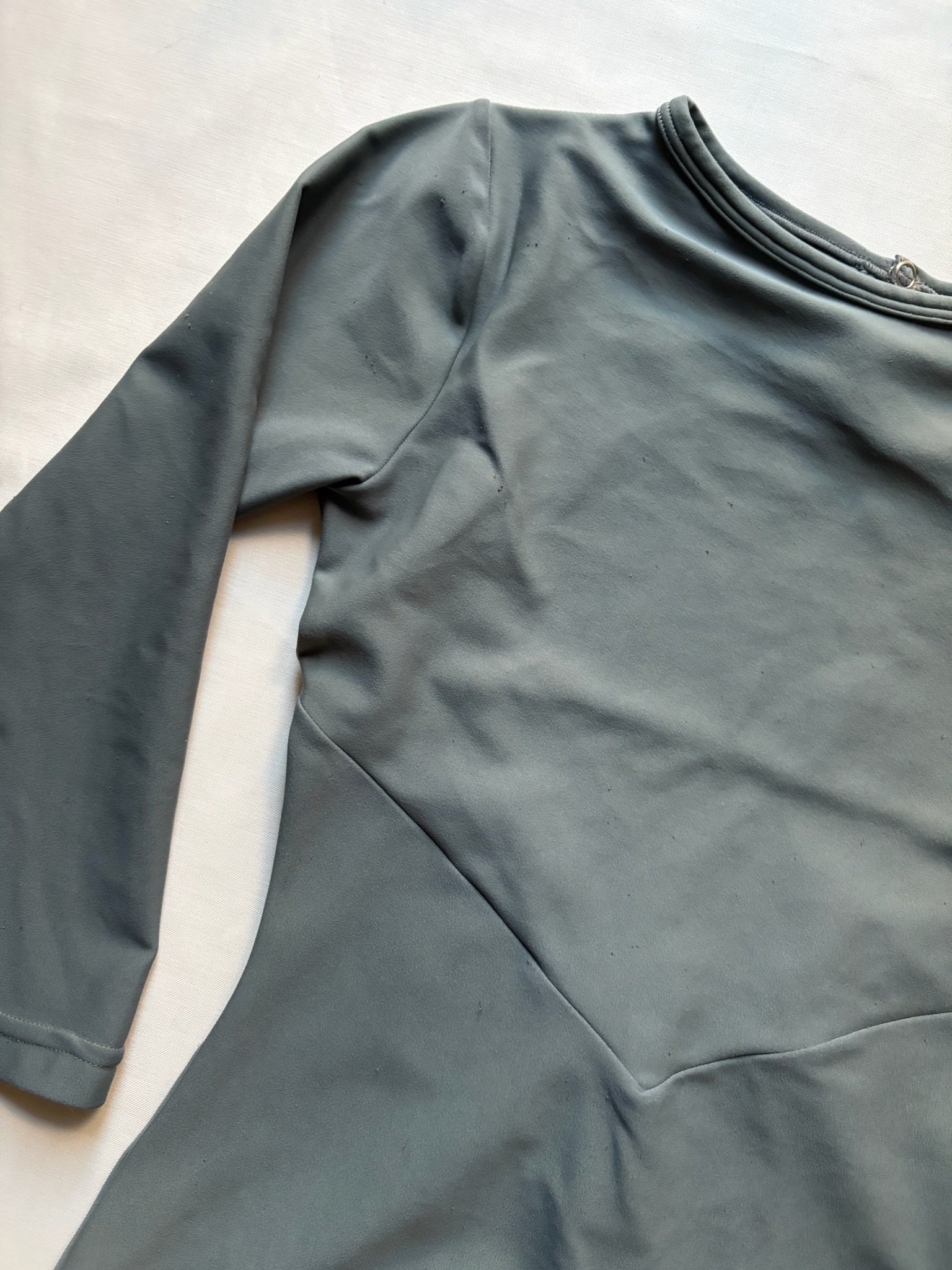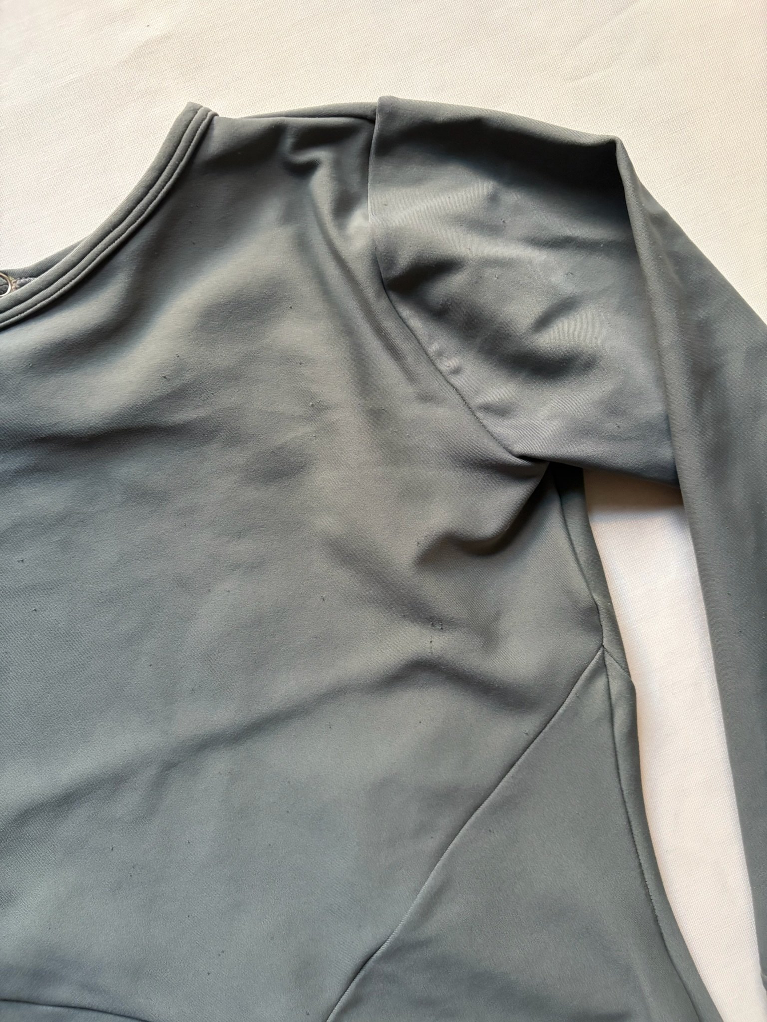 Grey leotard with 3/4 sleeves and open back. Size S/M, fair condition – visible pilling at places, cuts in the fabric around the bottom area (see pictures).
