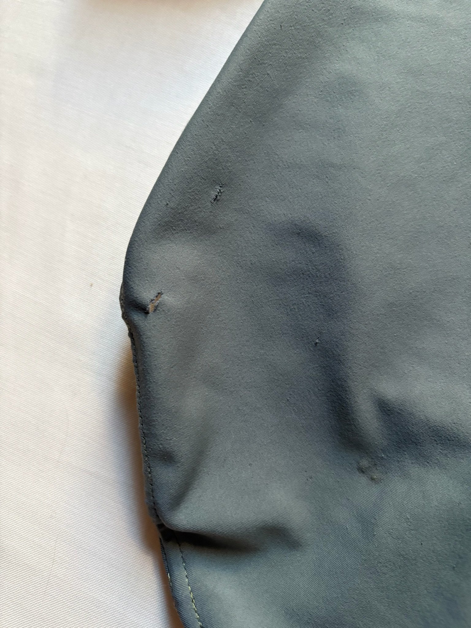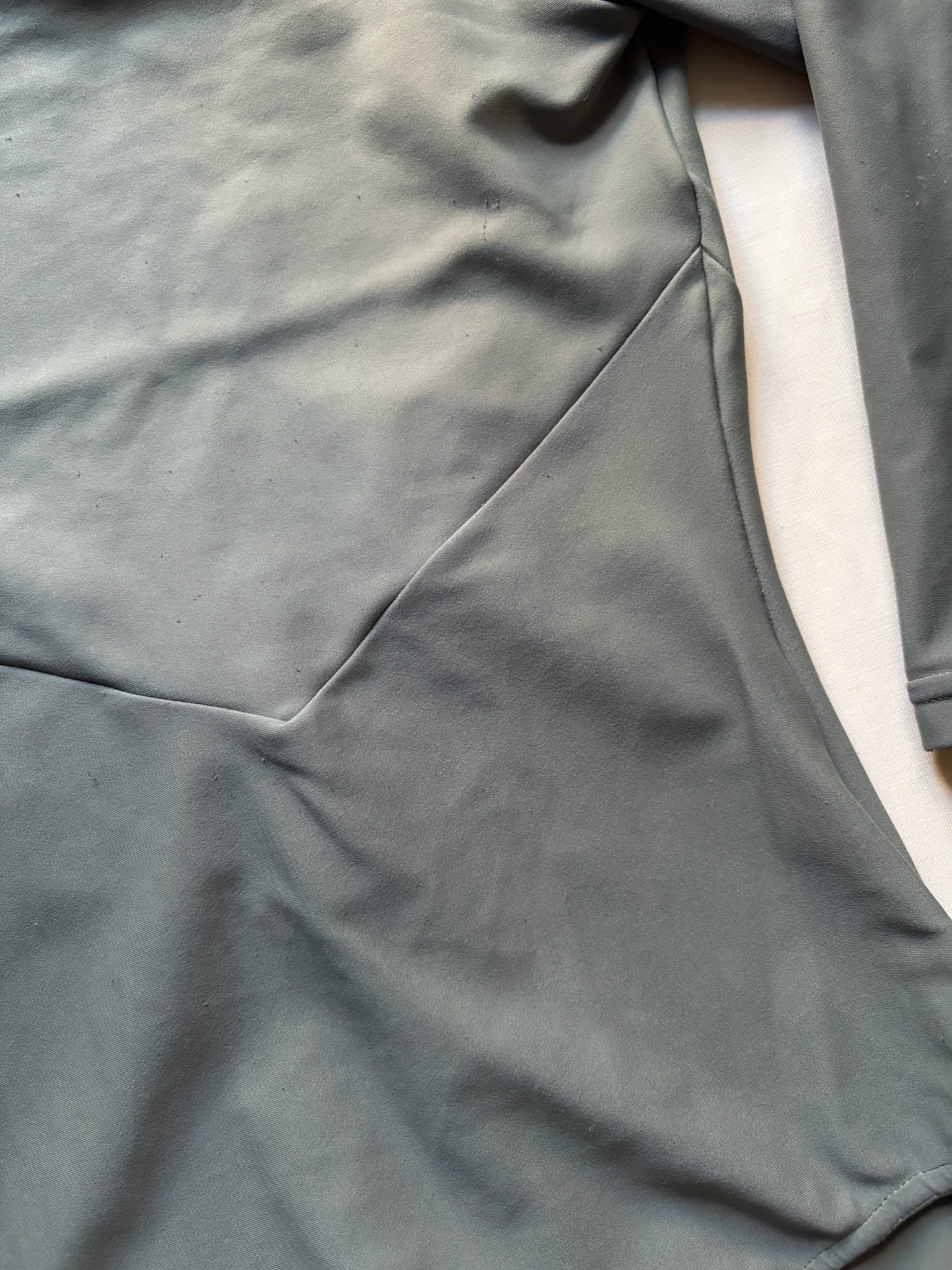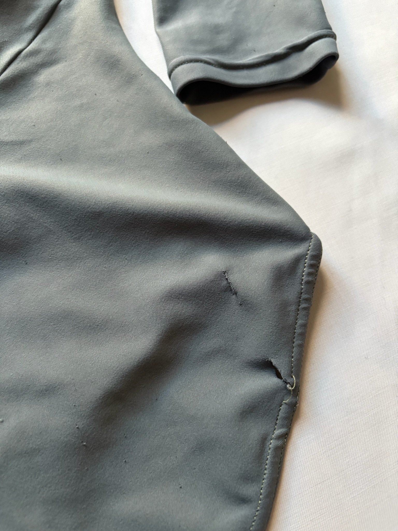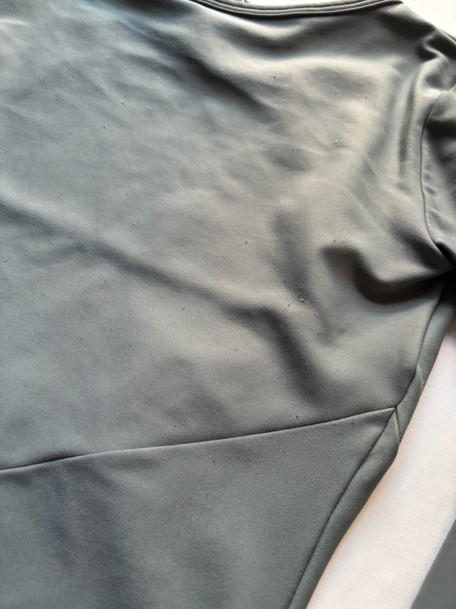 Grey leotard with 3/4 sleeves and open back. Size S/M, fair condition – visible pilling at places, cuts in the fabric around the bottom area (see pictures).