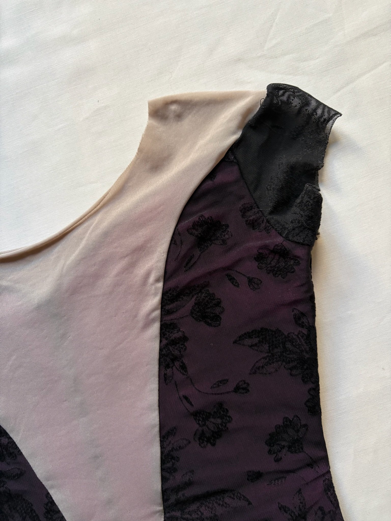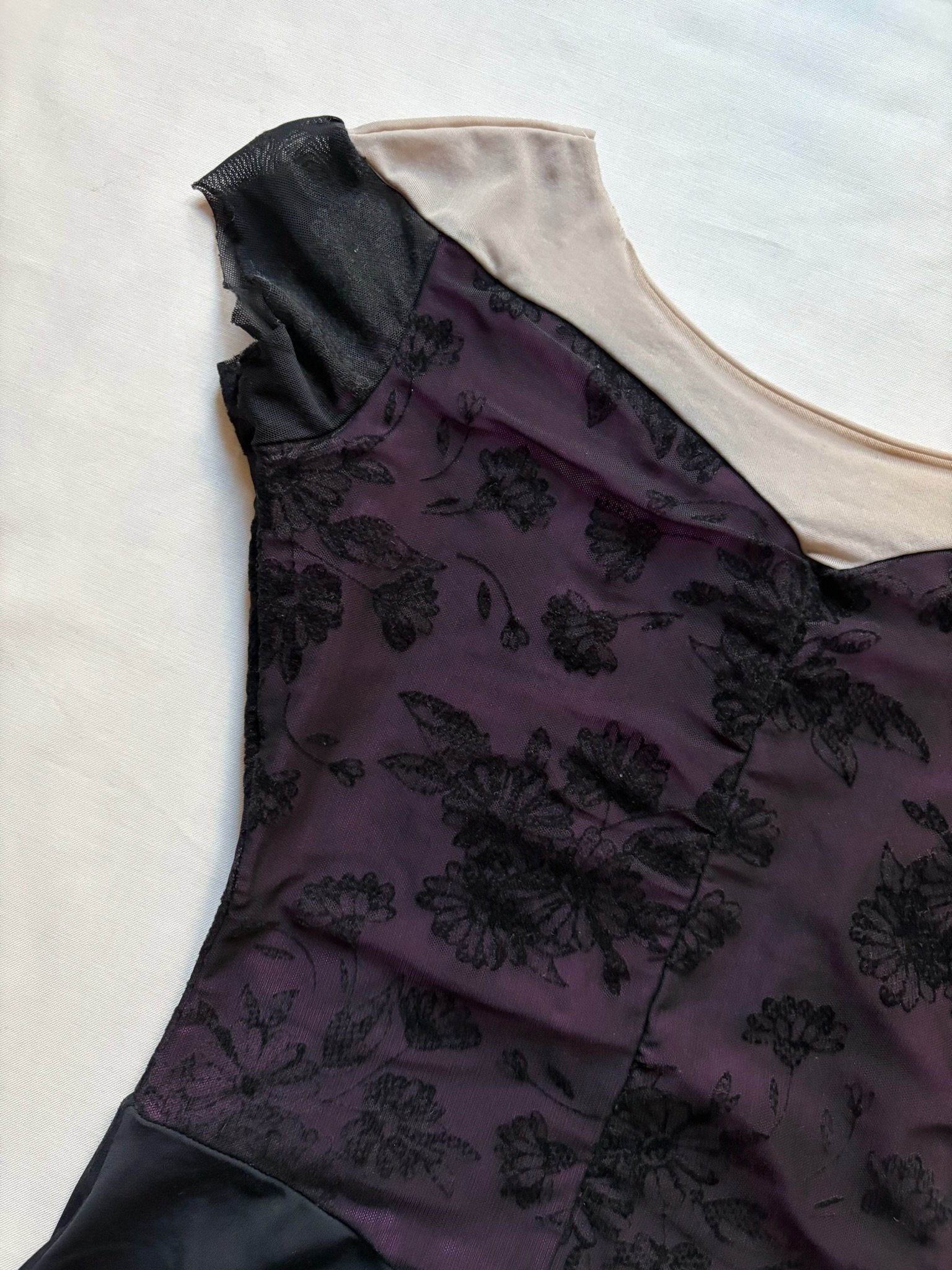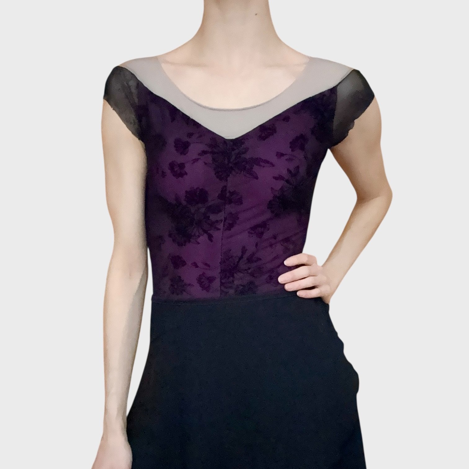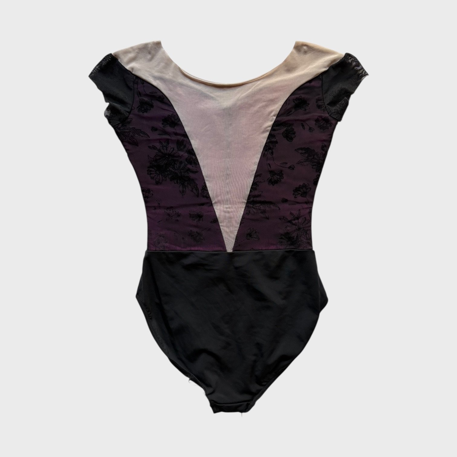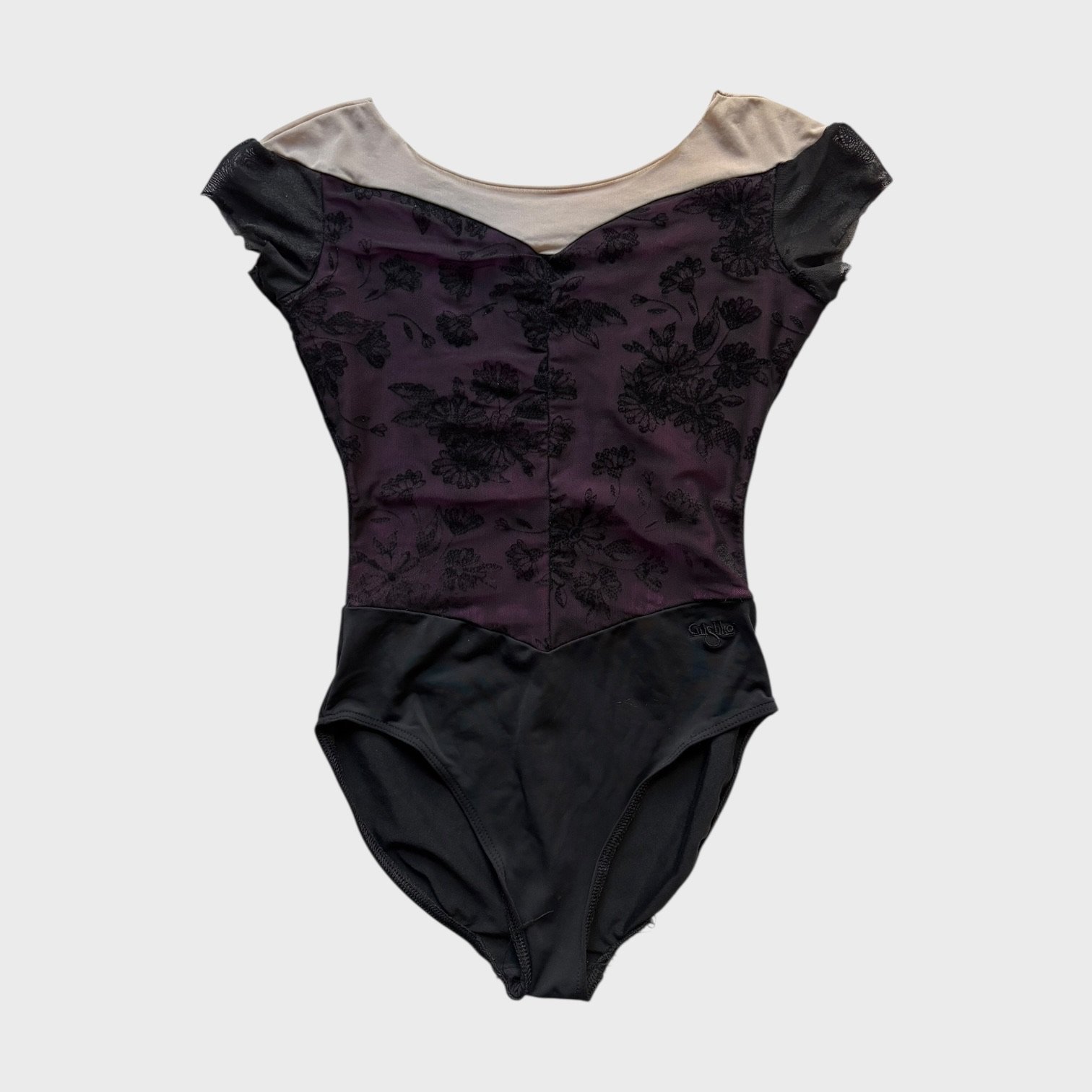 Grishko leotard with cap sleeves in pink, covered with black mesh. Size M, fair condition – the elastics by the legs are worn down (see pictures).