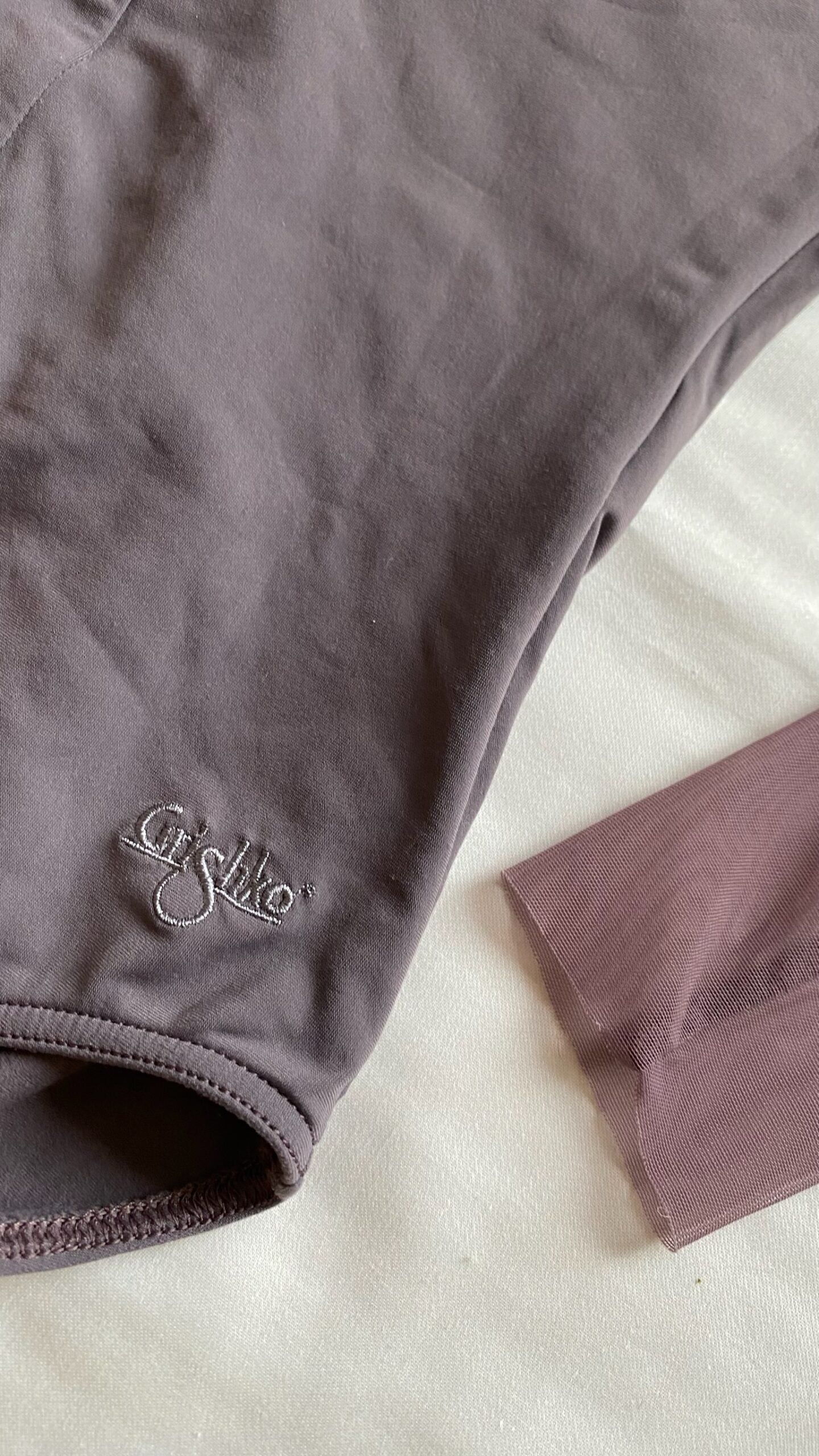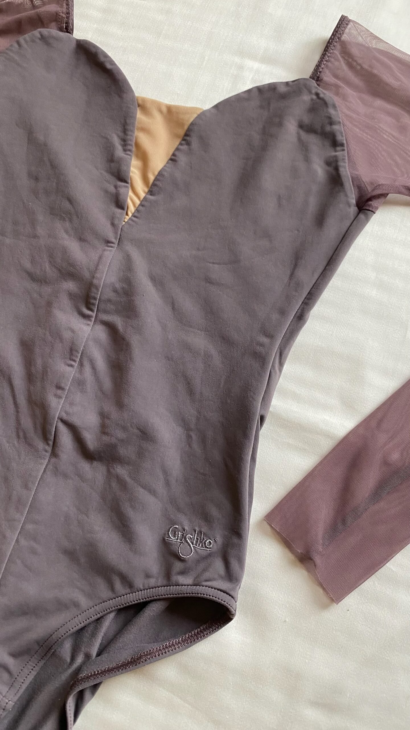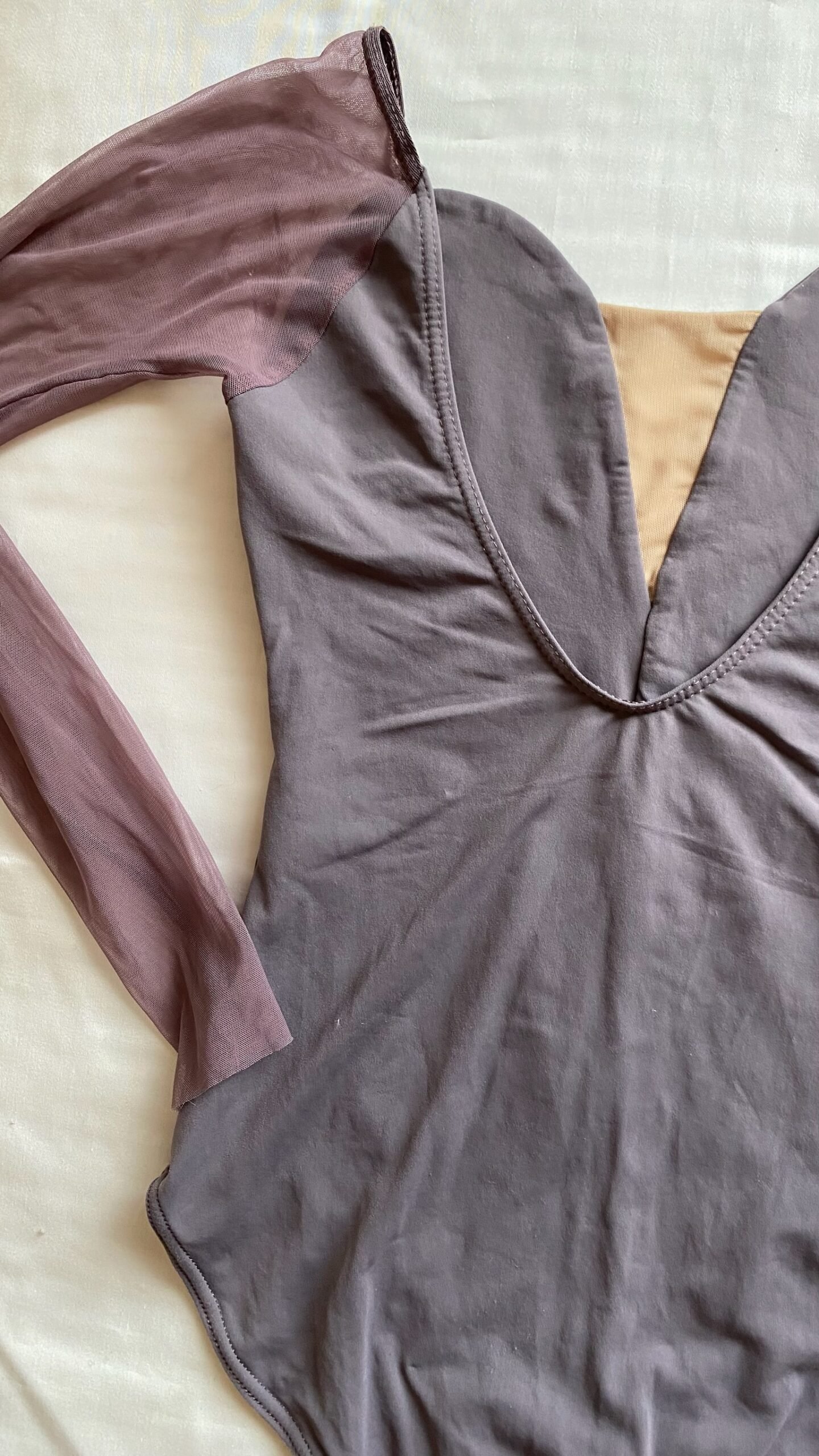 Grishko leotard in gray with long mesh sleeves and nude mesh insert. Size S, great condition.