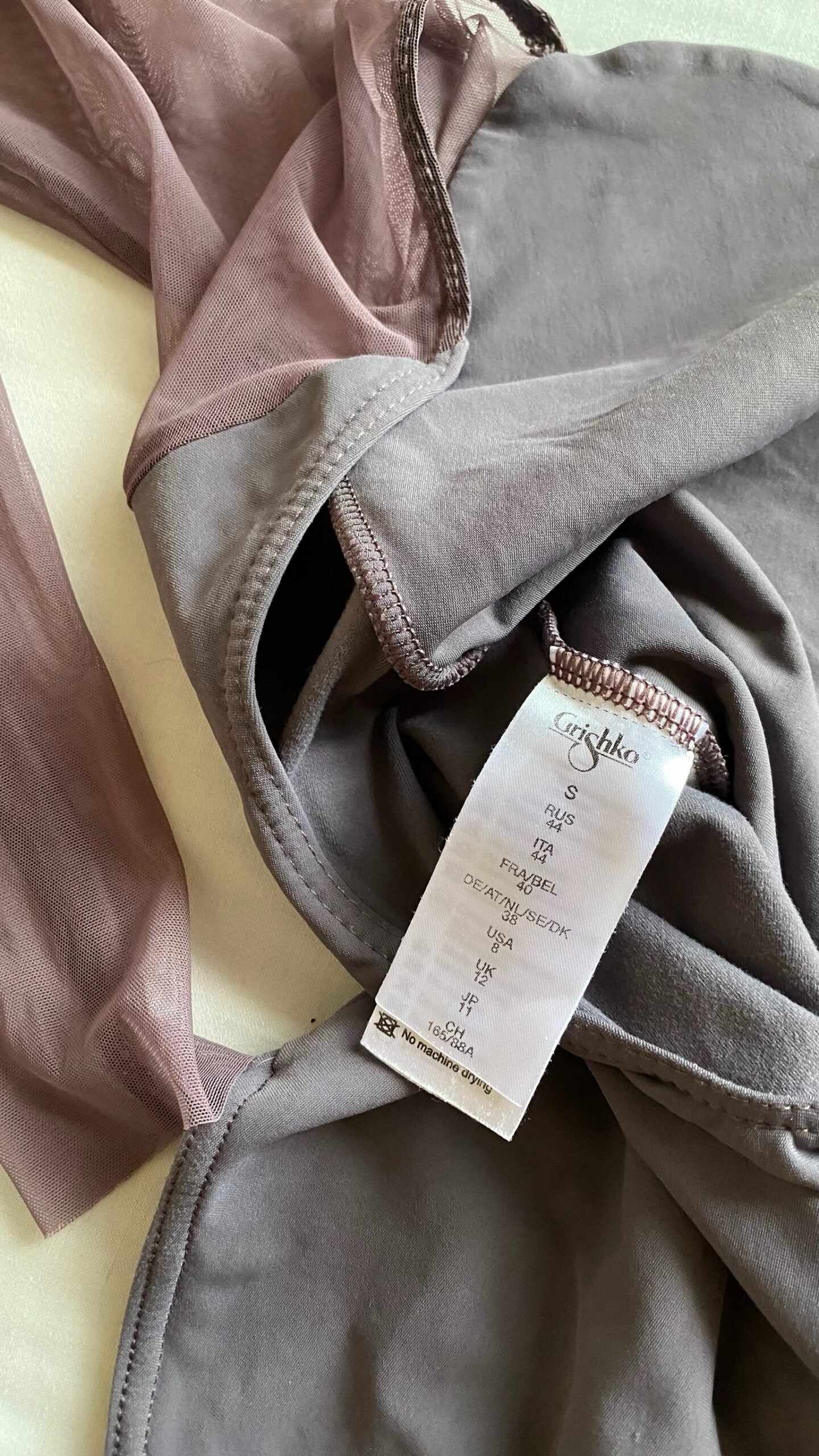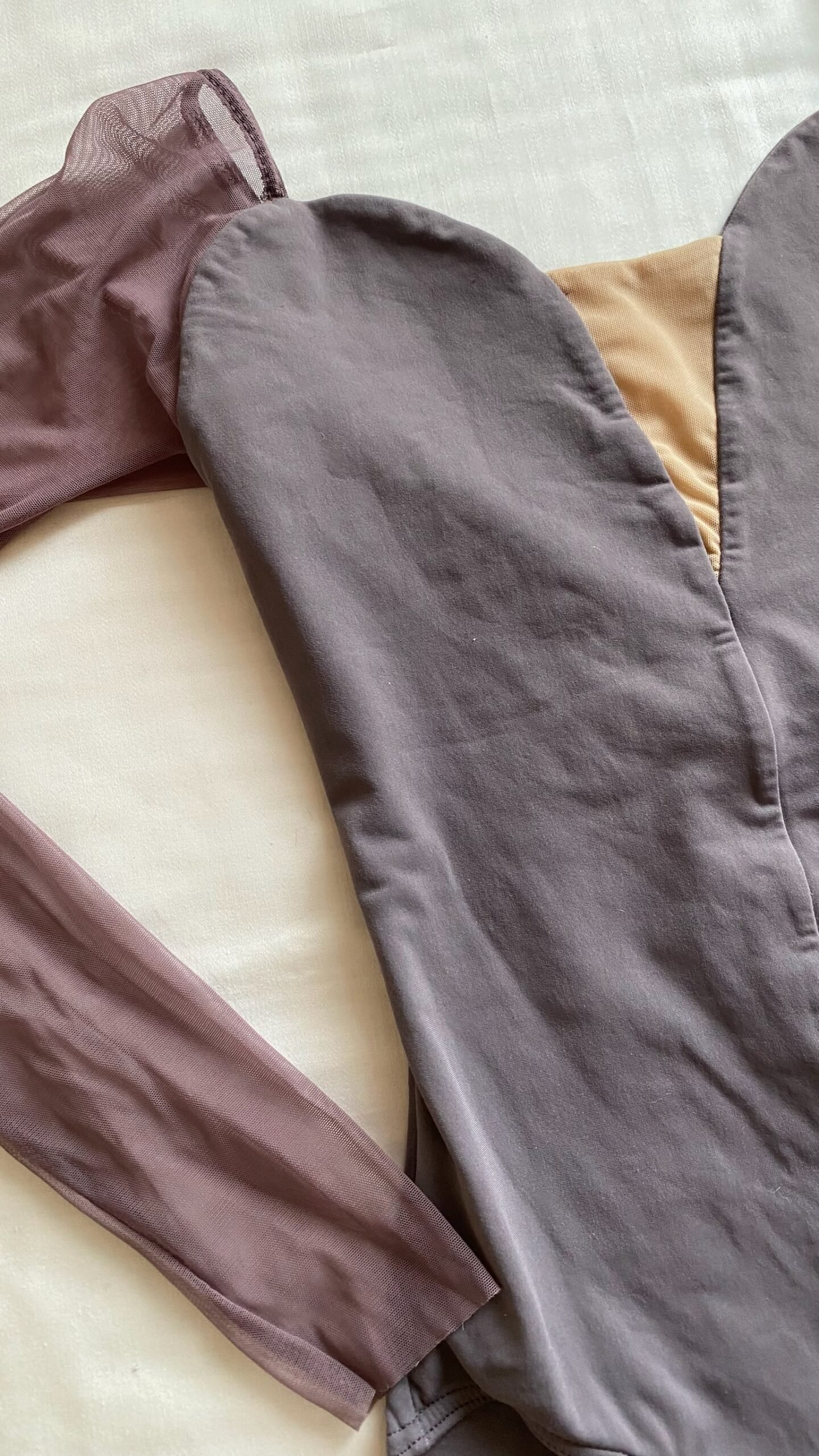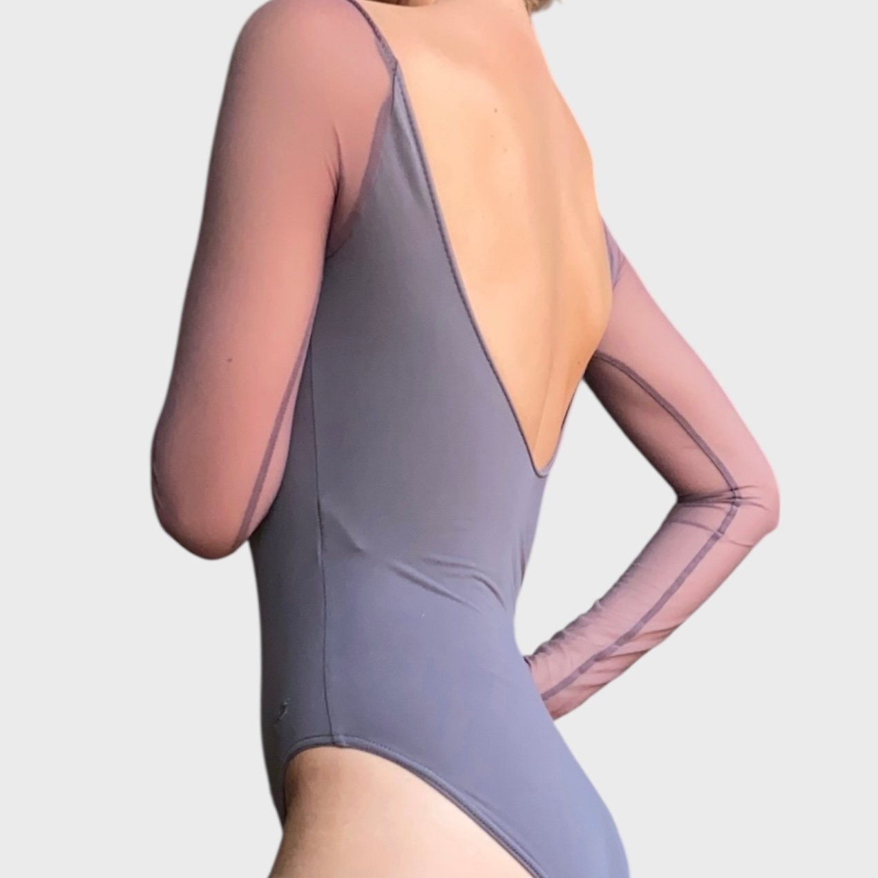 Grishko leotard in gray with long mesh sleeves and nude mesh insert. Size S, great condition.