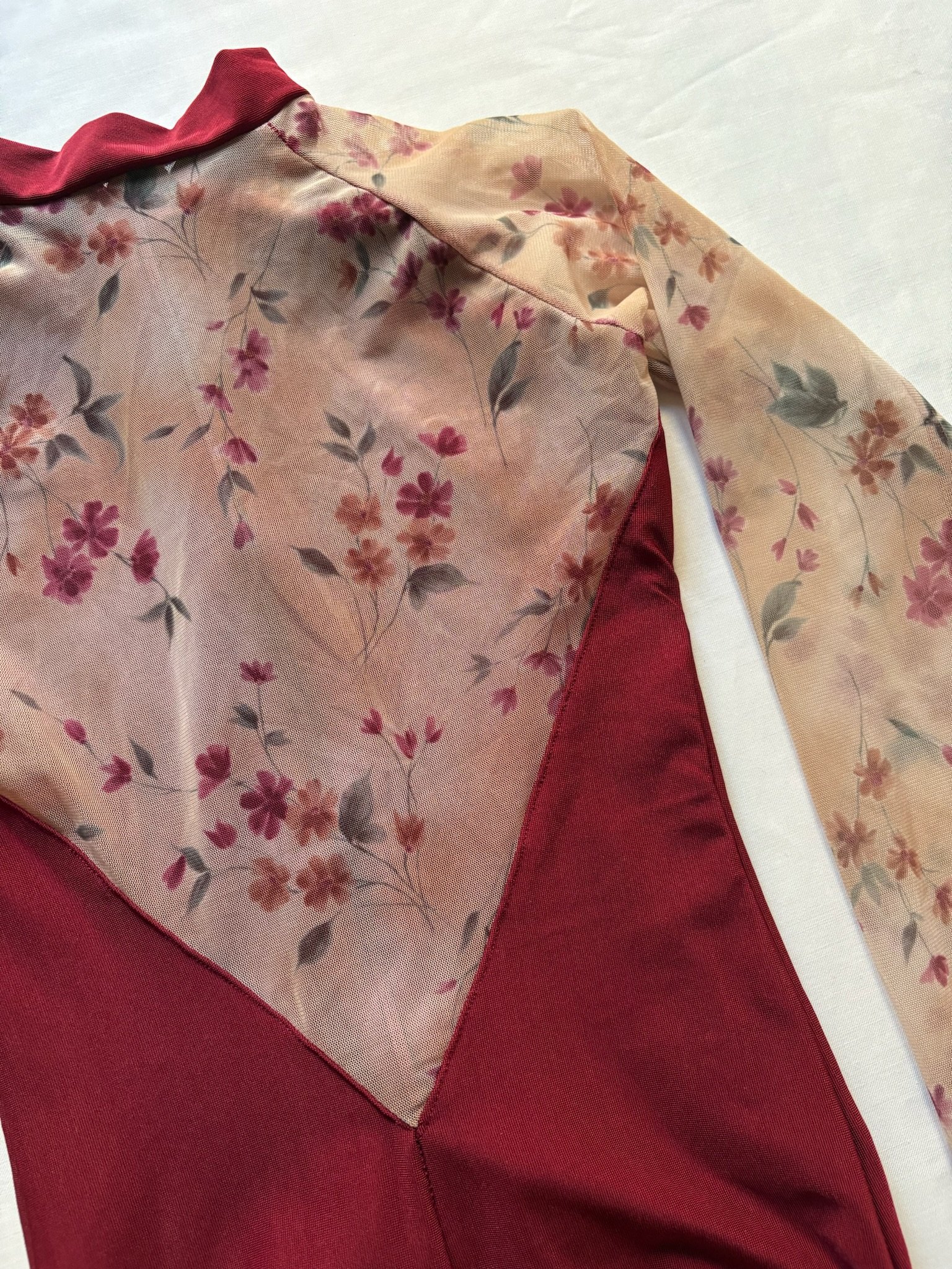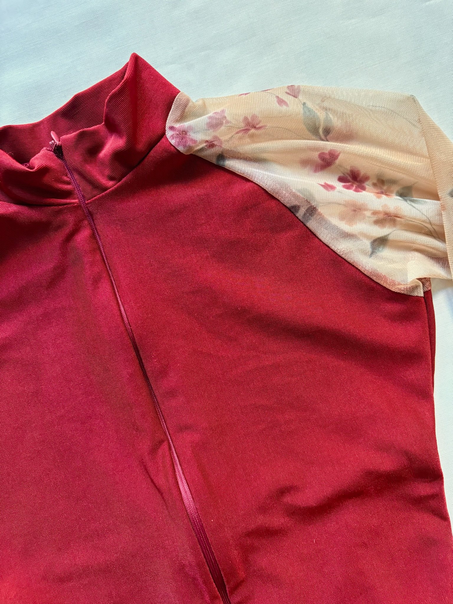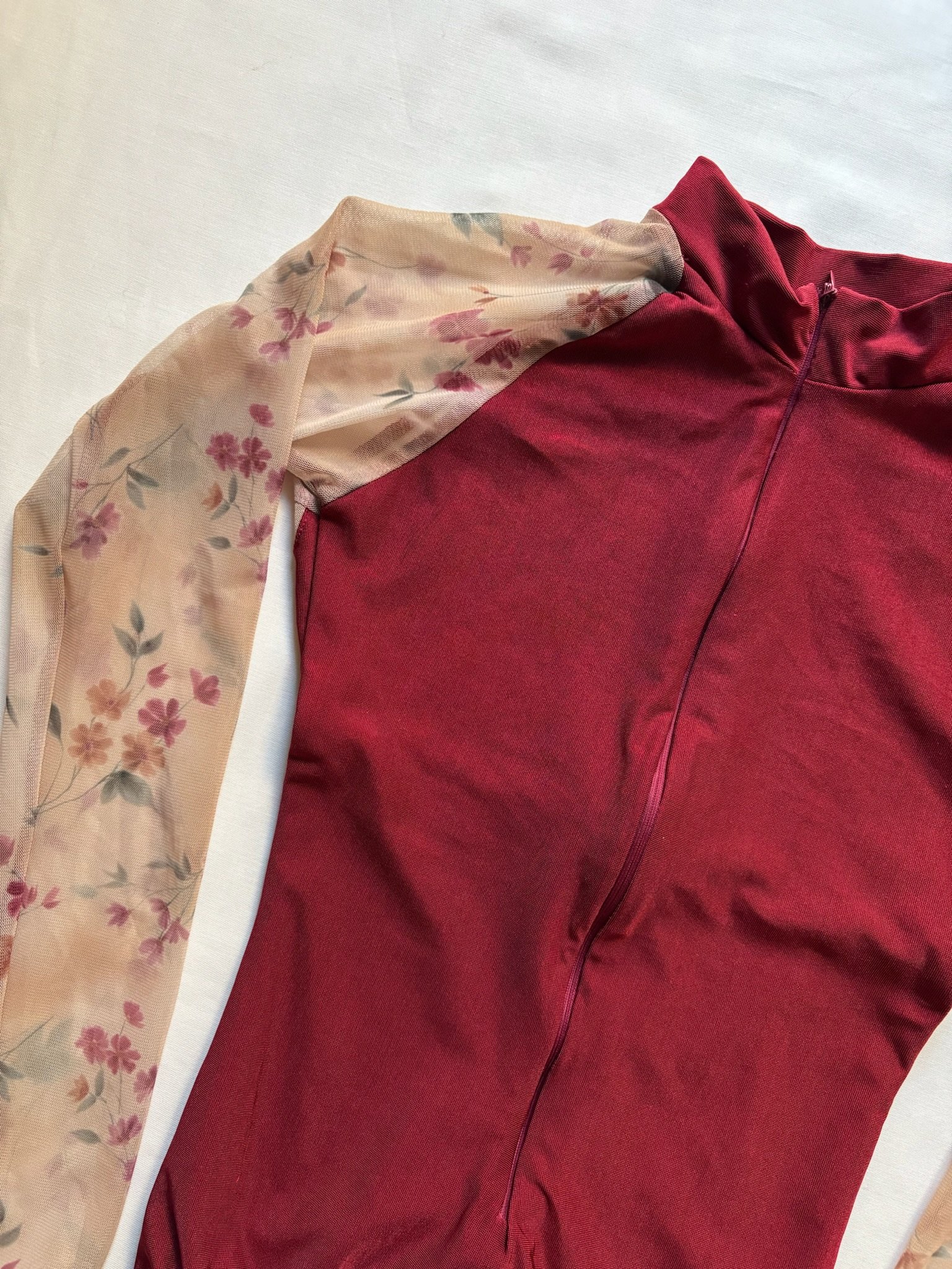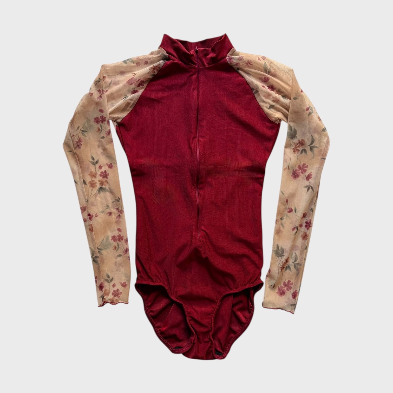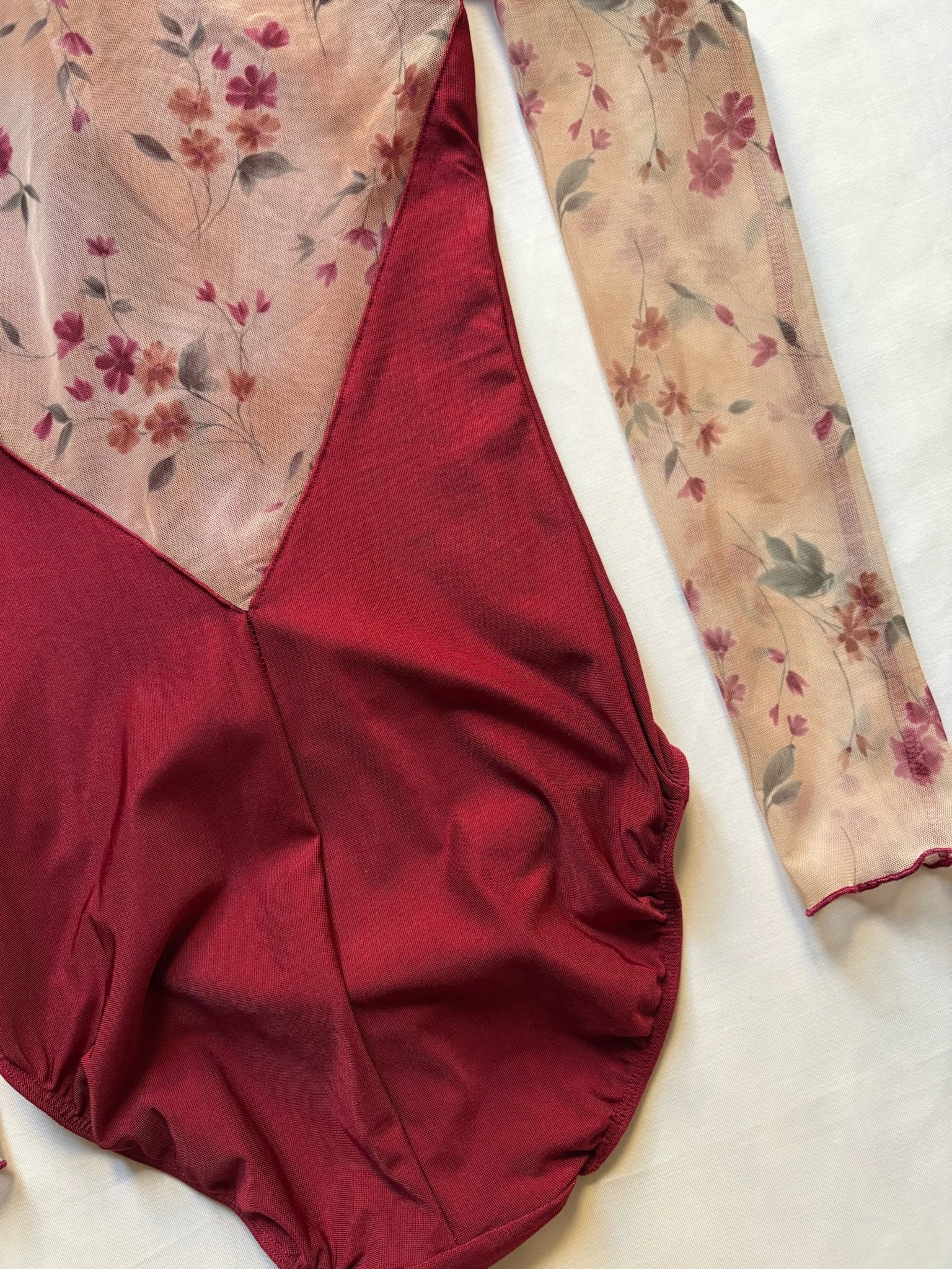 Julii Garden leotard in red with floral mesh back and long sleeves. One size (fits S), great condition.