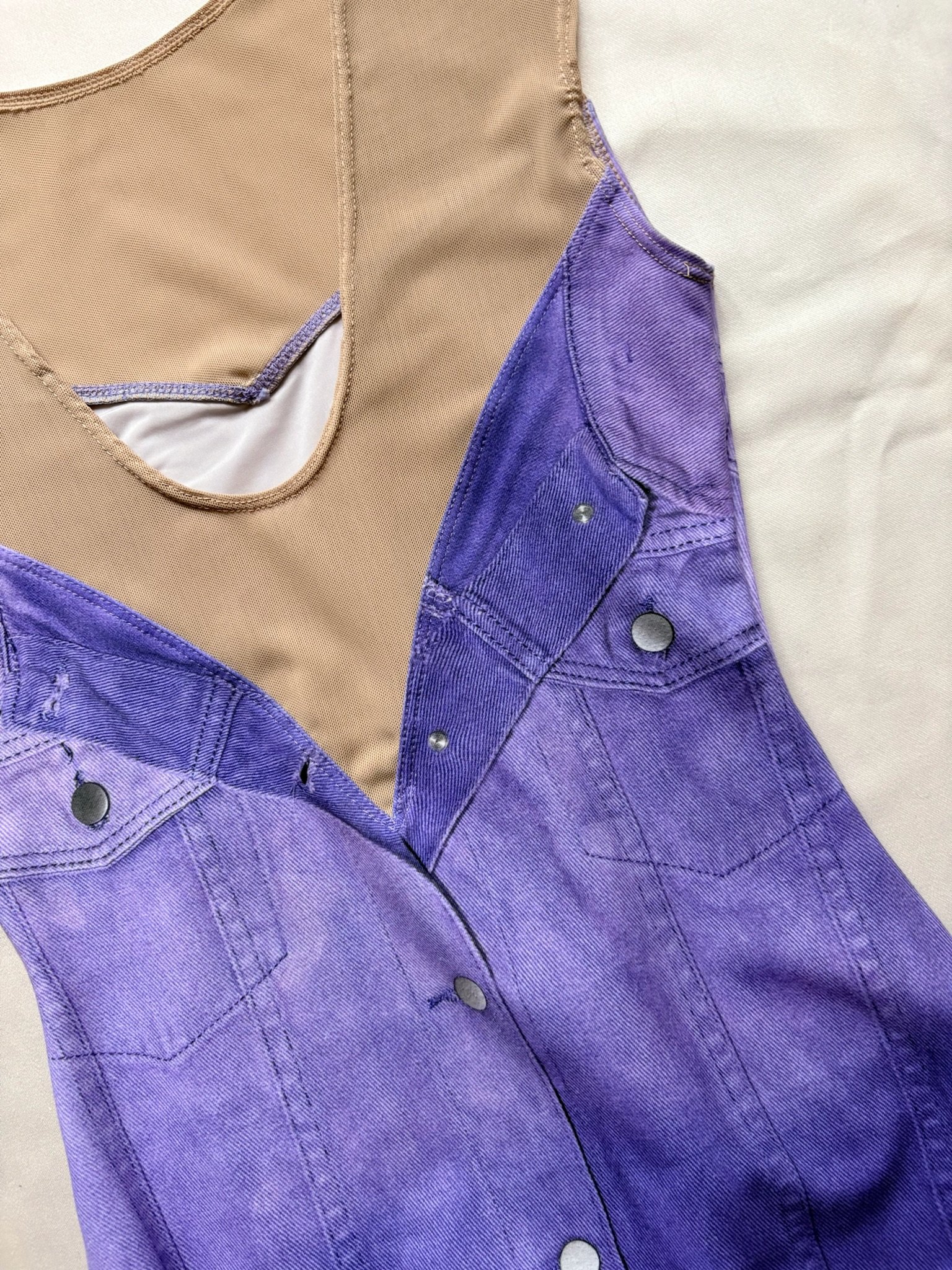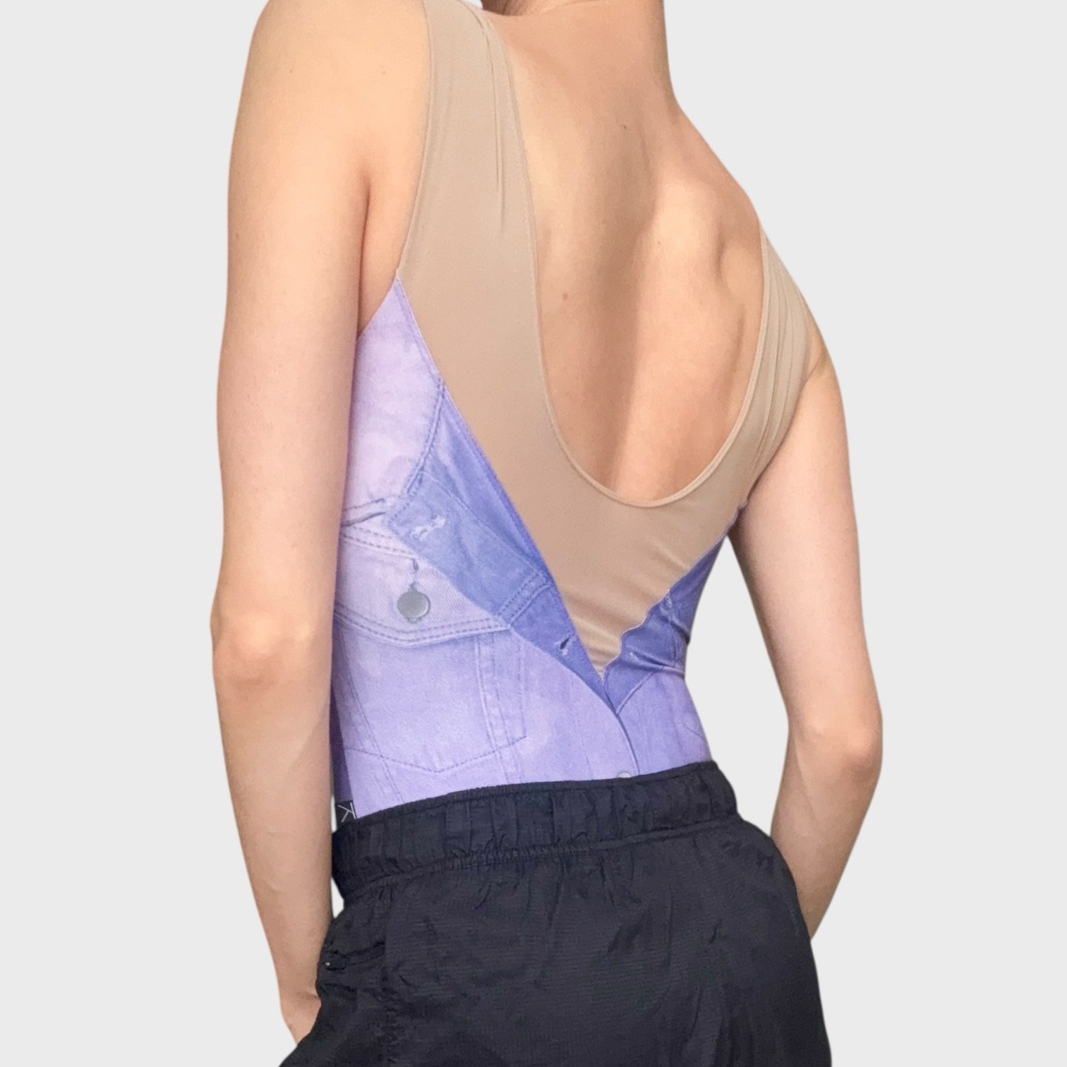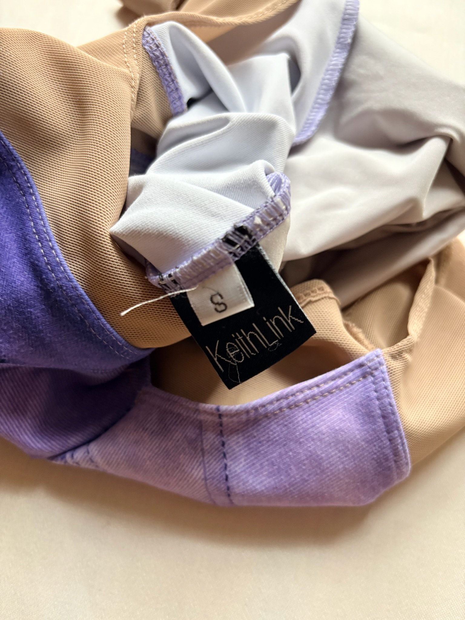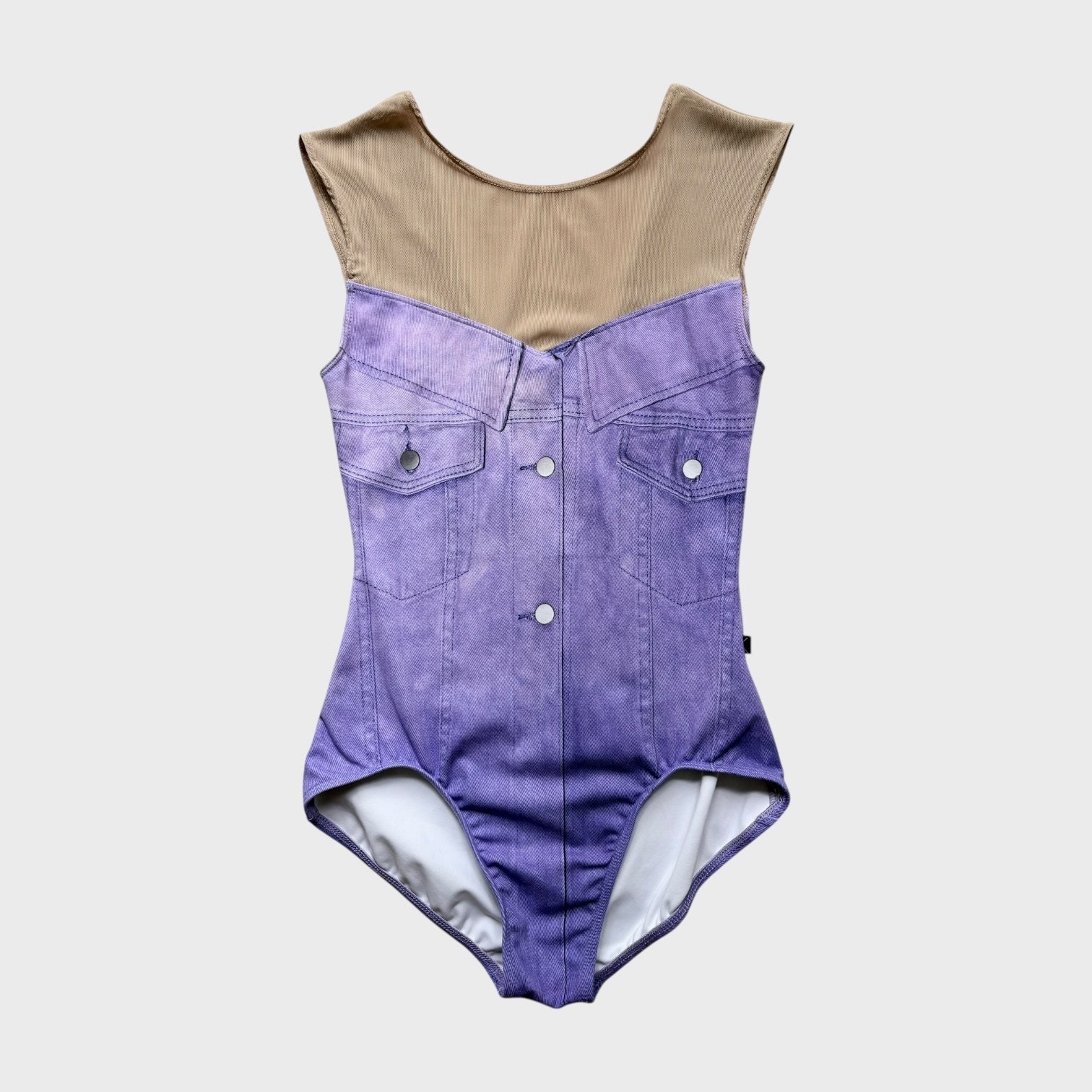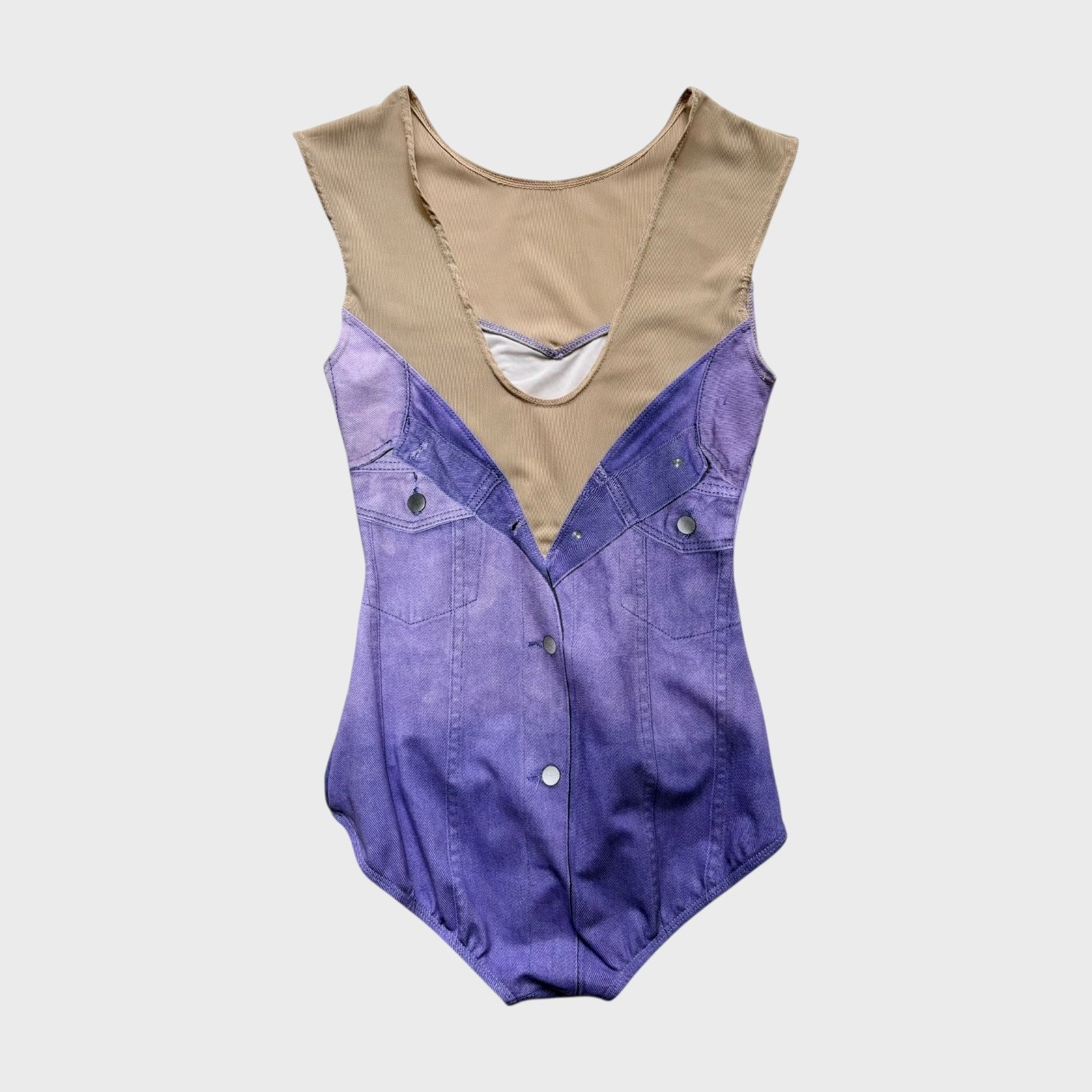 KeithLink leotard in purple denim print with nude mesh. Size S, great condition.