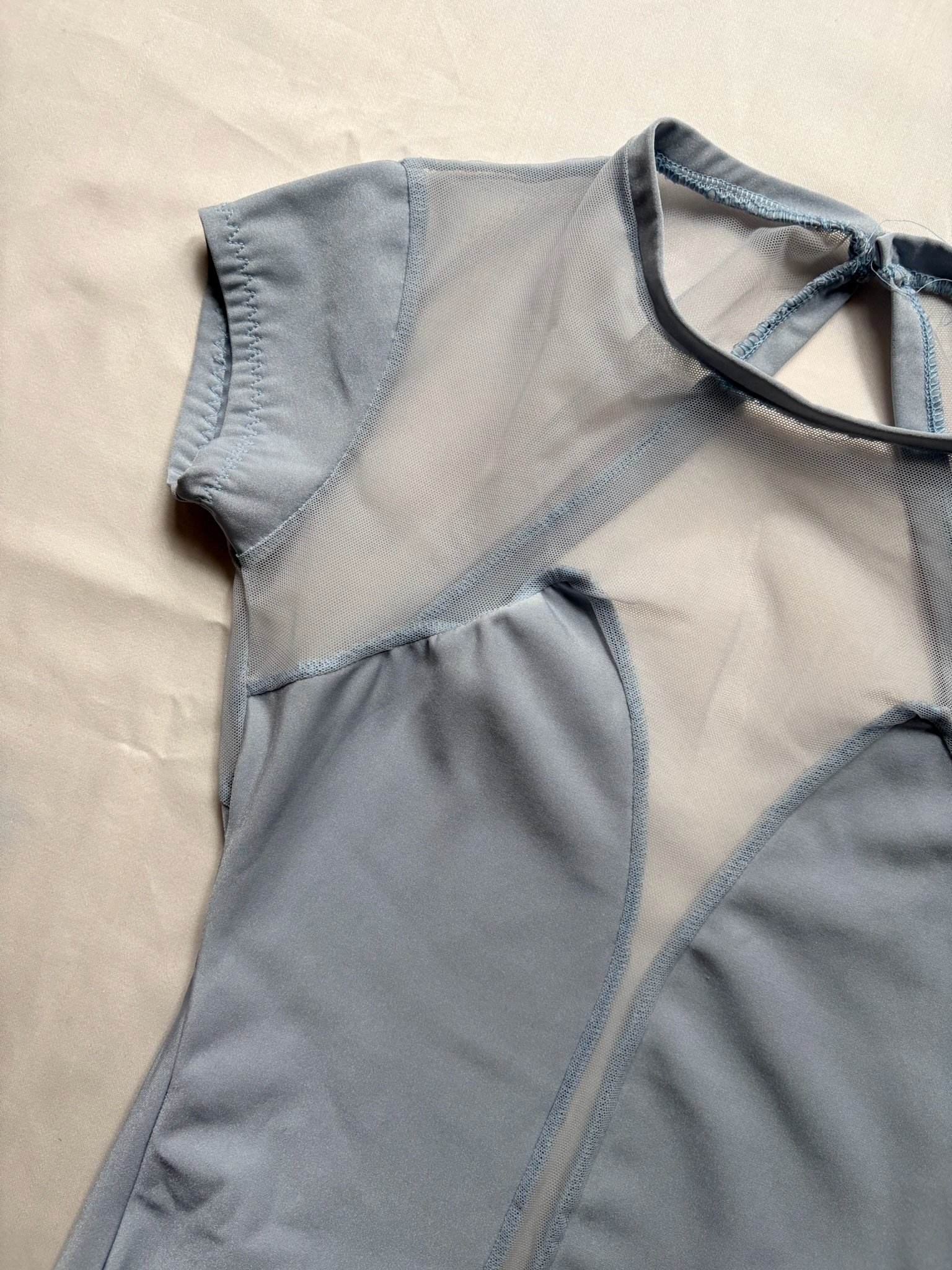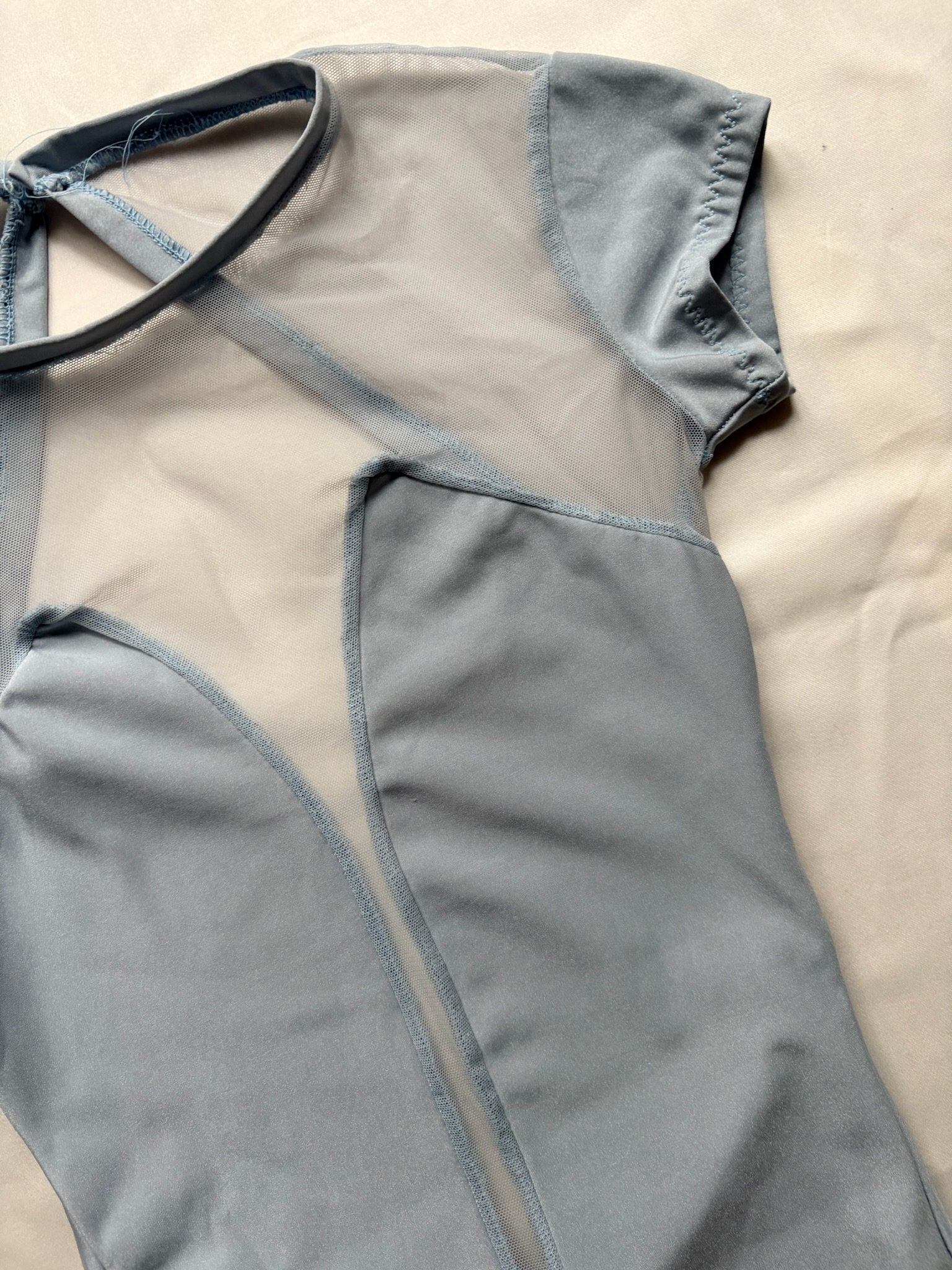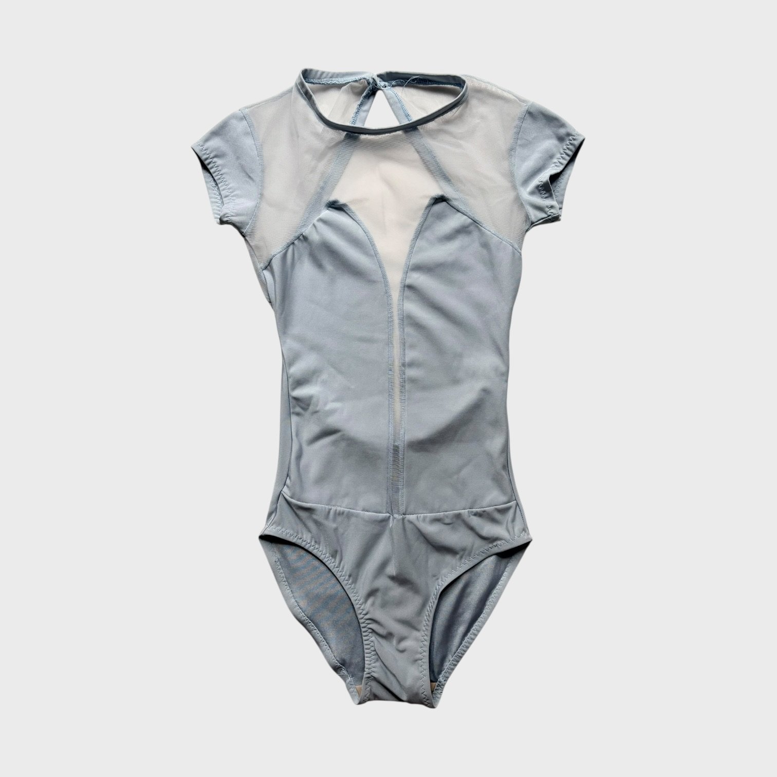 Light blue leotard with mesh inserts, cap sleeves and an open back. Size M/L, great condition.