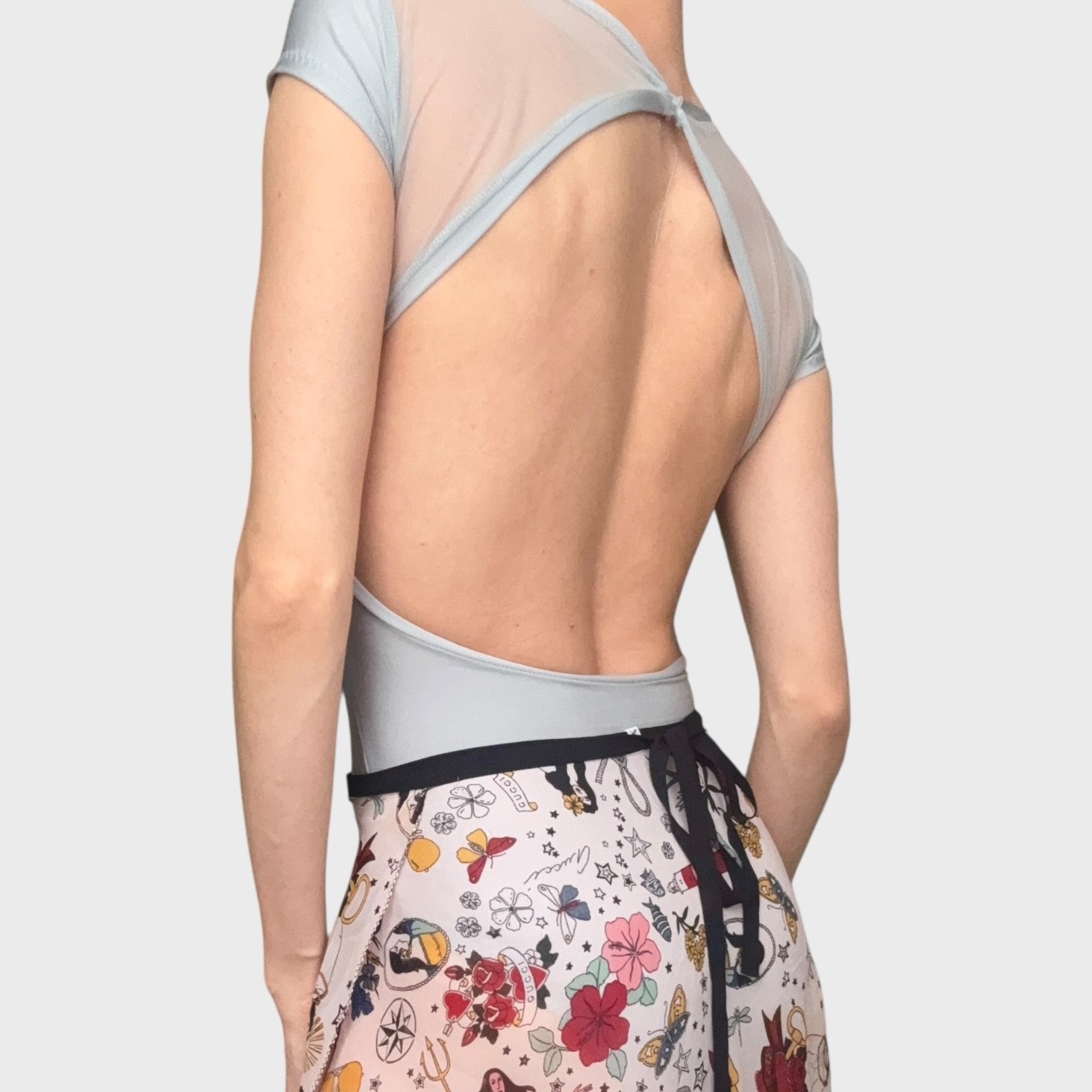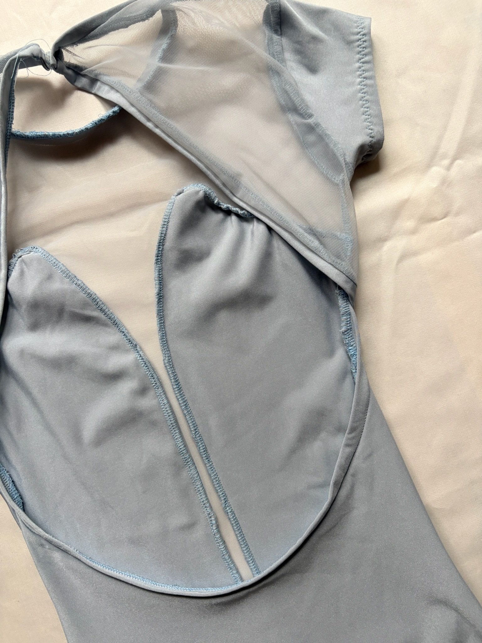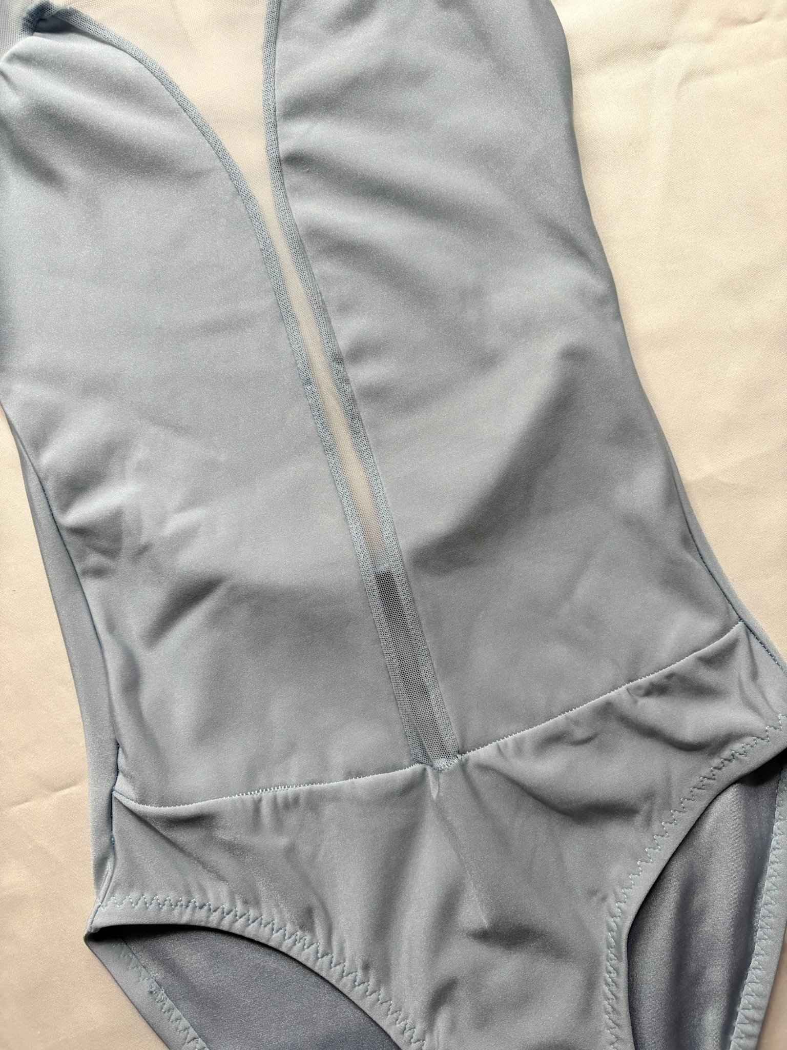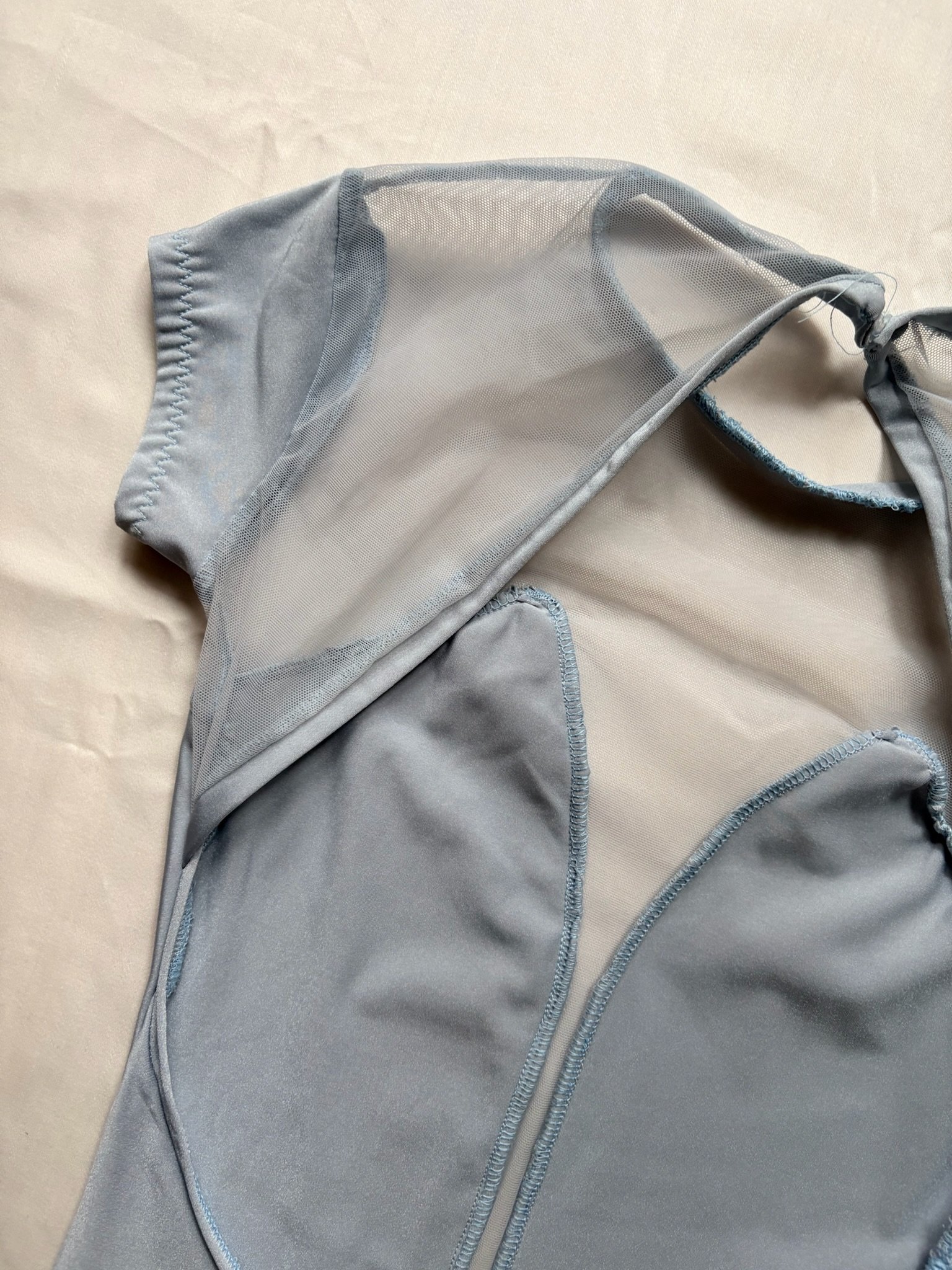 Light blue leotard with mesh inserts, cap sleeves and an open back. Size M/L, great condition.