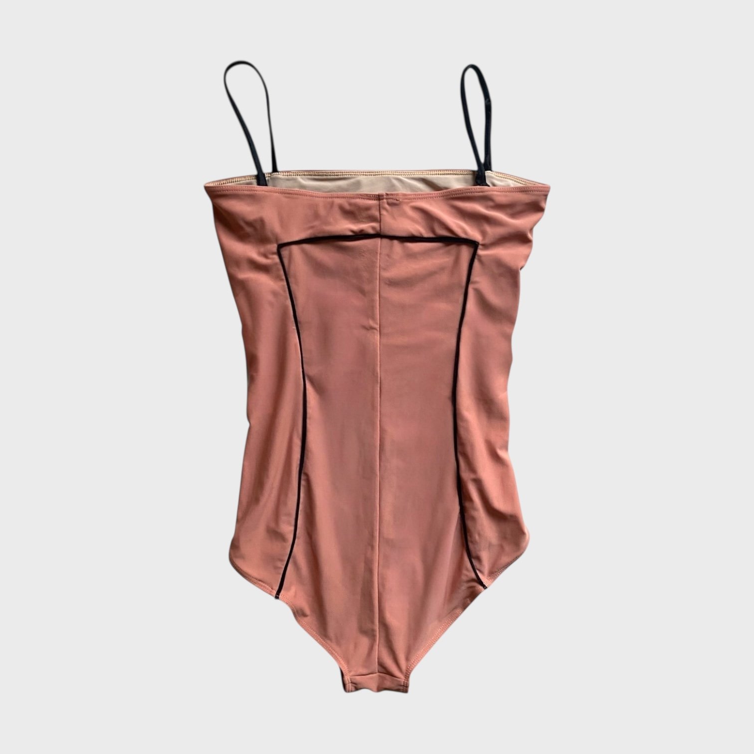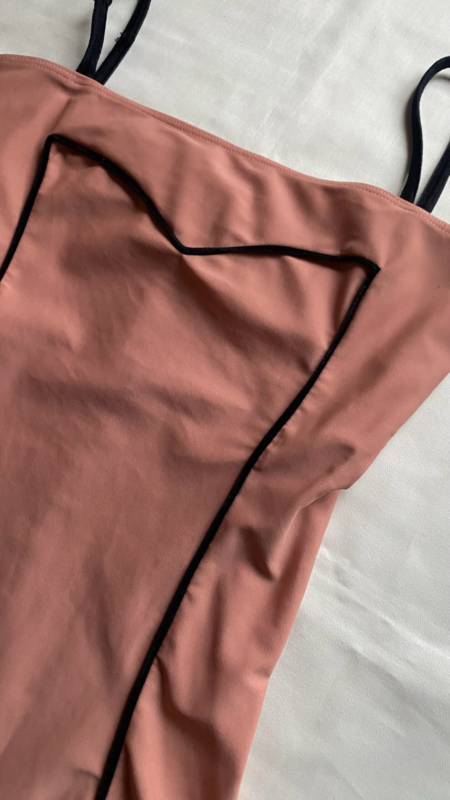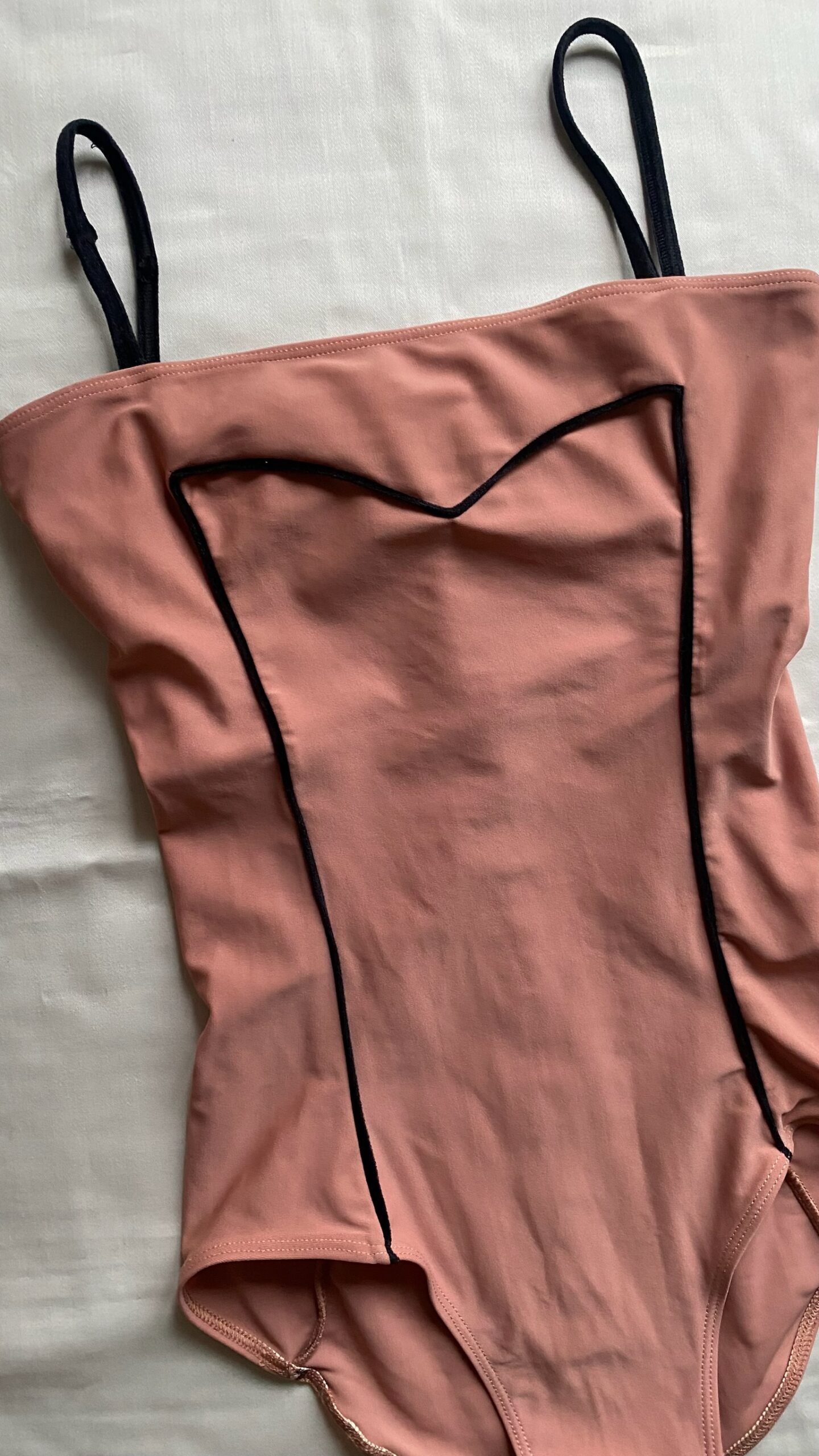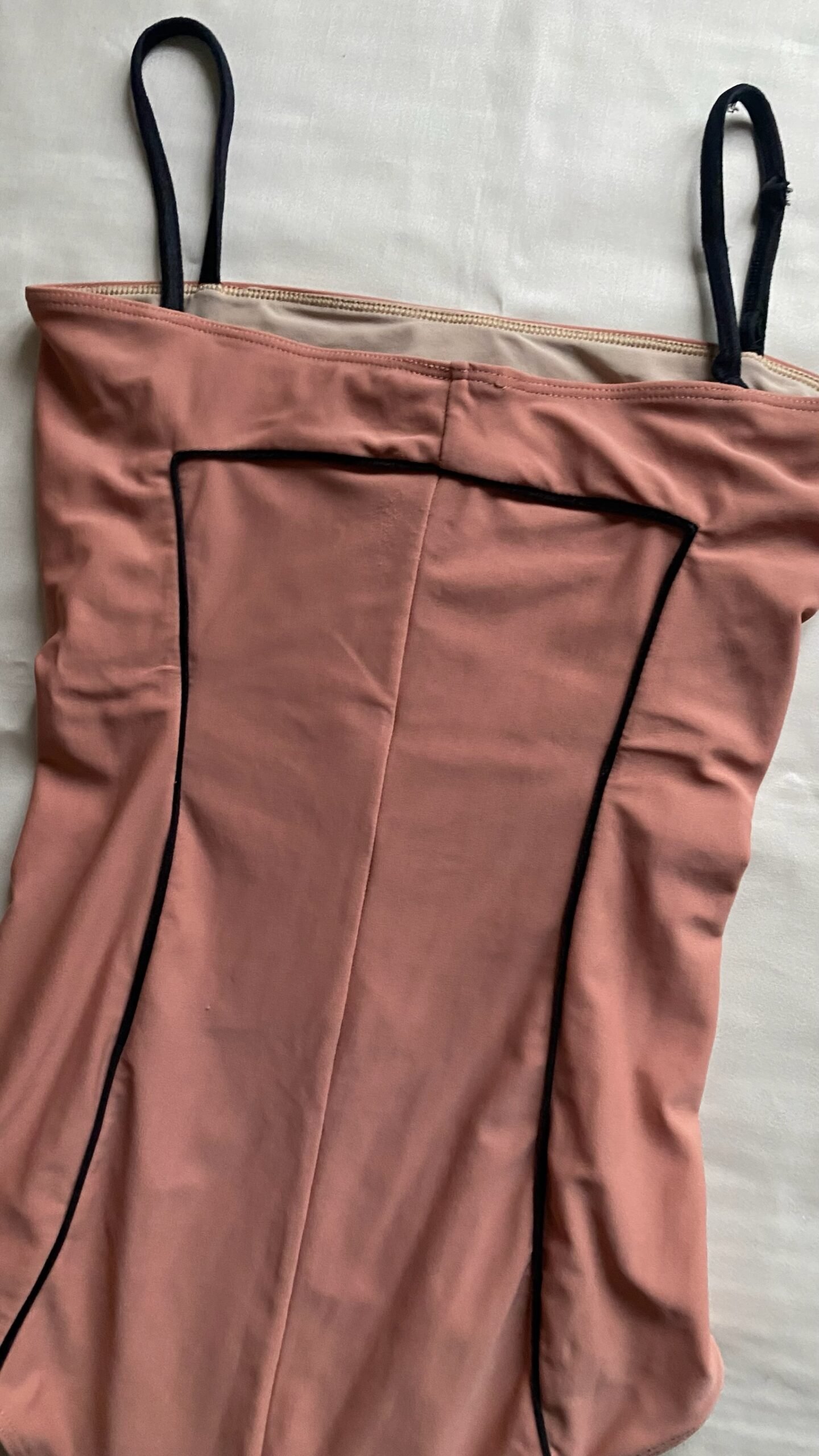 Pink camisole leotard with black details. Size S, fair condition – defect on one of the straps.