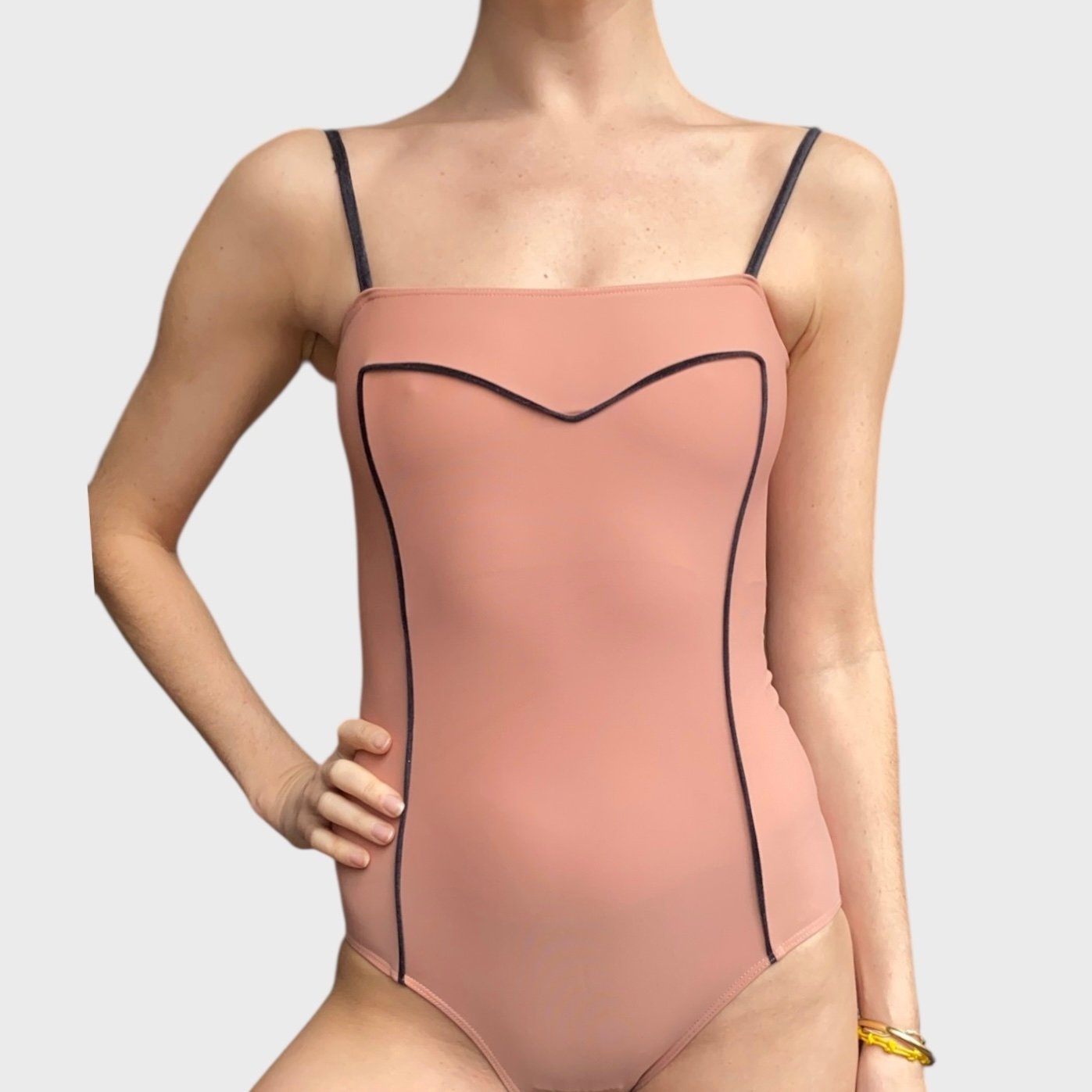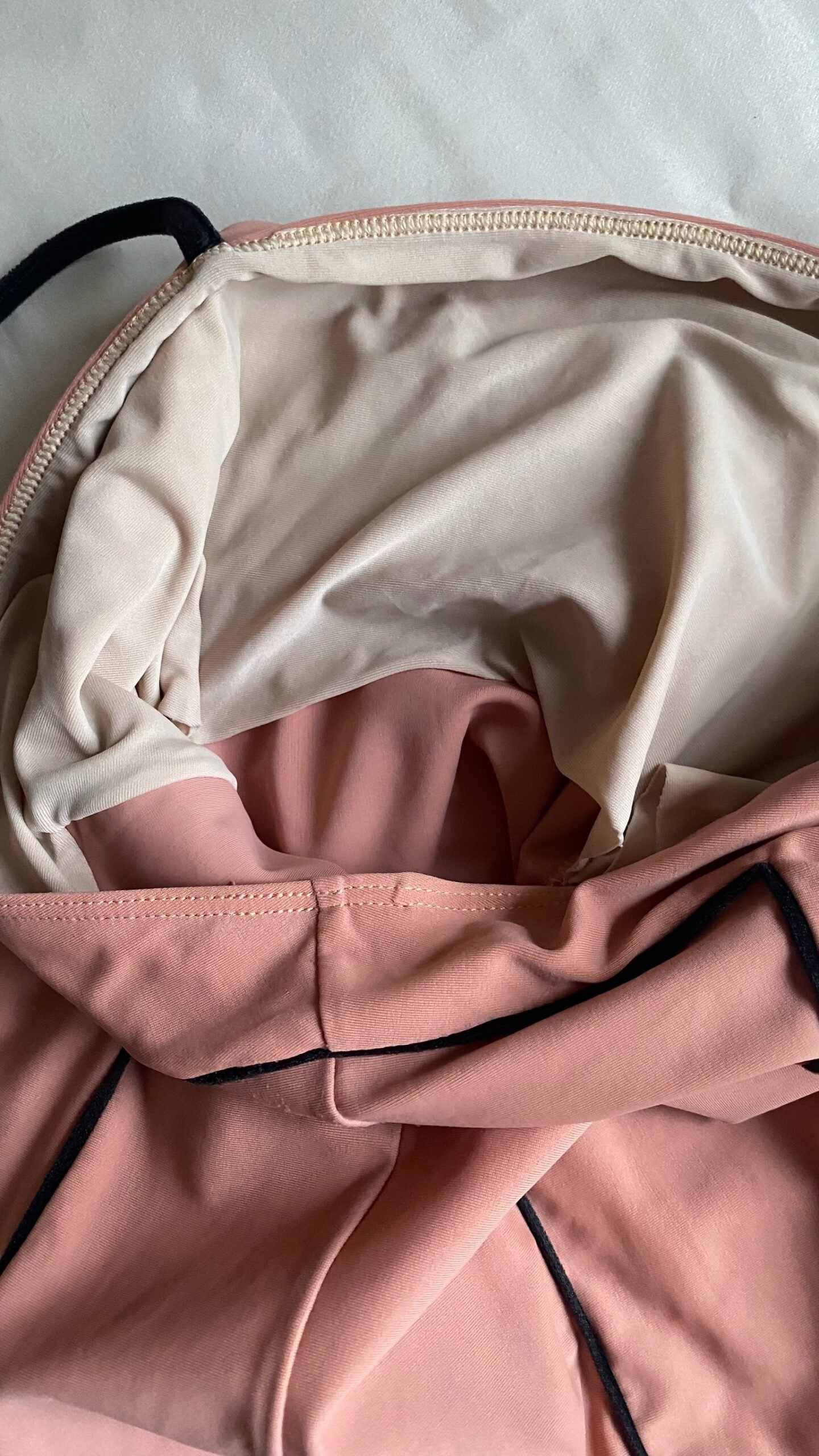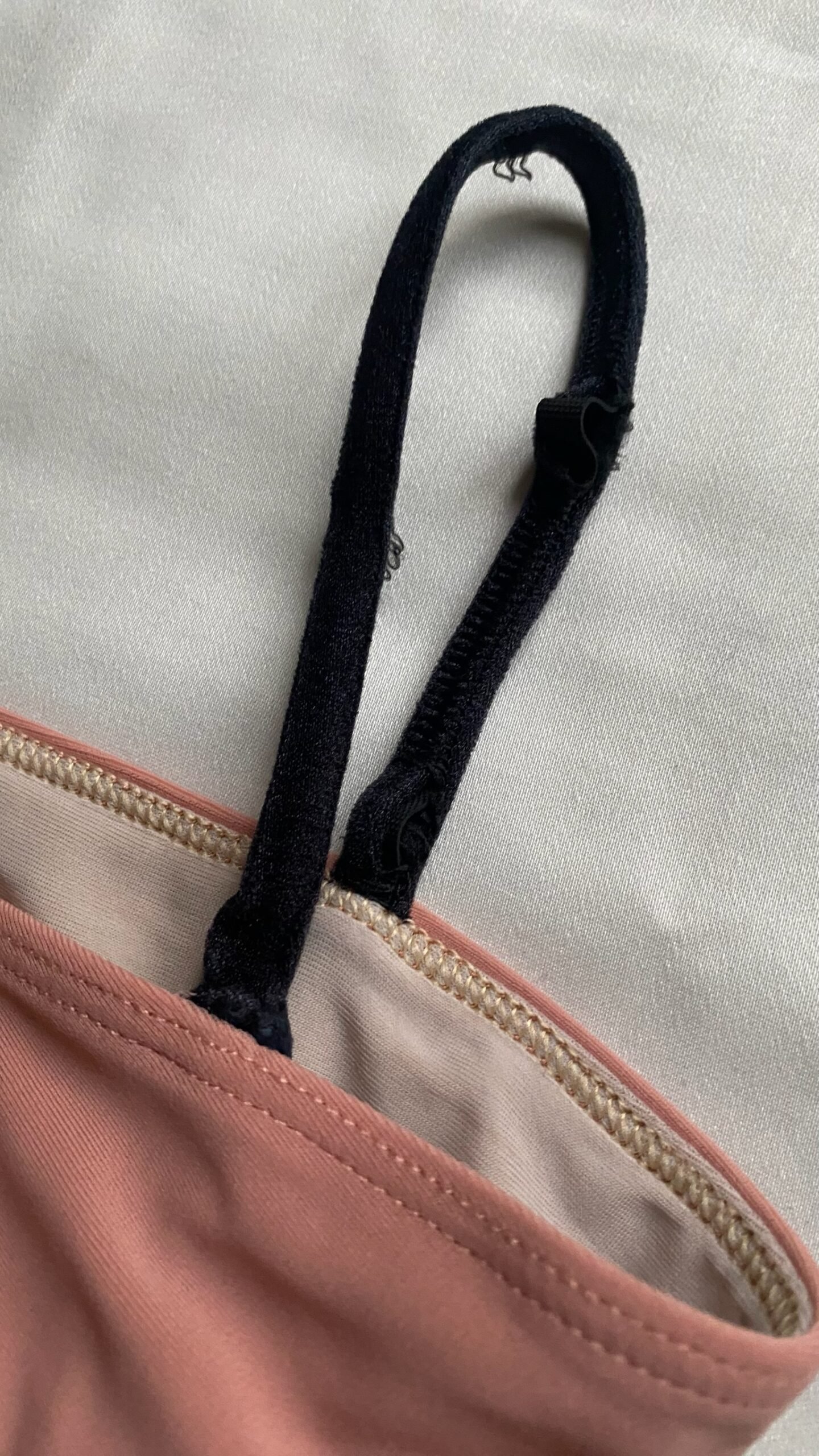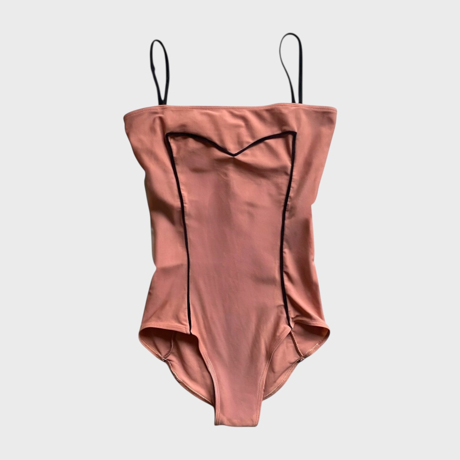 Pink camisole leotard with black details. Size S, fair condition – defect on one of the straps.
