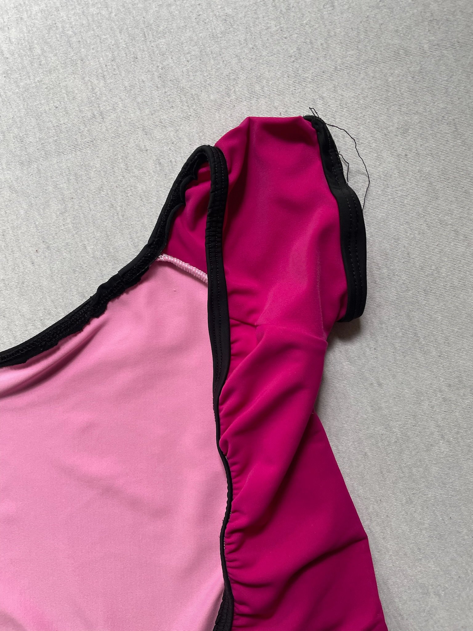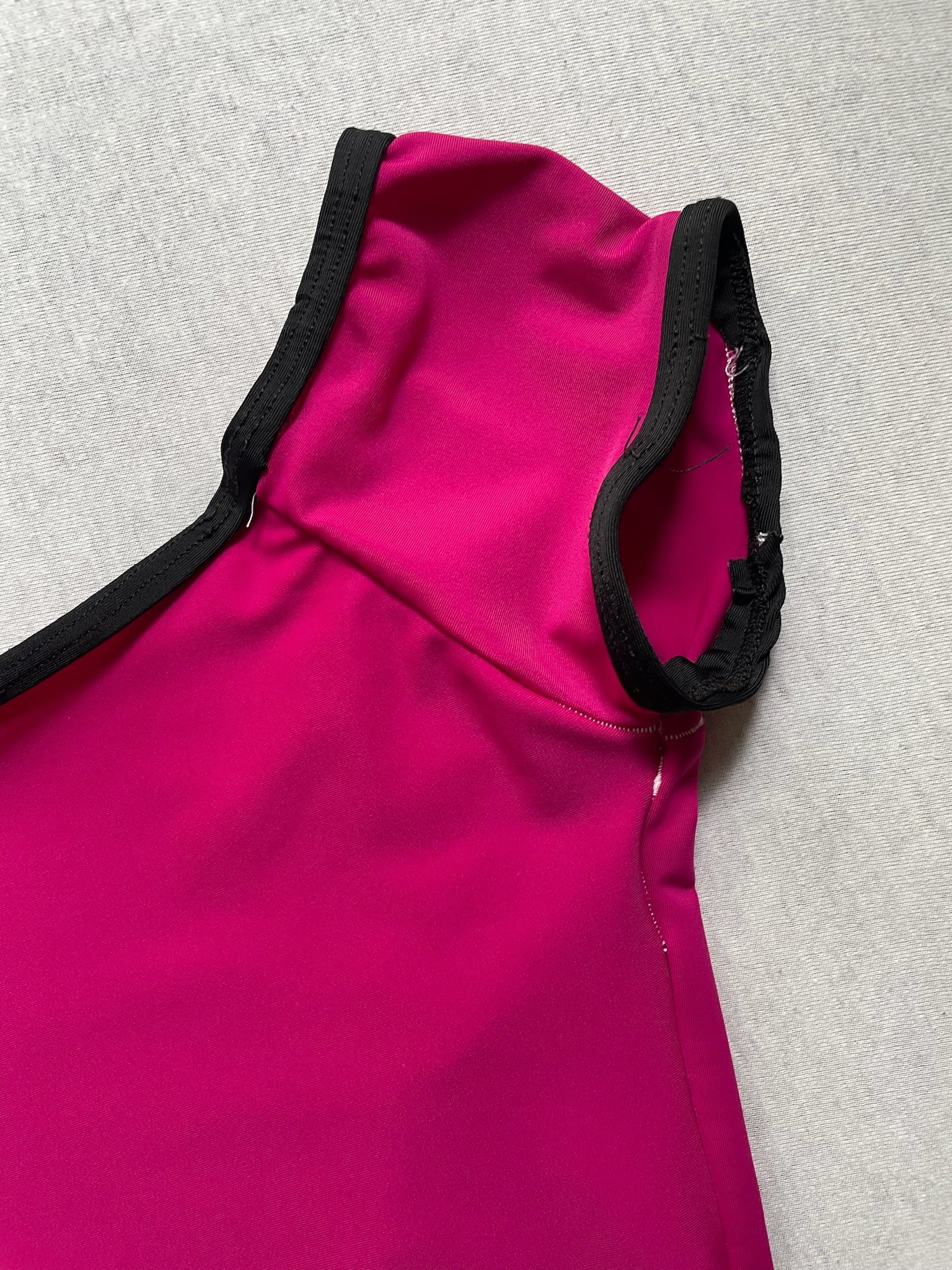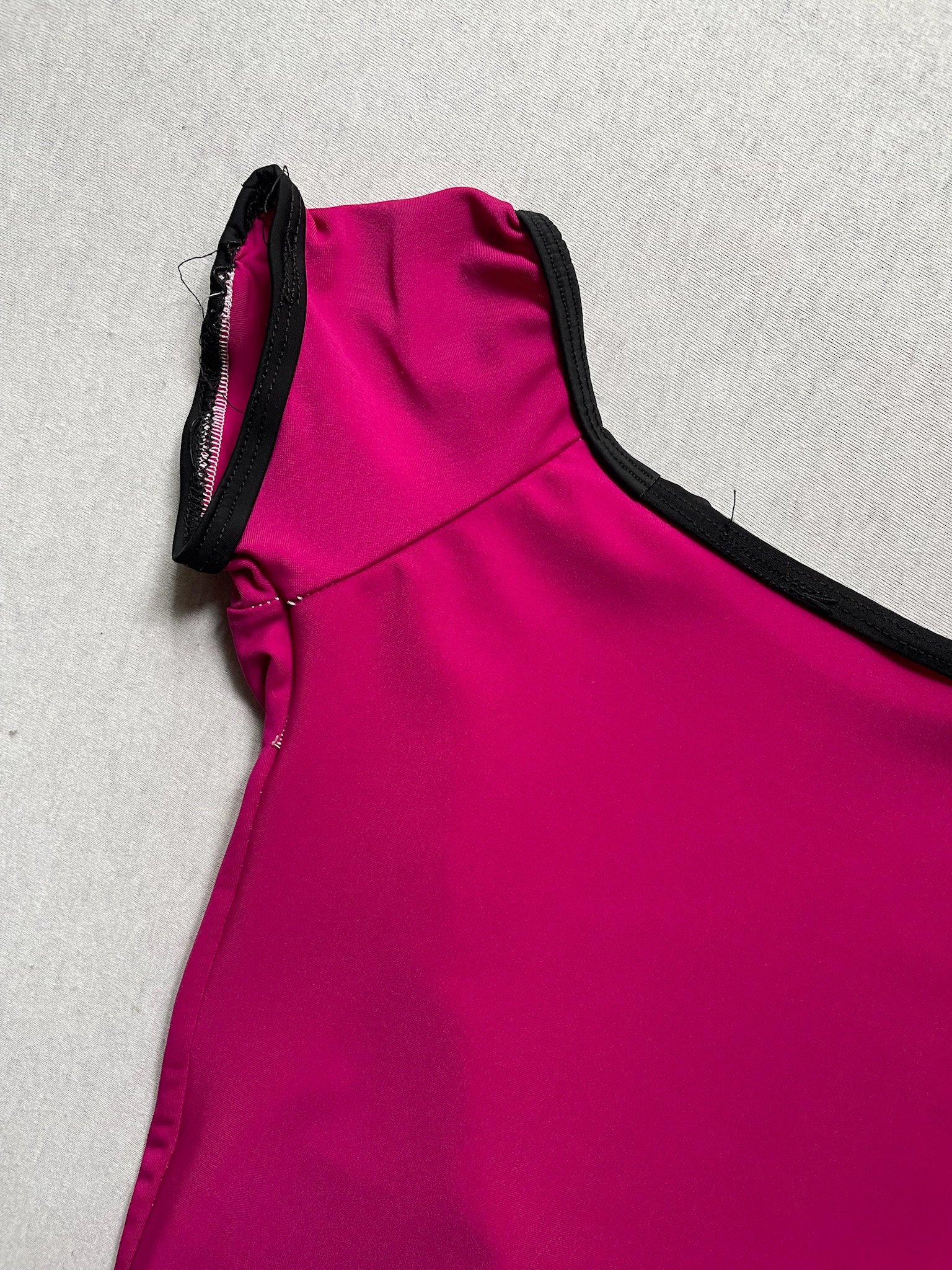 Handmade leotard in hot pink with black trim, cap sleeves and an open back. Size XS/S, fair condition – loose threads around the trim and elastics.