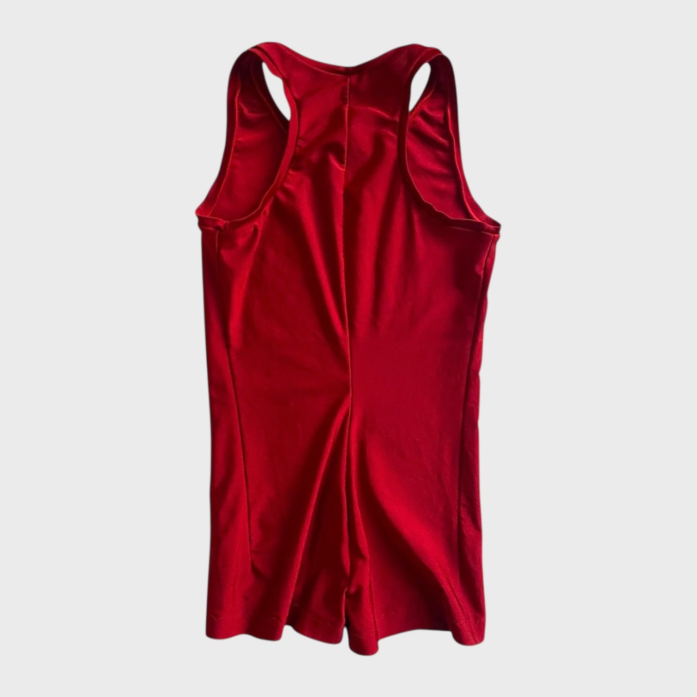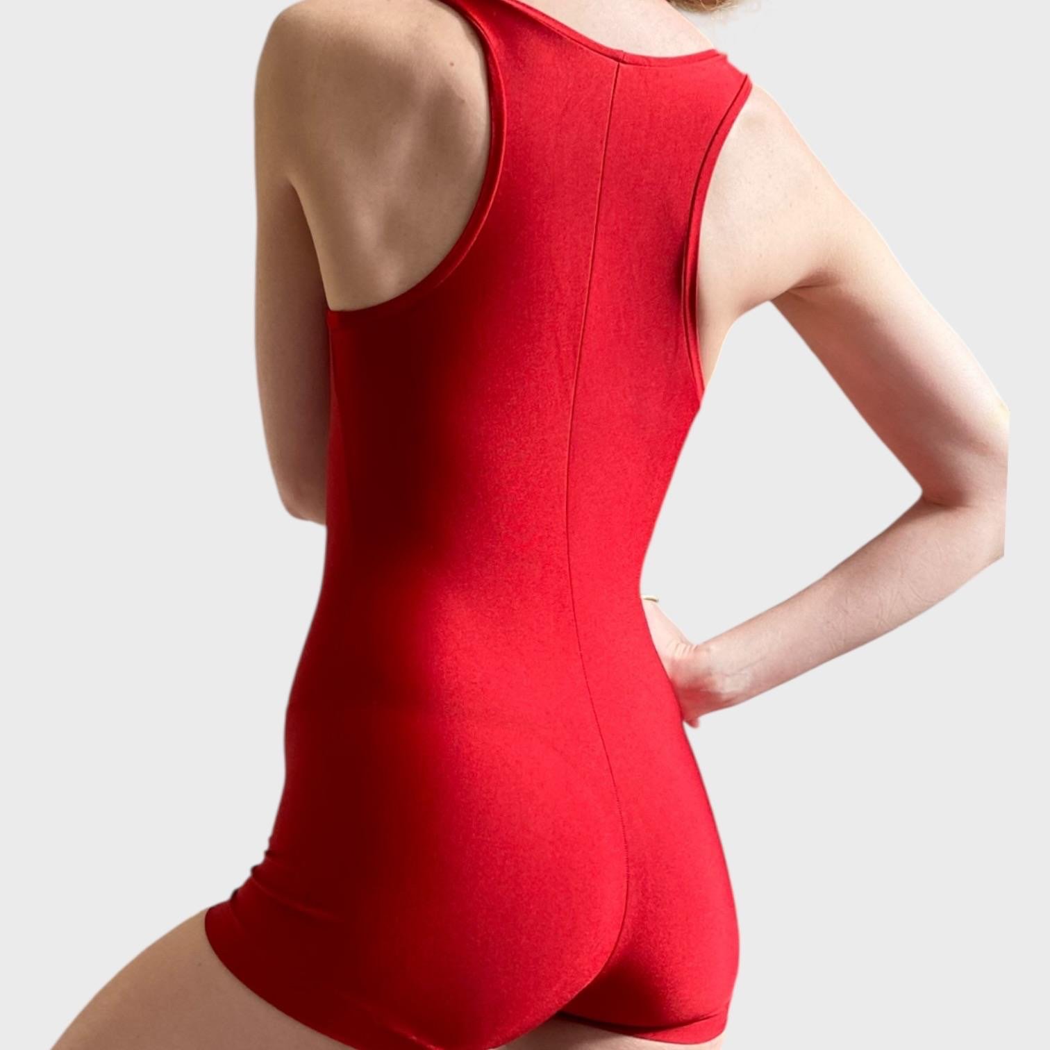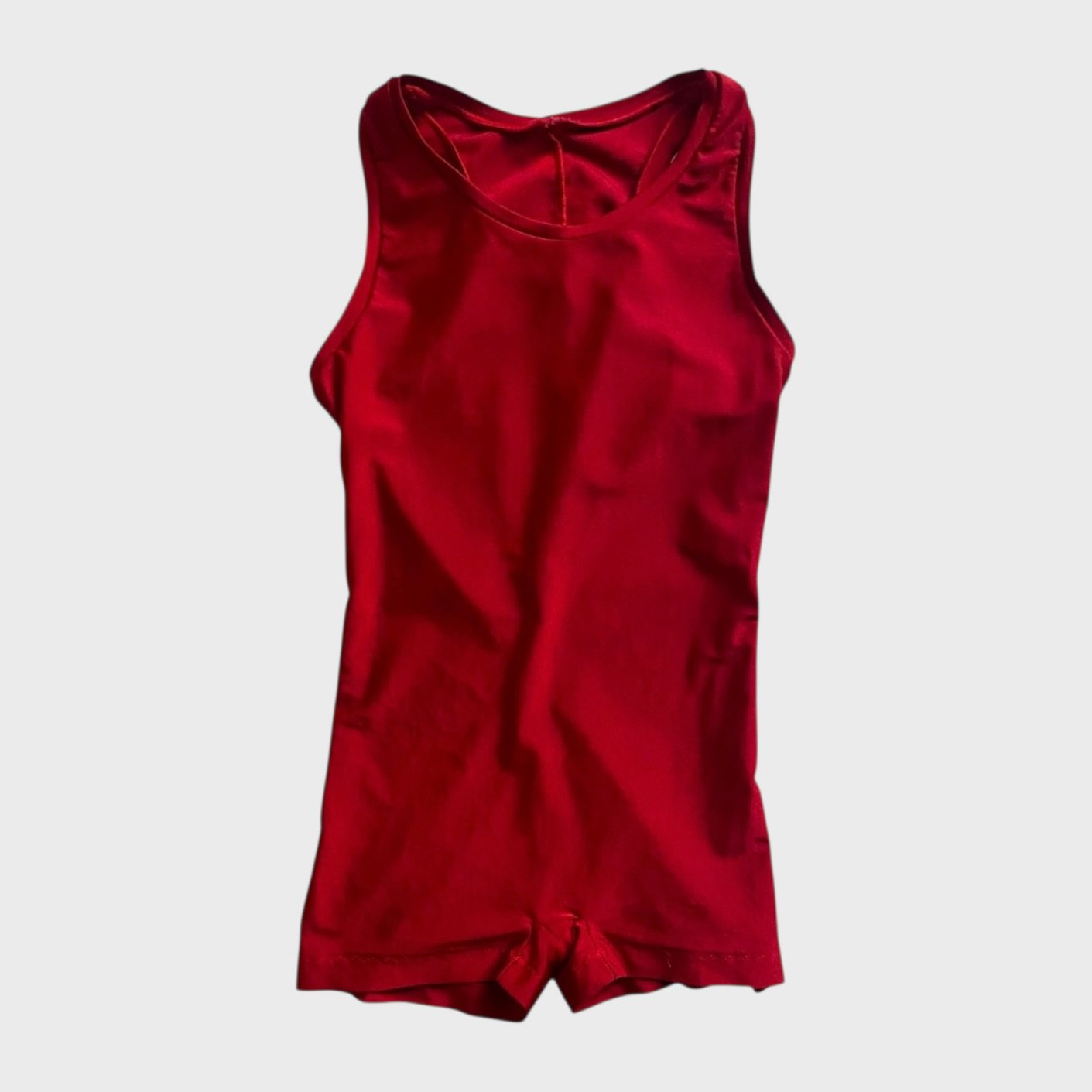 Red unisex biketard, brand unknown. Size men’s XS, women’s S, fair condition – small defect on the seam on one of the legs.
