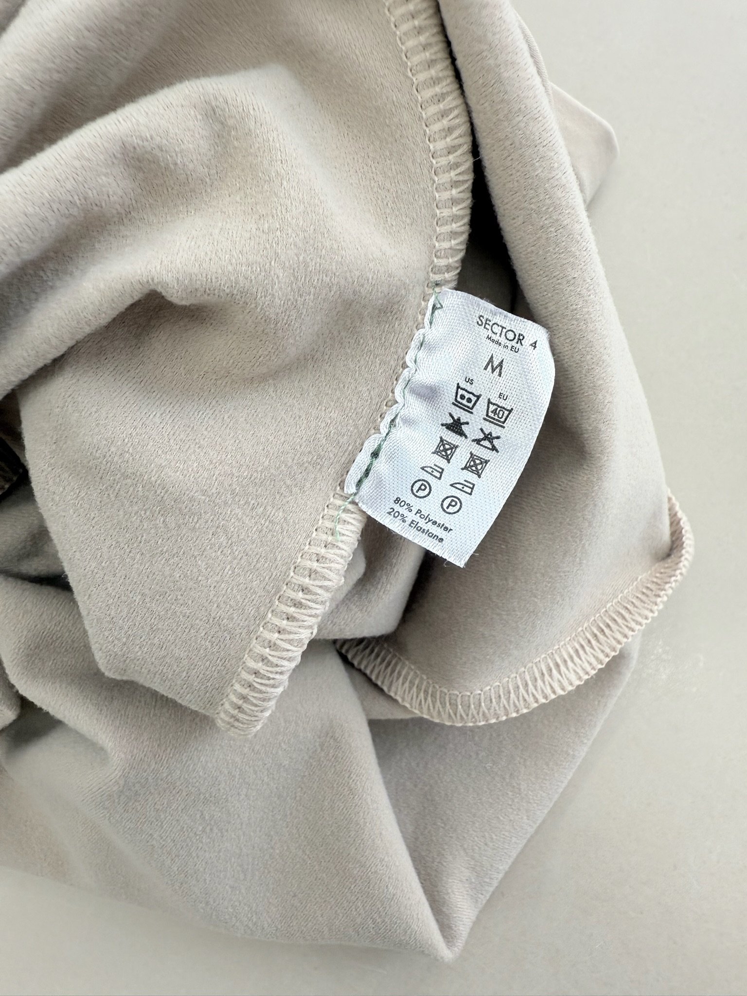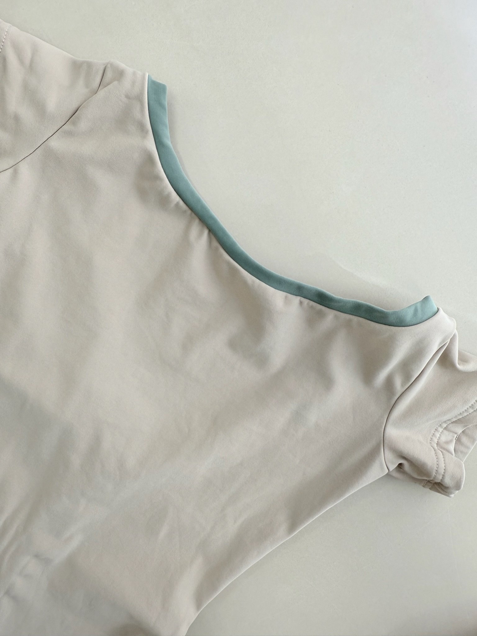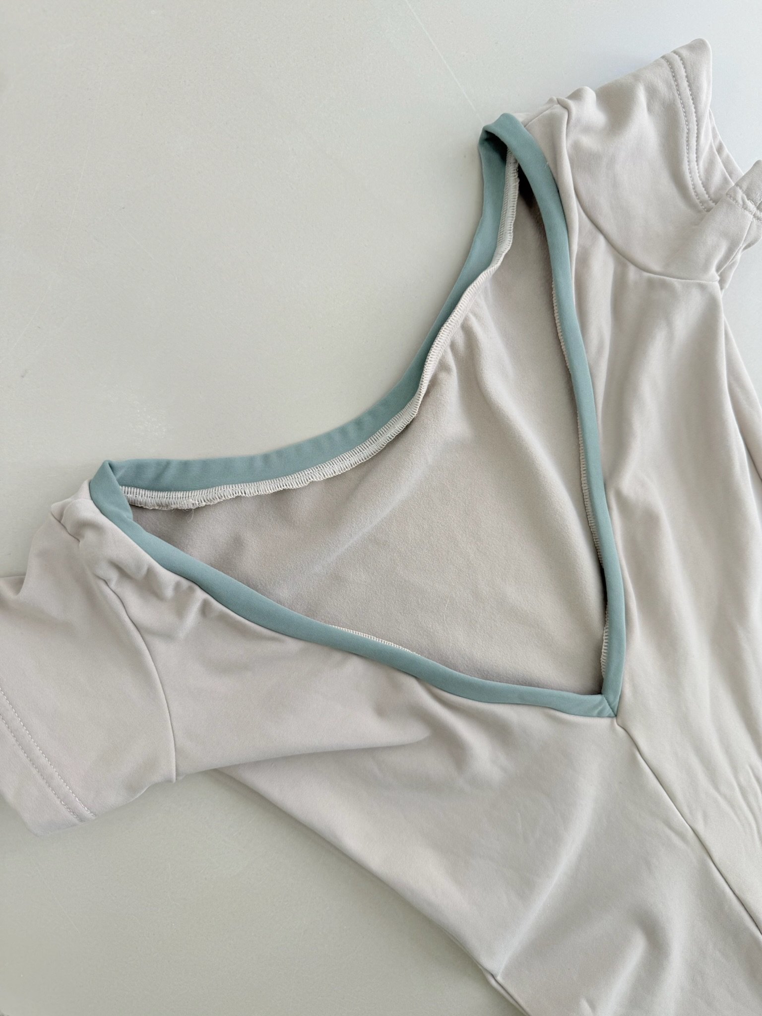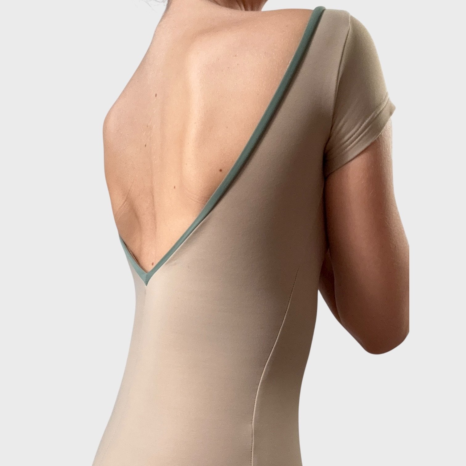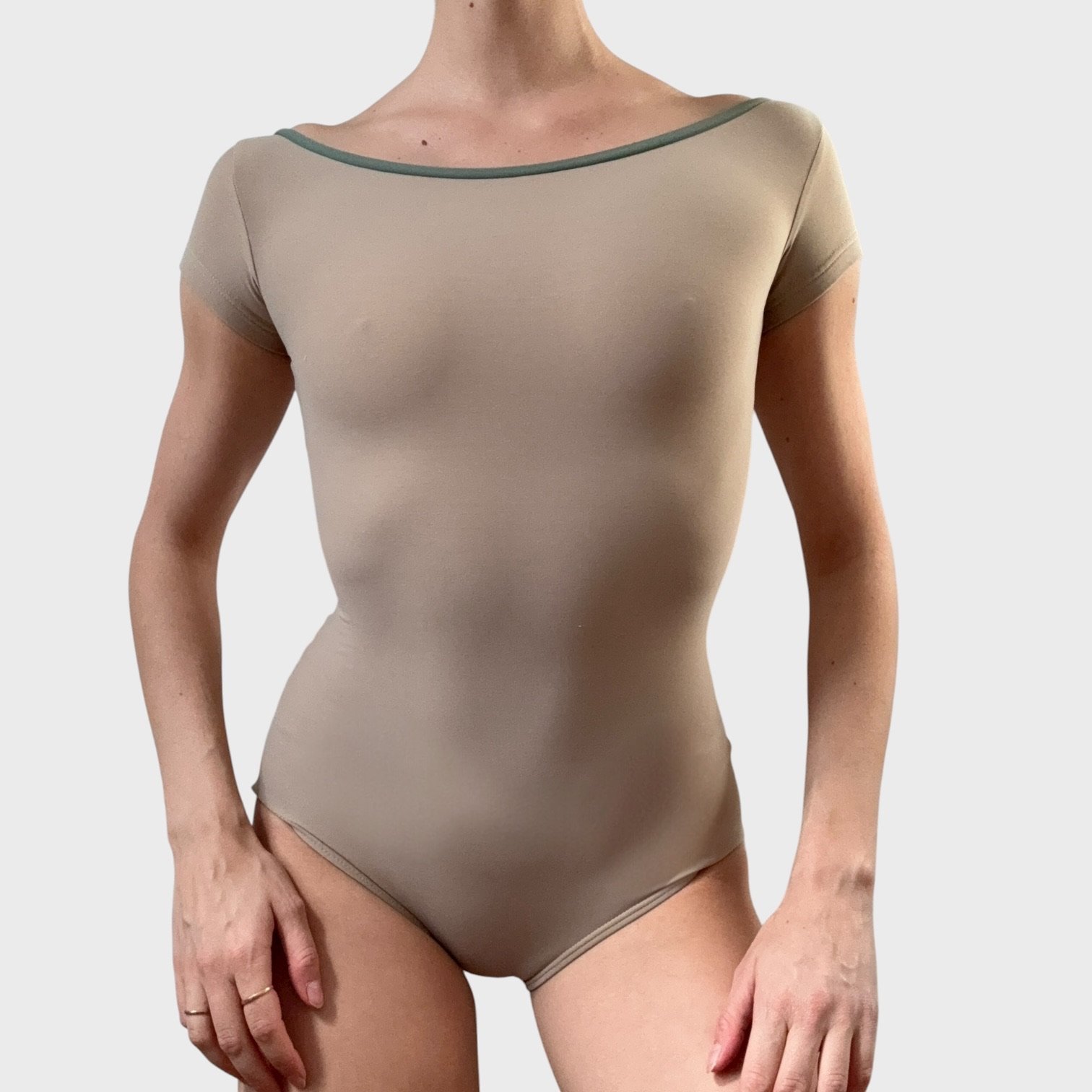 Sector 4 leotard in beige microfiber with light green trim and short sleeves. Size M, great condition.