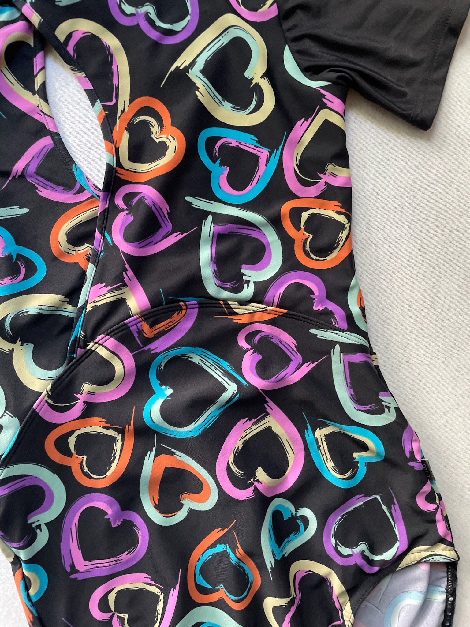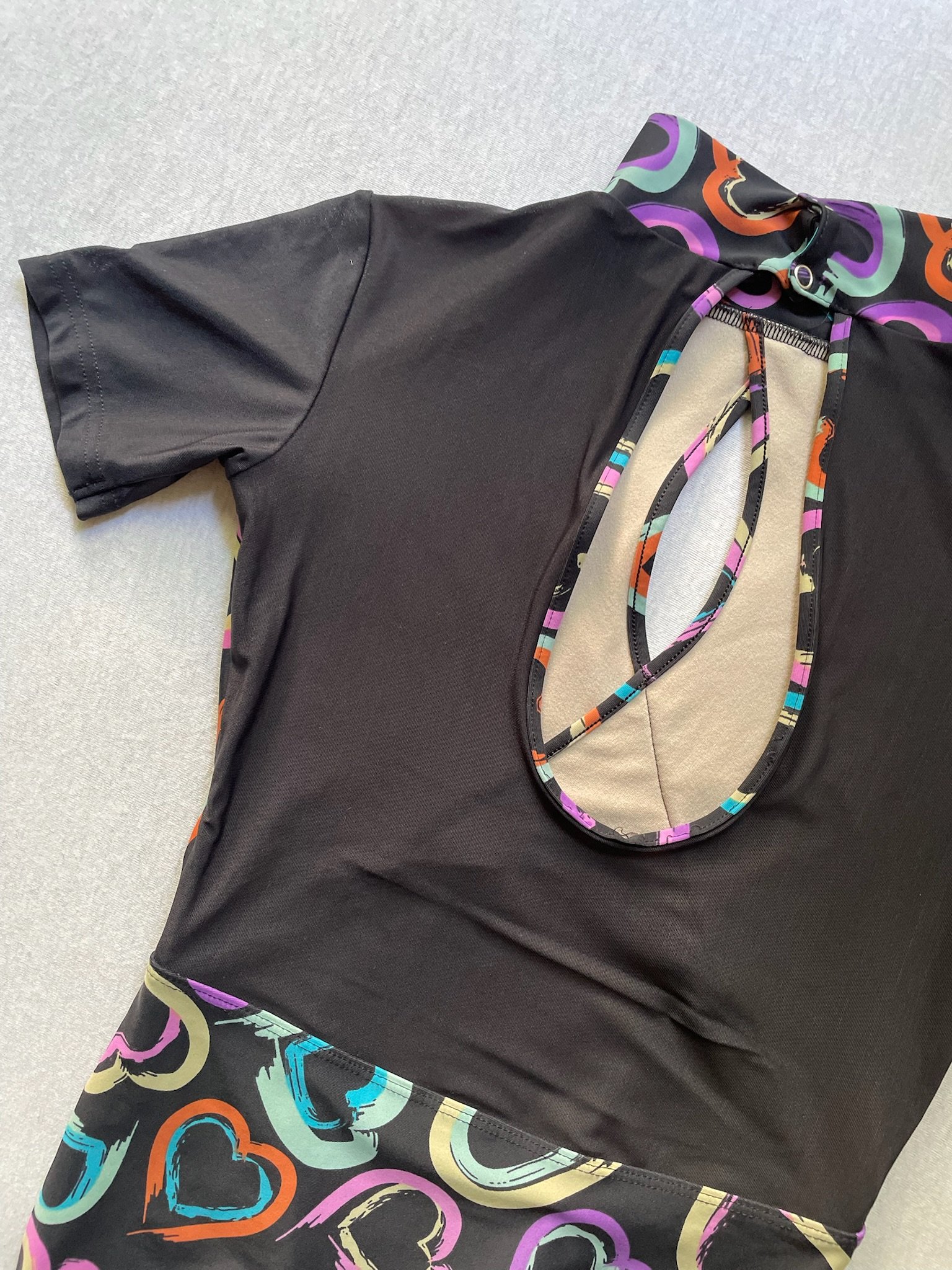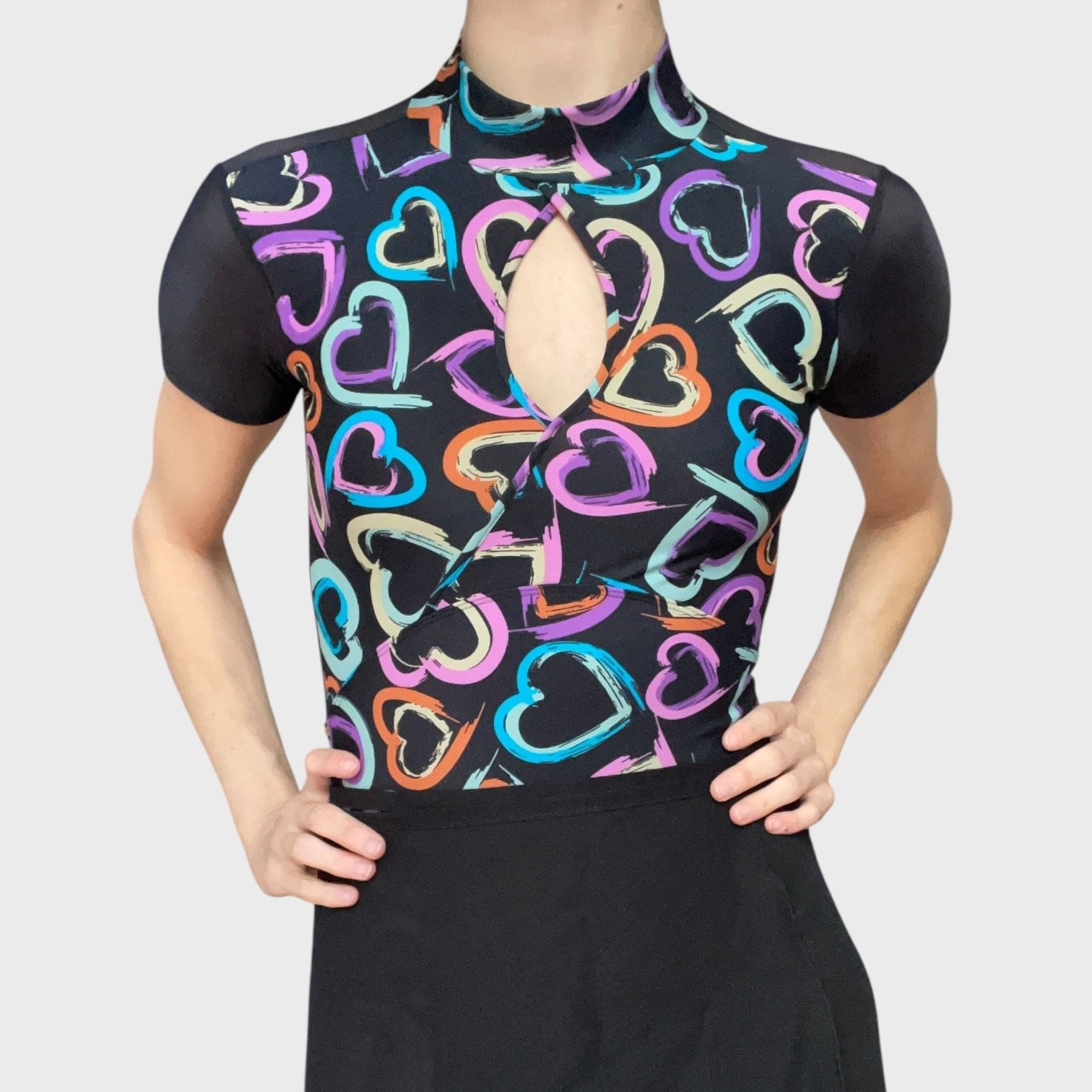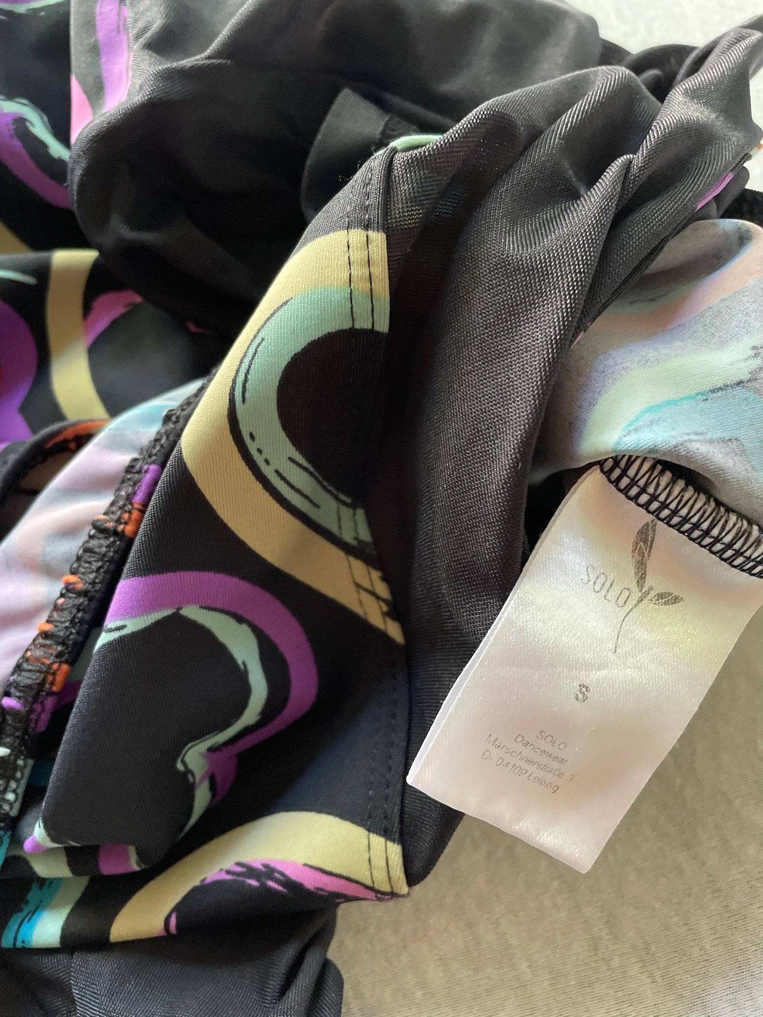 Solo Dancewear leotard in black with colorful pattern, mesh back and short sleeves. Size S, great condition – minor defects on the seam at the back.