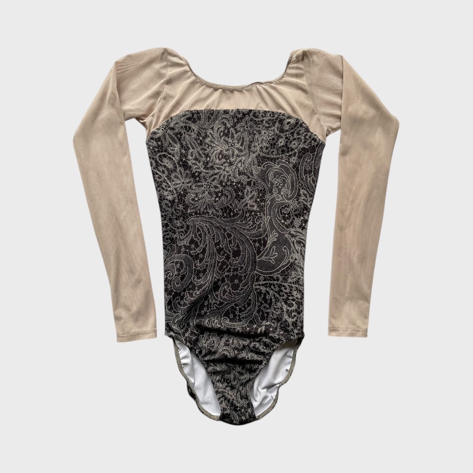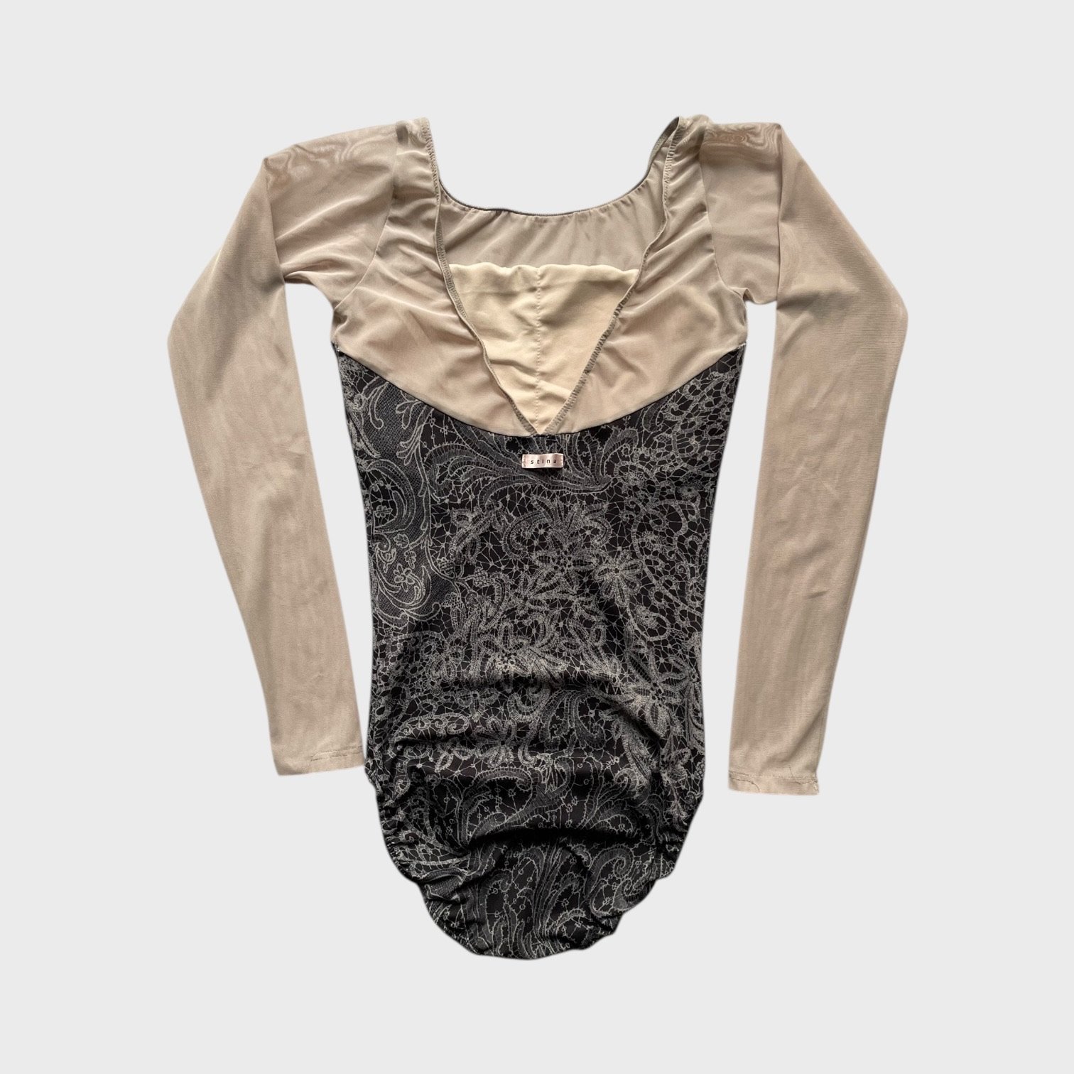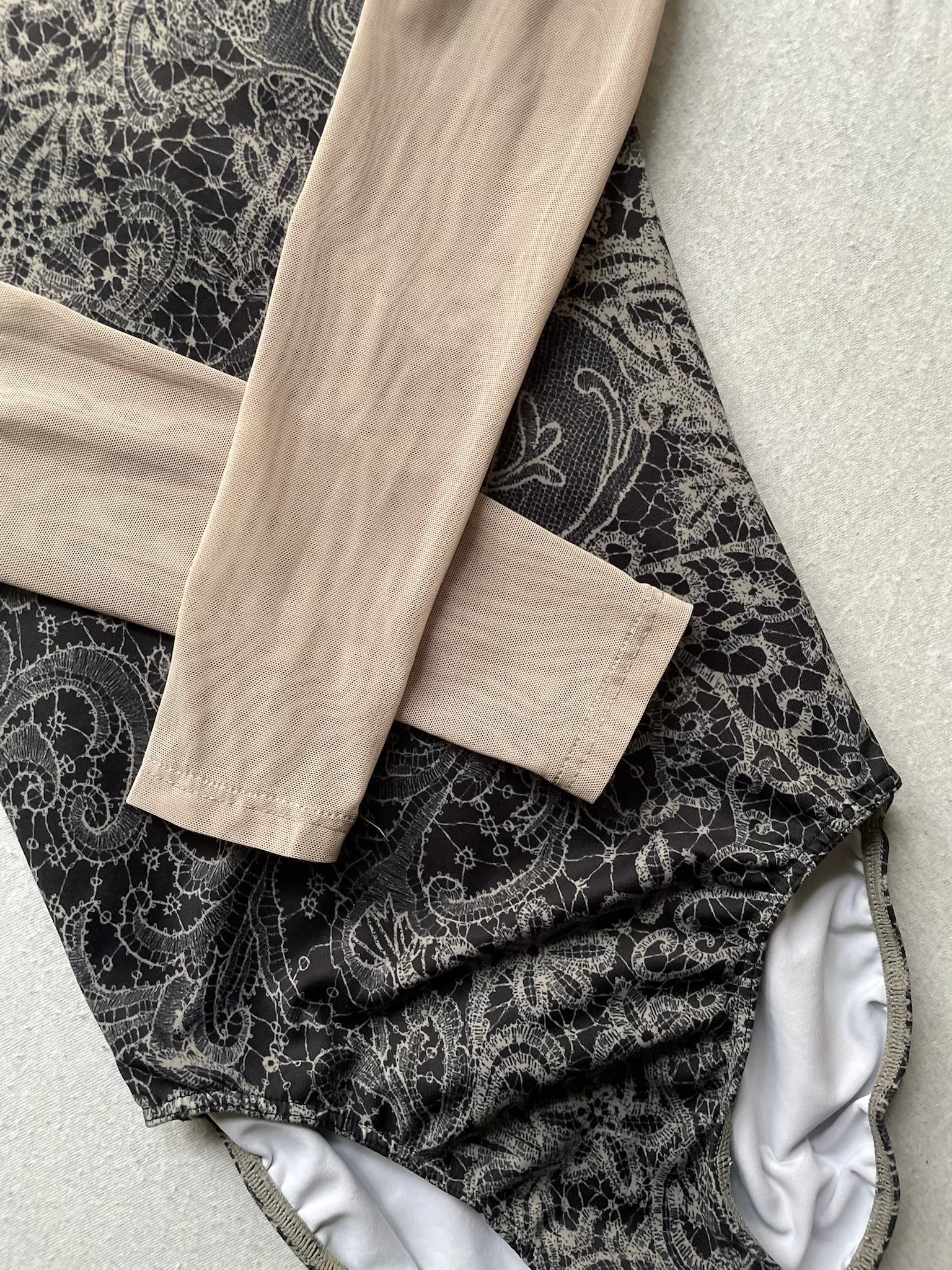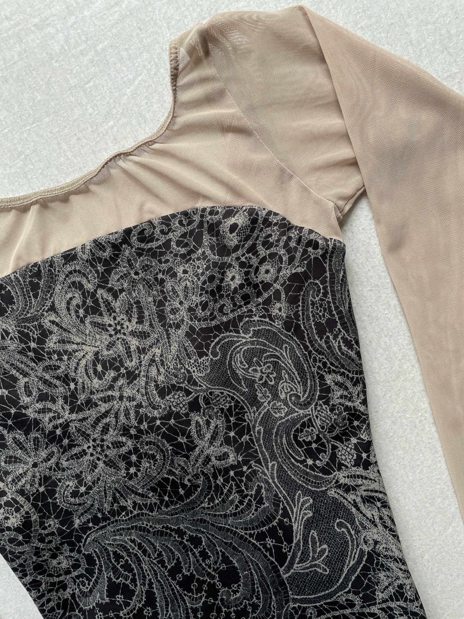 Stina leotard with patterned body and nude mesh long sleeves. Size S, great condition.
