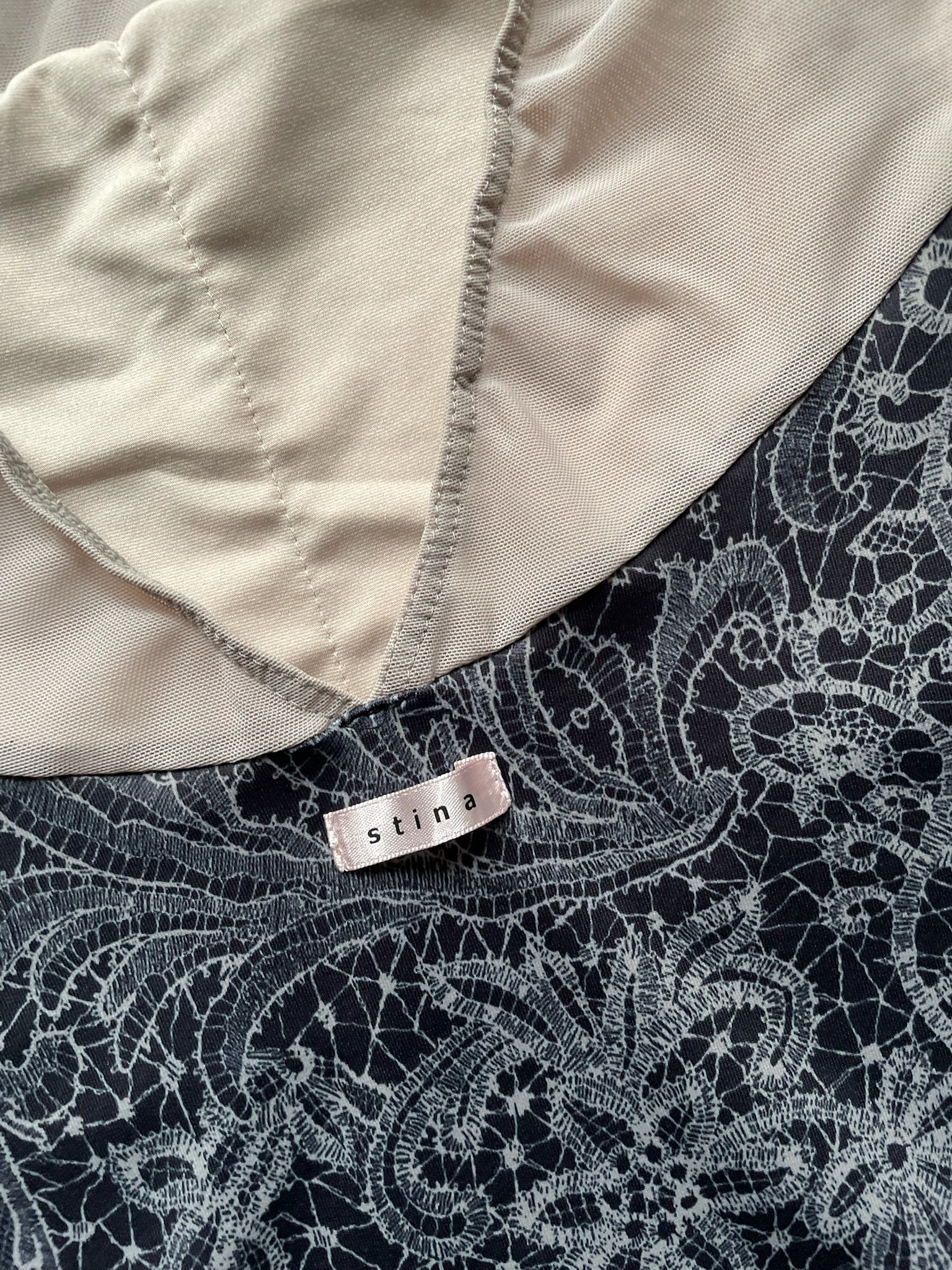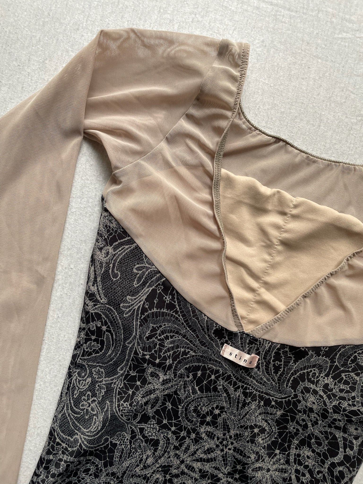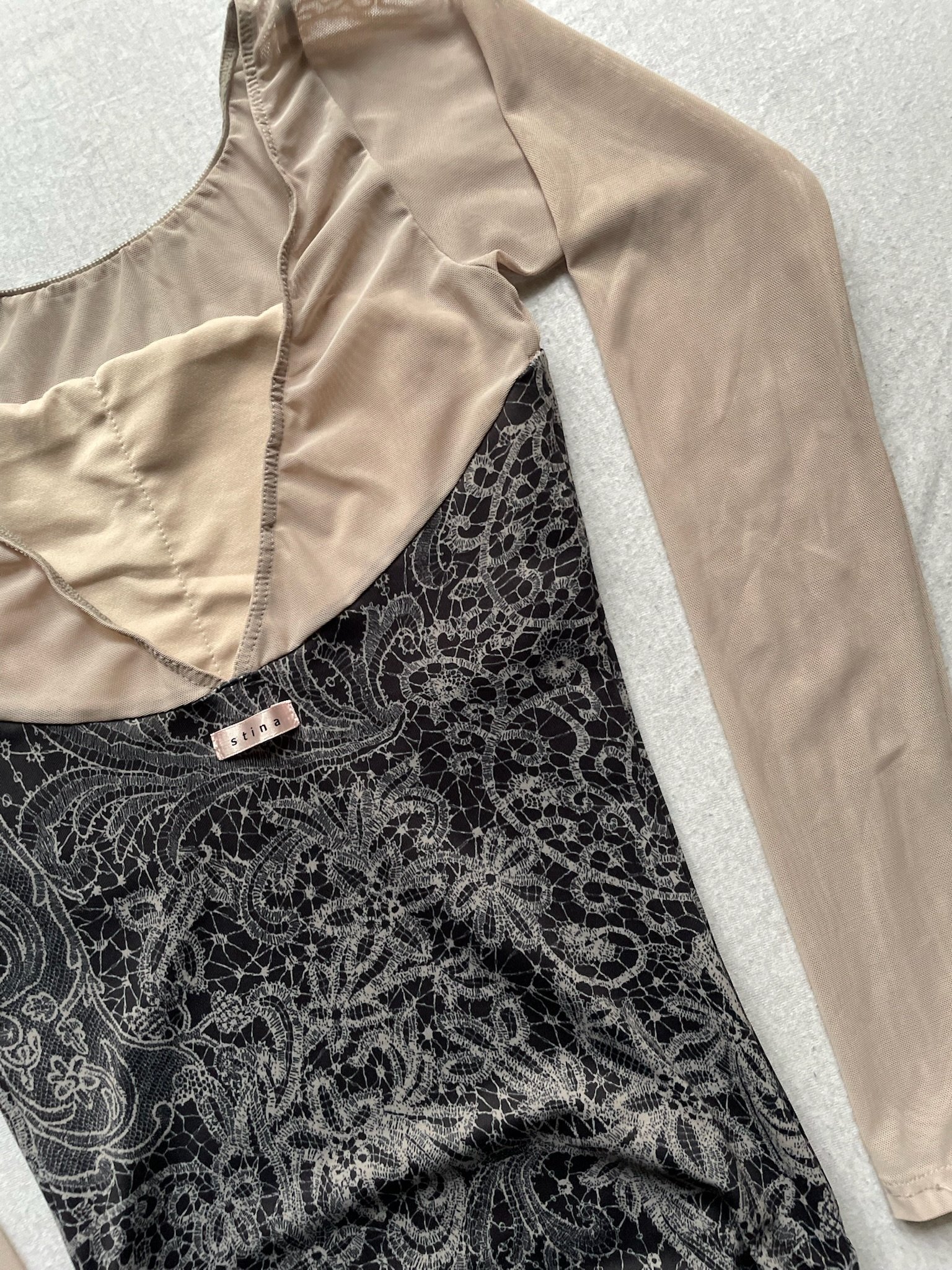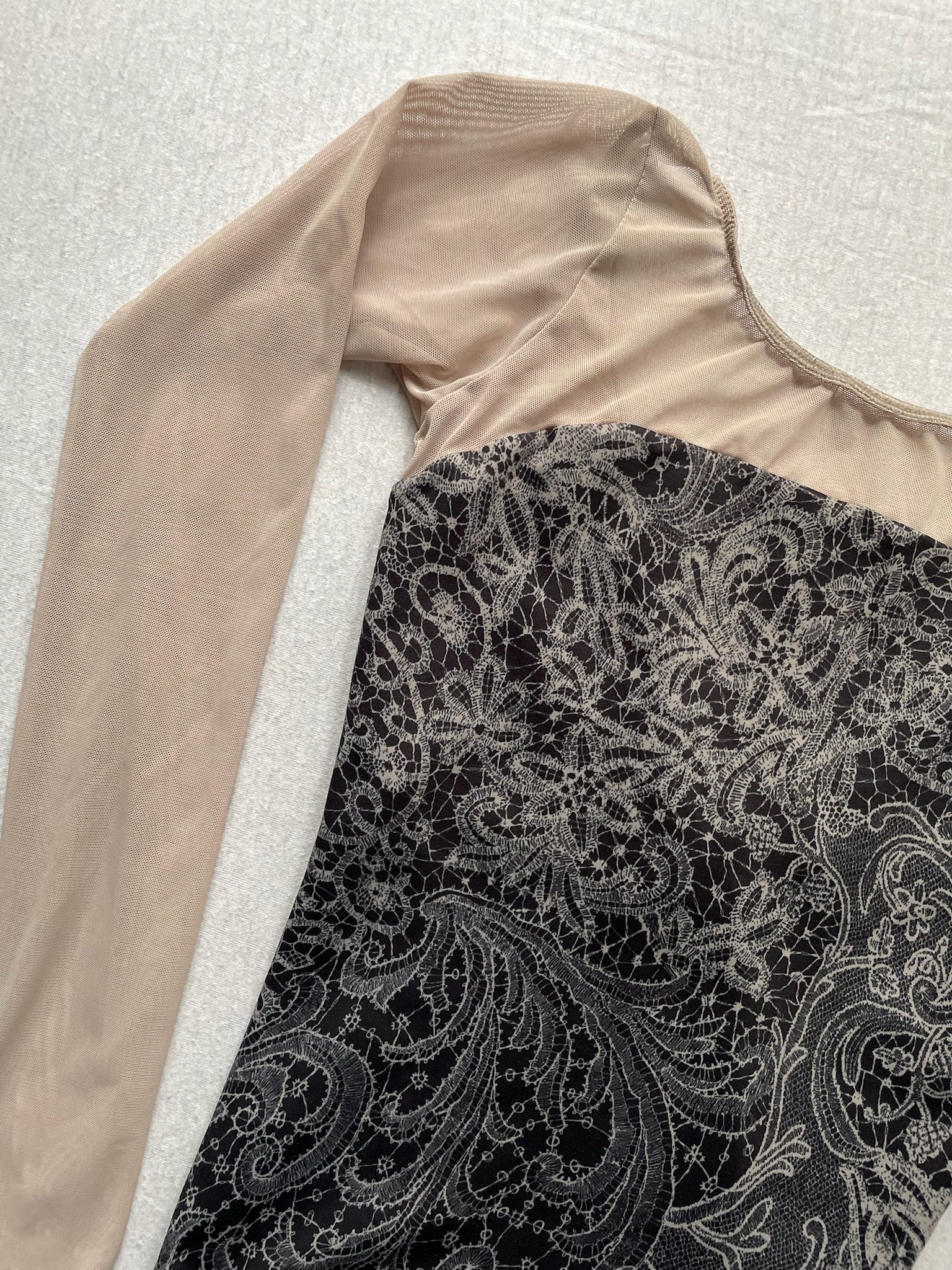 Stina leotard with patterned body and nude mesh long sleeves. Size S, great condition.