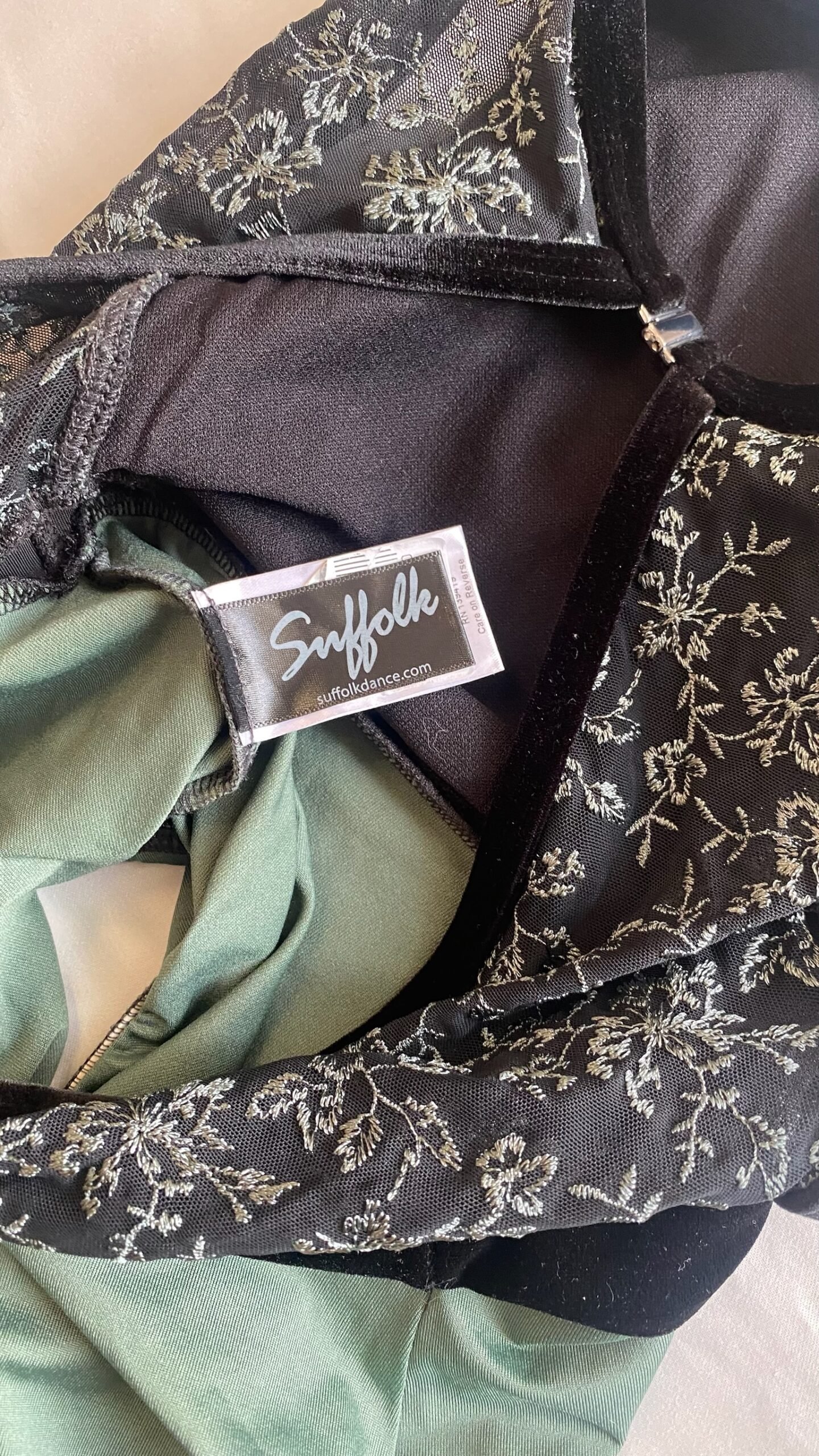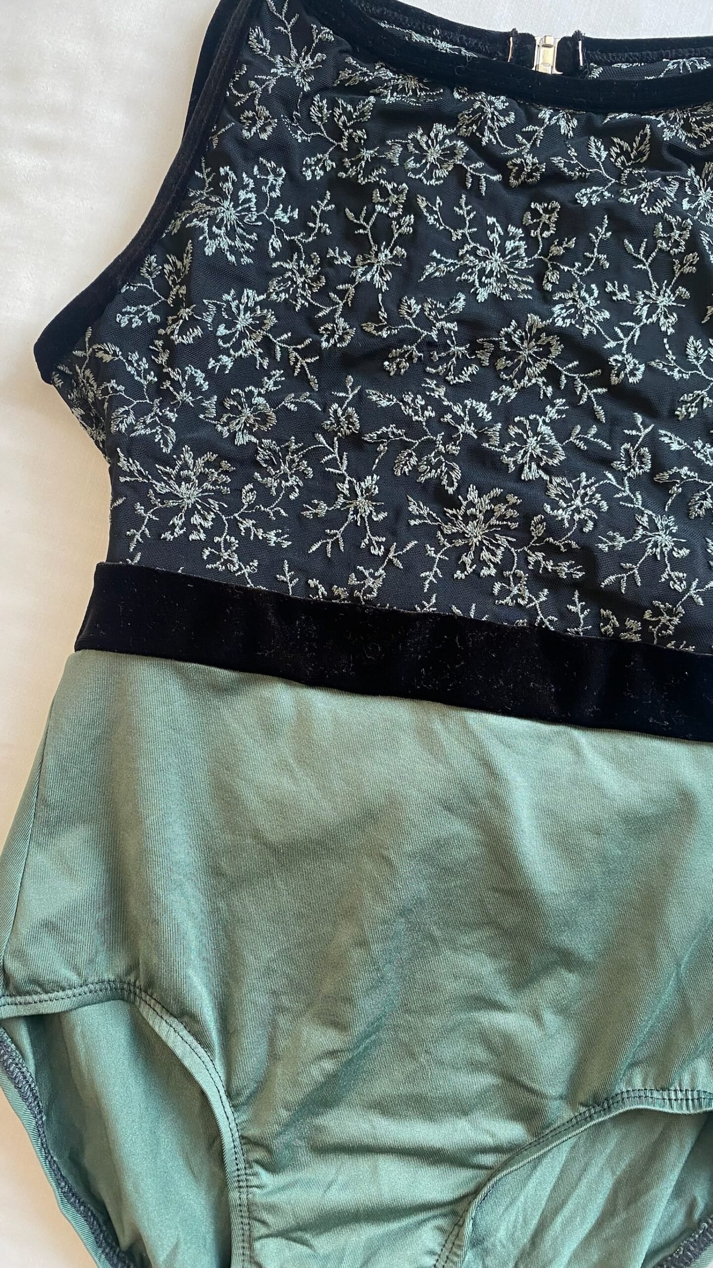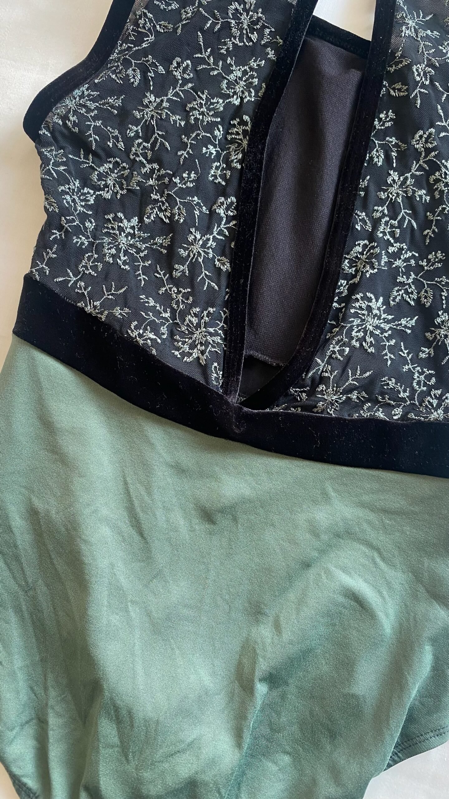 Suffolk leotard in green with embroidered mesh top and velvet details. Size XS, great condition.