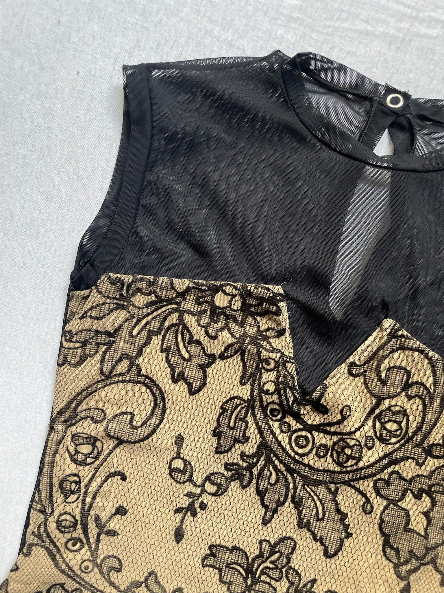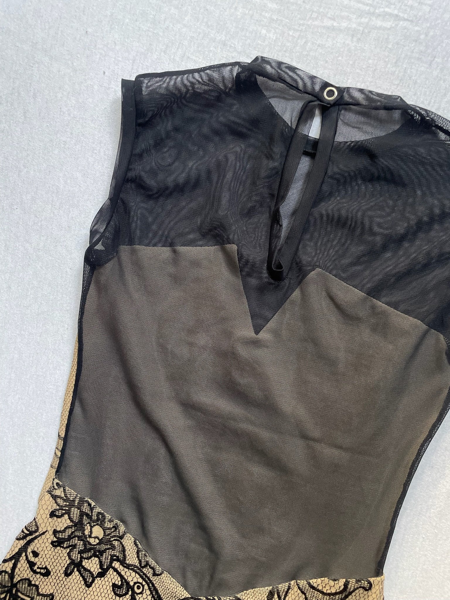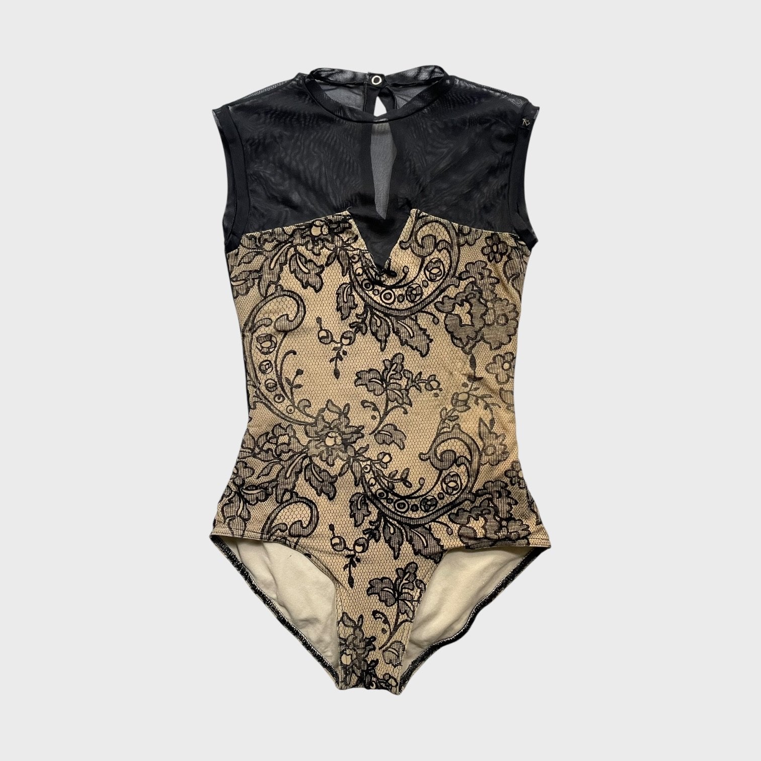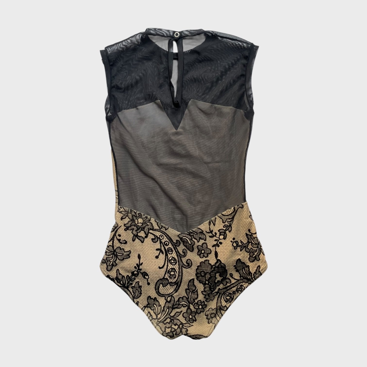 Theama lace print leotard with black mesh. Size S, fair condition – small hole in the mesh on the shoulder.