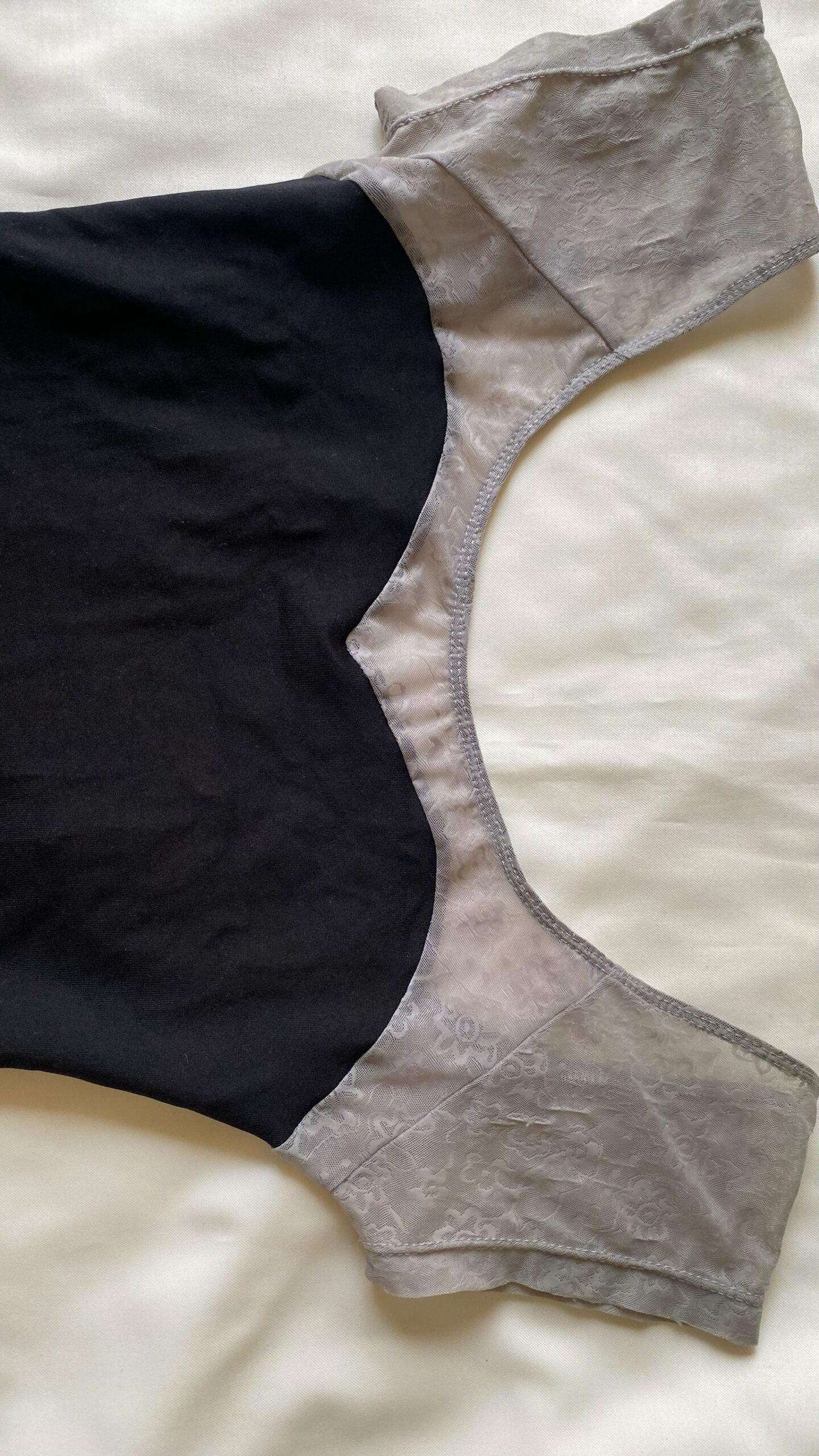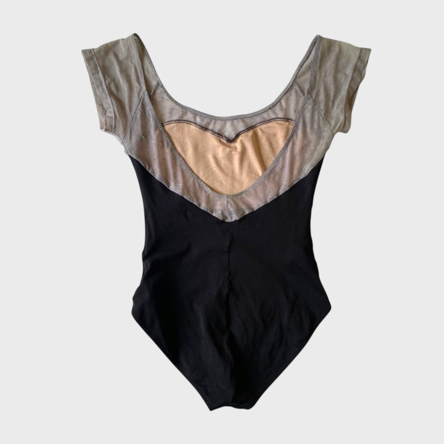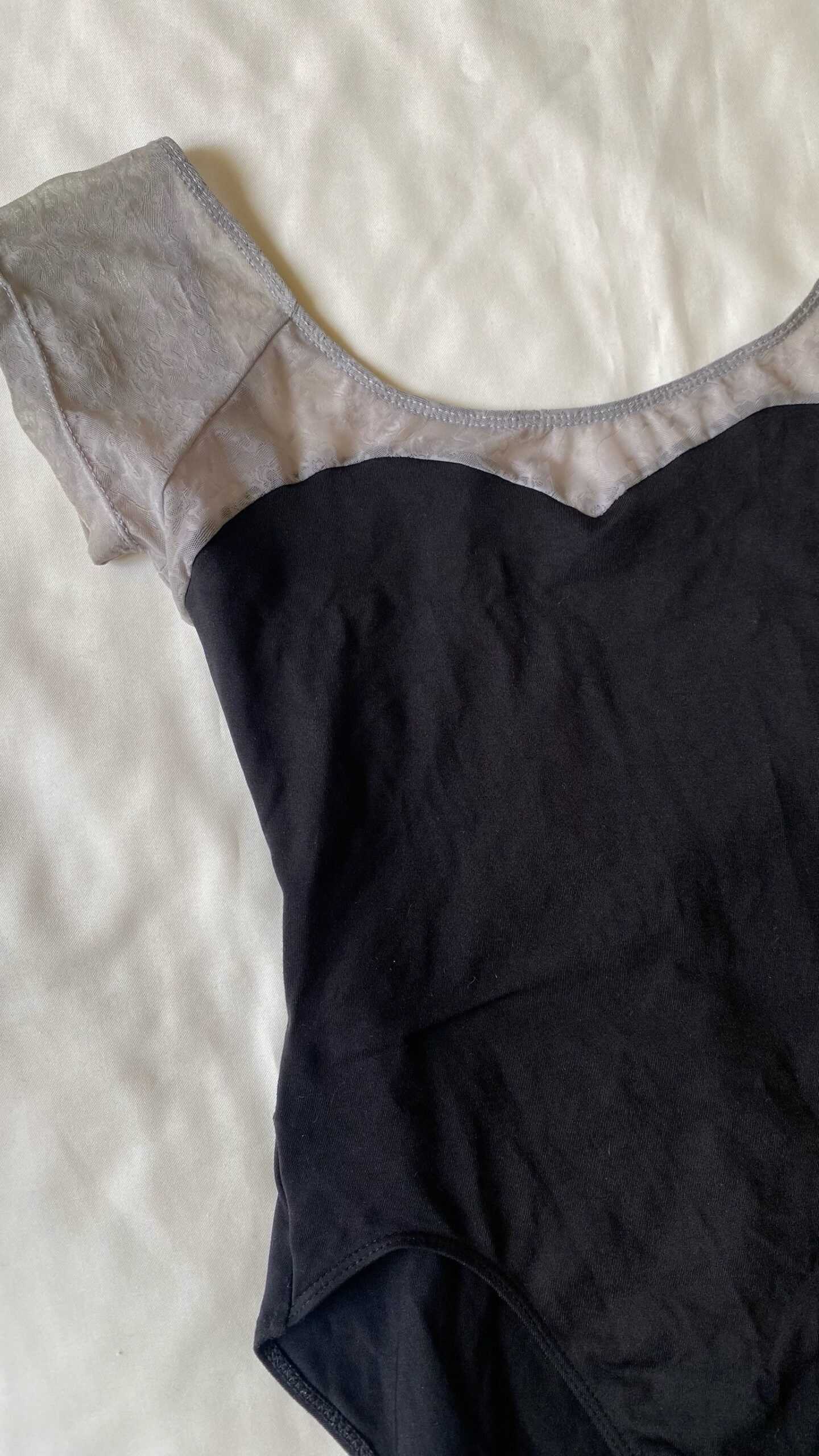 Vivgio leotard in black with light gray lace and short sleeves. Size 165 (fits M), fair condition.