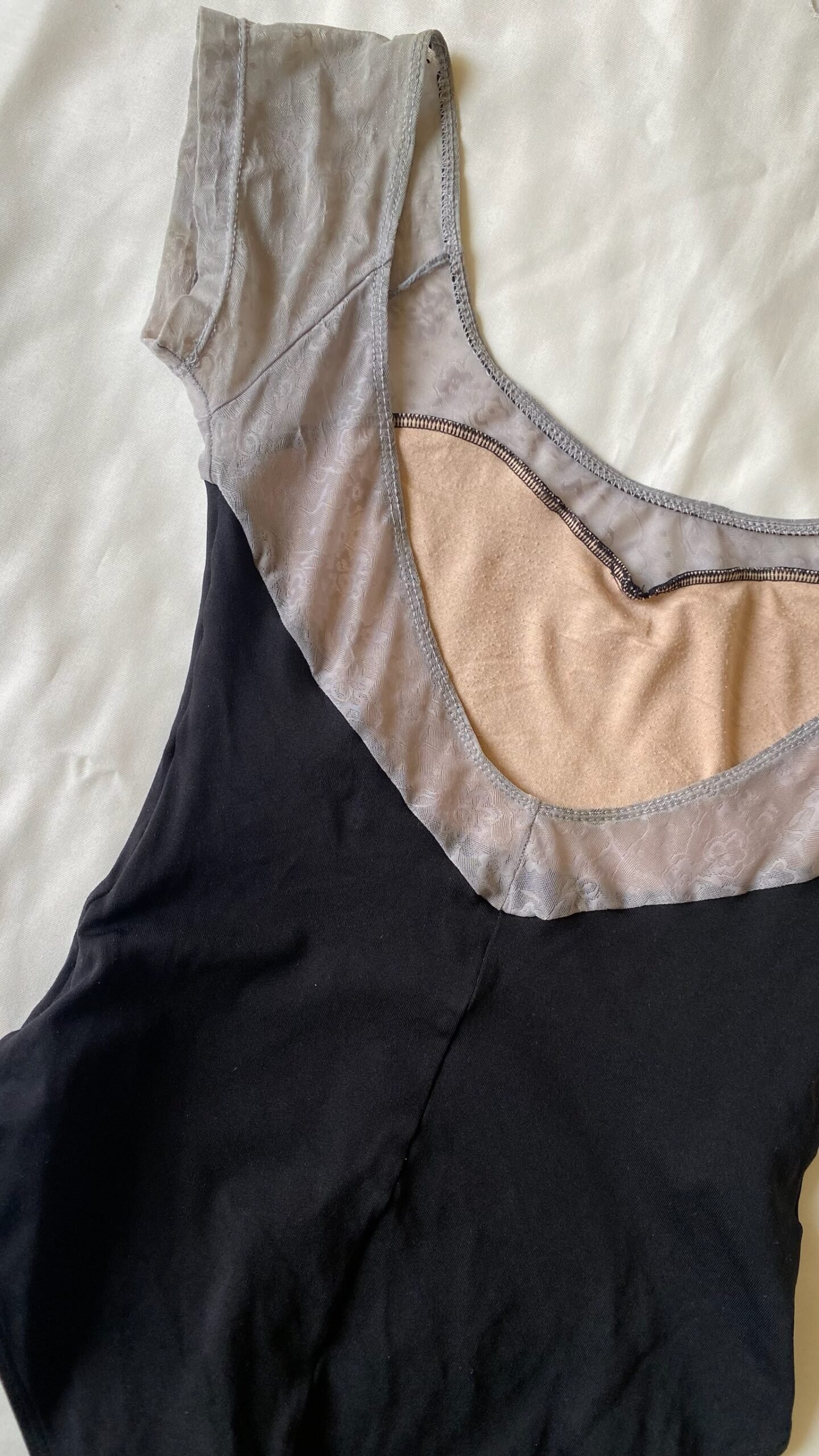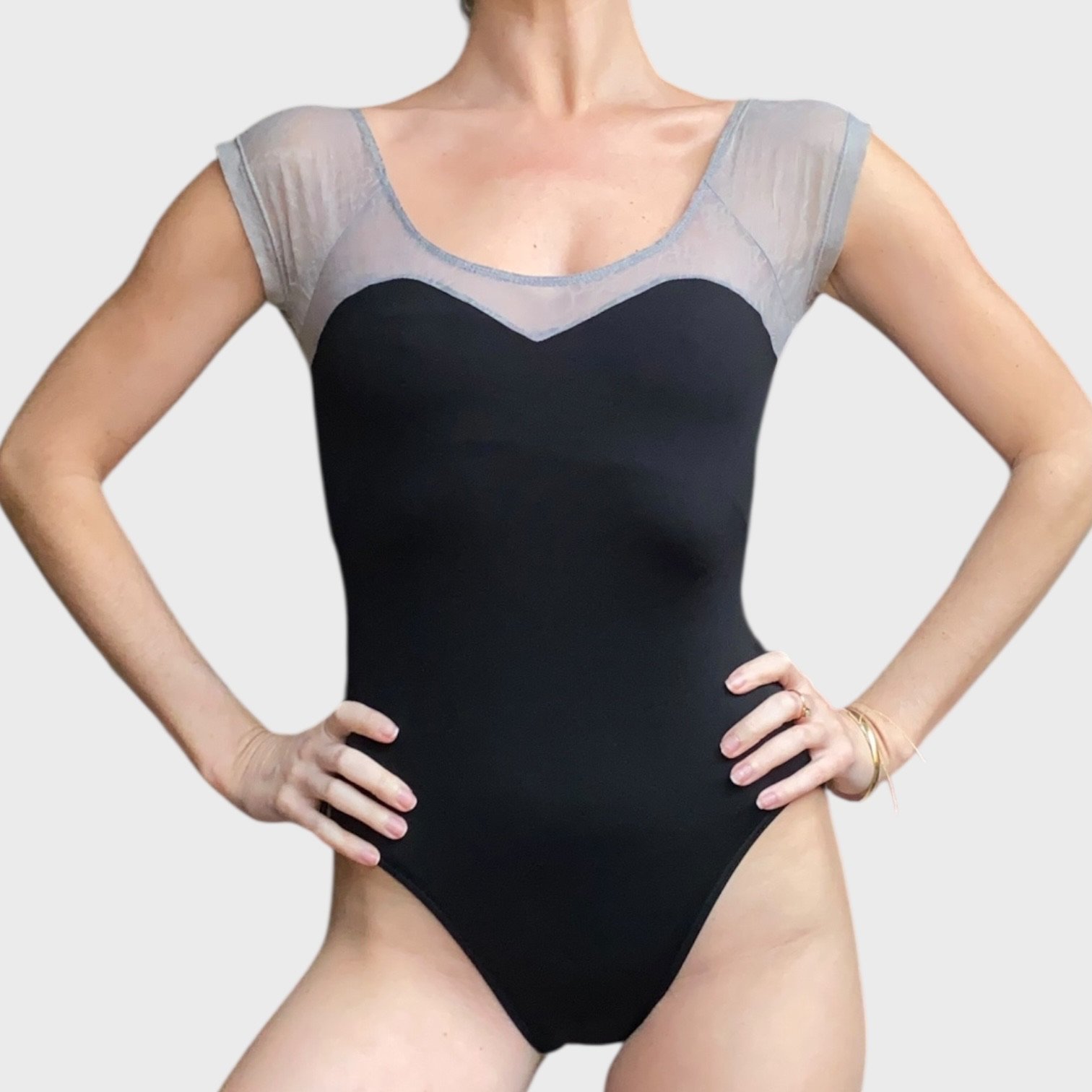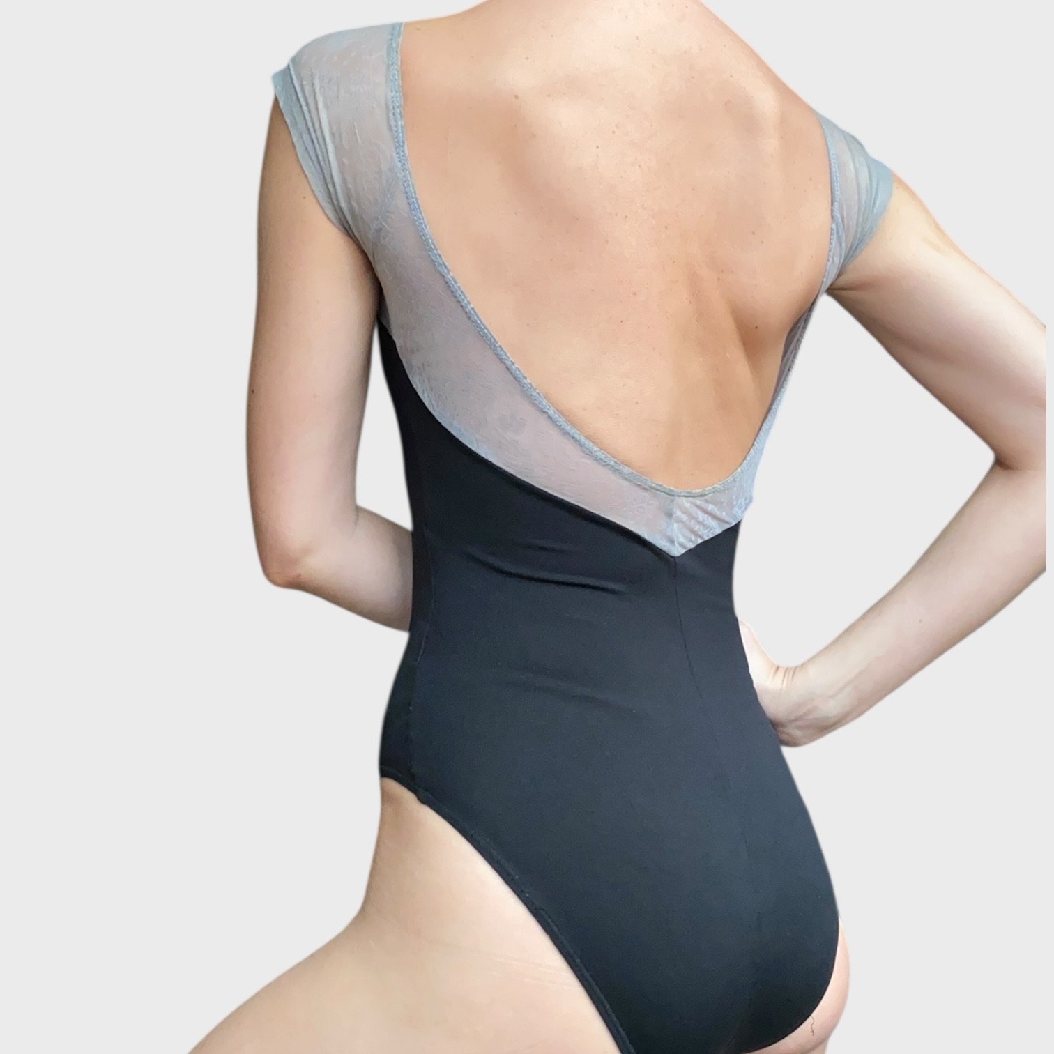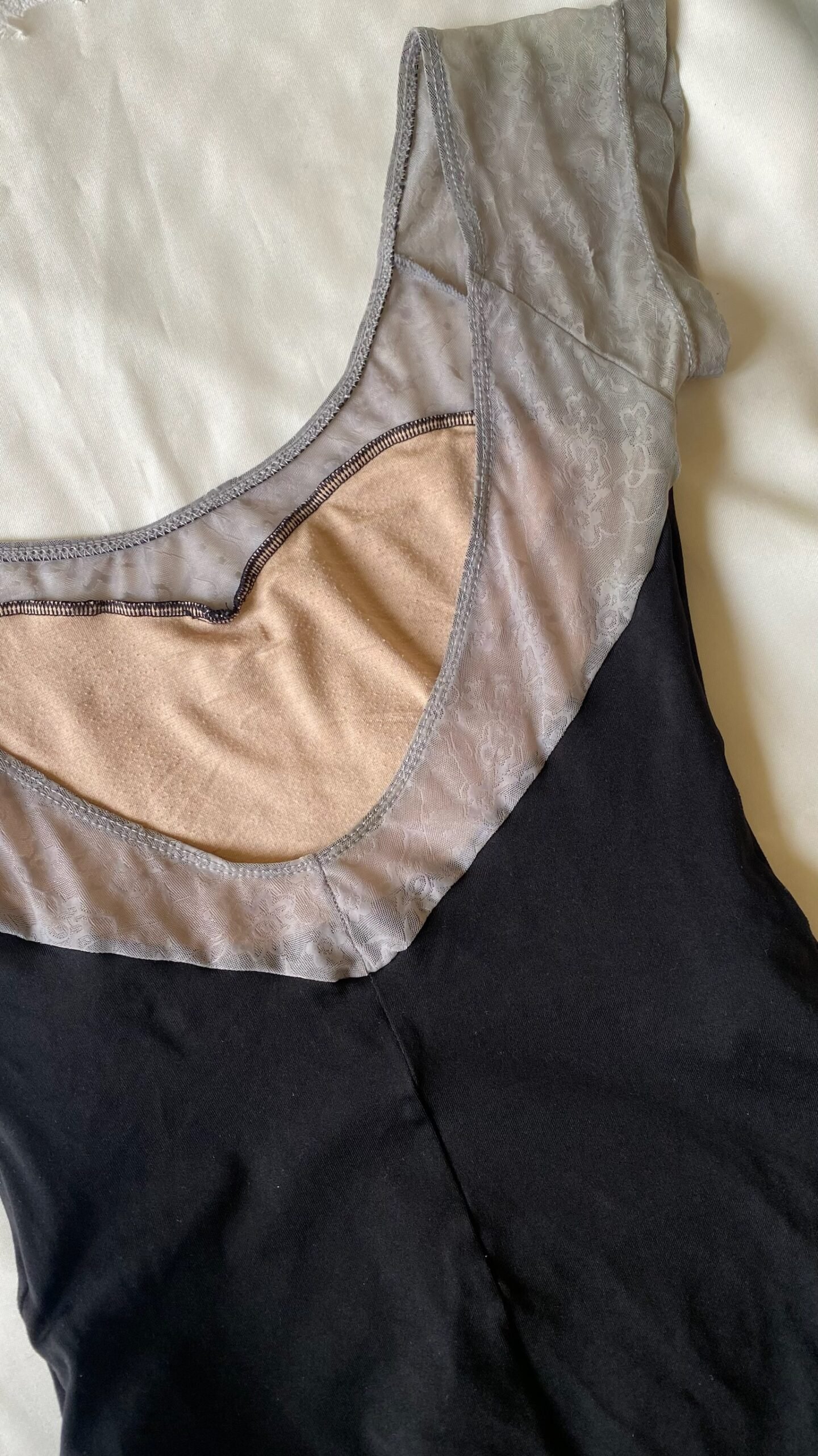 Vivgio leotard in black with light gray lace and short sleeves. Size 165 (fits M), fair condition.