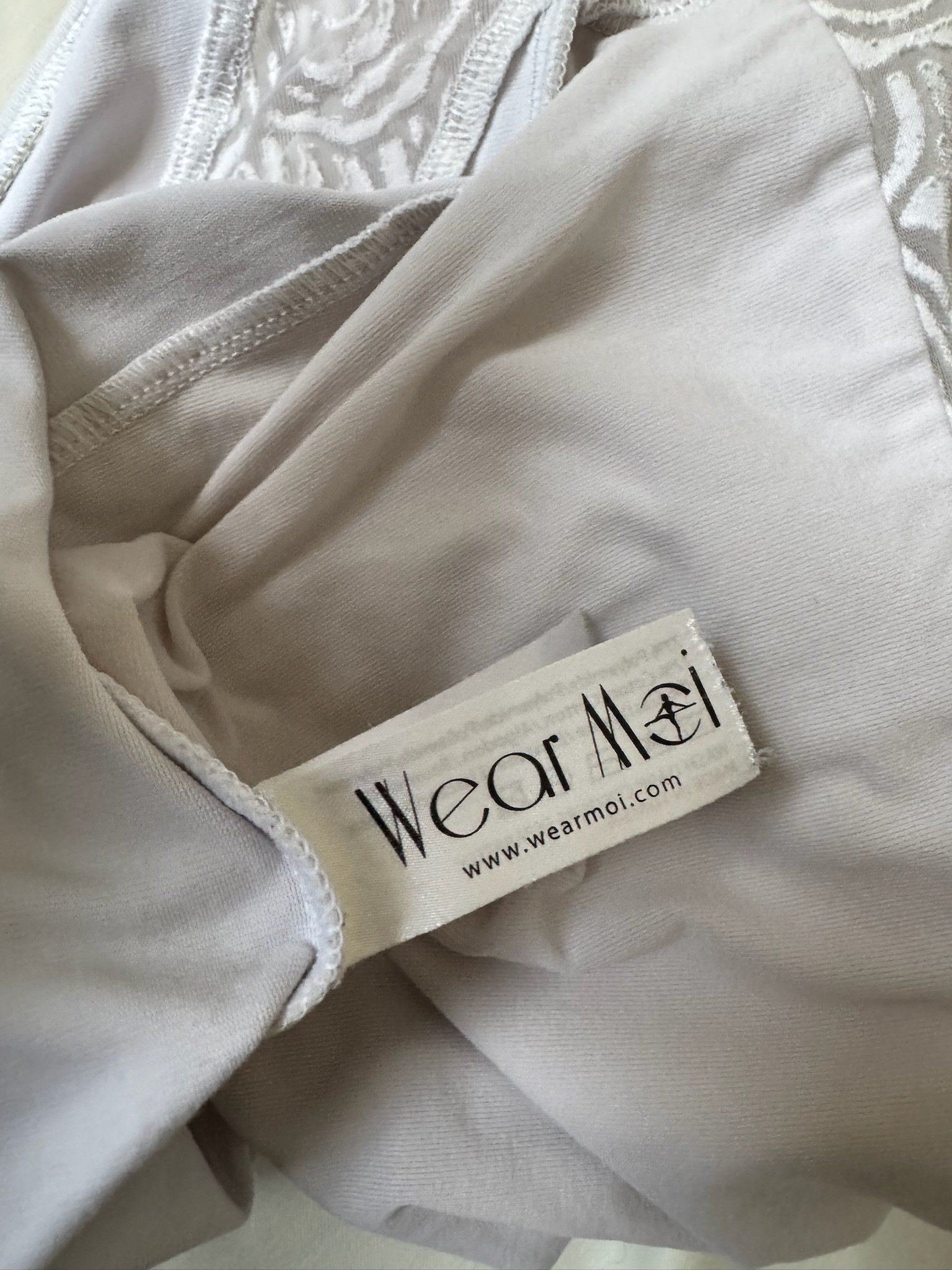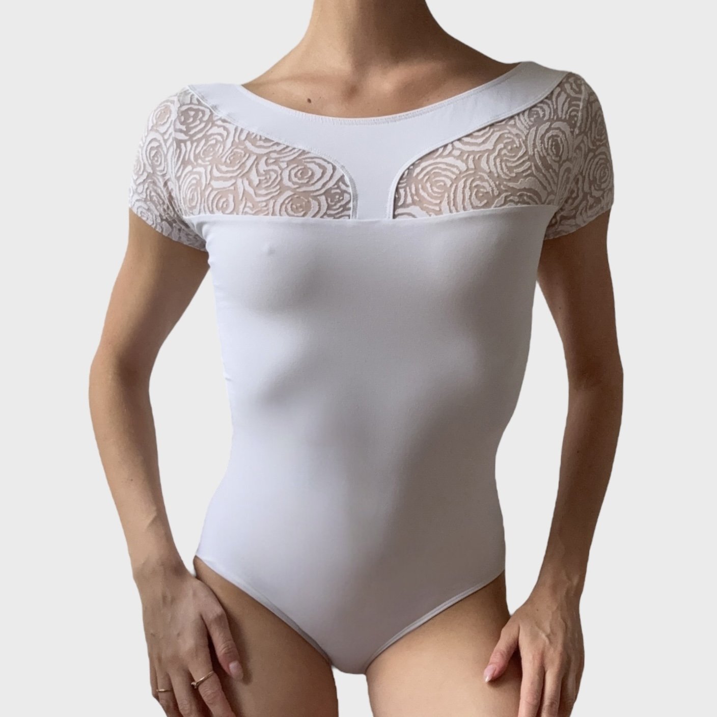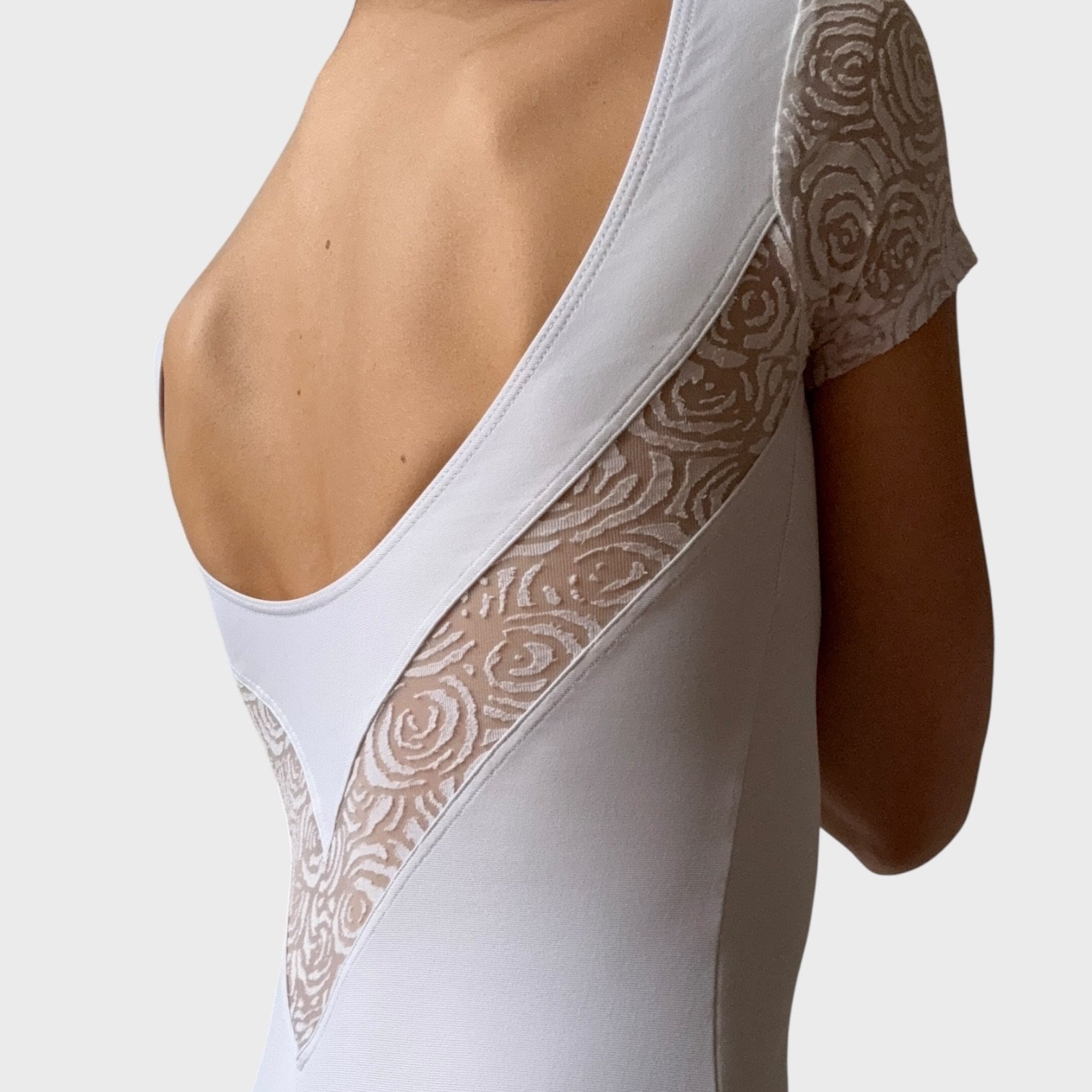 WearMoi leotard in white with short sleeves and sheer lace mesh. Size M, great condition.