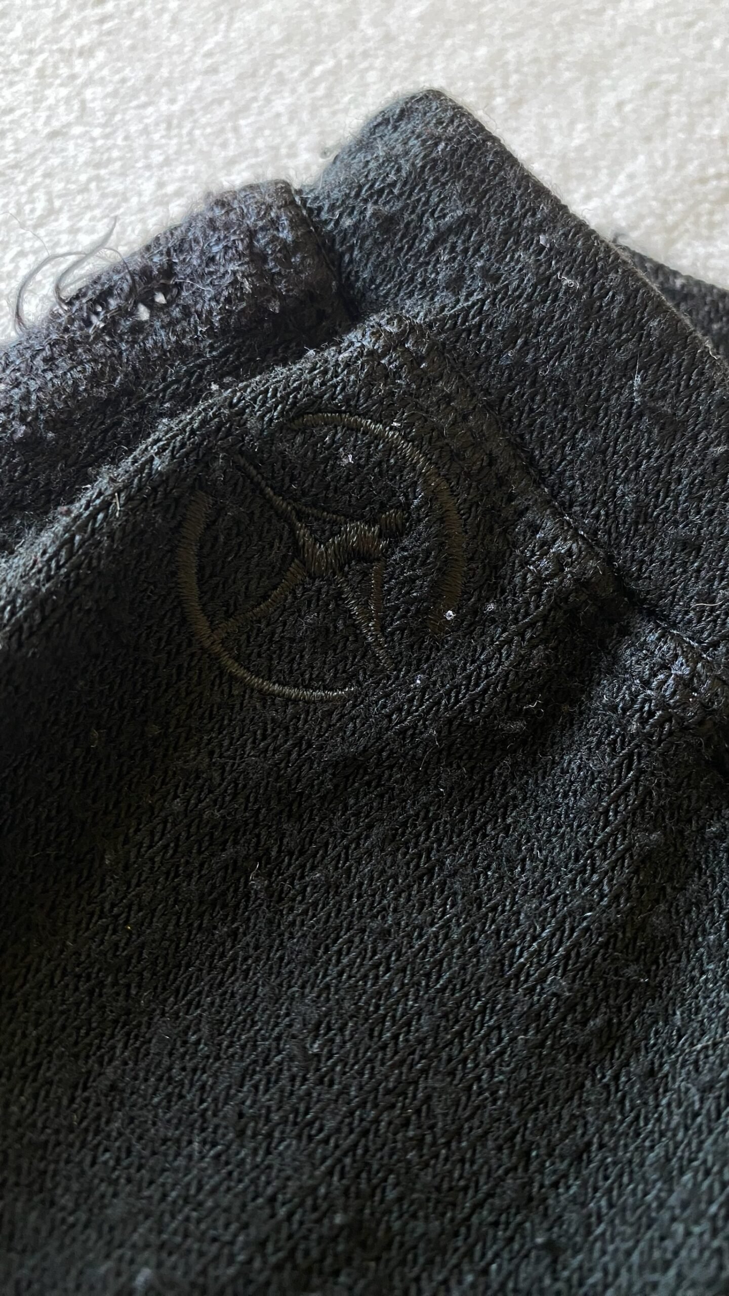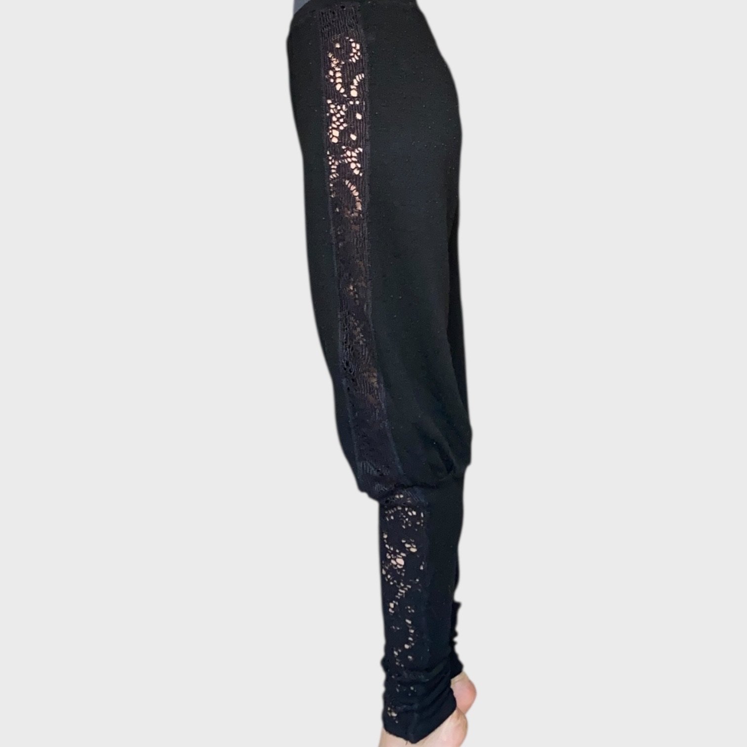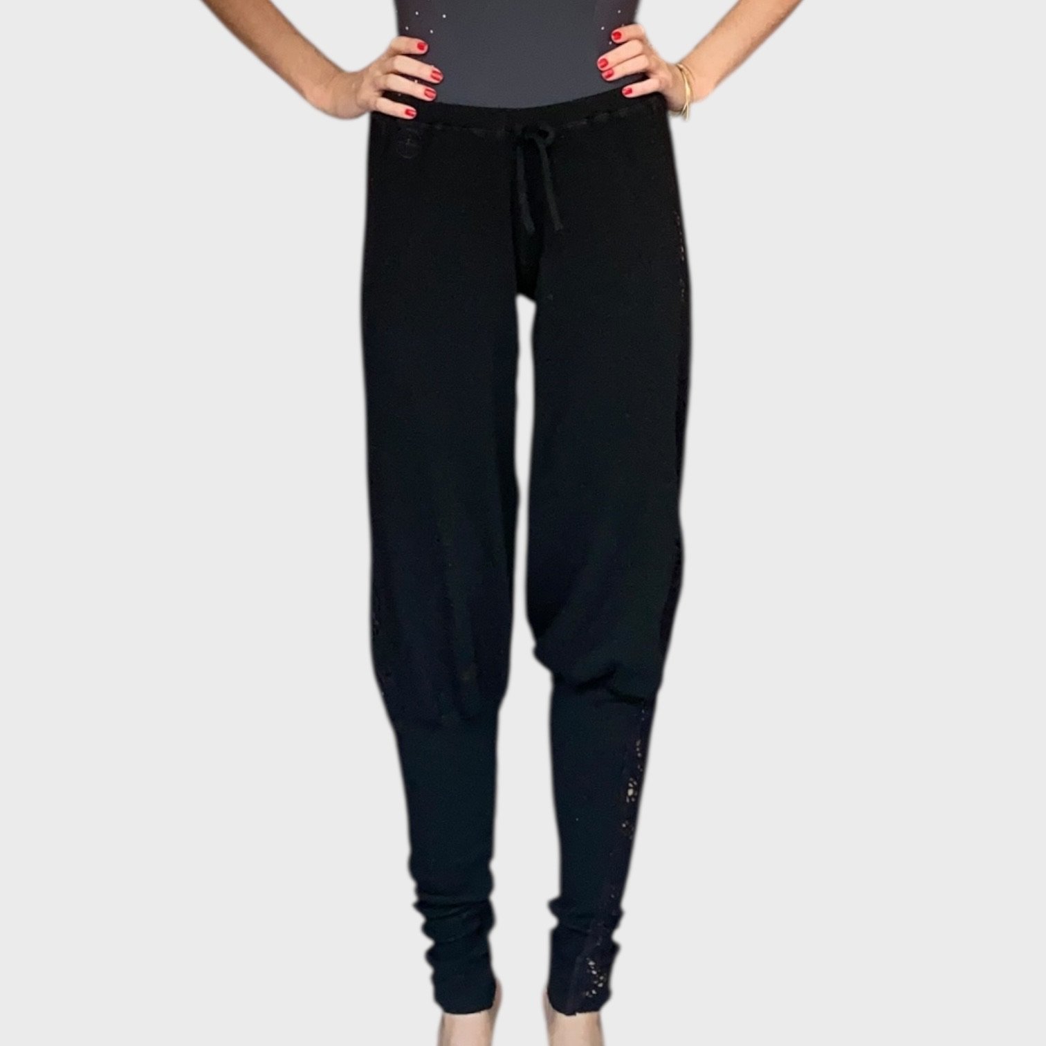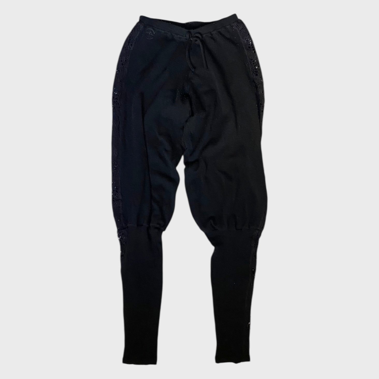 WearMoi knitted pants in black with lace side stripe. Size XS/S, fair condition – visible pilling on the knit.