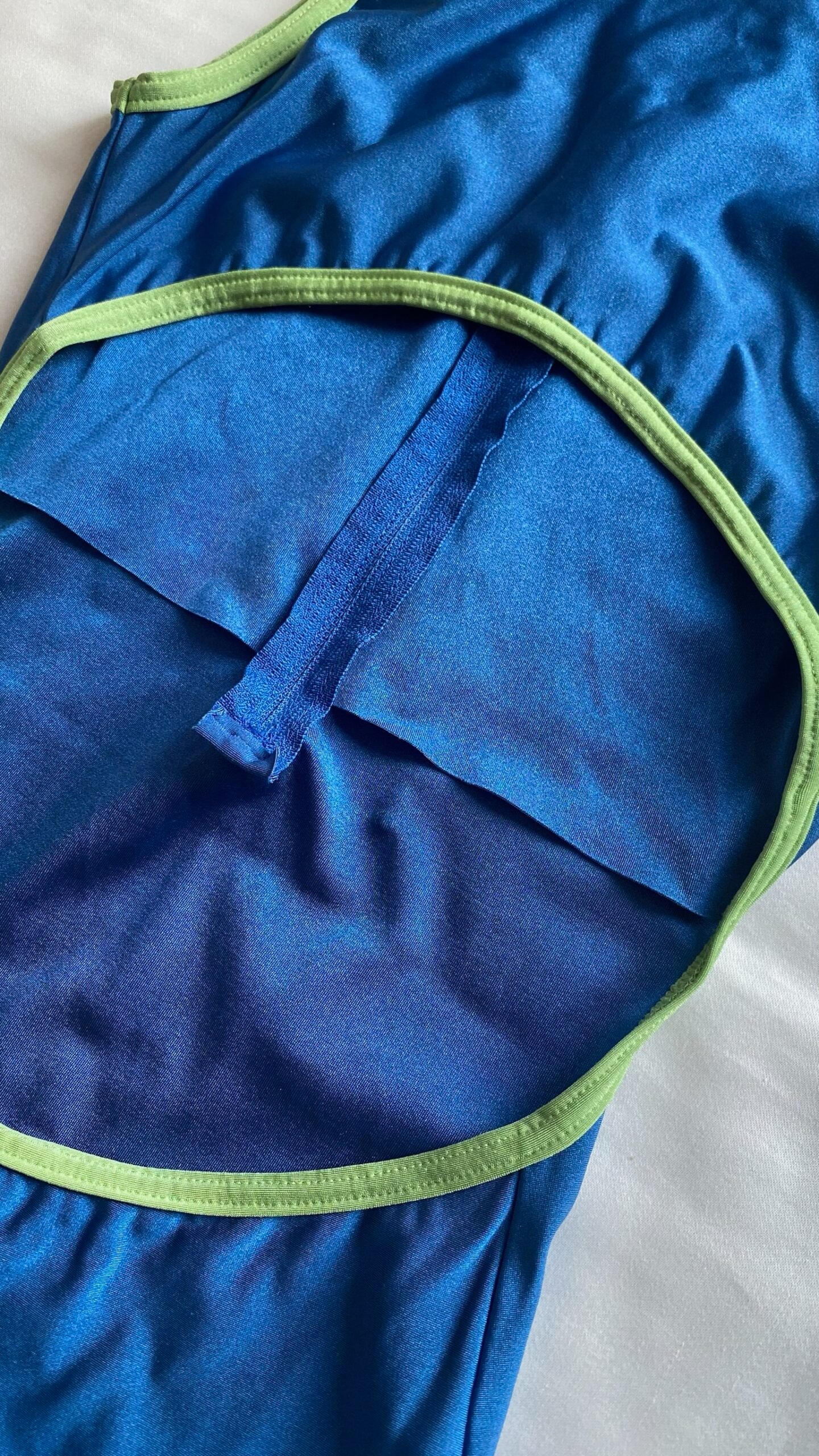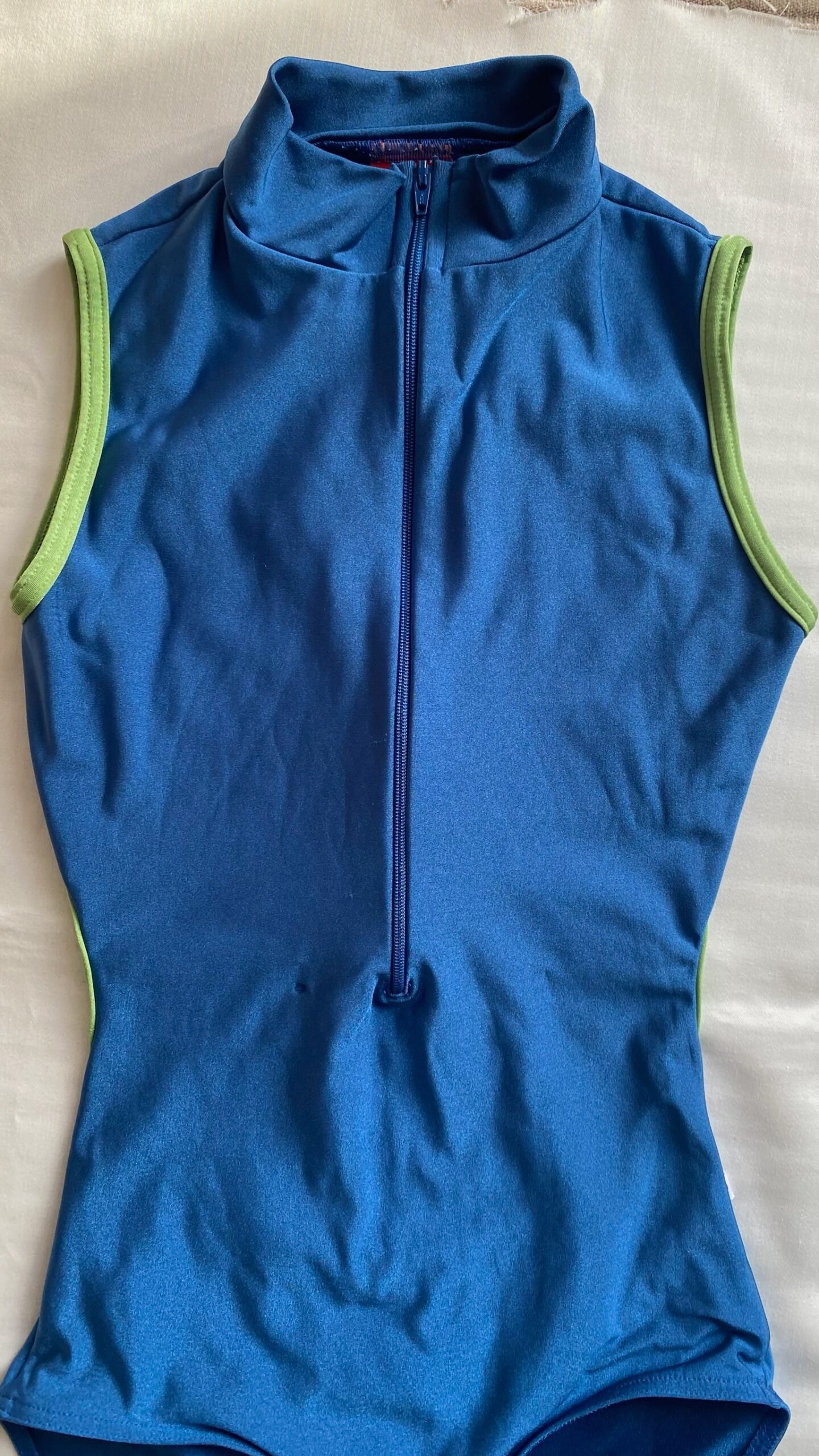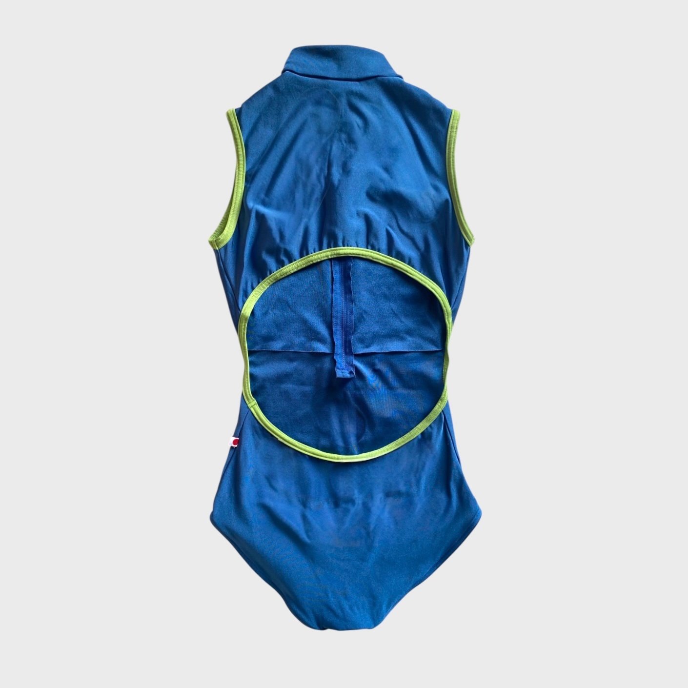Yumiko Charlotte leotard in blue nylon with green trim and bust panel lining. Size S, fair condition – small jet glue stain next to the zipper.