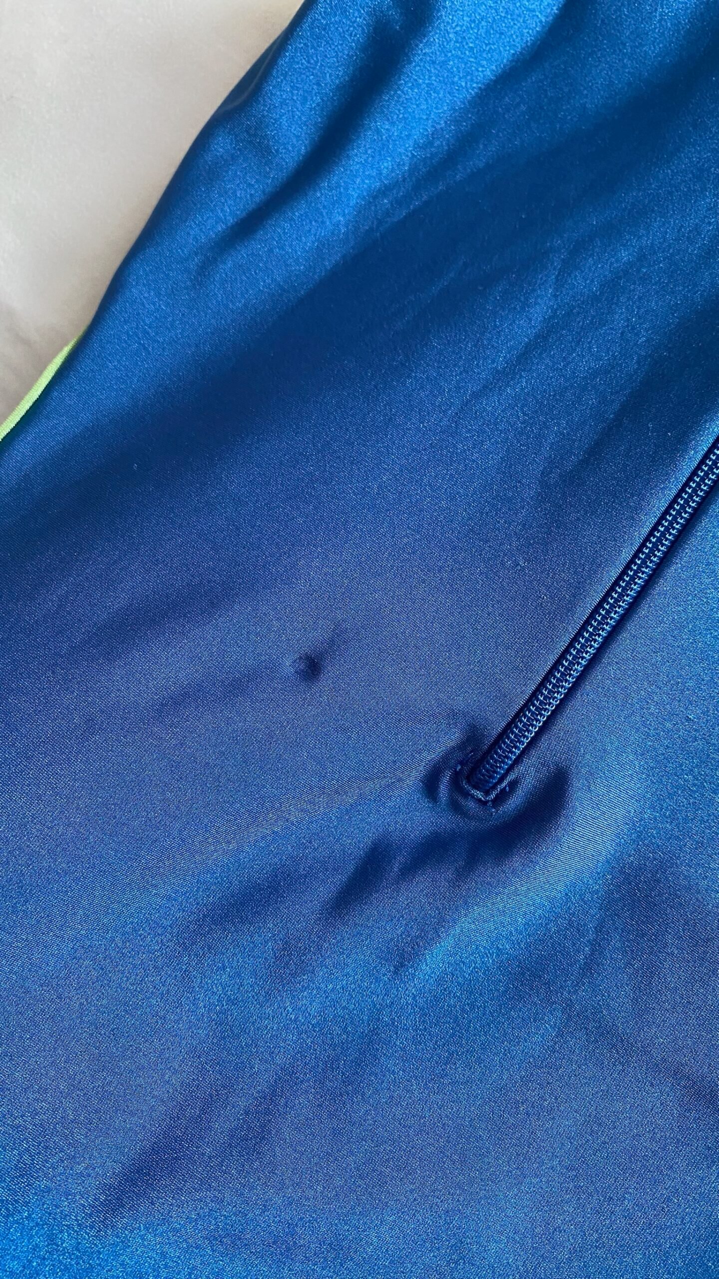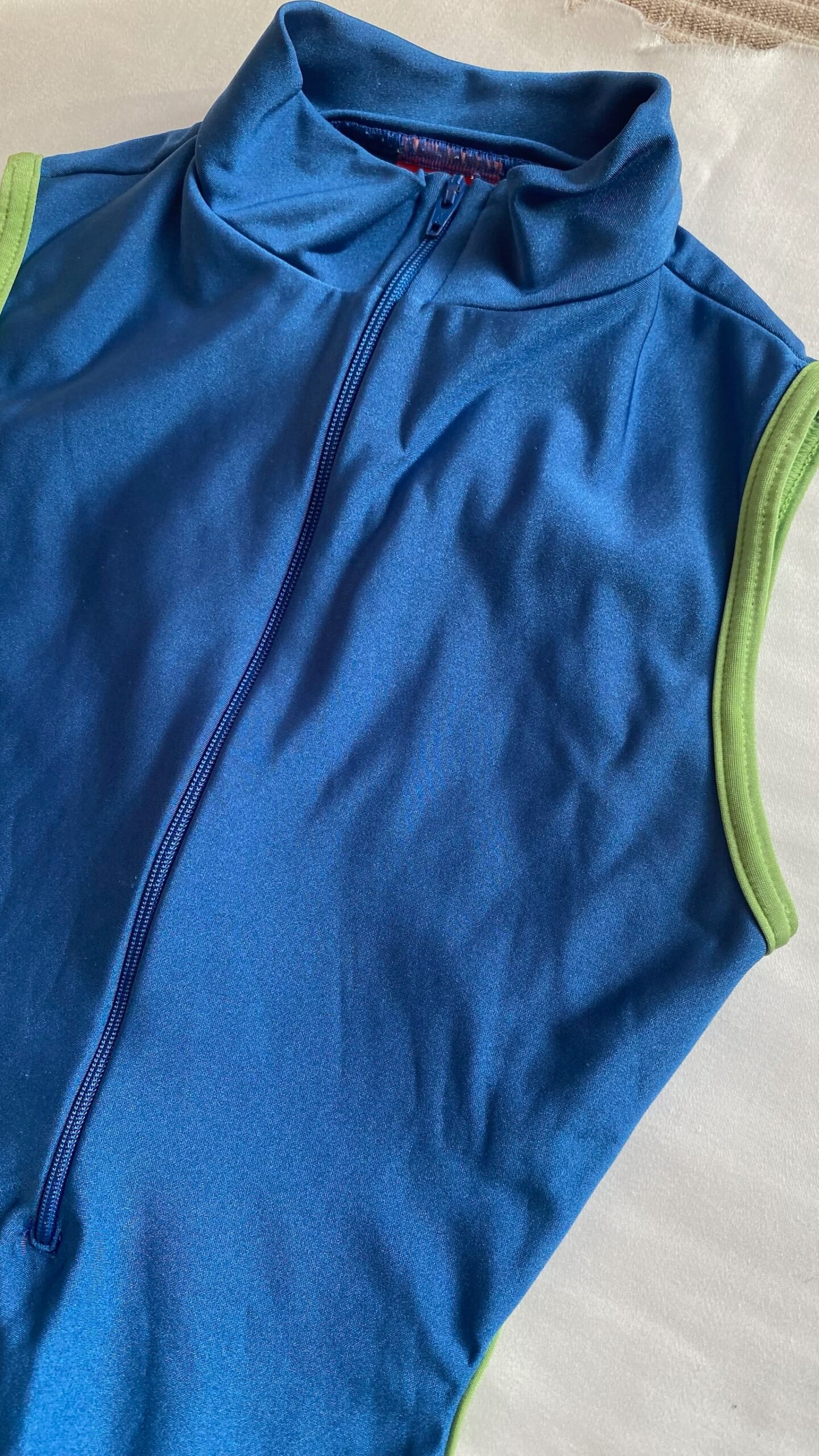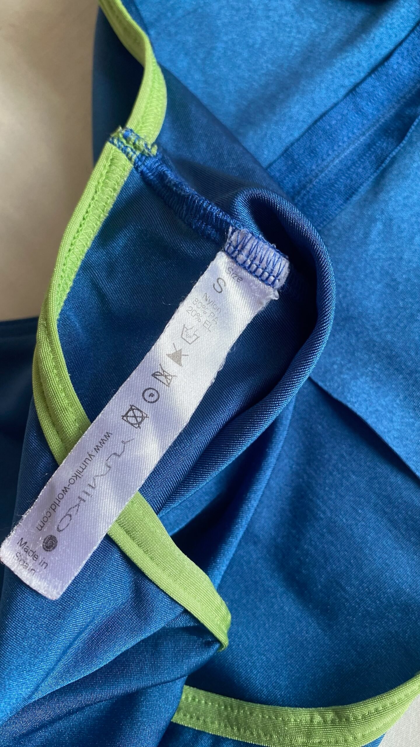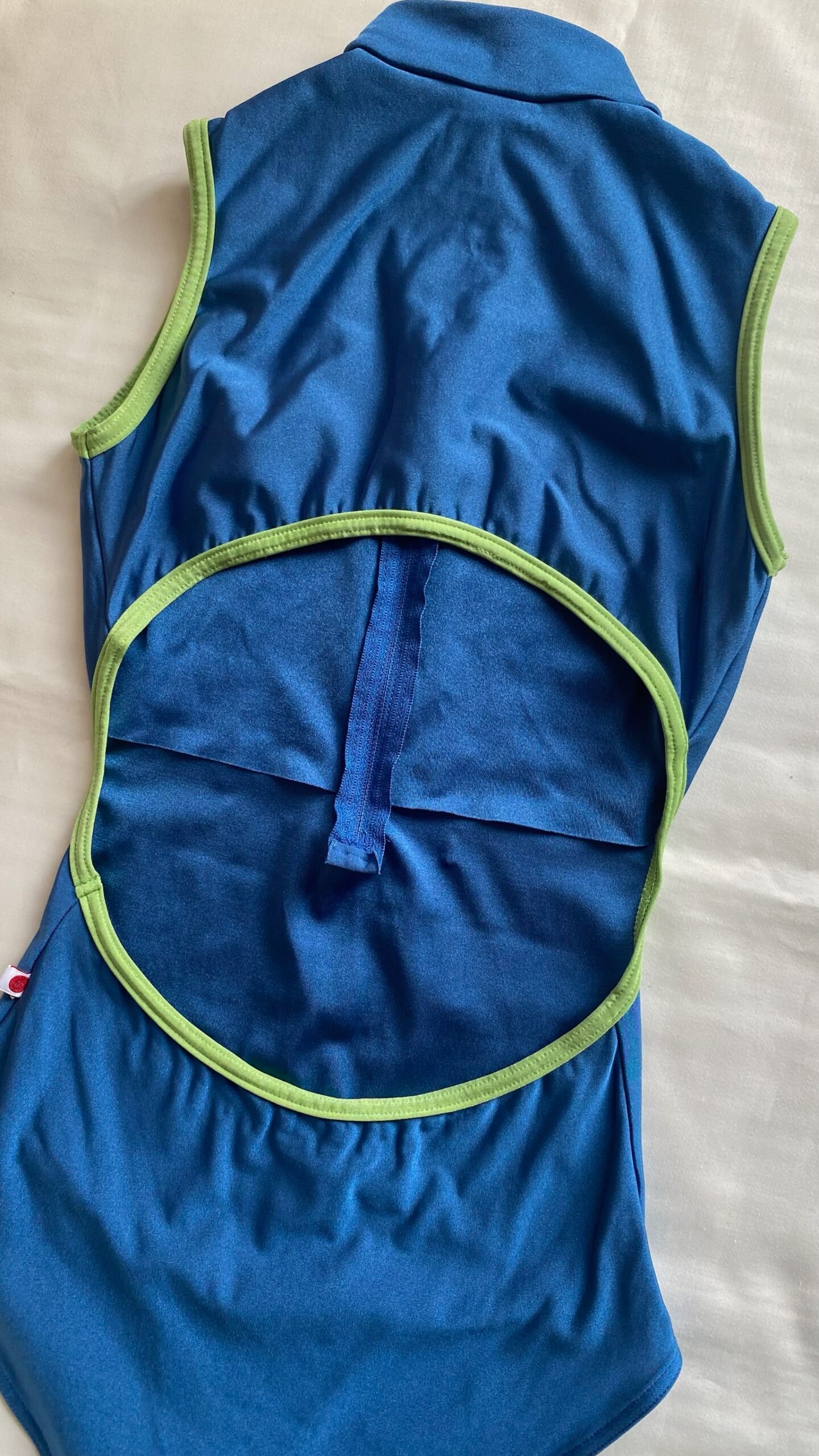 Yumiko Charlotte leotard in blue nylon with green trim and bust panel lining. Size S, fair condition – small jet glue stain next to the zipper.