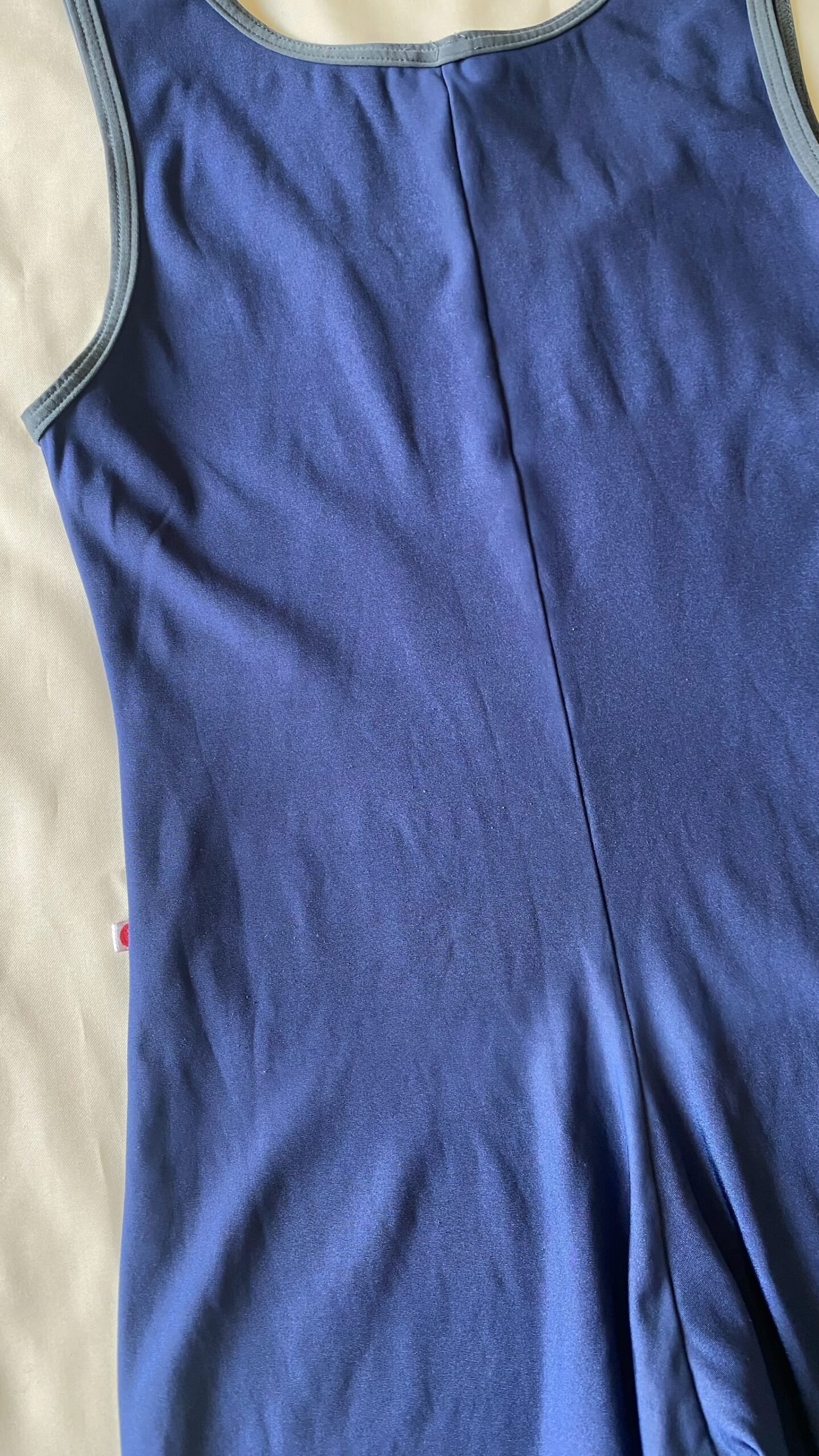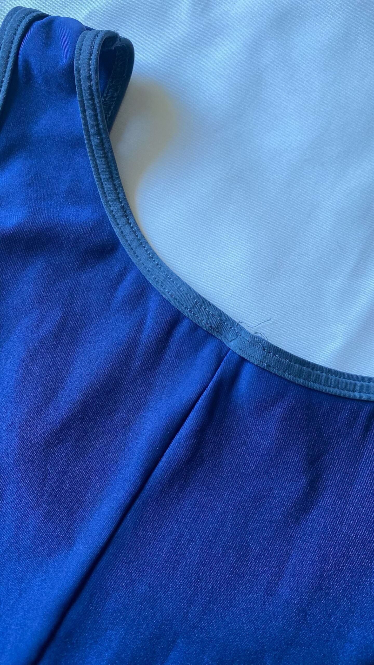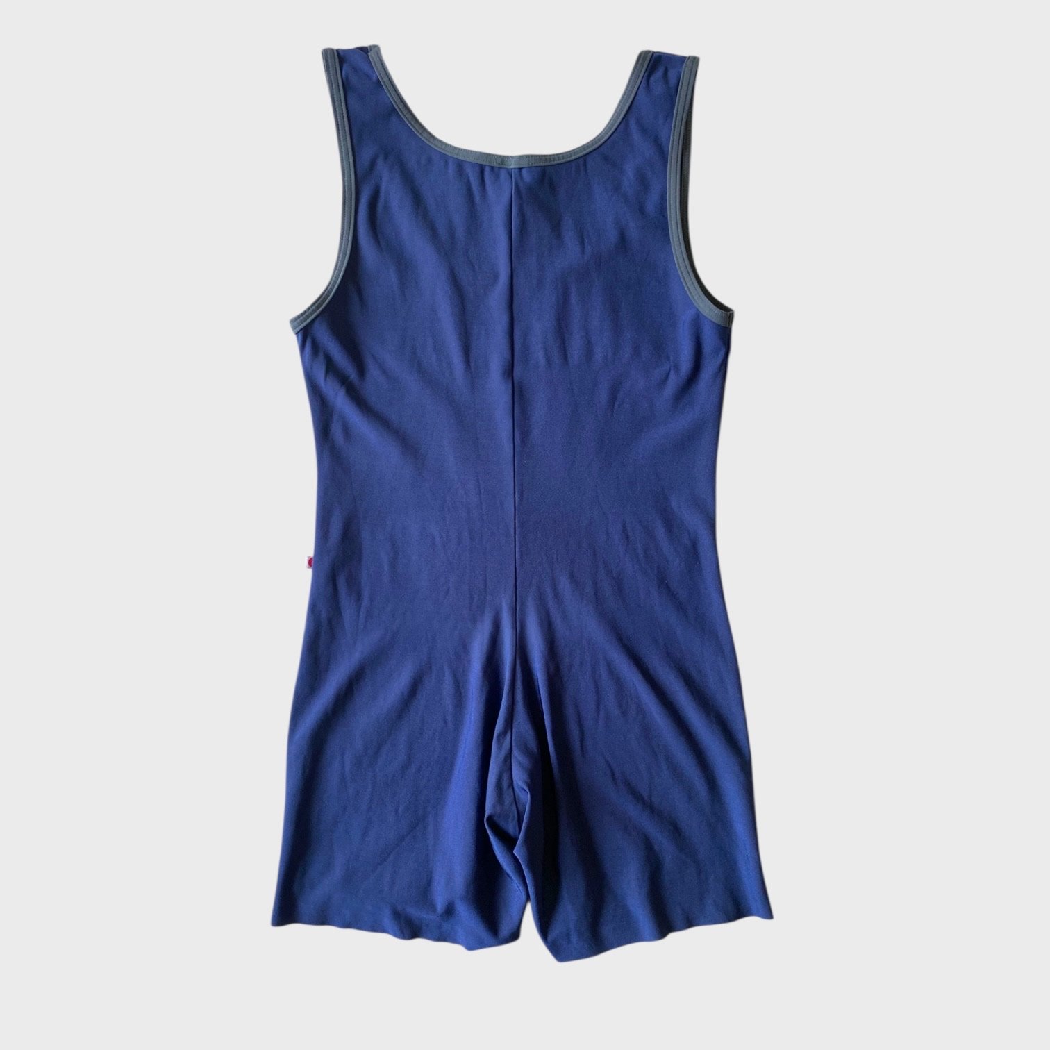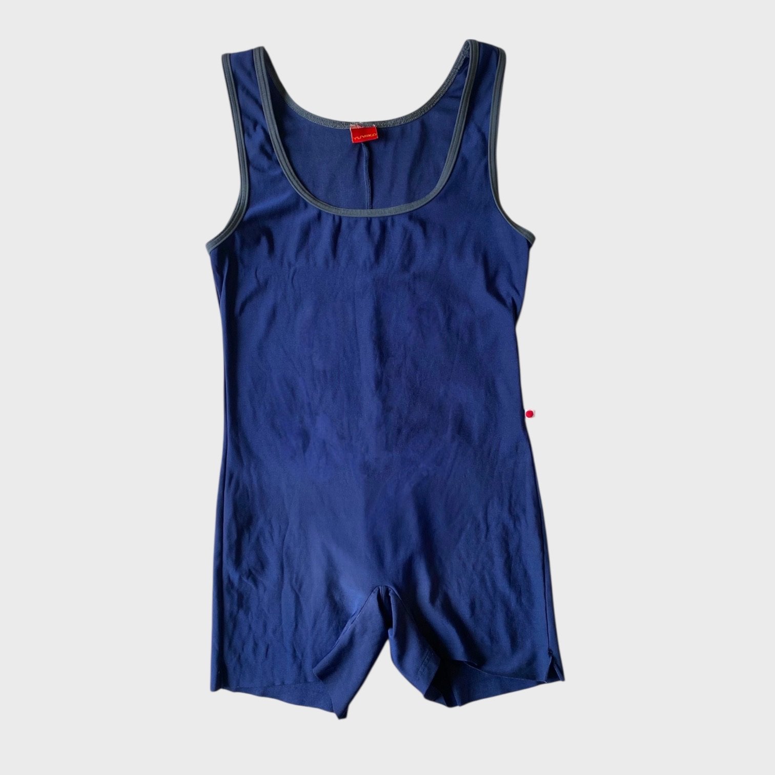 Yumiko Jahn biketard in blue nylon. Size M, fair condition – the seam on the legs has come undone; visible pilling in the waist area; small defect on the trim at the back.