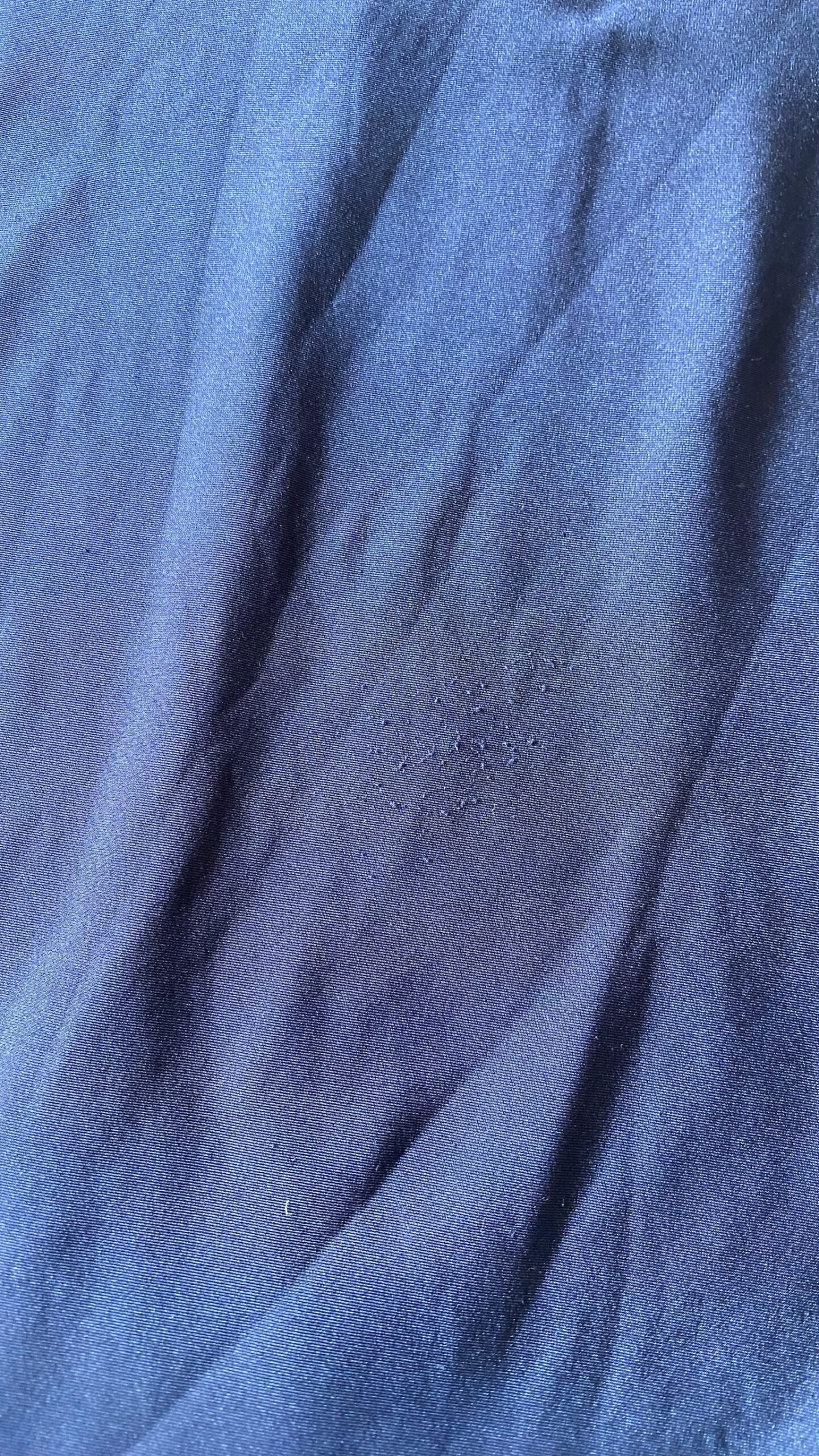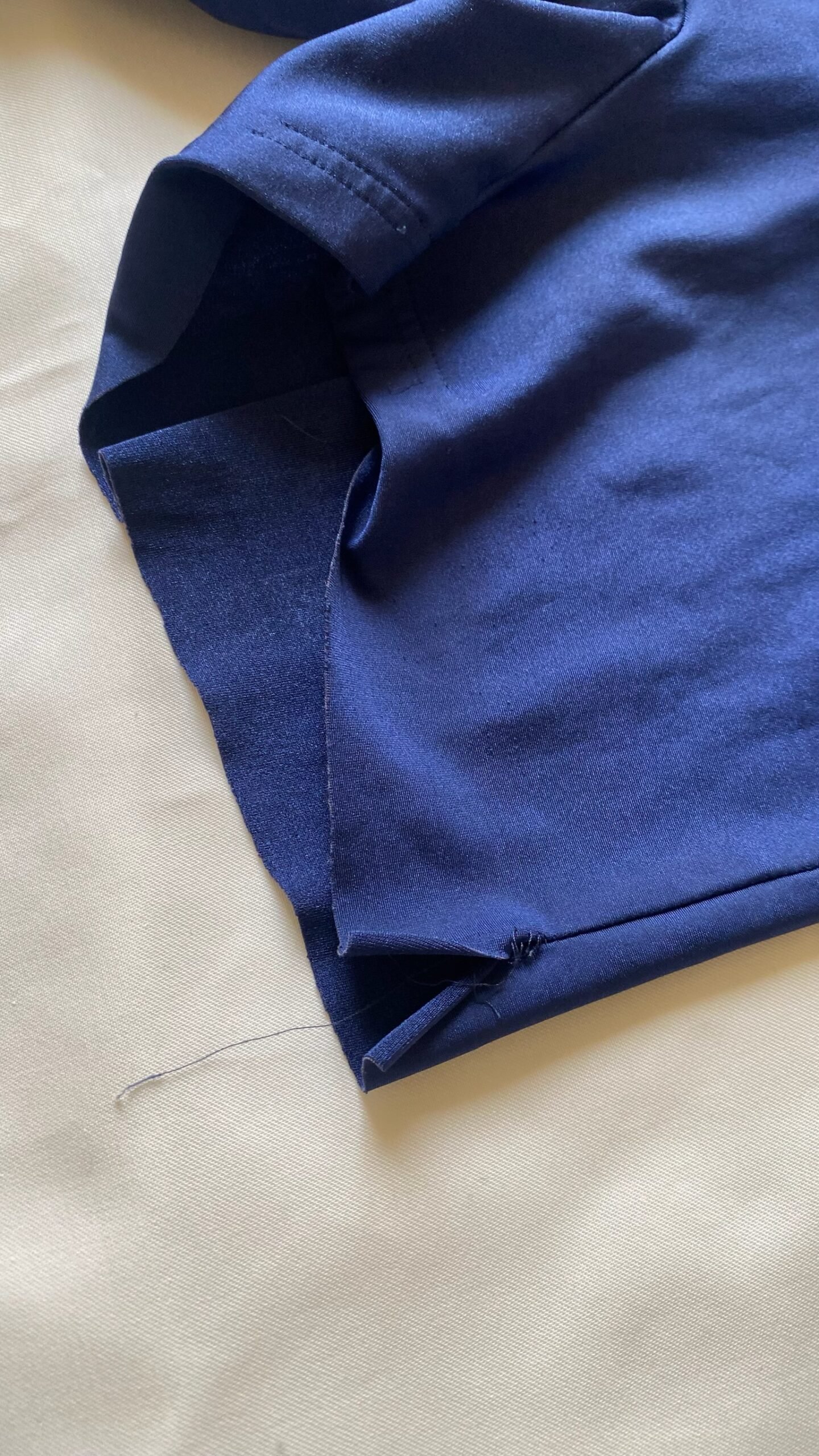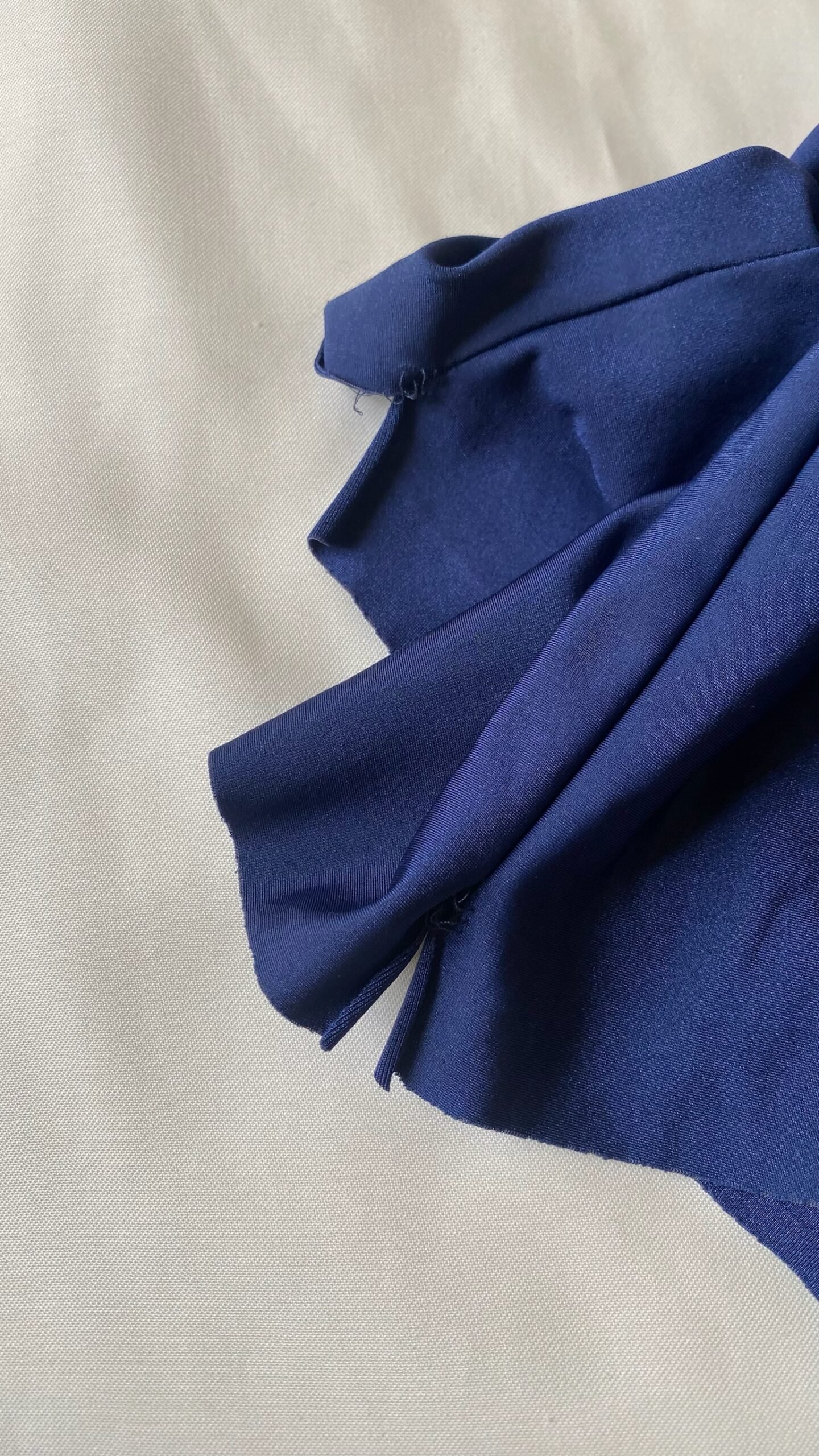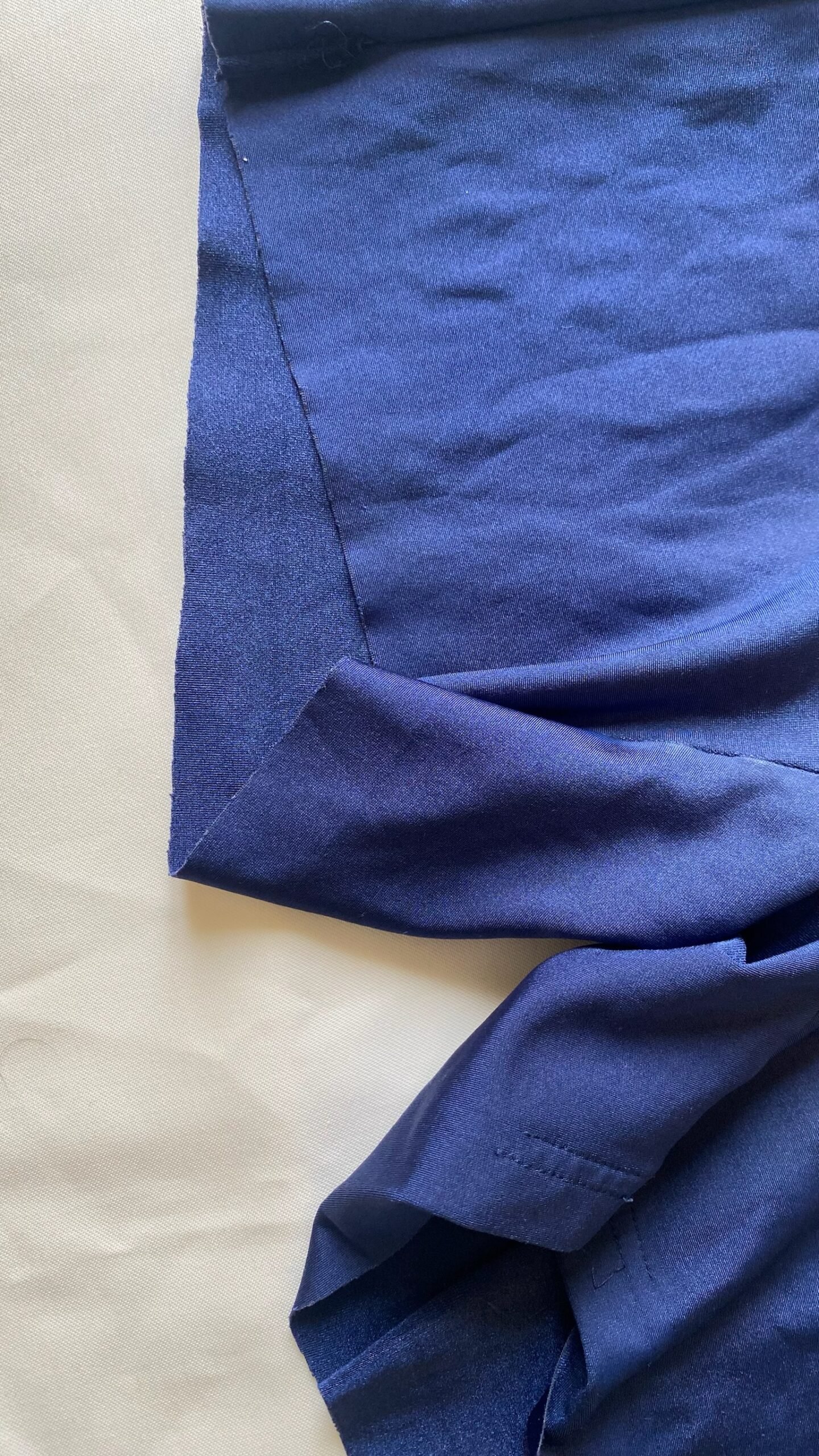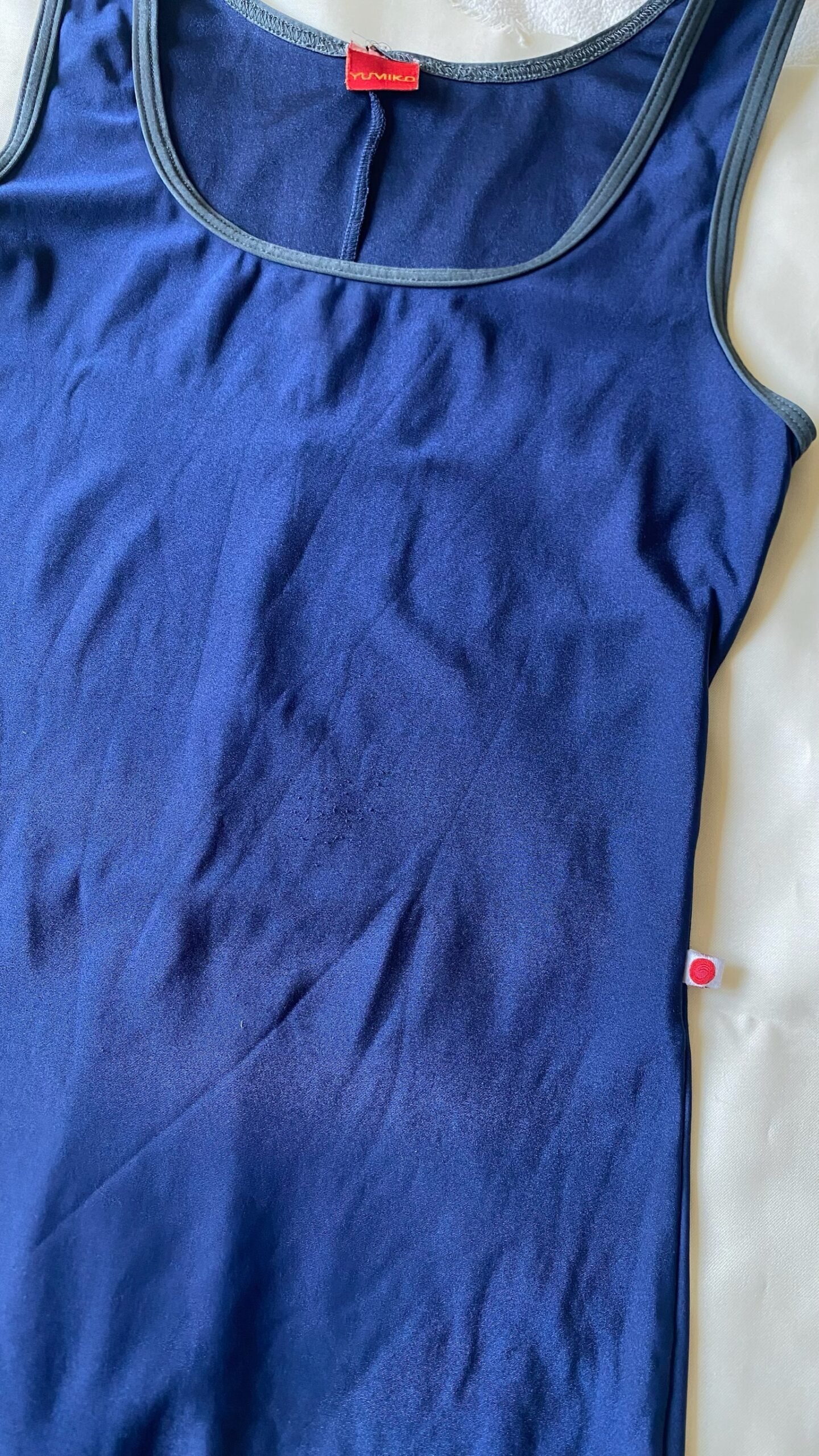 Yumiko Jahn biketard in blue nylon. Size M, fair condition – the seam on the legs has come undone; visible pilling in the waist area; small defect on the trim at the back.