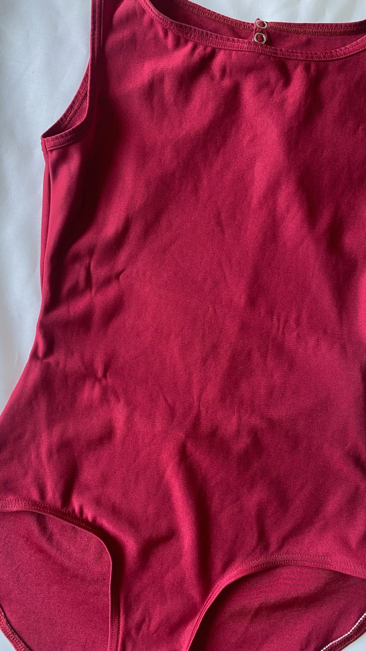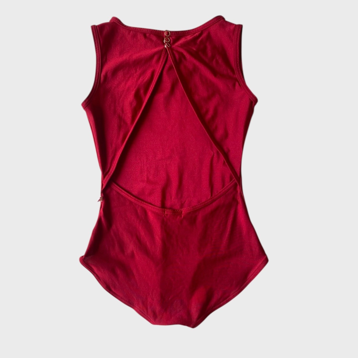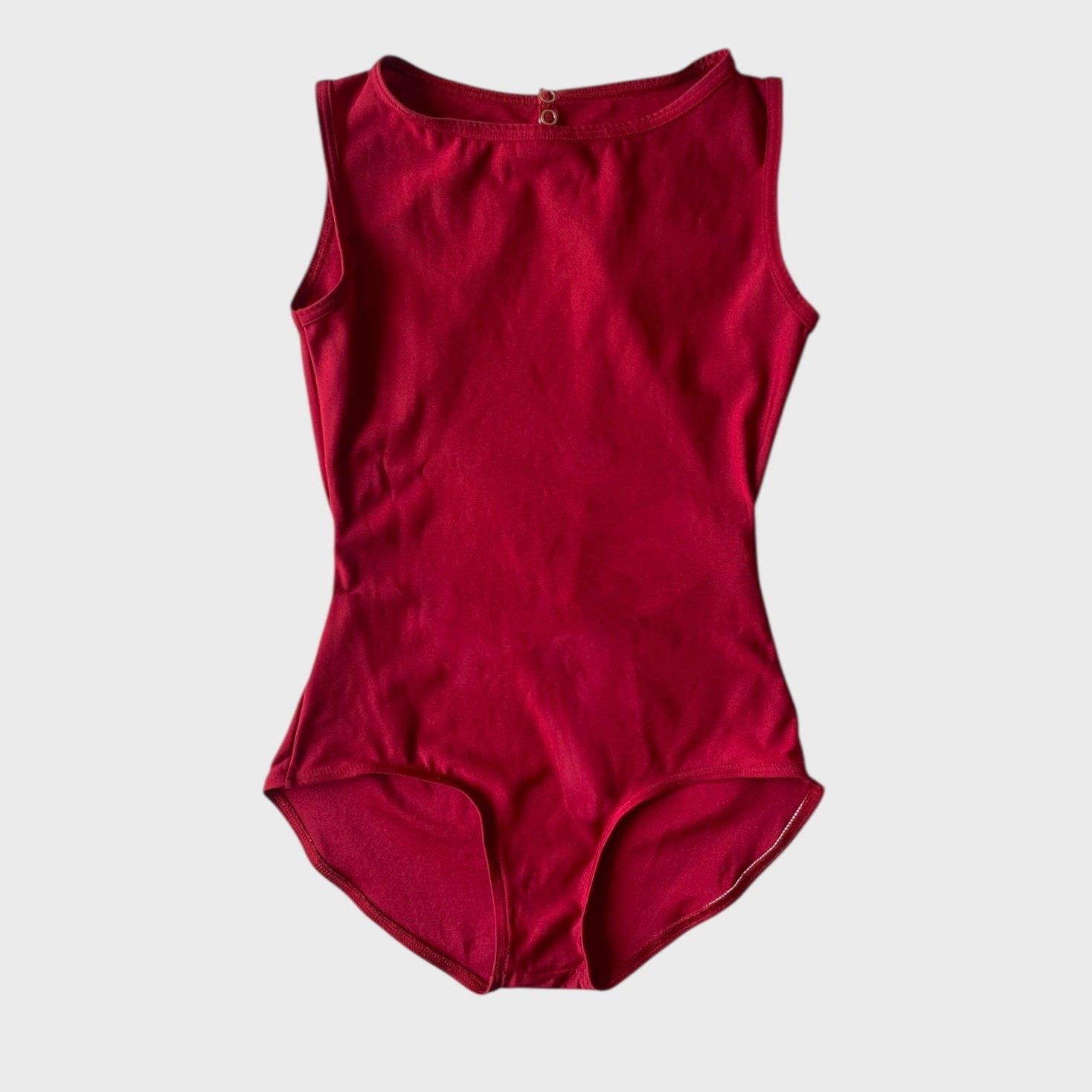 Yumiko Larissa leotard in red nylon with no lining. Size M, fair condition – the seam under the label has been hand repaired.