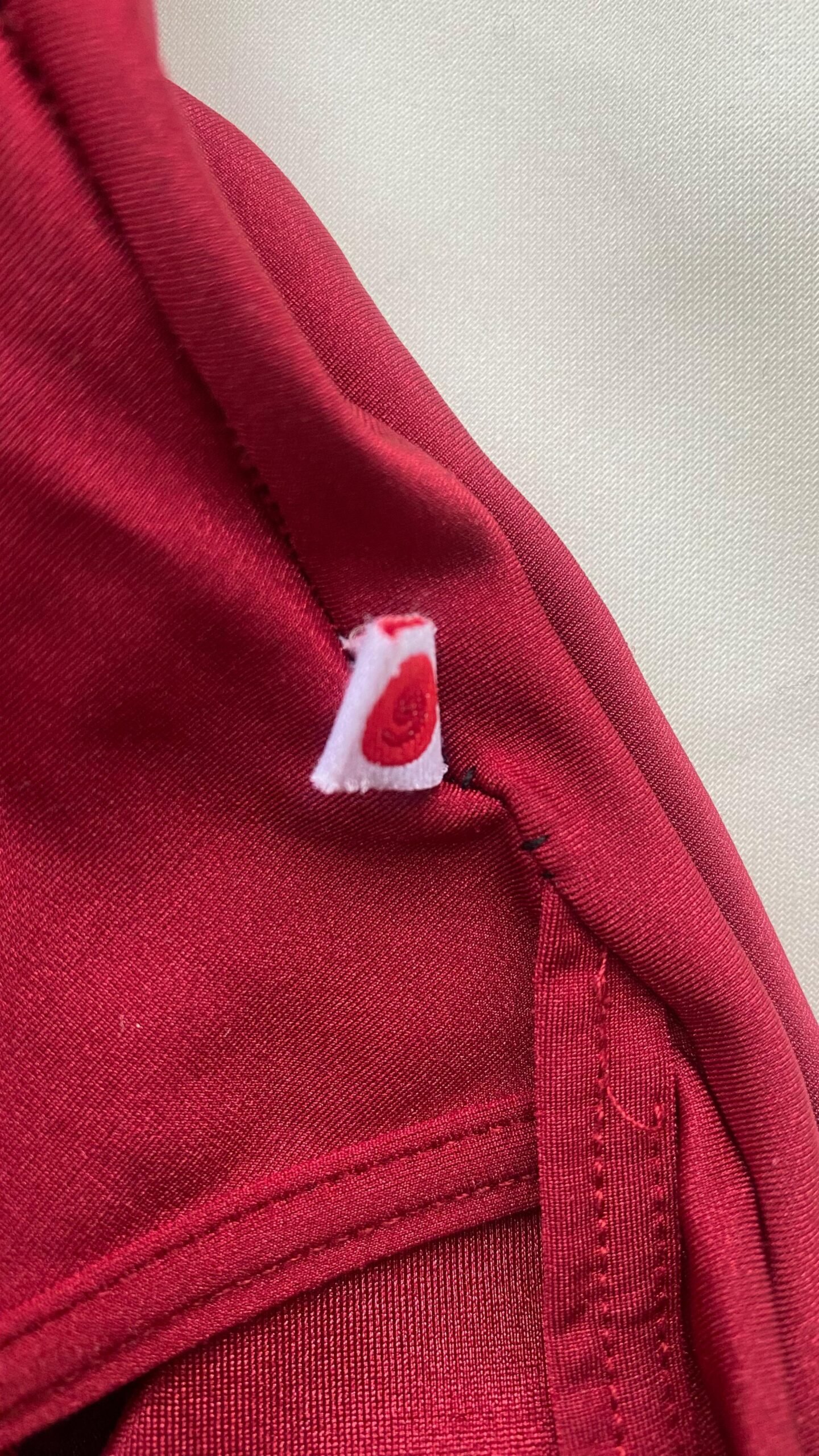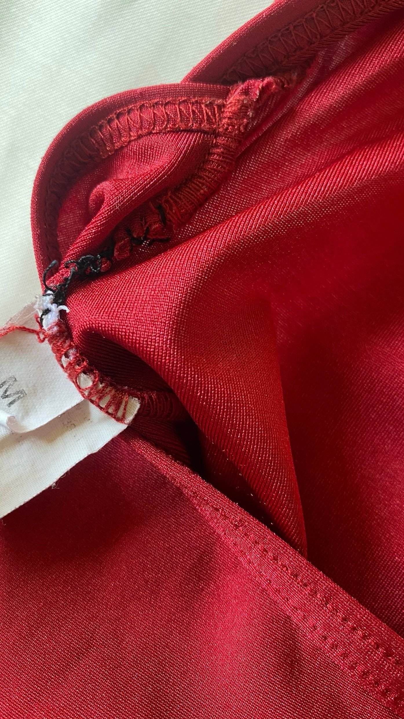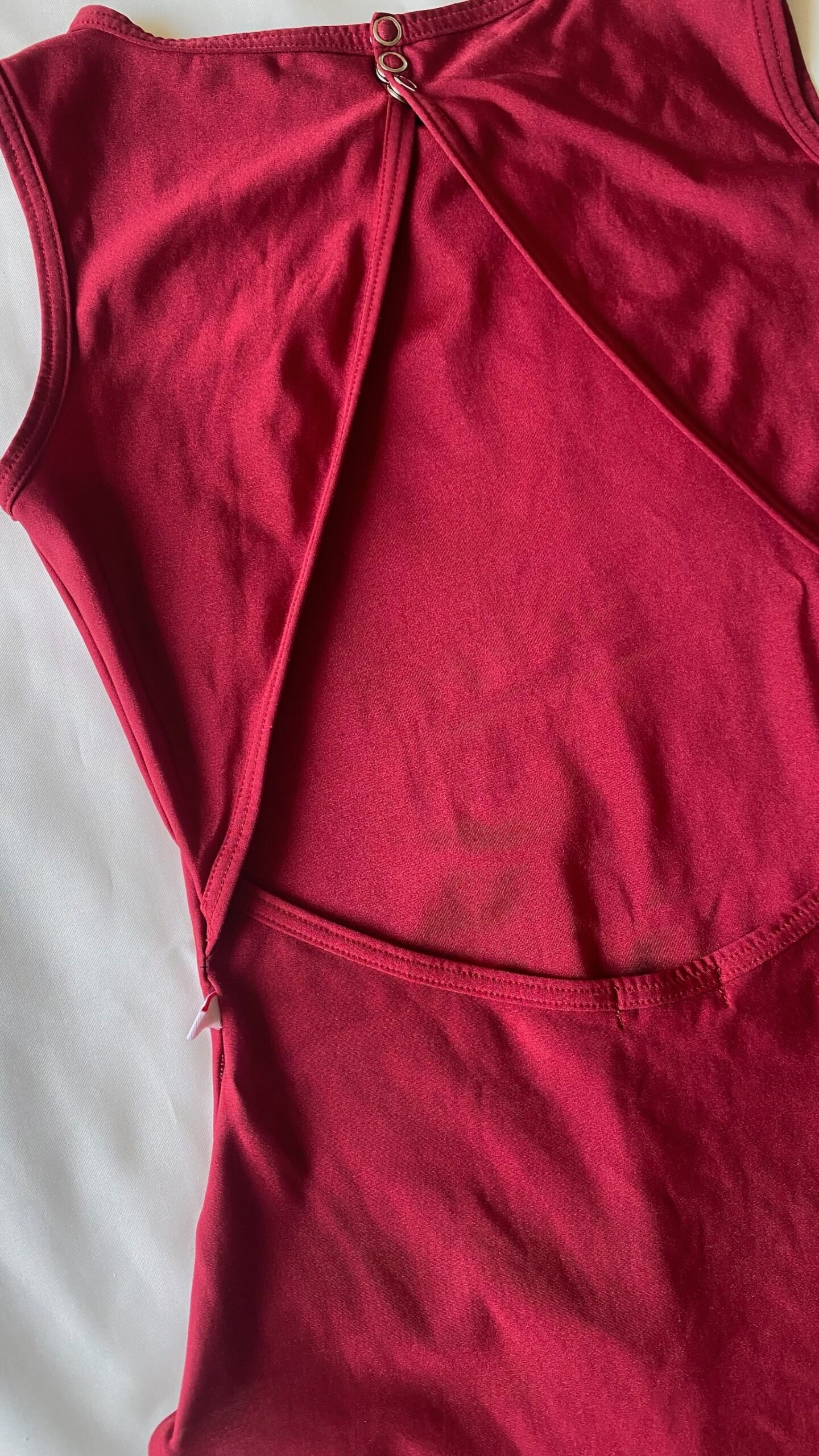 Yumiko Larissa leotard in red nylon with no lining. Size M, fair condition – the seam under the label has been hand repaired.
