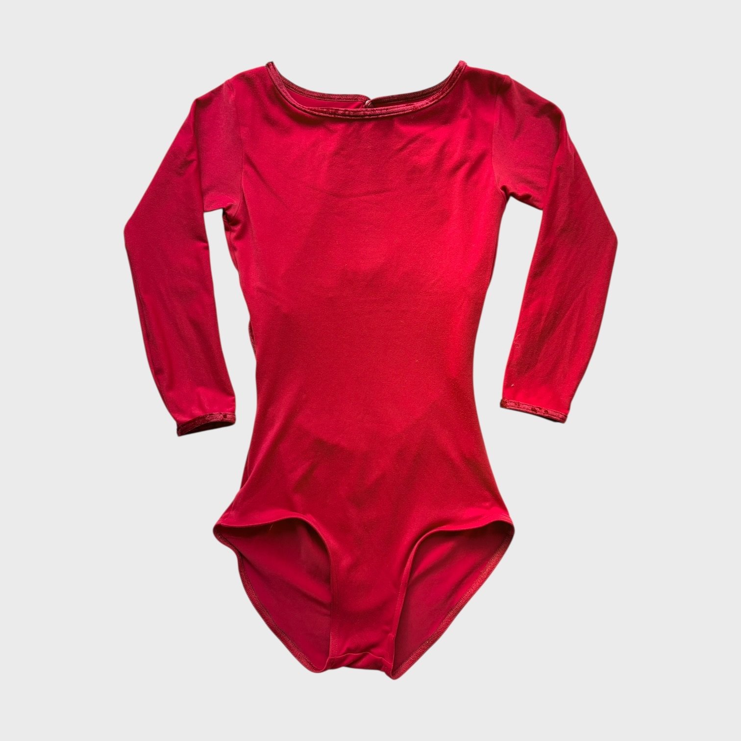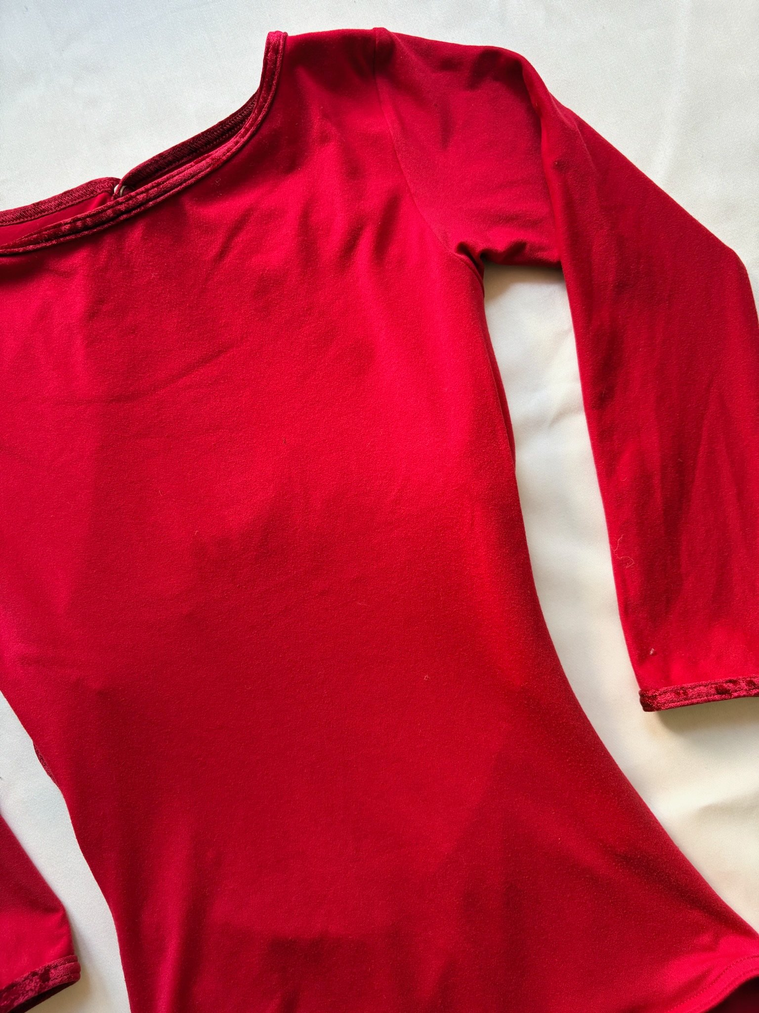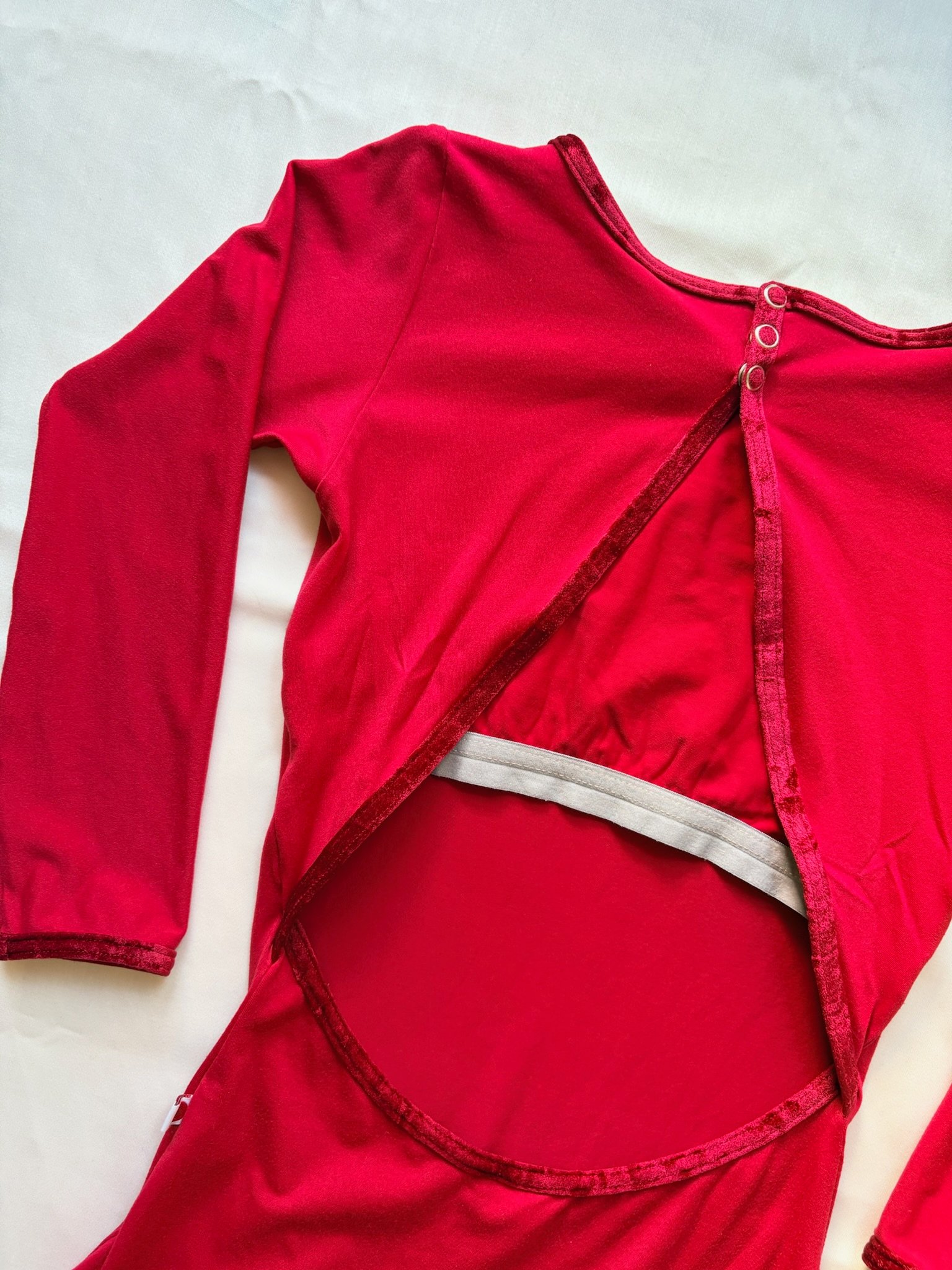 Yumiko Larissa leotard in red microfiber (discontinued fabric) with 3/4 sleeves and bust panel lining. Size M, great condition.
