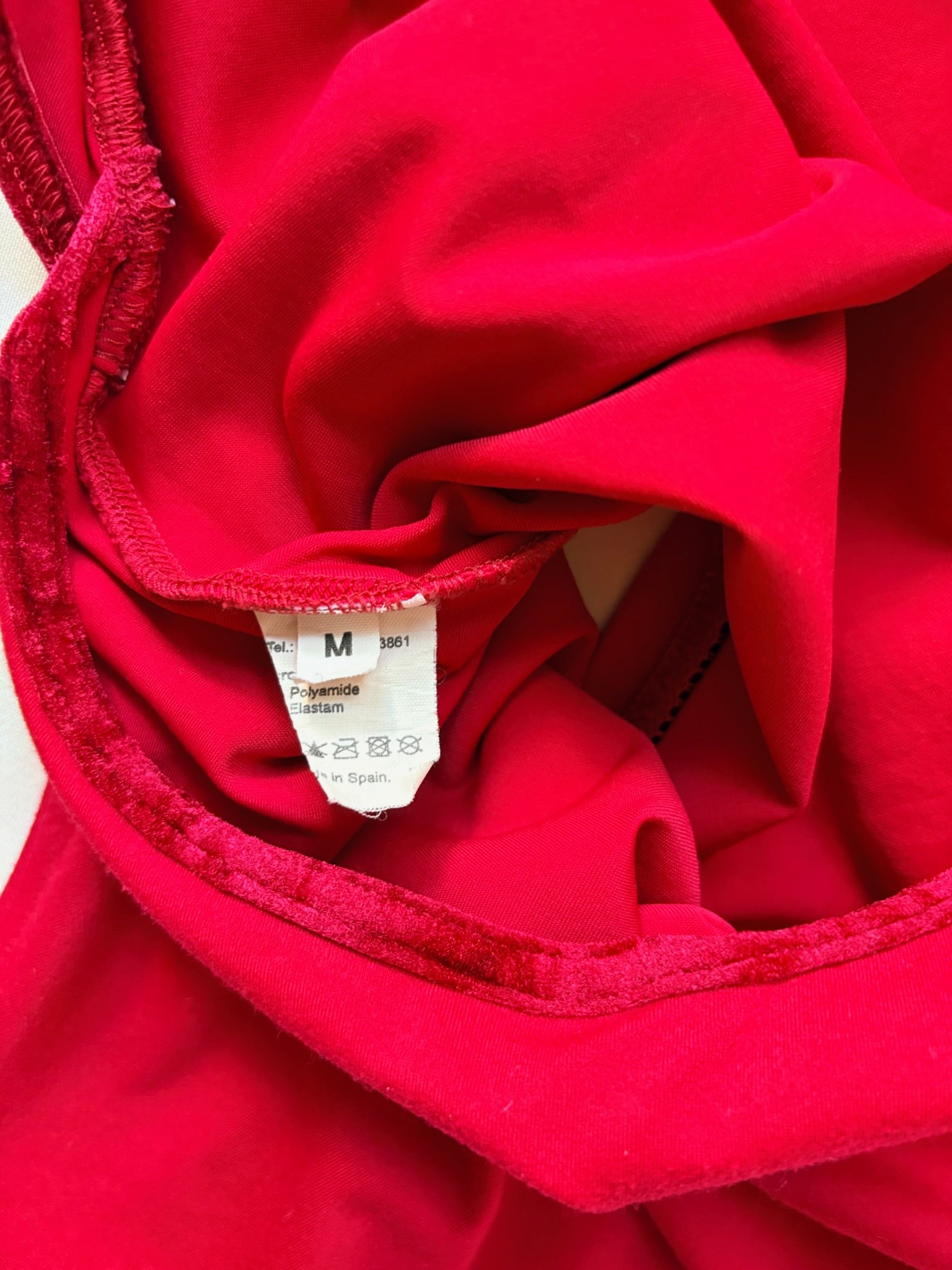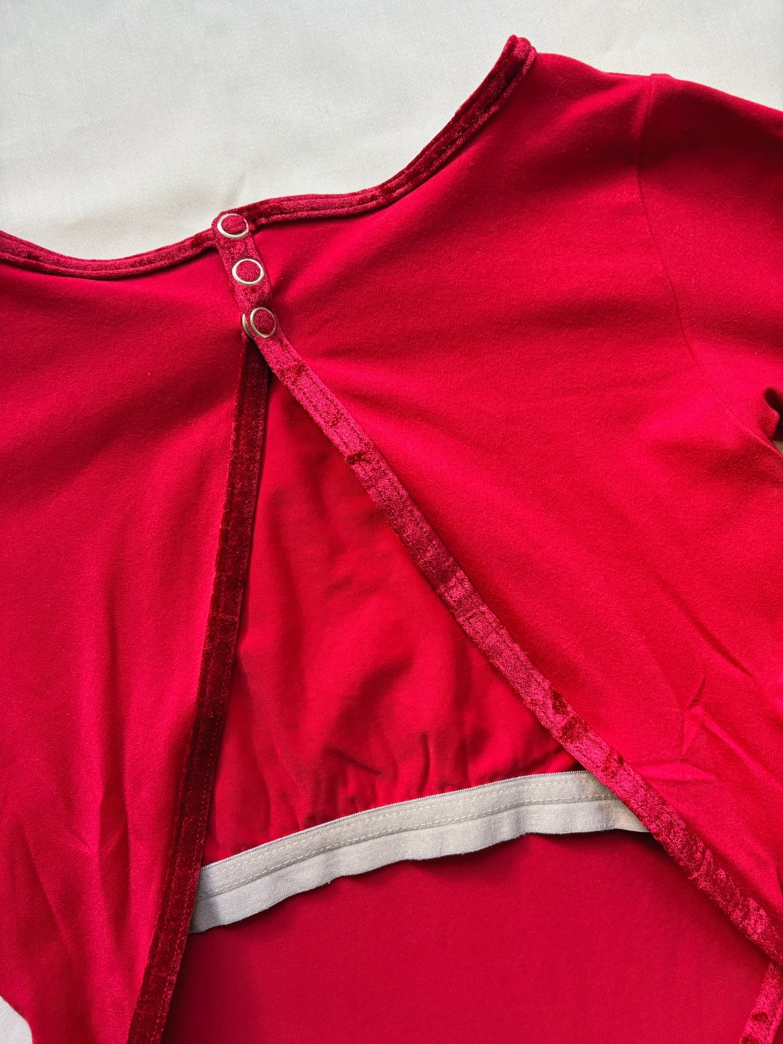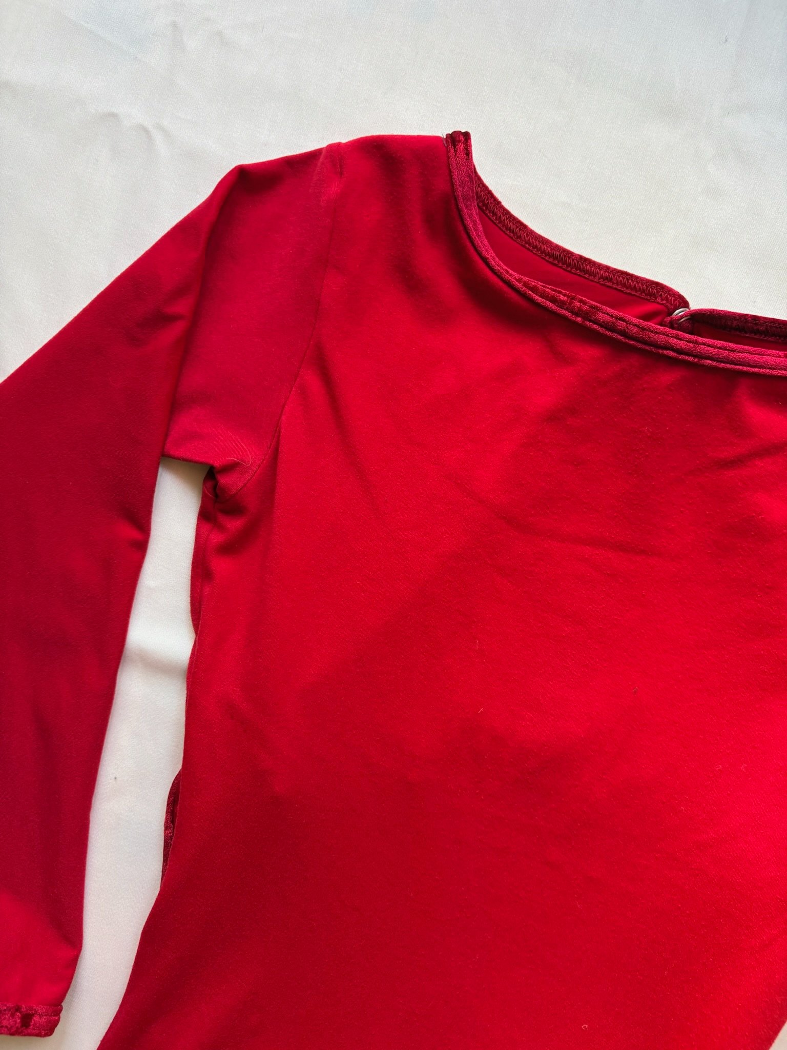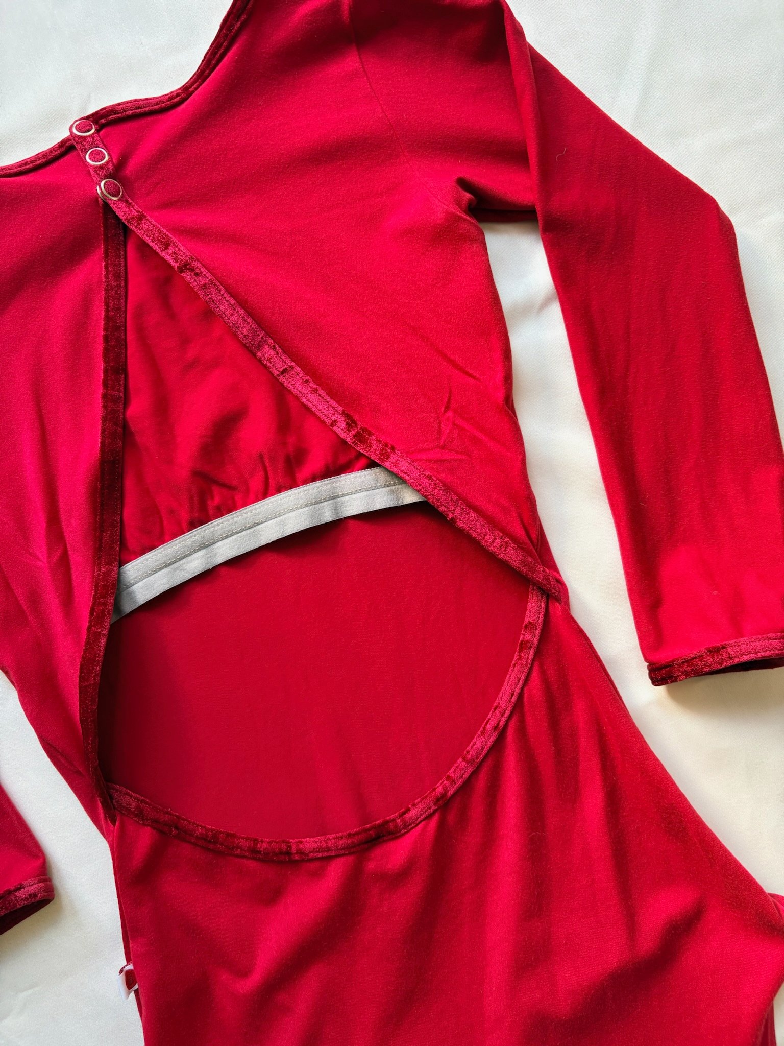 Yumiko Larissa leotard in red microfiber (discontinued fabric) with 3/4 sleeves and bust panel lining. Size M, great condition.