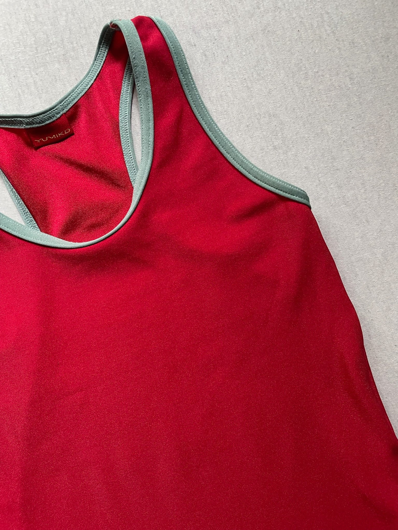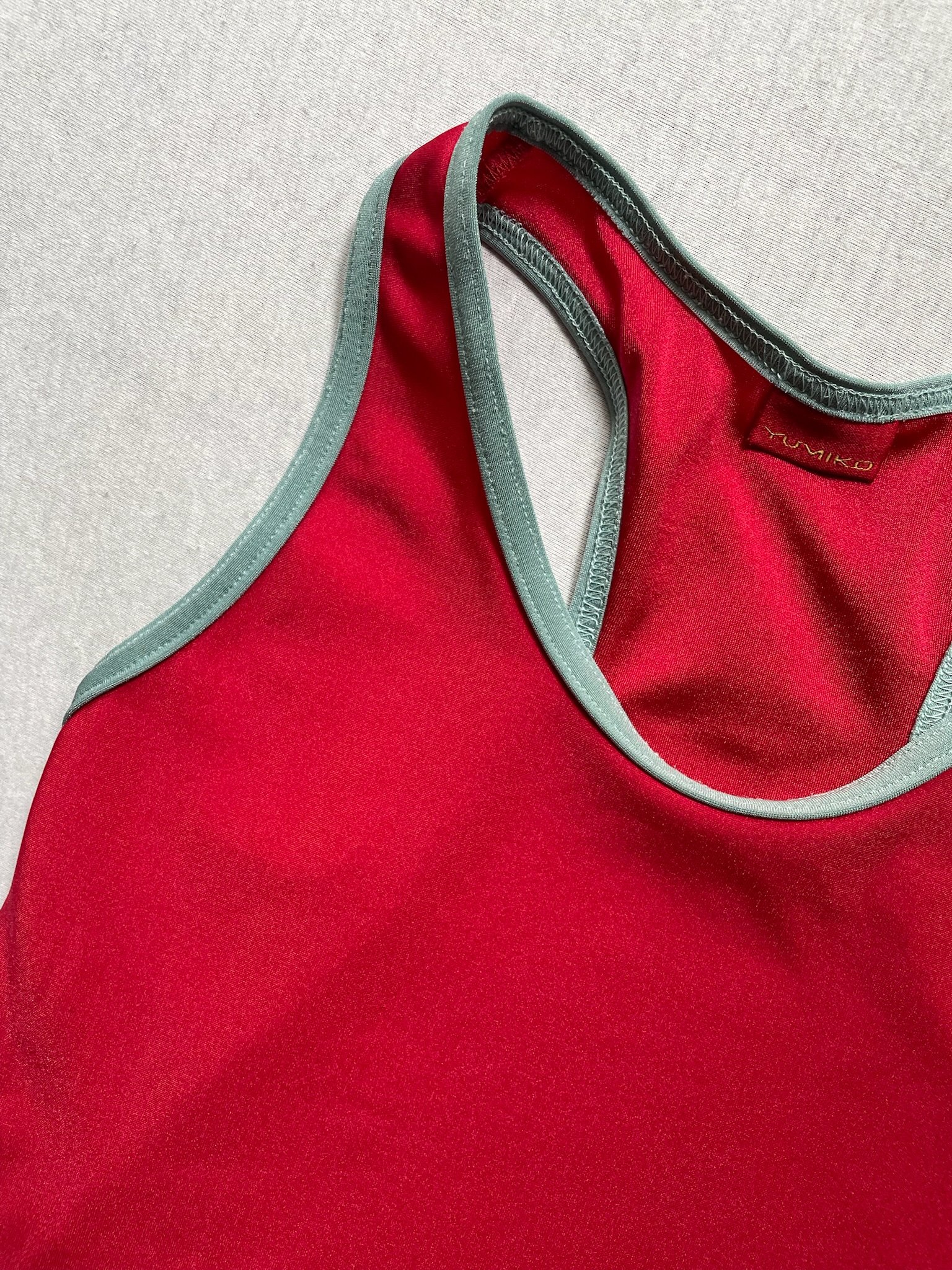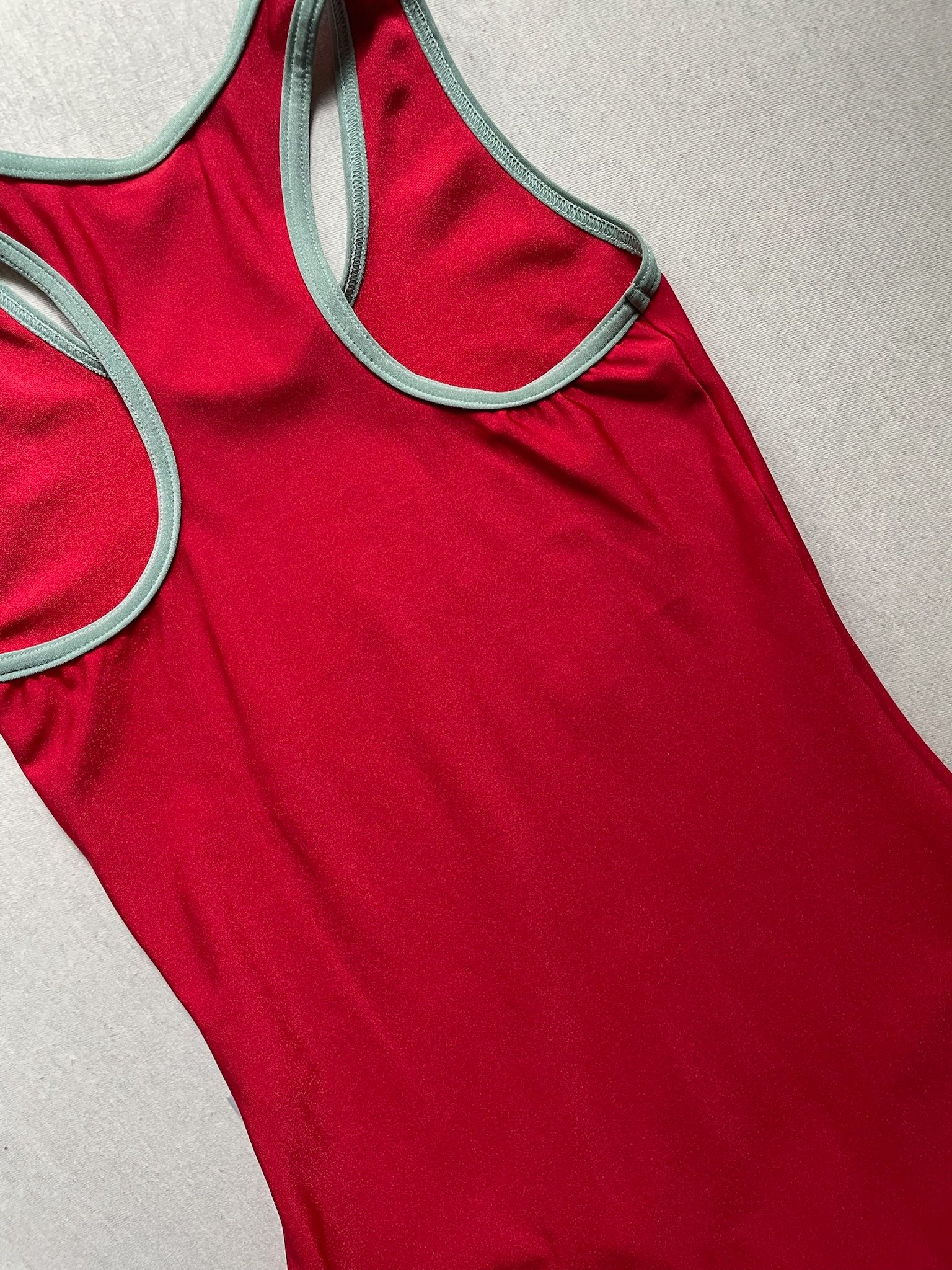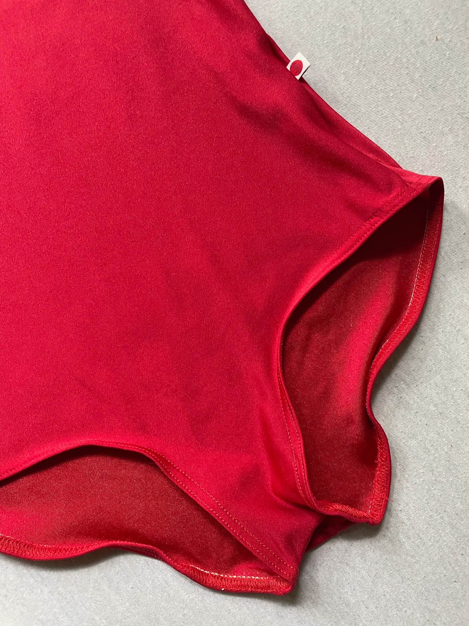 Yumiko Laura leotard in red nylon with light blue trim. Size M, fair condition – the elastics by the legs are slightly hardened.