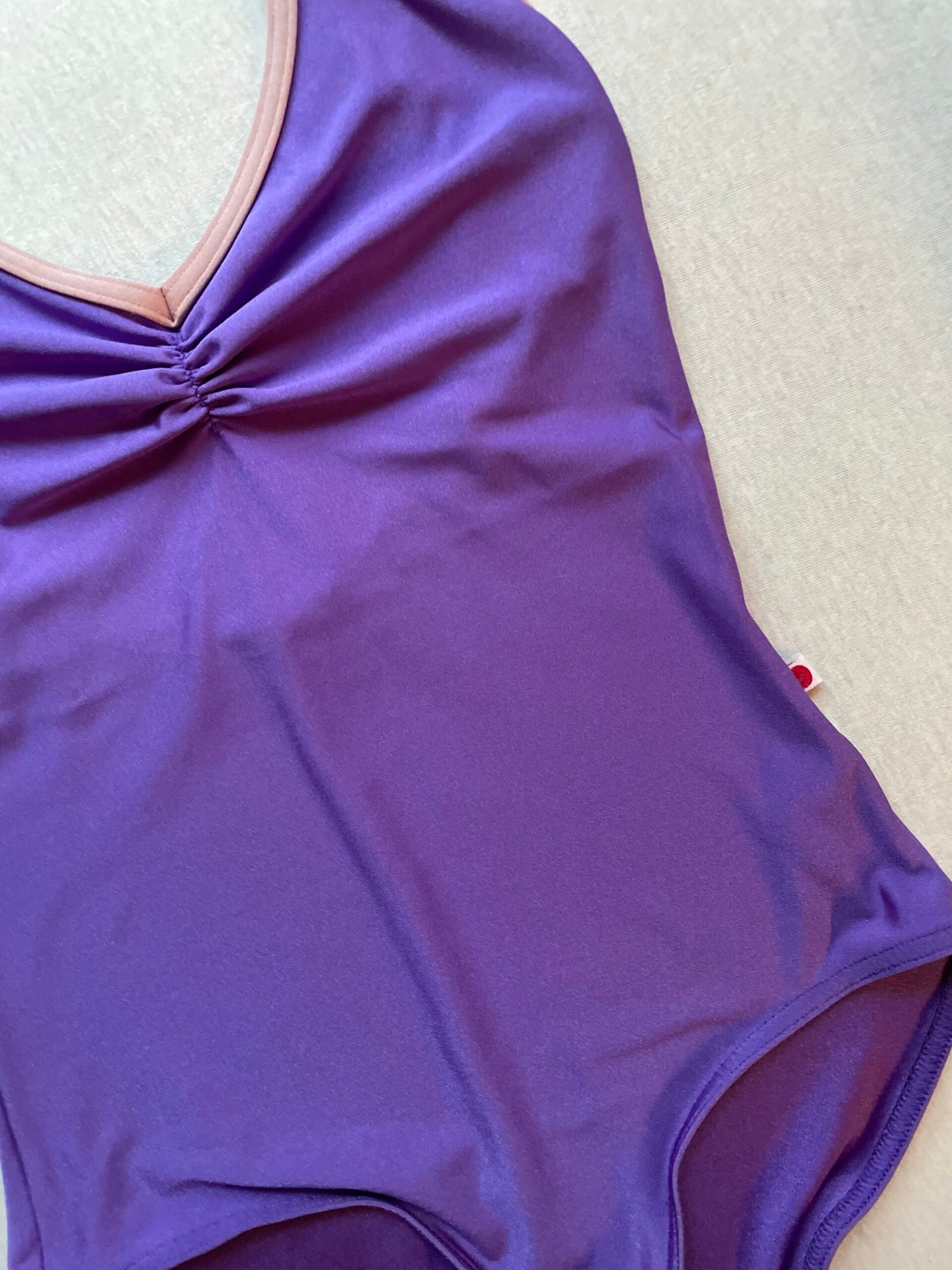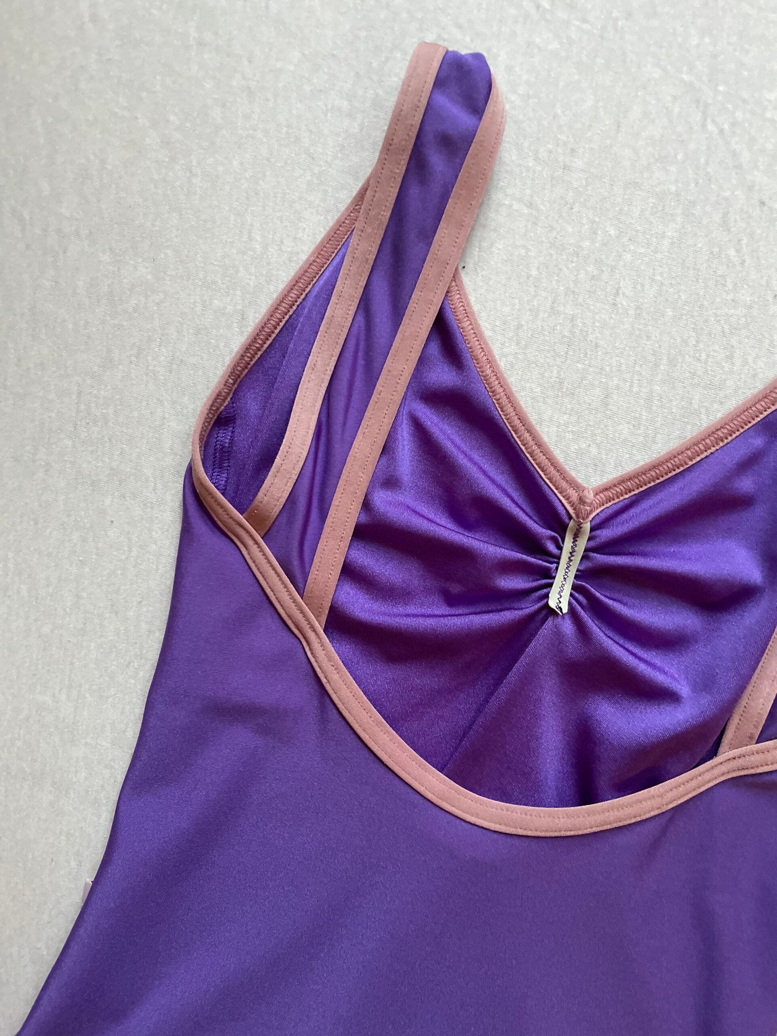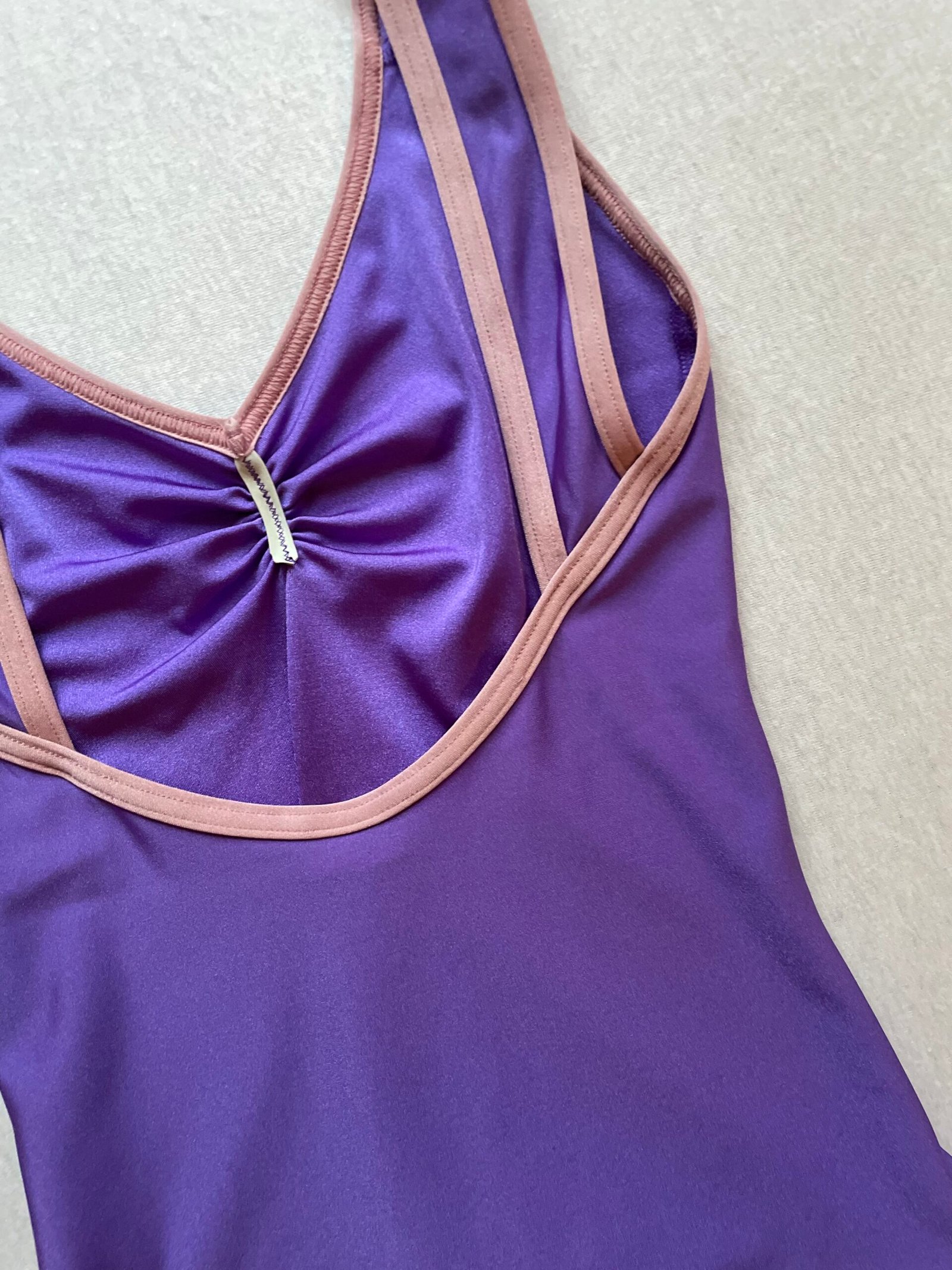 Yumiko Tiffany leotard in purple nylon with pink trim and no lining. Size S, great condition.