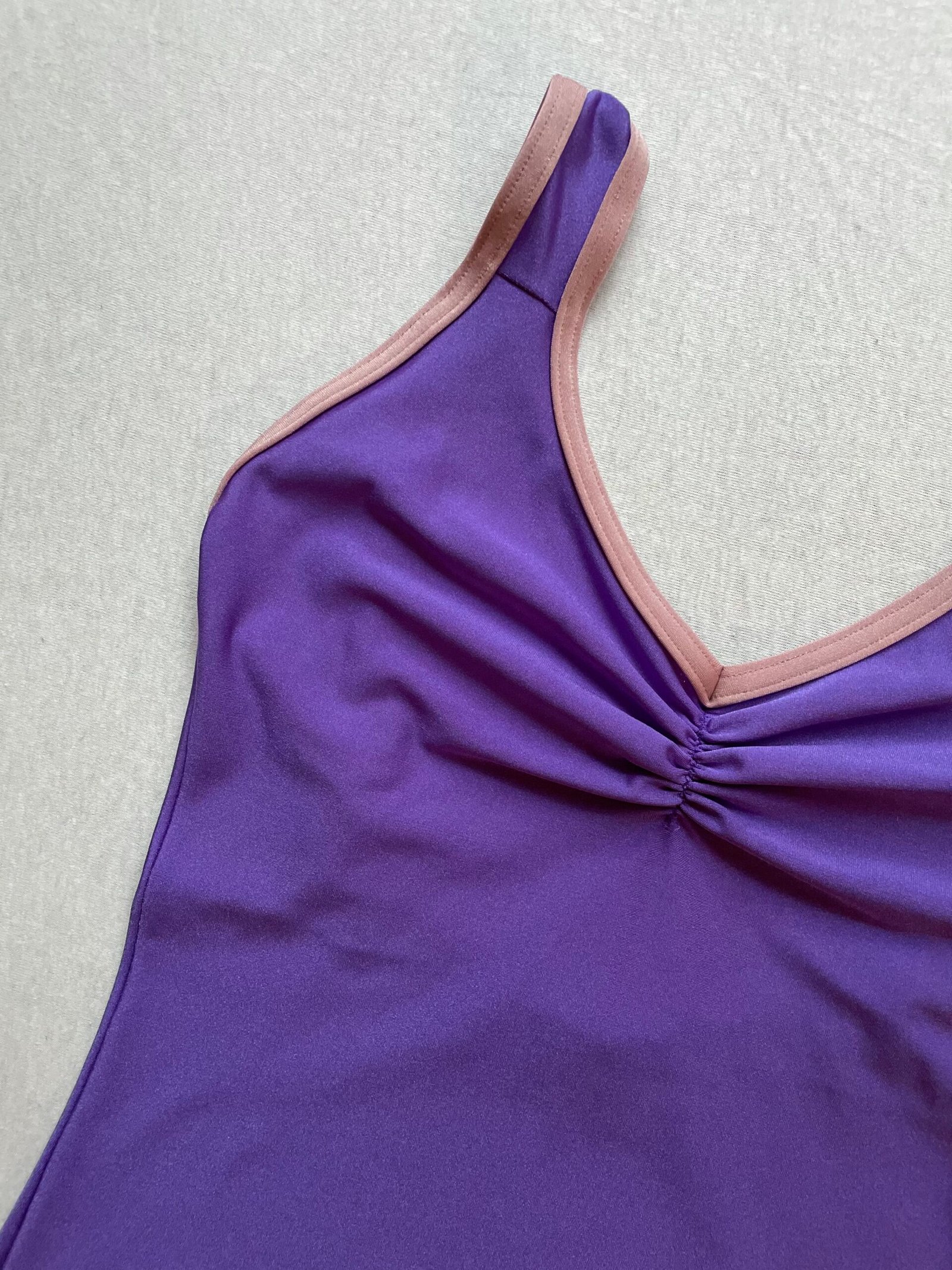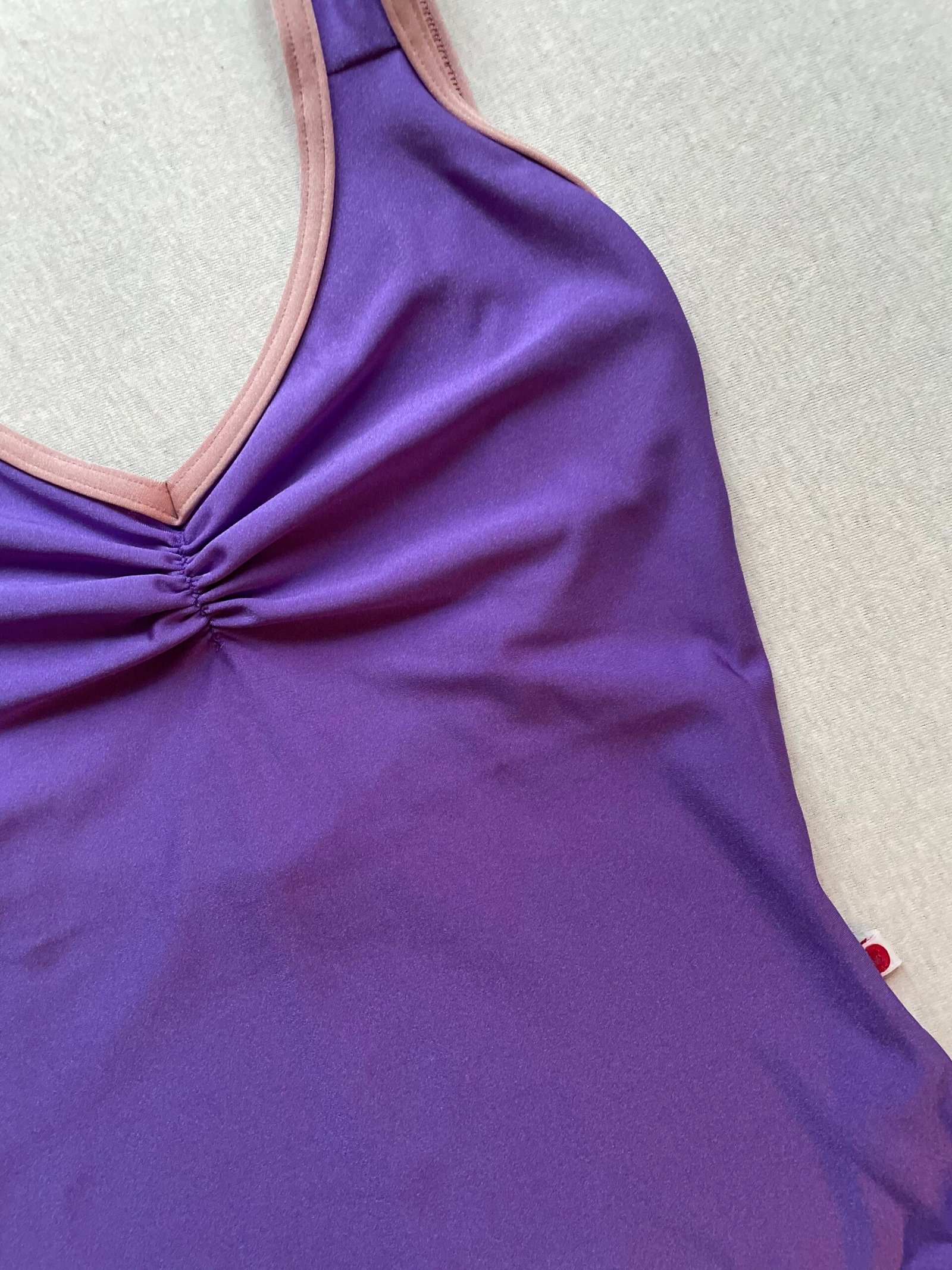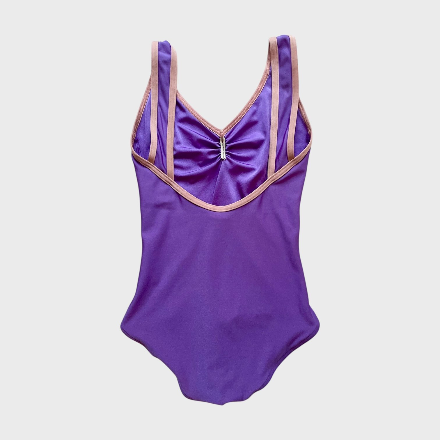 Yumiko Tiffany leotard in purple nylon with pink trim and no lining. Size S, great condition.